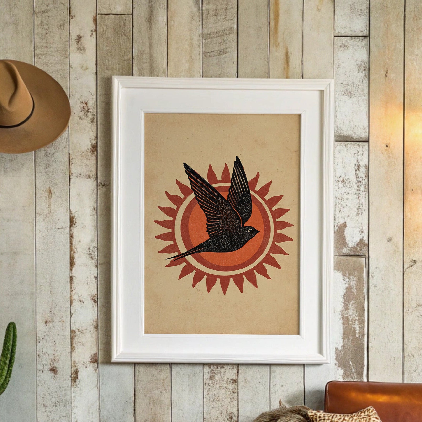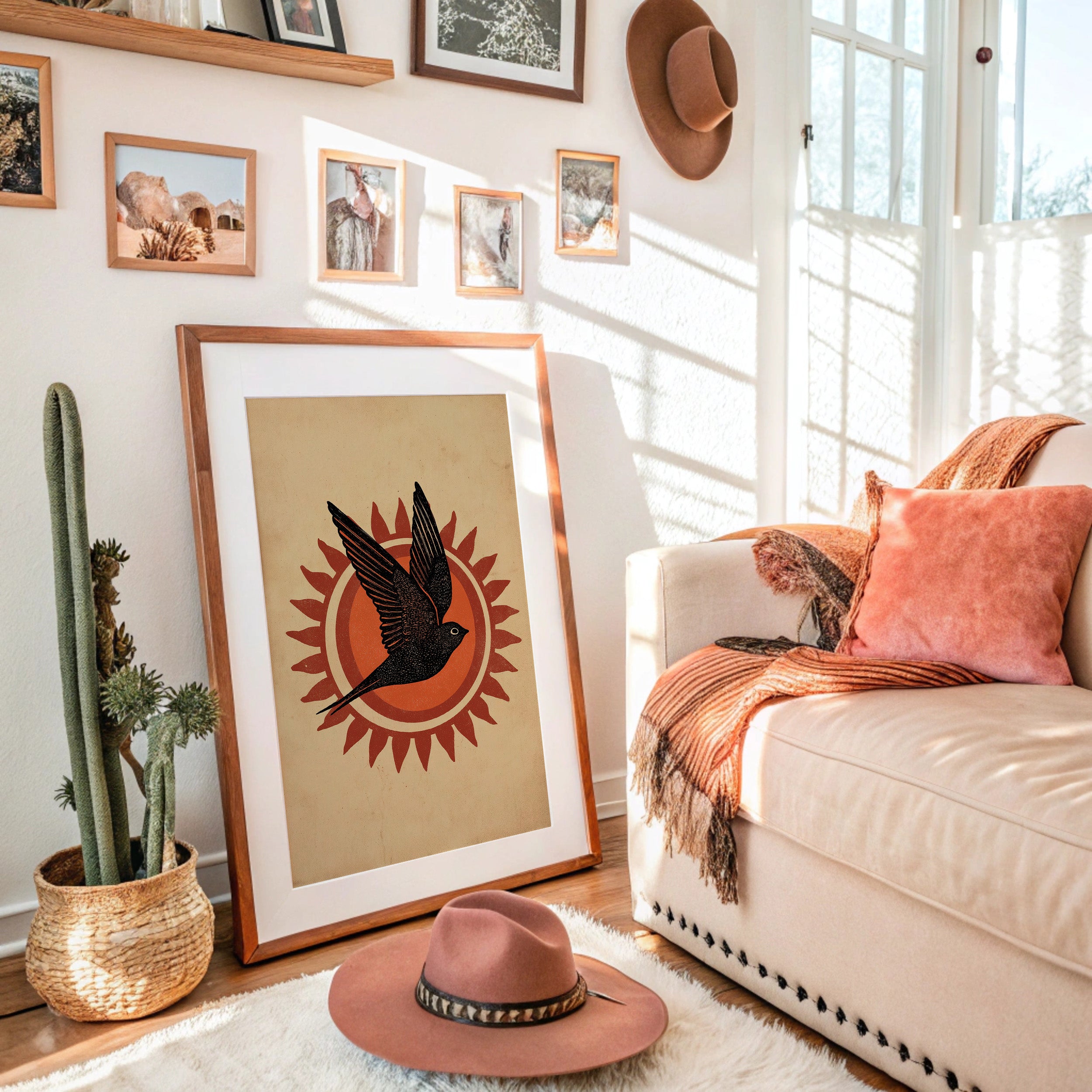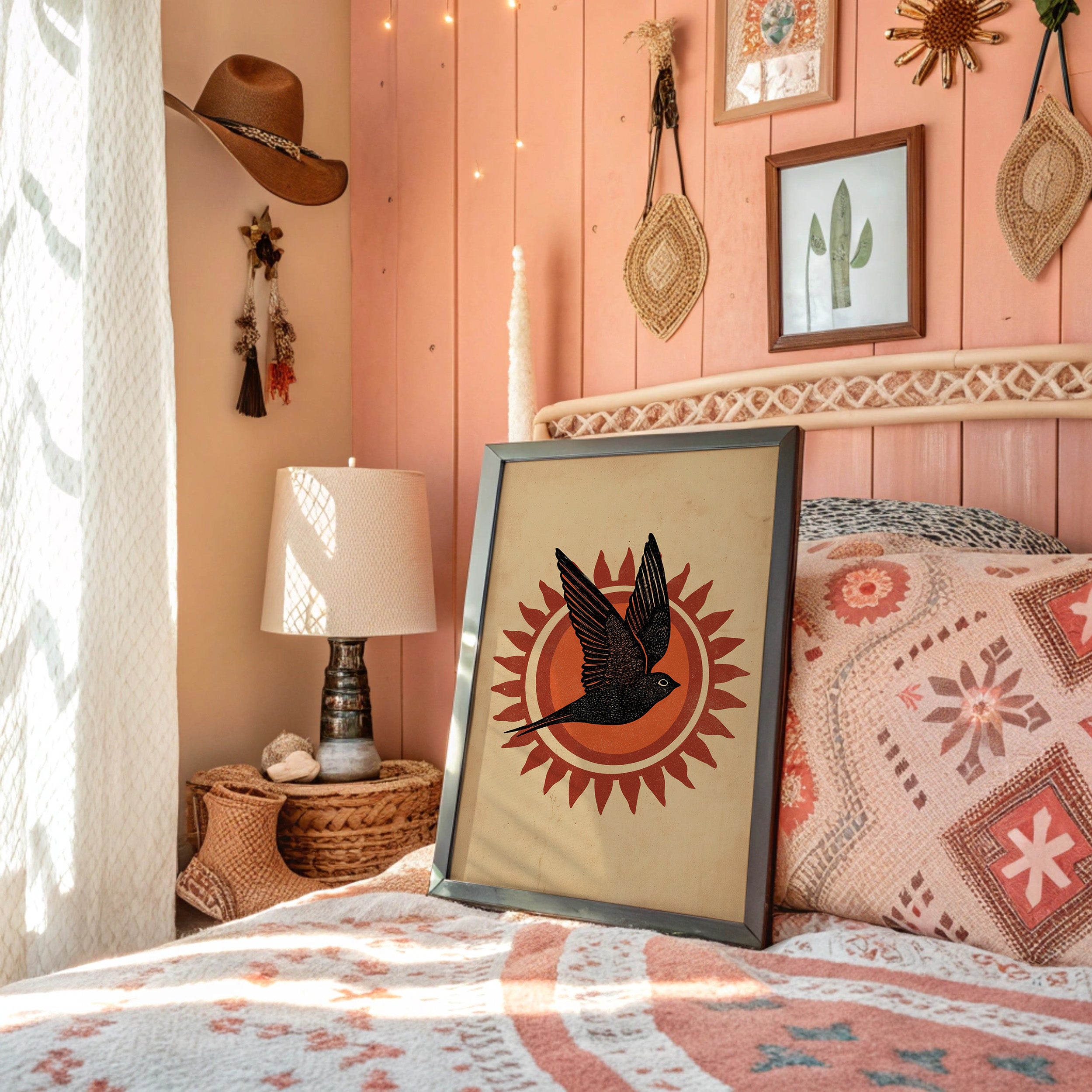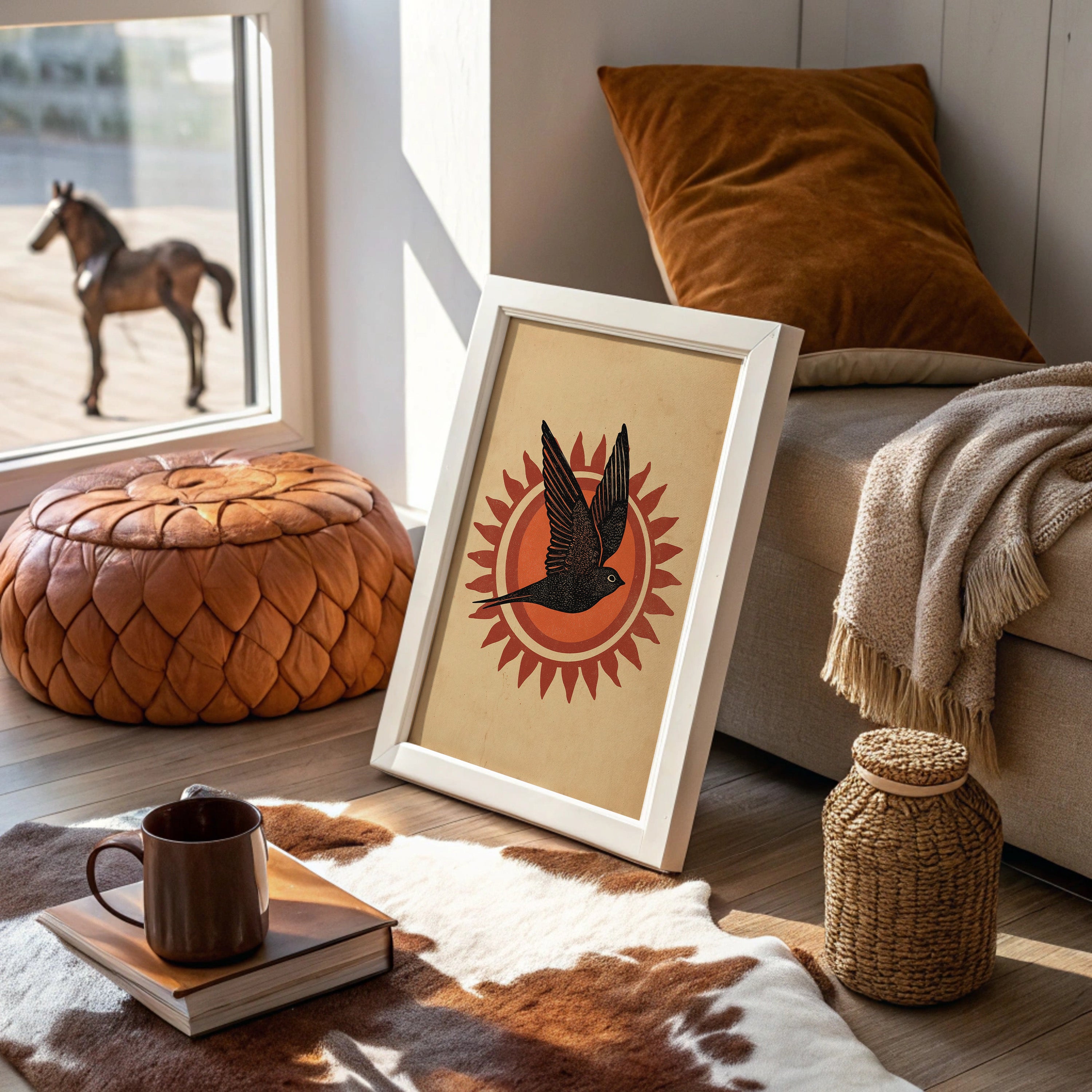 A bold silhouette of a raven takes flight across a radiant southwestern sun, capturing the spirit of desert mysticism. The striking contrast between the black bird and coral-toned sunburst creates a powerful symbol of freedom and wild spaces. Set against a warm tan background, this contemporary interpretation of southwestern imagery combines minimalist design with rich cultural resonance. Perfect for adding a touch of modern desert charm to a living room, study, or any space seeking to capture the untamed spirit of the American Southwest.