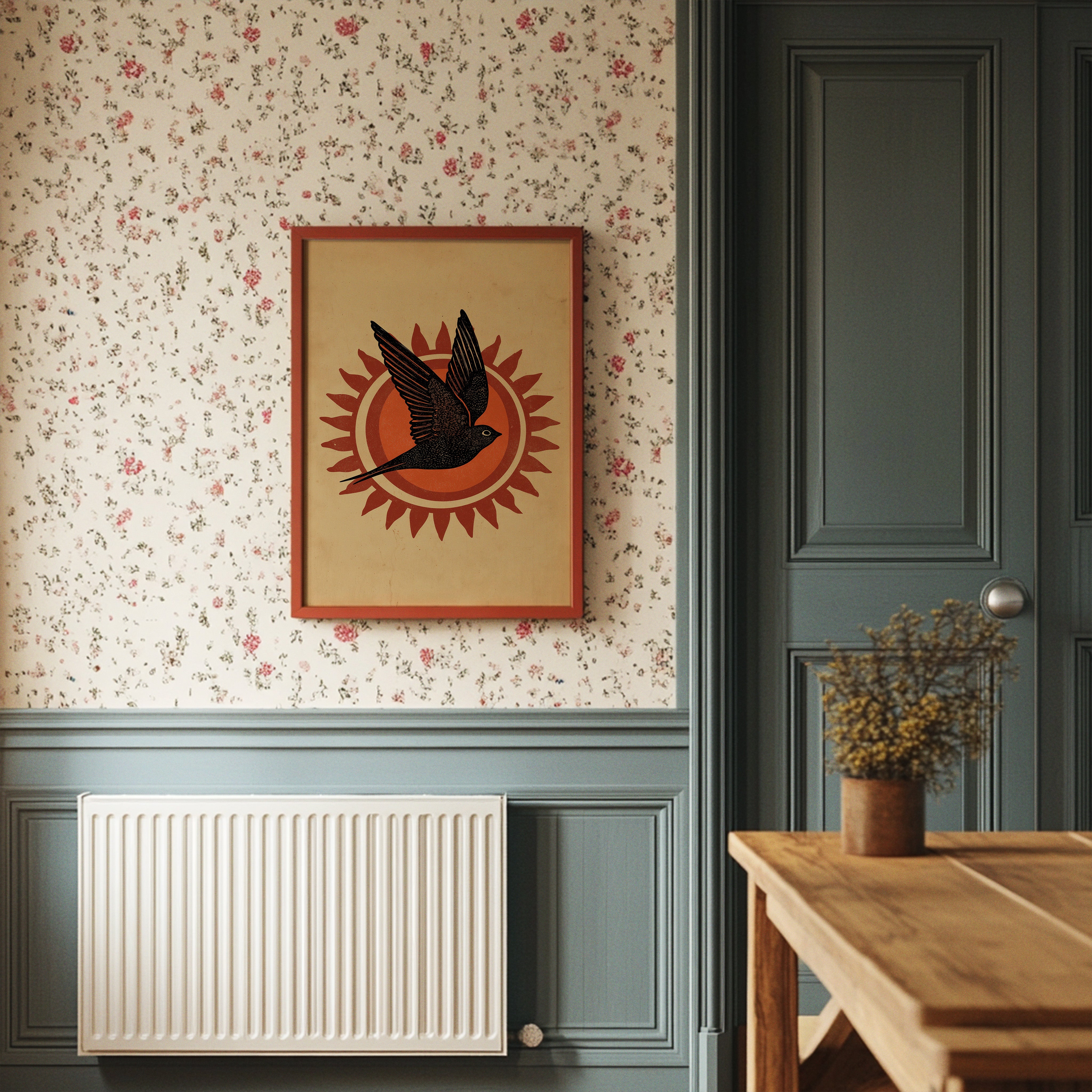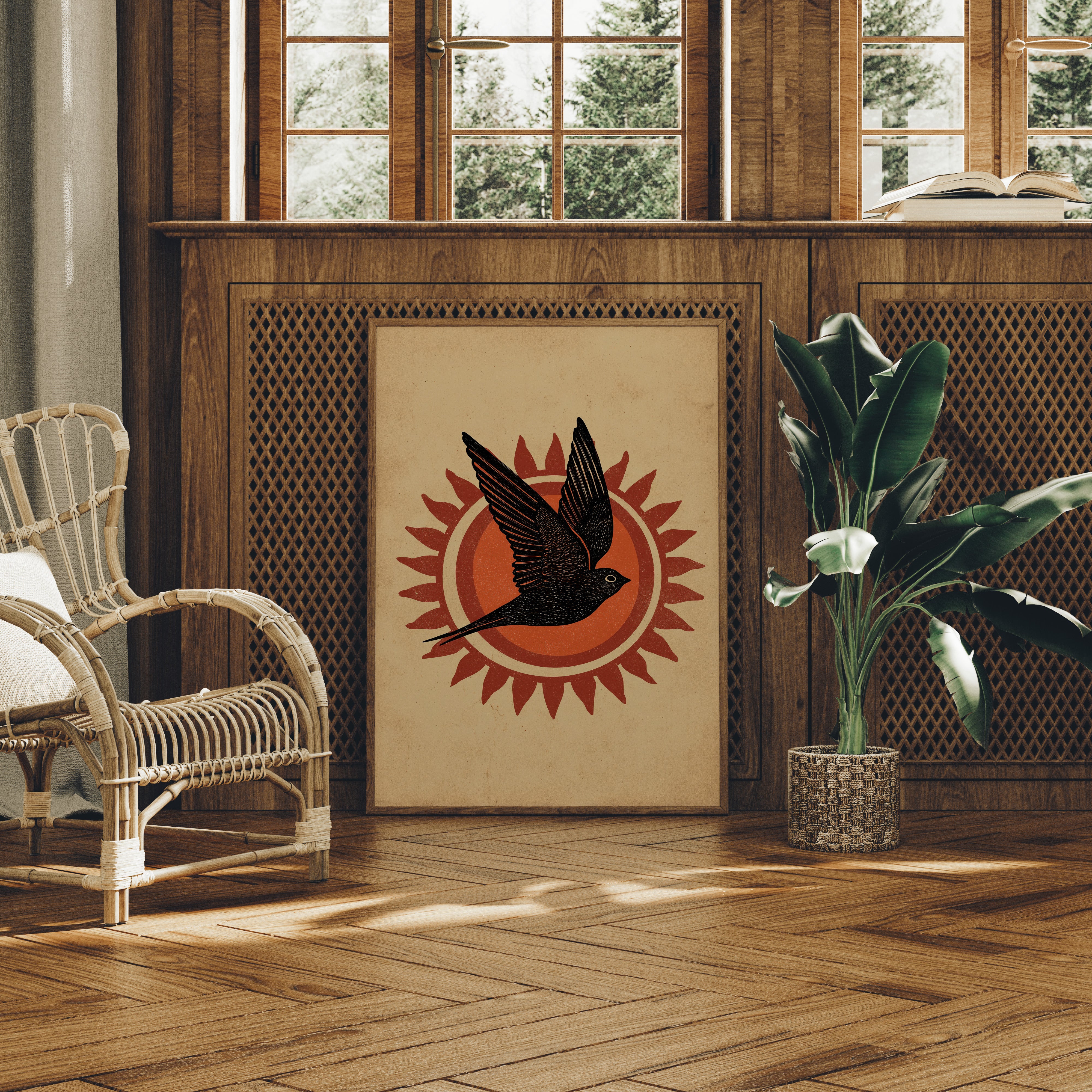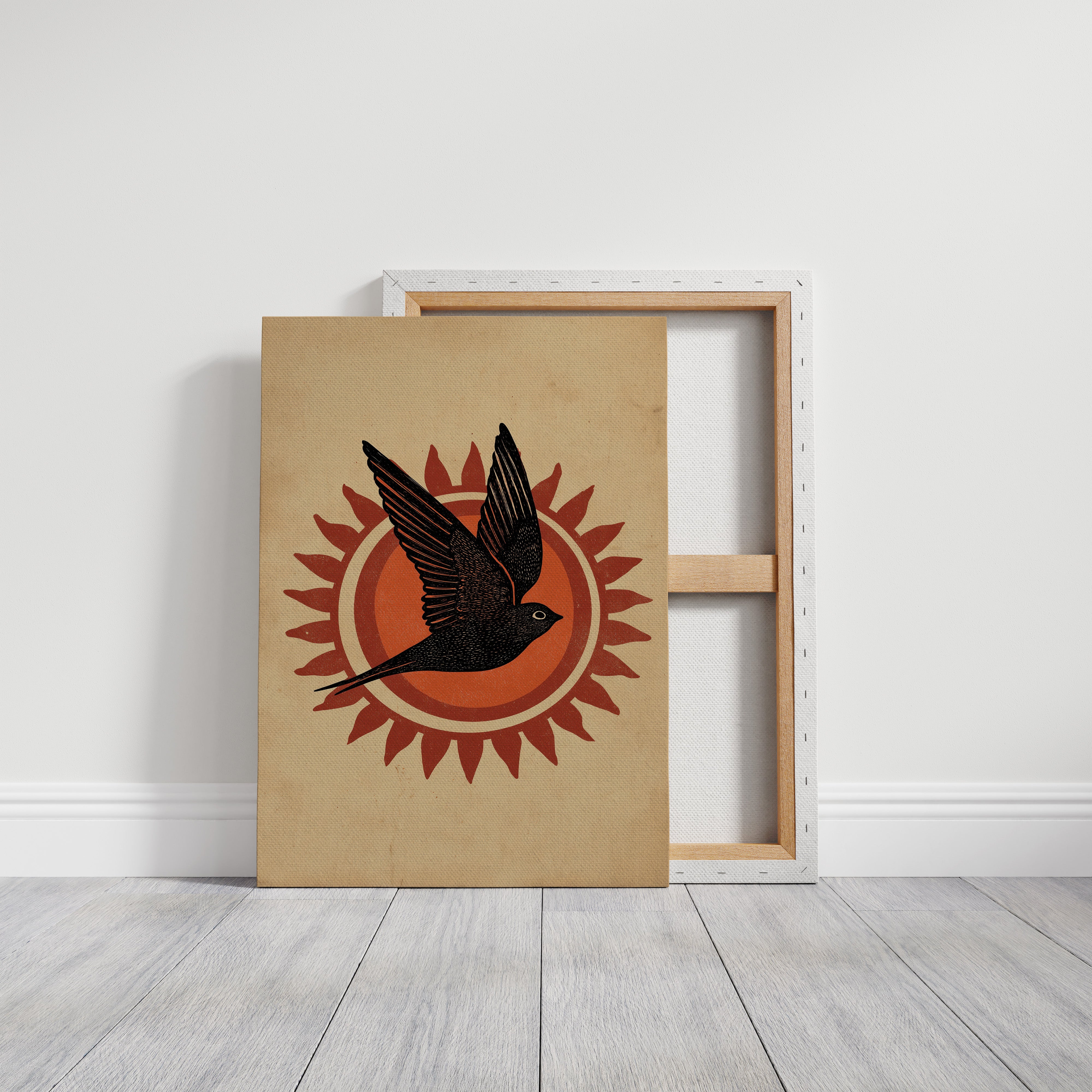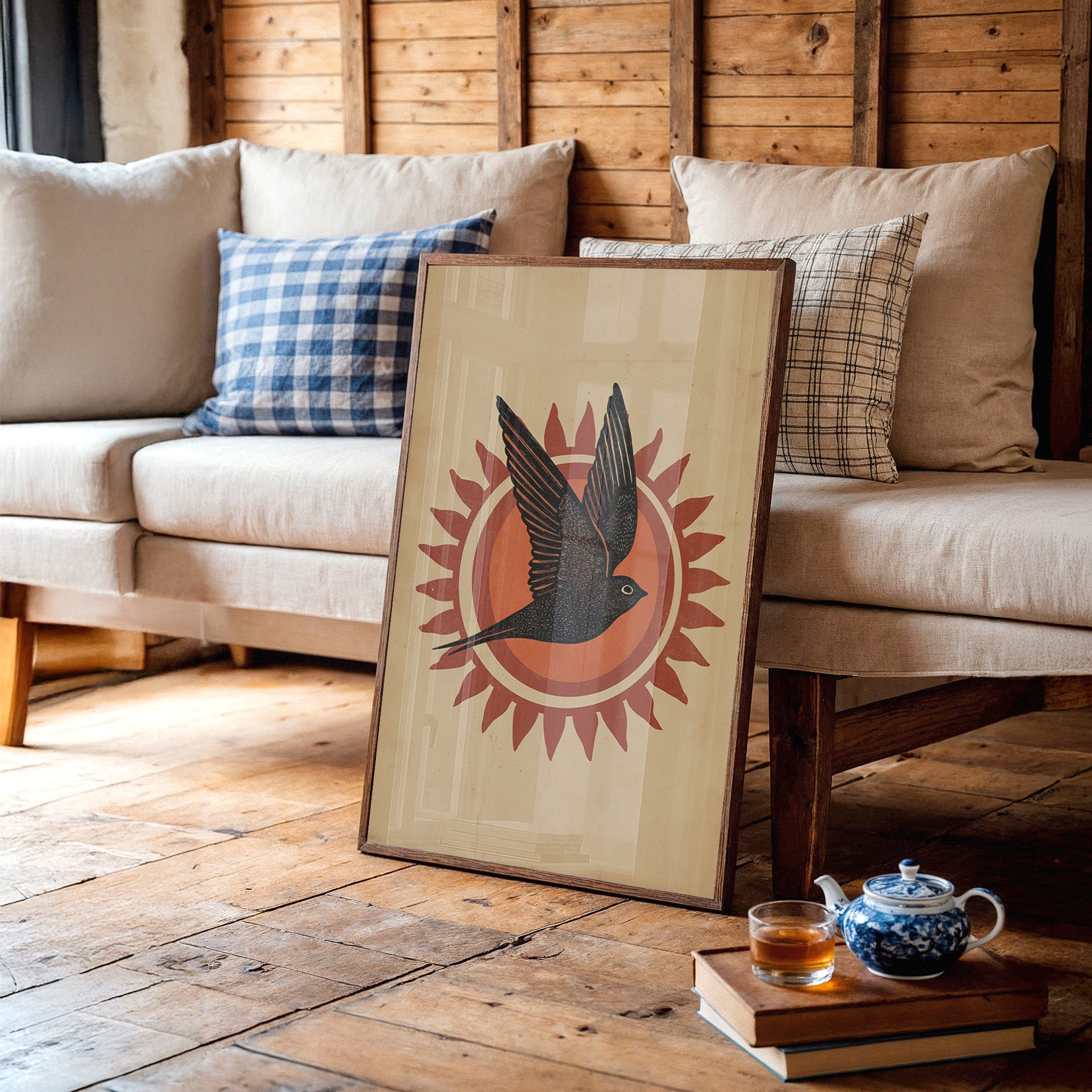 A bold silhouette of a raven takes flight across a radiant southwestern sun, capturing the spirit of desert mysticism. The striking contrast between the black bird and coral-toned sunburst creates a powerful symbol of freedom and wild spaces. Set against a warm tan background, this contemporary interpretation of southwestern imagery combines minimalist design with rich cultural resonance. Perfect for adding a touch of modern desert charm to a living room, study, or any space seeking to capture the untamed spirit of the American Southwest.