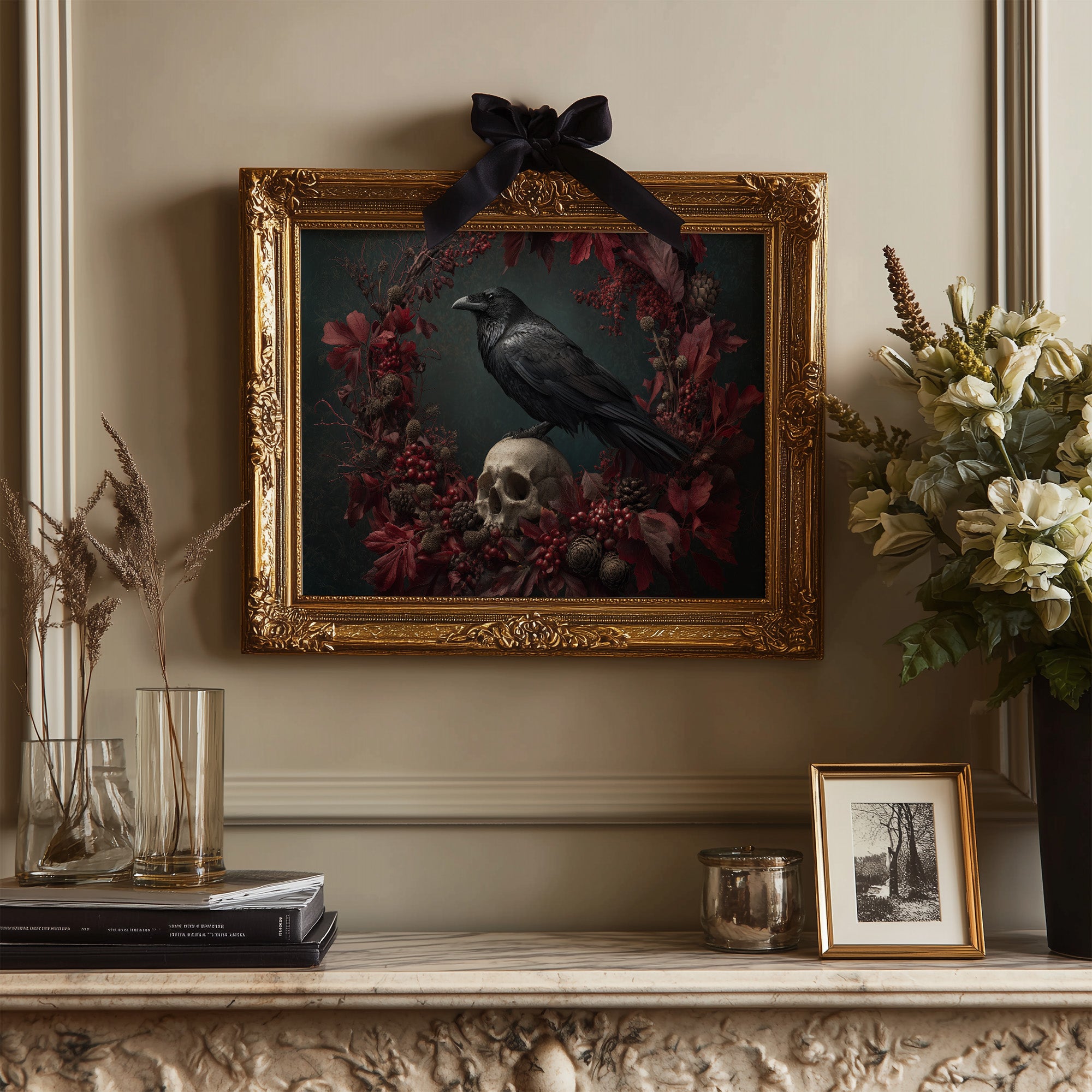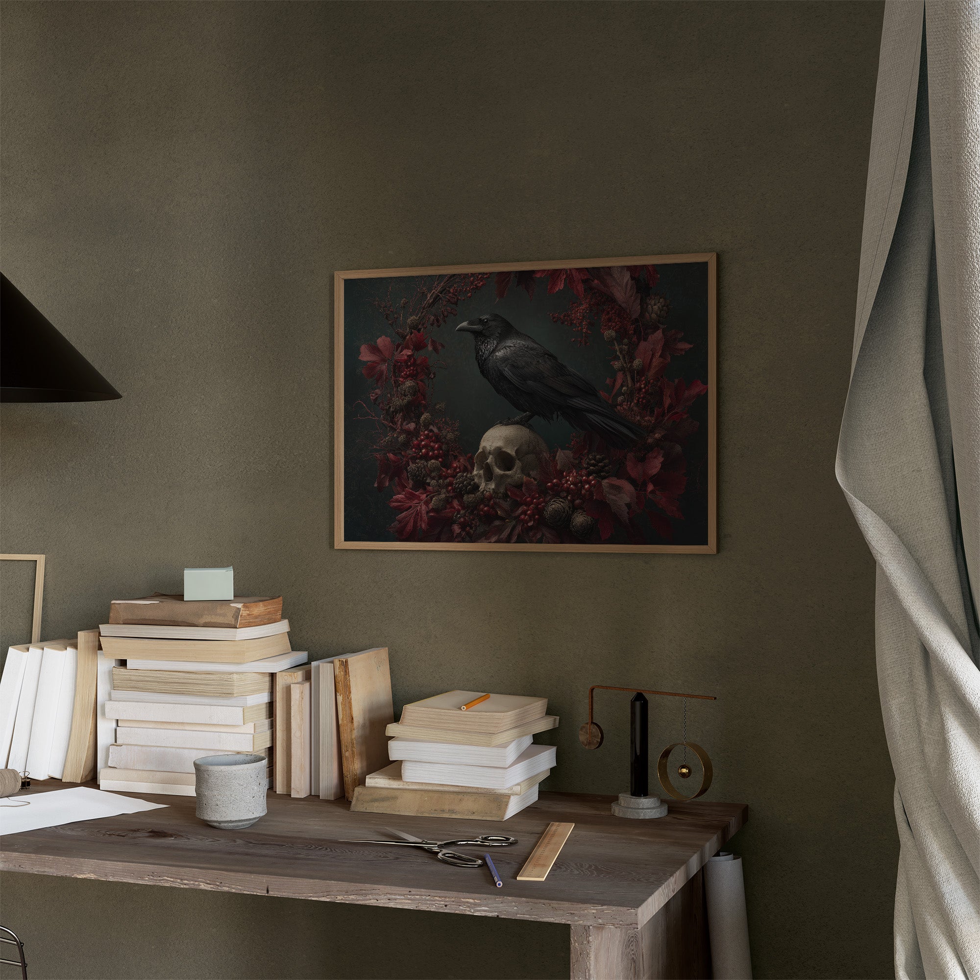 Darkness meets beauty in this haunting tableau where a sleek raven perches atop a skull, surrounded by deep crimson autumn foliage. The moody teal background creates a mysterious depth, highlighting the bird's glossy feathers against vibrant red berries and fallen maple leaves. This dramatic still life balances the delicate boundary between life and death, with nature's abundance framing mortality's reminder. This striking piece becomes the intellectual focal point of a study, home library, or sophisticated living space where thoughtful conversations unfold.