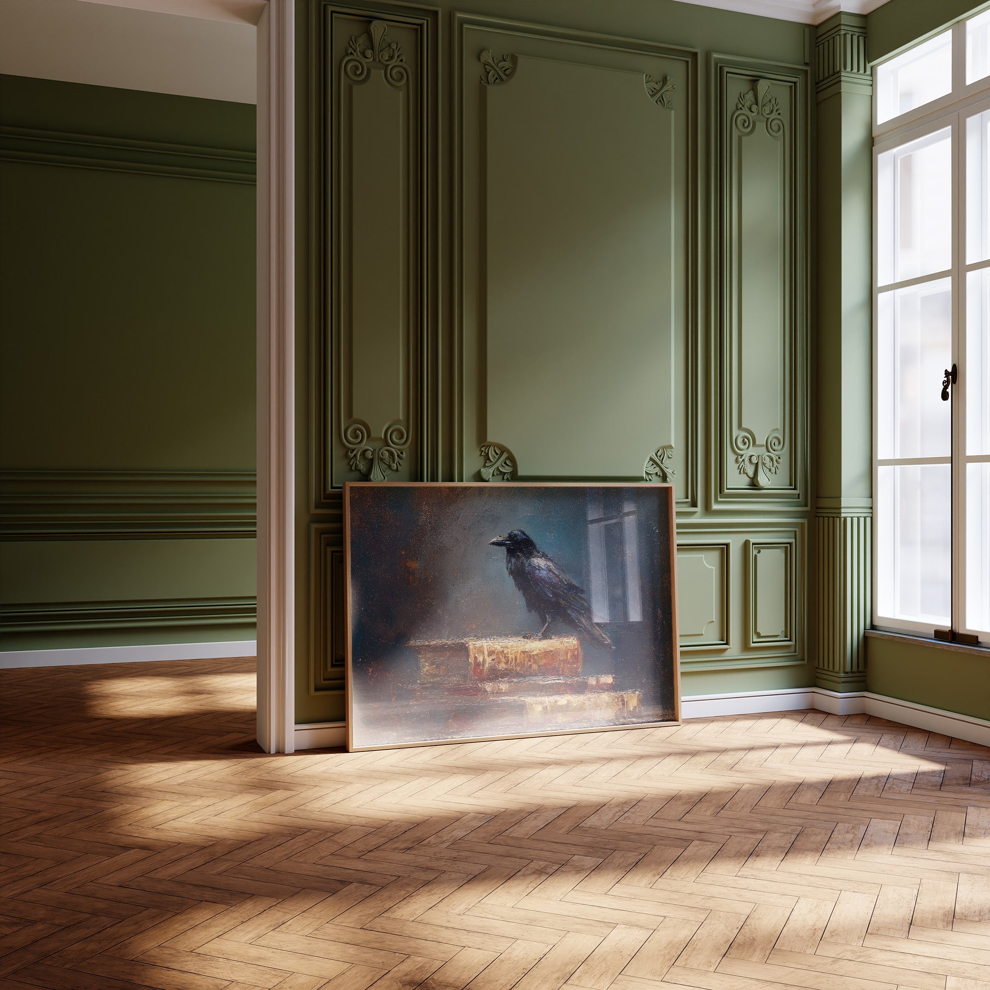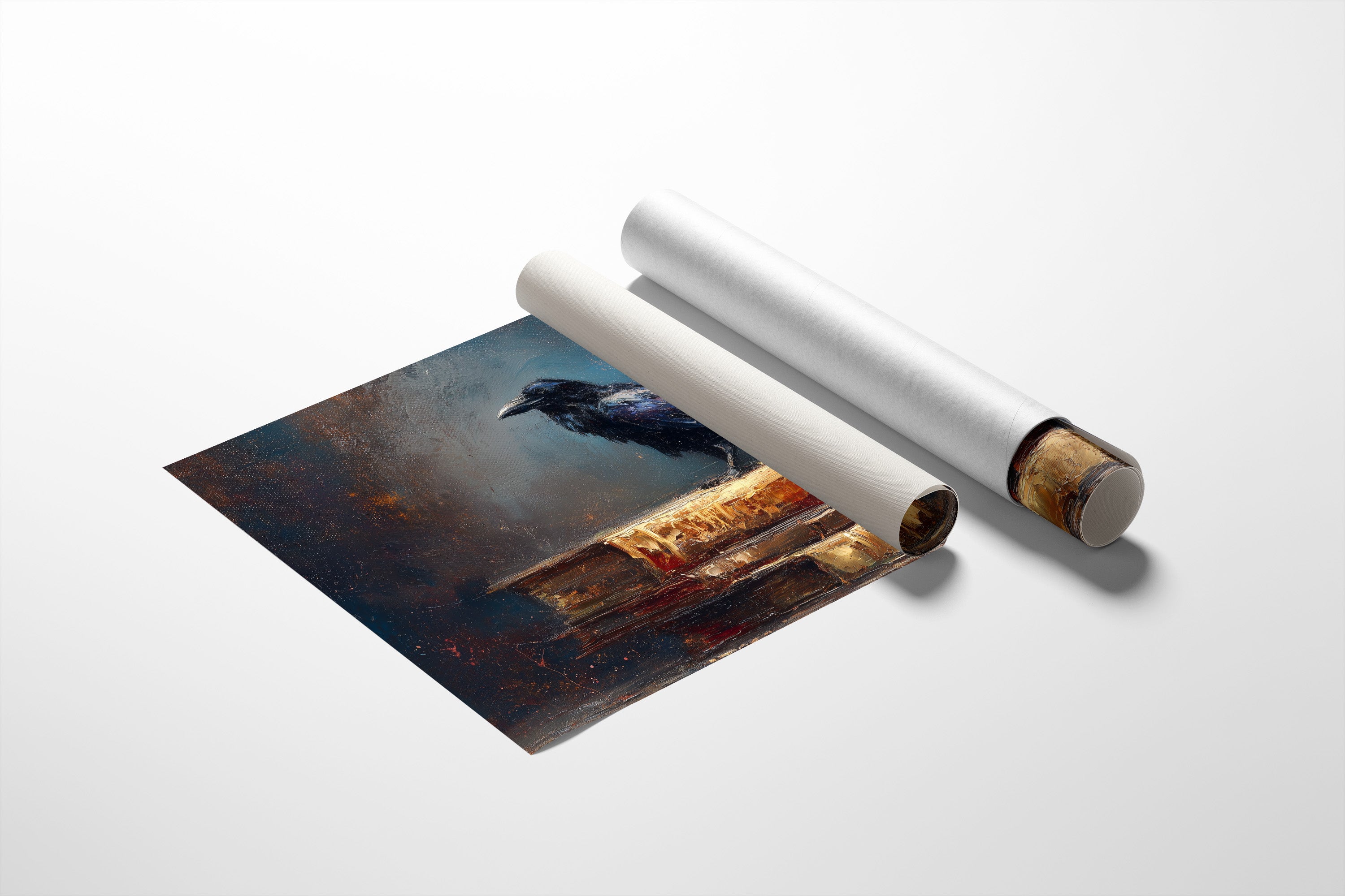 A solitary raven stands sentinel atop weathered books, its iridescent feathers catching light against a moody, atmospheric backdrop. The painting captures that liminal moment between knowledge and mystery, where the bird's knowing gaze seems to challenge the viewer. Rich textures of aged leather bindings and the bird's glossy plumage create a striking contrast against the shadowy background, all framed perfectly against a wall of literary classics.
