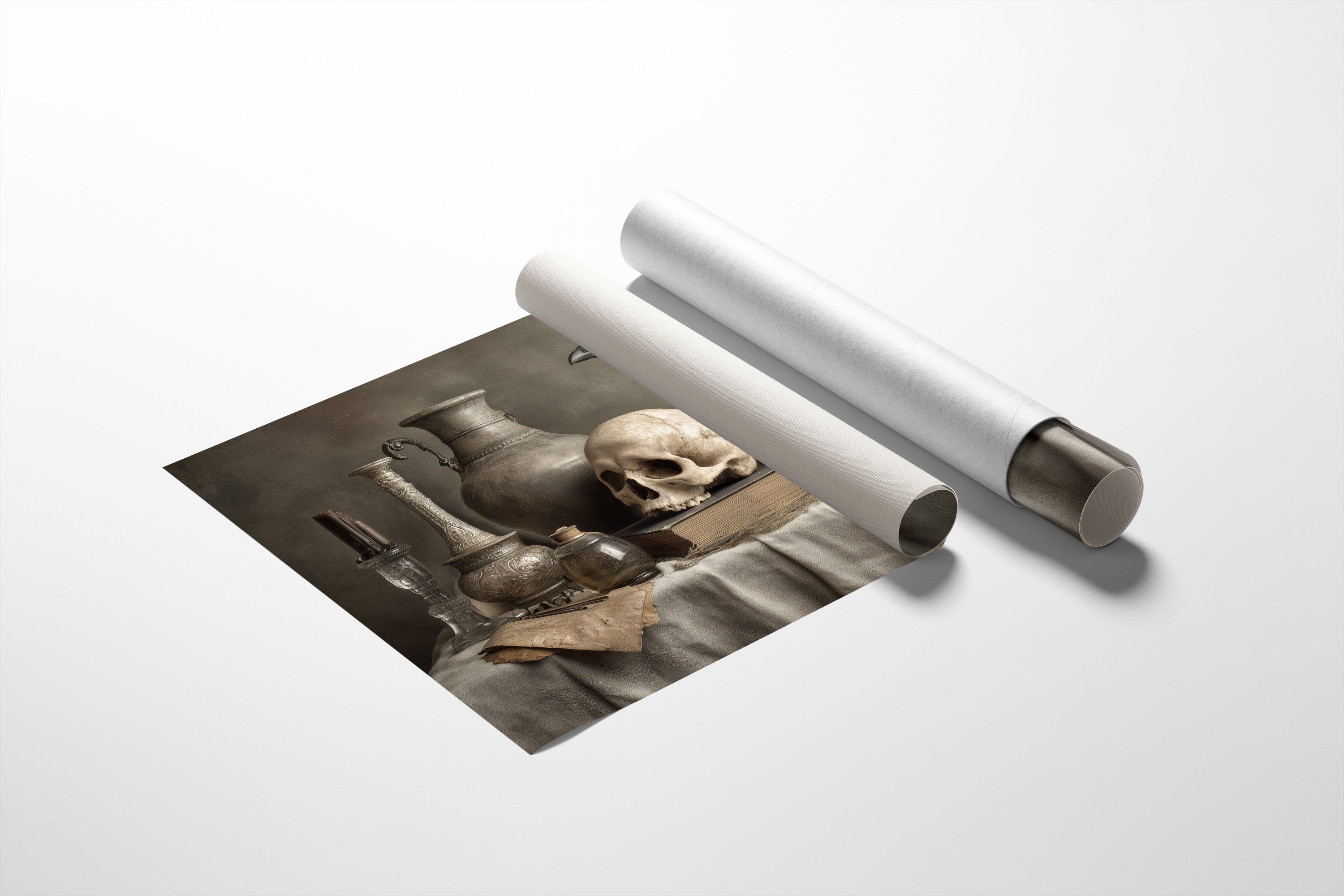 Time stands still in this haunting vignette where past and present collide. A glossy black raven perches beside ancient vessels and a weathered skull, creating a modern vanitas that speaks to the fragility of existence. The monochromatic palette of grays and browns creates a somber meditation on knowledge and impermanence, all framed against a backdrop of countless books holding their own secrets. This piece brings sophisticated depth to a home library, study, or any contemplative space seeking intellectual gravitas.