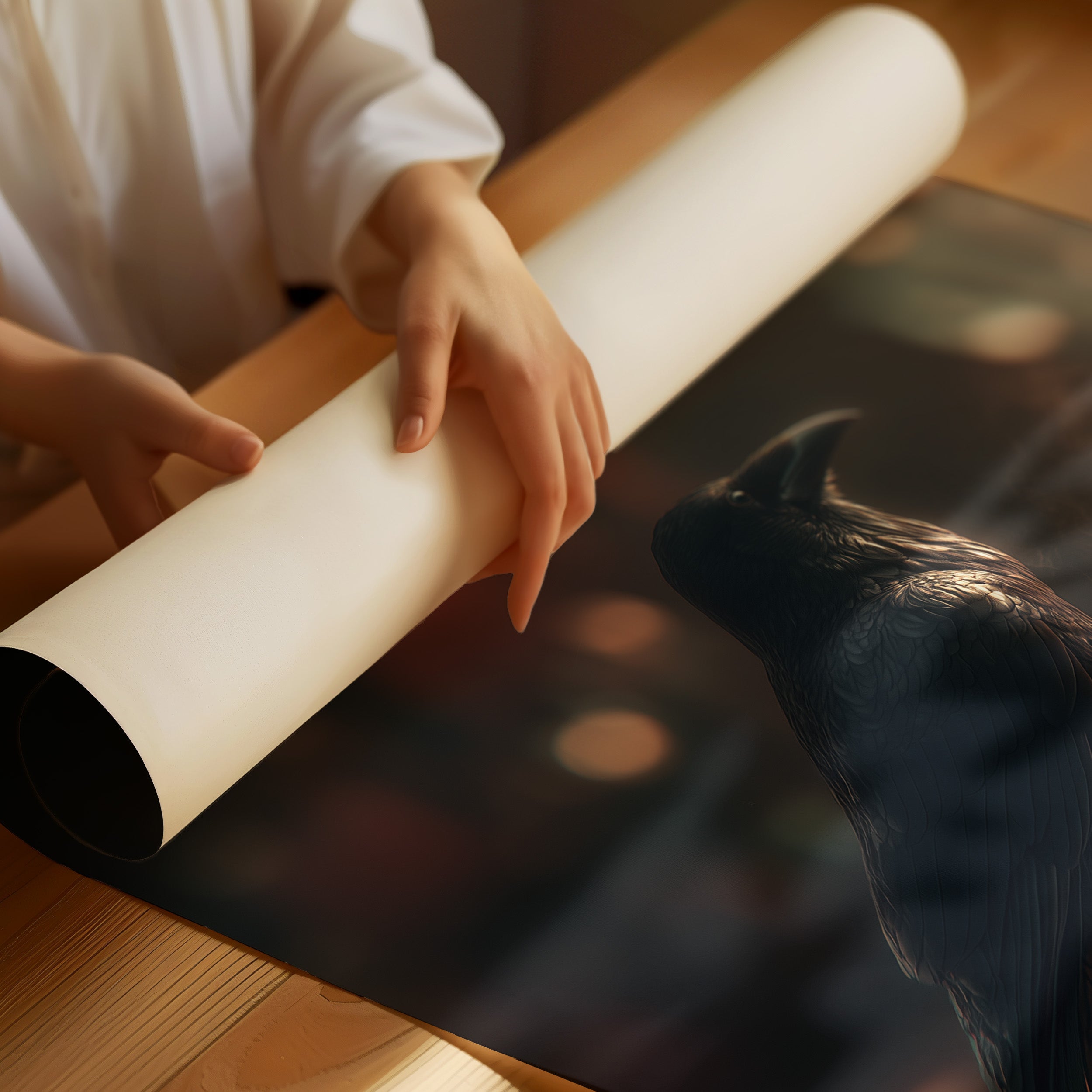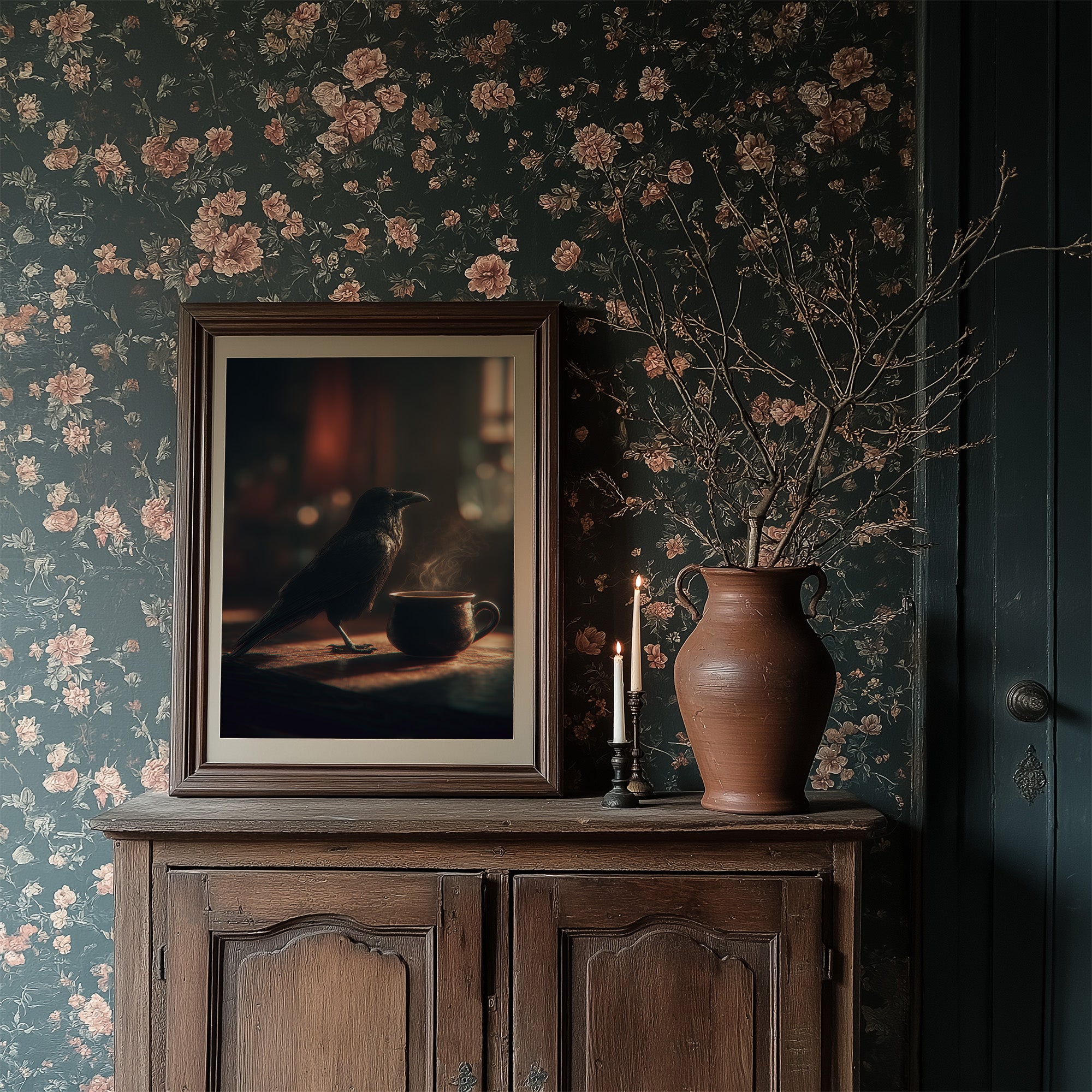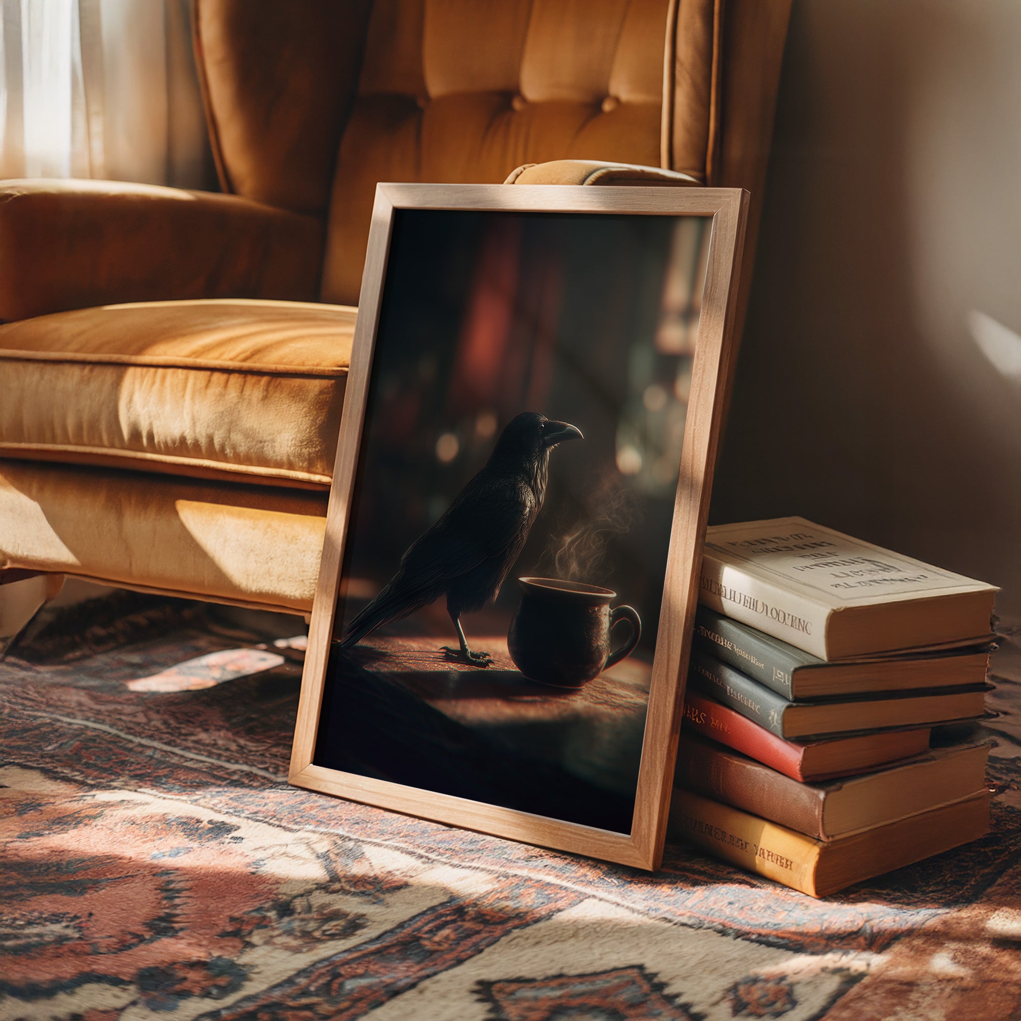 A solitary raven stands sentinel beside a steaming cup, its glossy feathers catching the last amber light of day. The scene unfolds in hushed tones of copper and shadow, creating an atmosphere of mysterious intimacy where time seems suspended. Warmth radiates from the ceramic vessel, contrasting with the cool intelligence in the bird's obsidian eye, suggesting an ancient conversation between corvid and comfort.