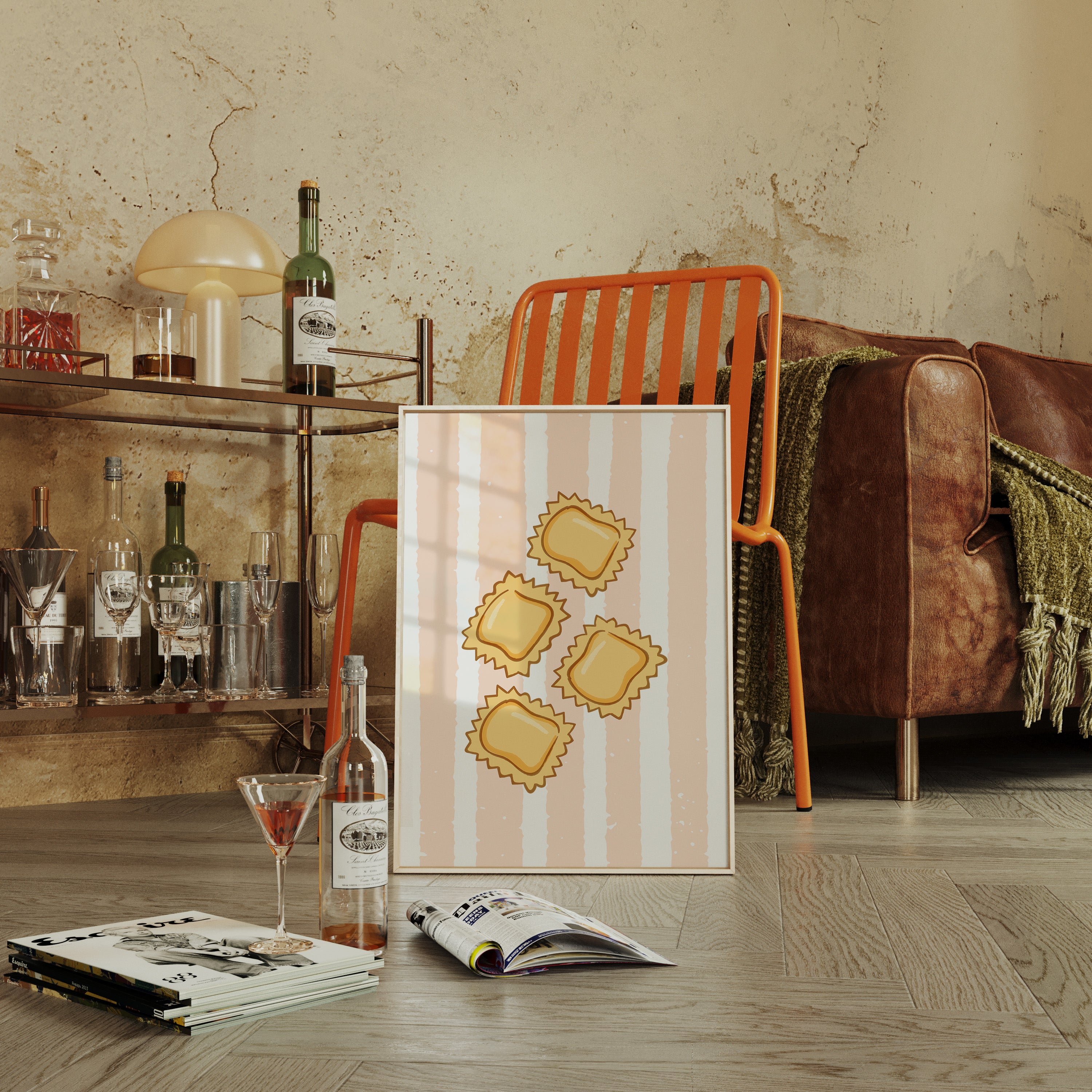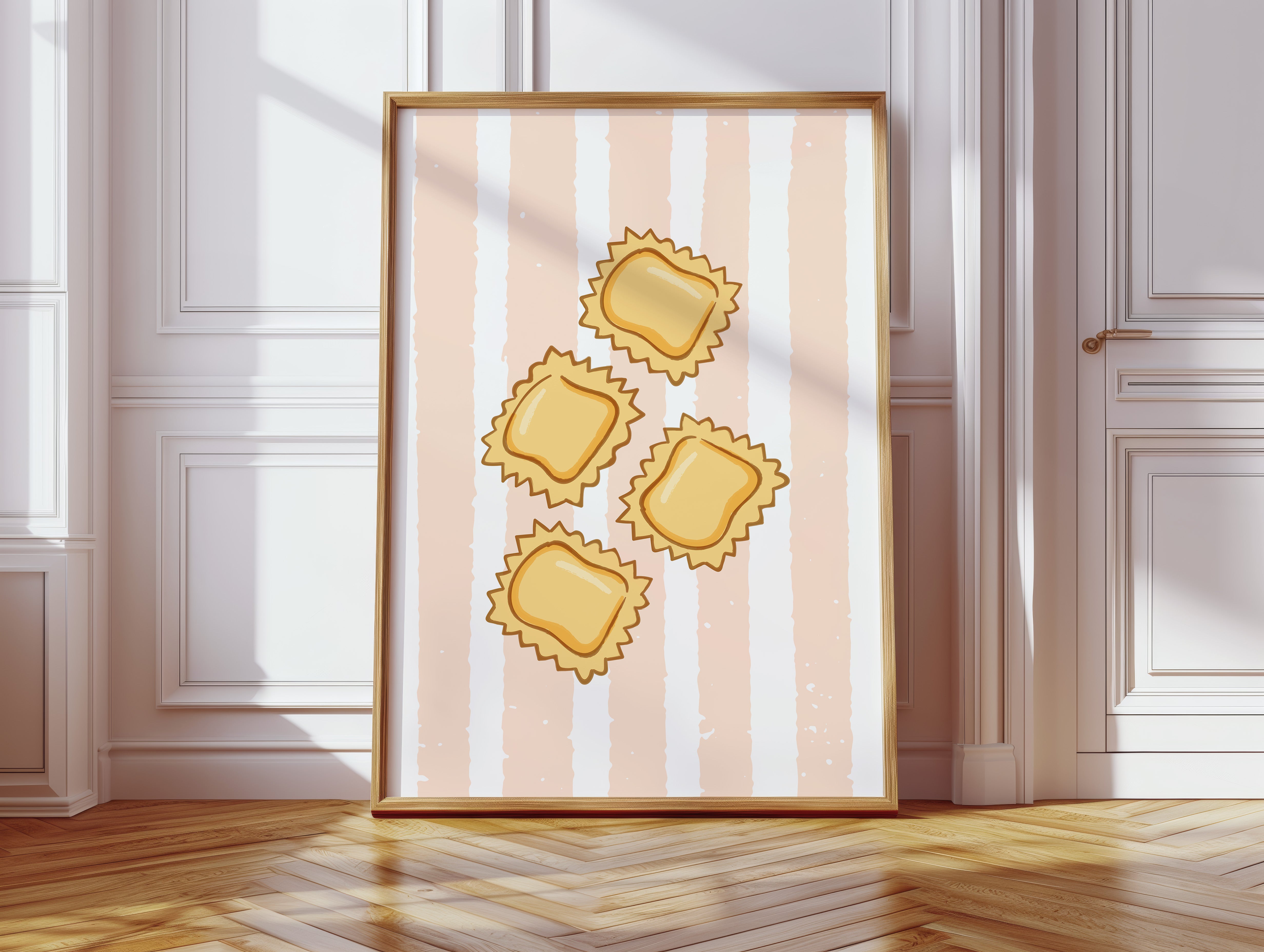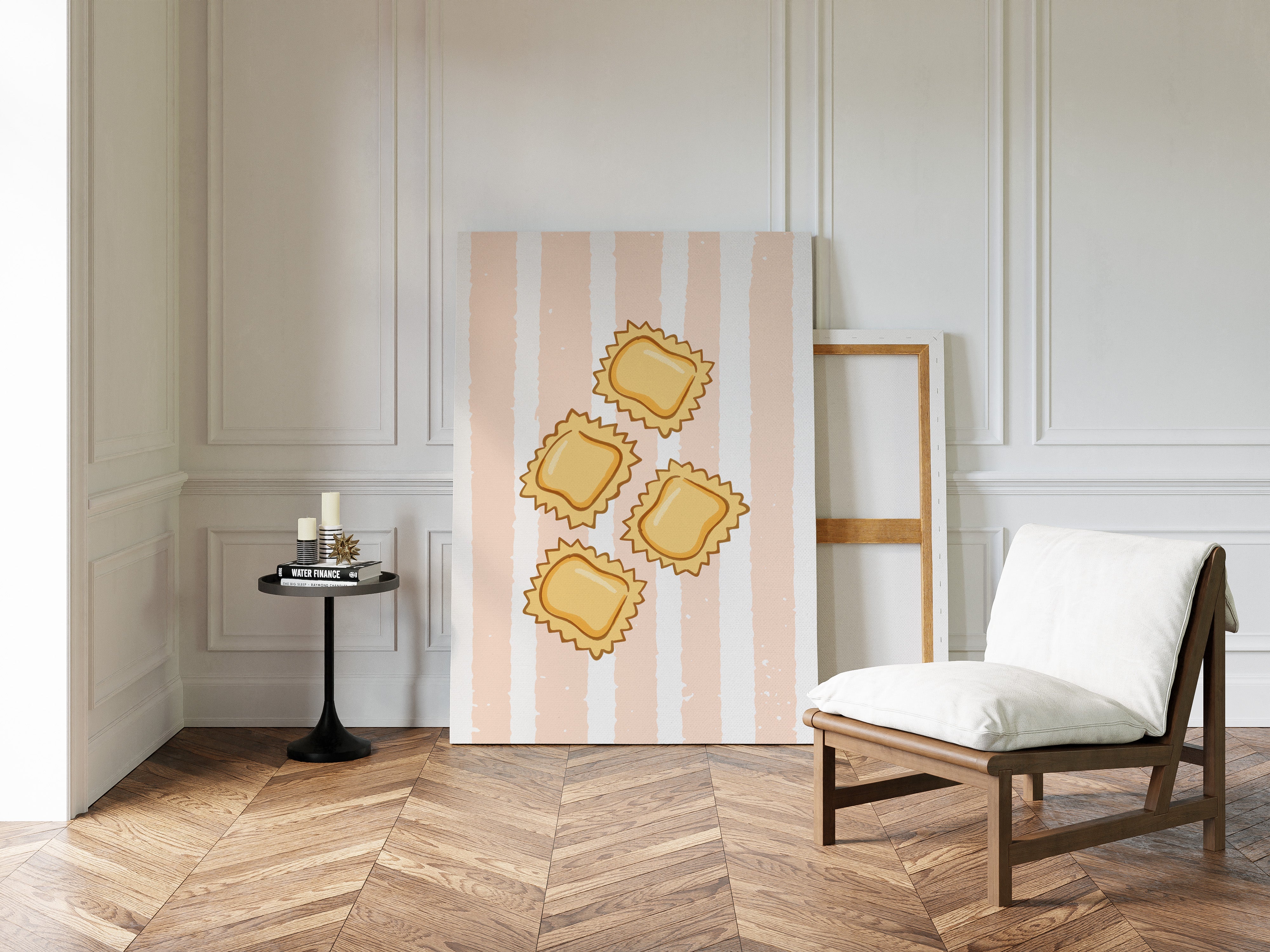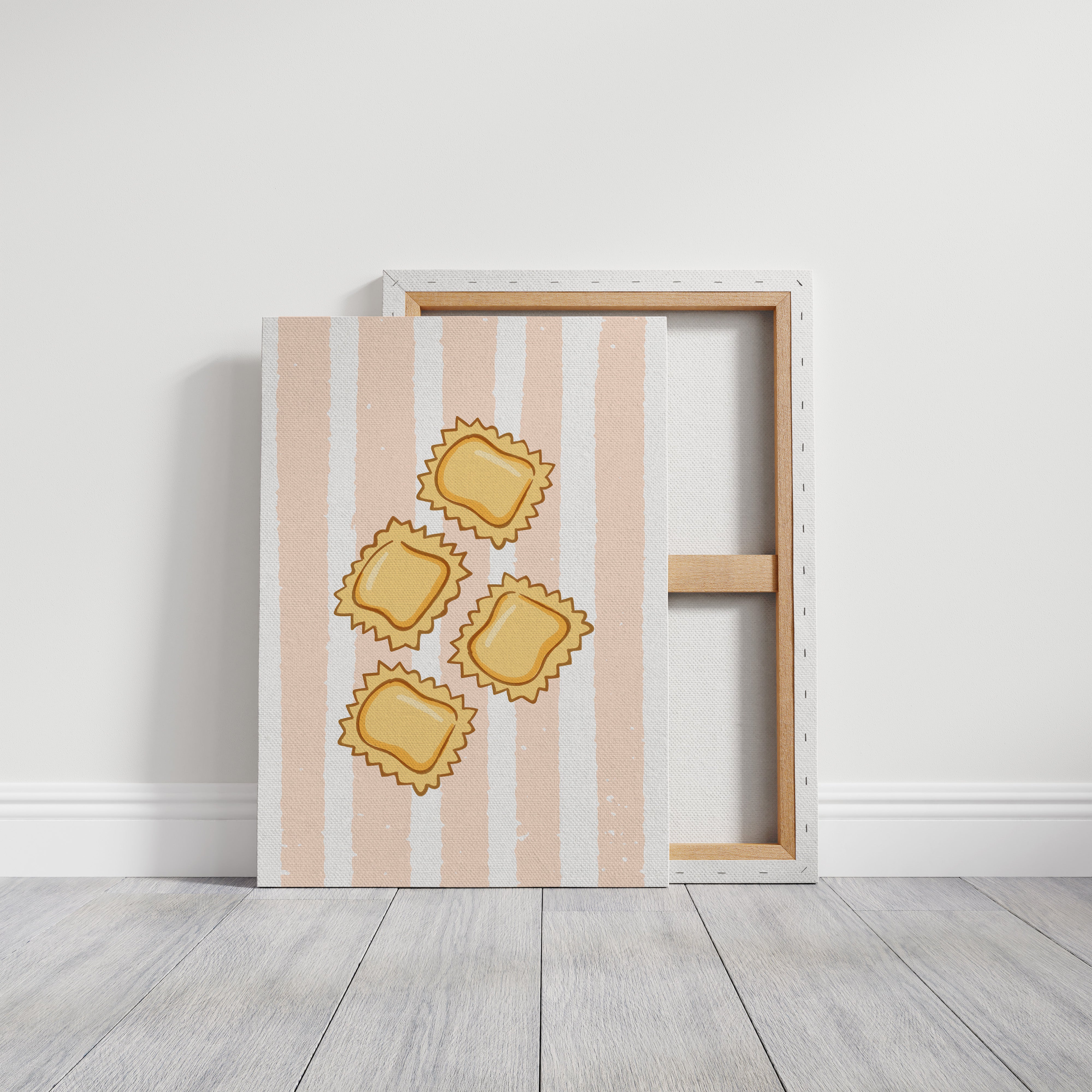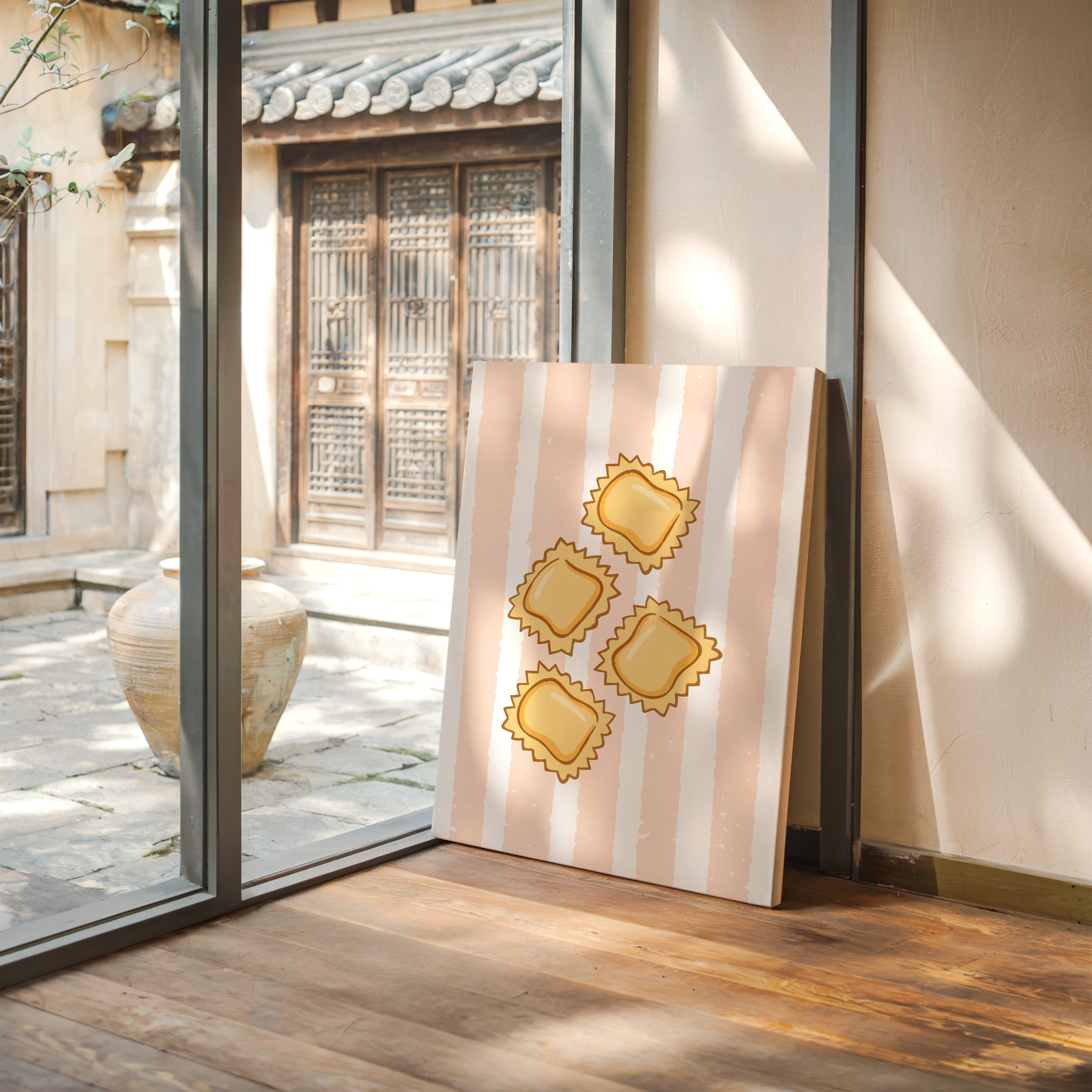 Golden pillows of pasta float gracefully against delicate peach stripes, like sunlight catching flour dust in a warm Italian kitchen. This playful contemporary piece captures the essence of modern culinary art with minimalist charm. The composition tells a story of handmade tradition meeting modern design, where each perfectly imperfect ravioli becomes a character in its own right, dancing across the canvas in a choreographed display of comfort and craft. Perfect for adding a dash of whimsy to a modern kitchen or dining space, this piece speaks to both food lovers and design enthusiasts alike. The soft color palette ensures it brings warmth without overwhelming your space.
