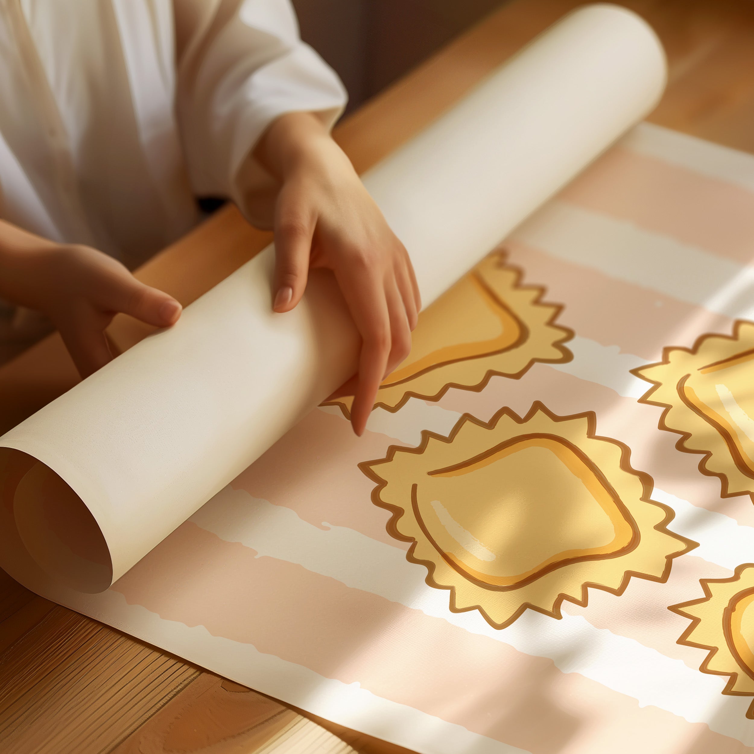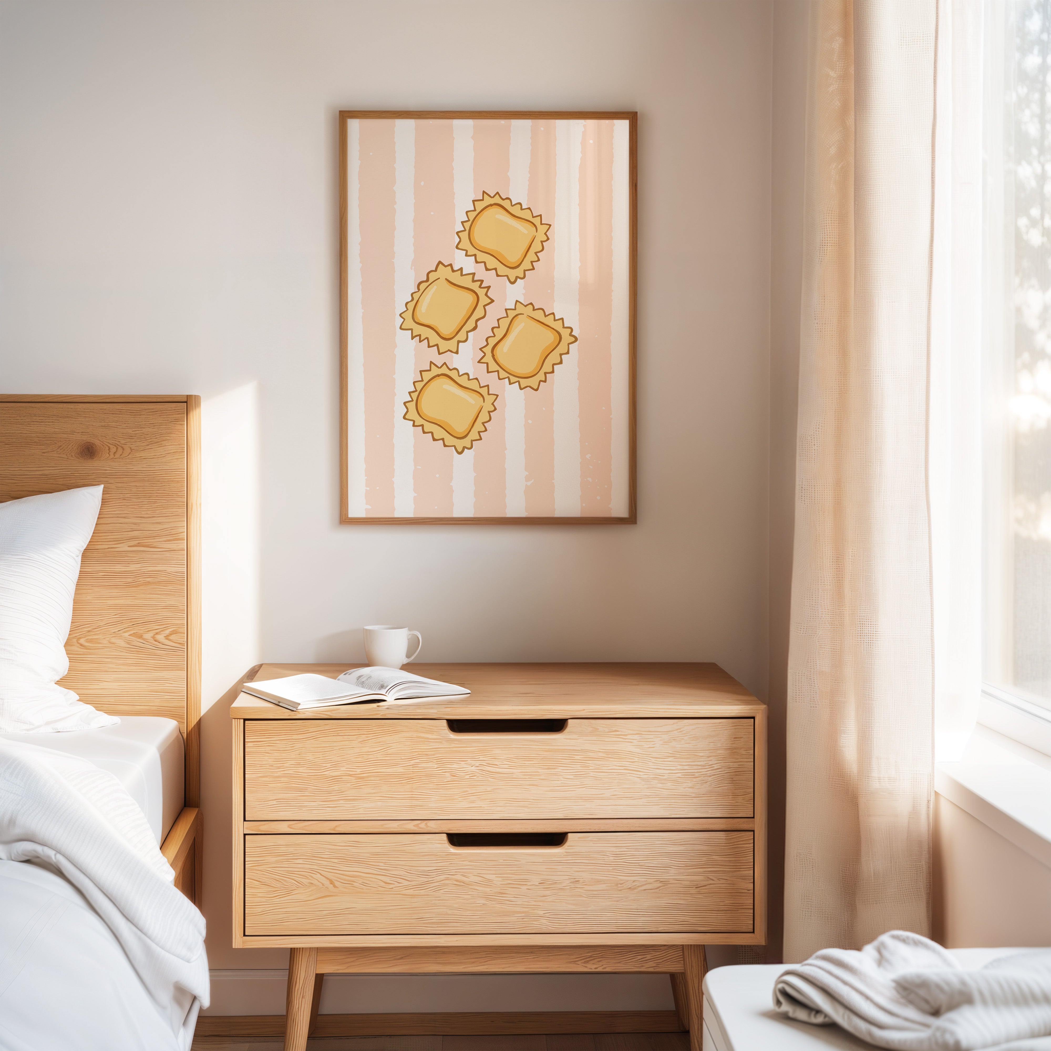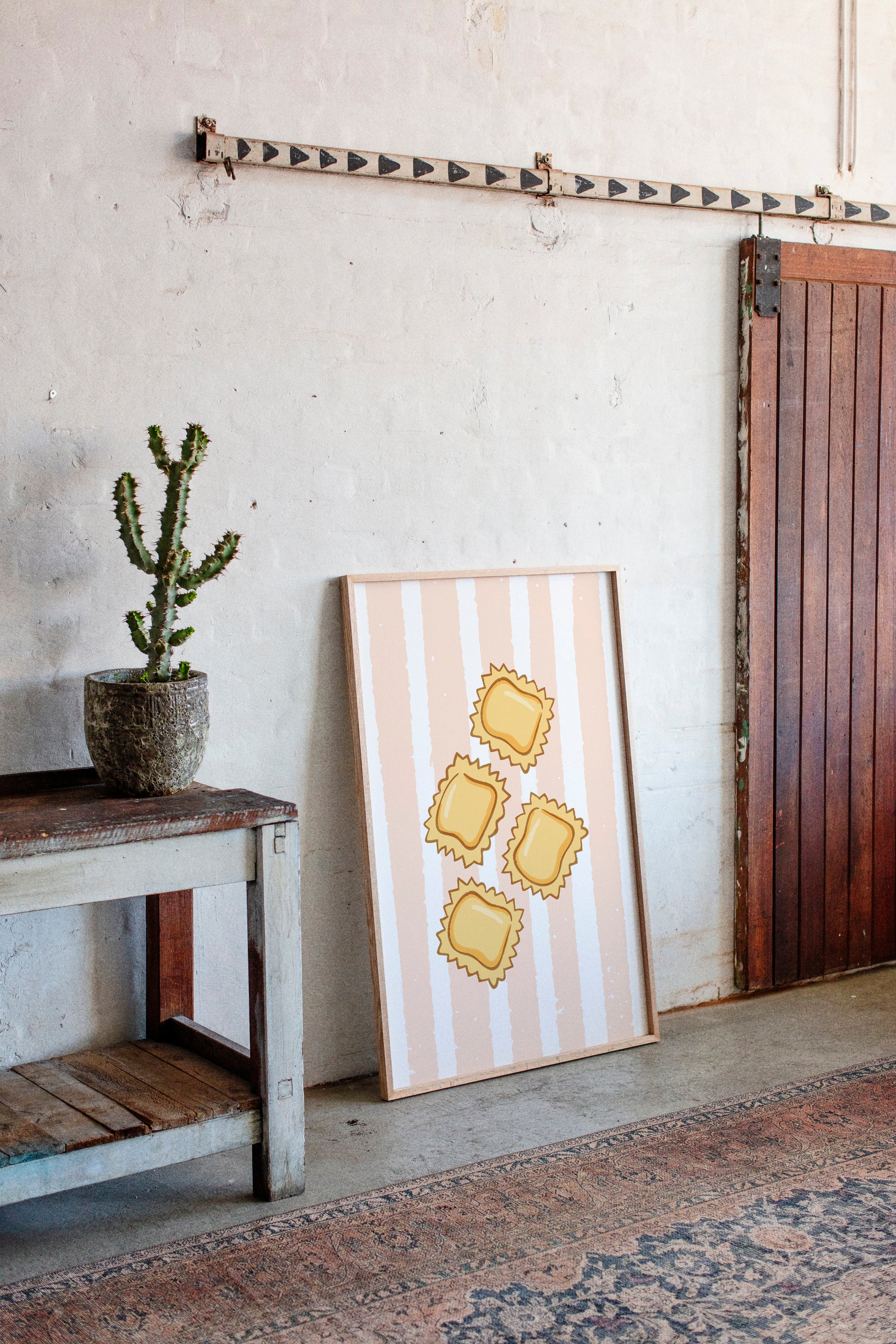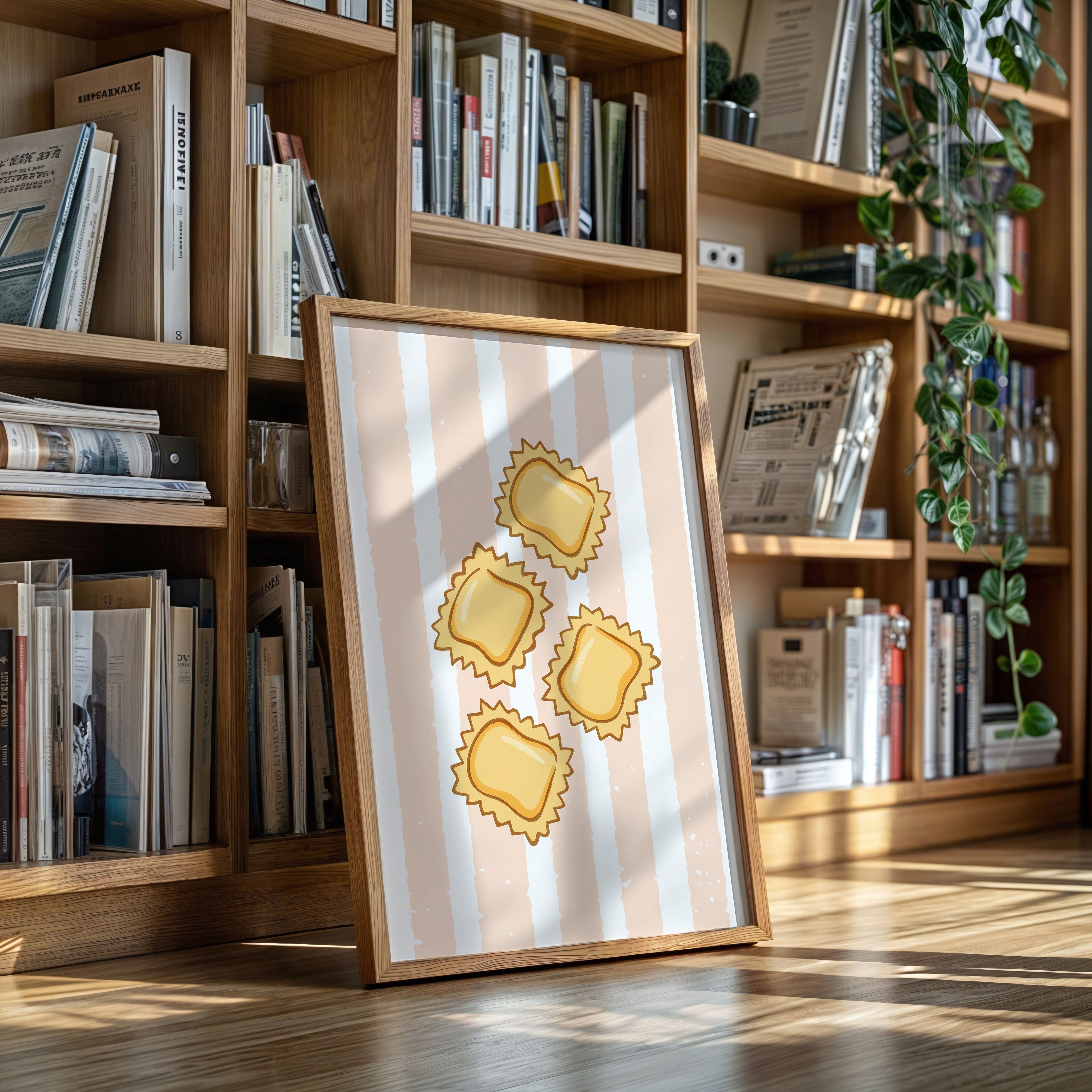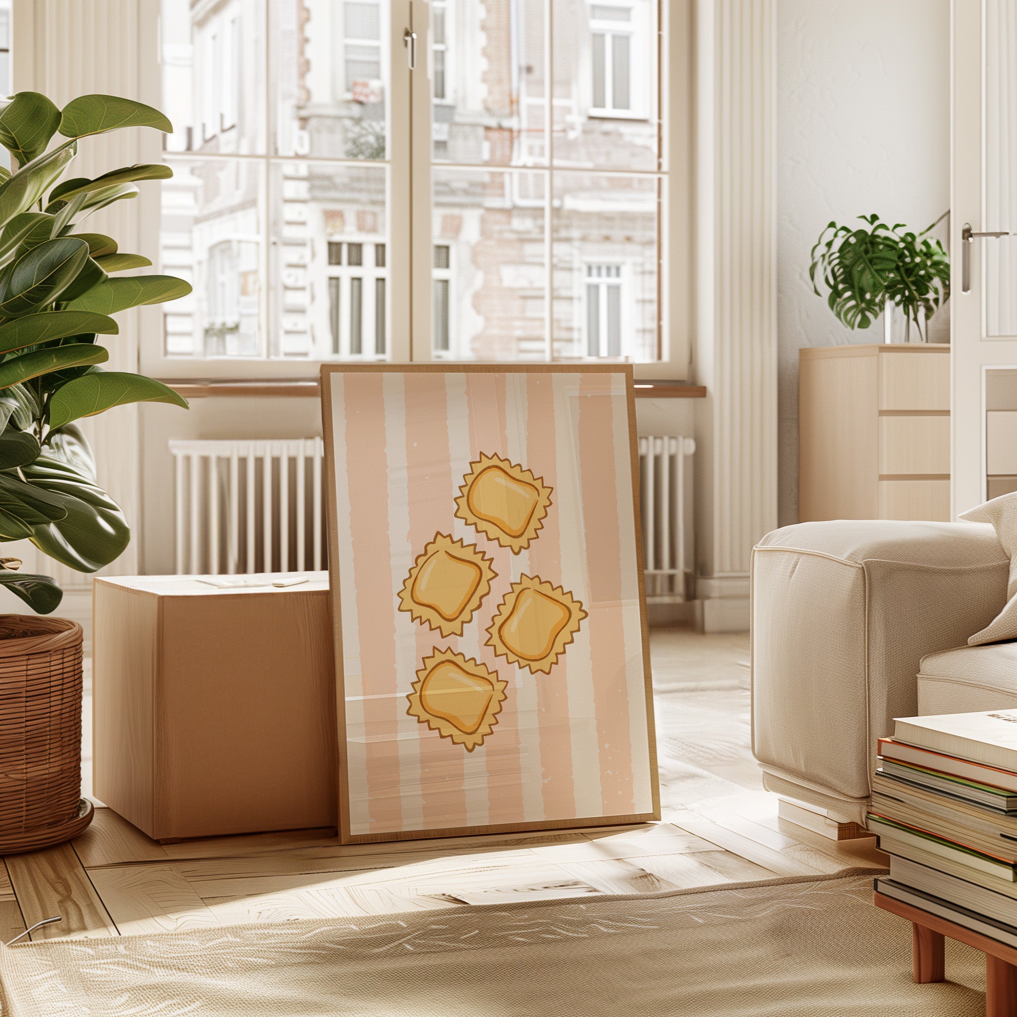 Golden pillows of pasta float gracefully against delicate peach stripes, like sunlight catching flour dust in a warm Italian kitchen. This playful contemporary piece captures the essence of modern culinary art with minimalist charm. The composition tells a story of handmade tradition meeting modern design, where each perfectly imperfect ravioli becomes a character in its own right, dancing across the canvas in a choreographed display of comfort and craft. Perfect for adding a dash of whimsy to a modern kitchen or dining space, this piece speaks to both food lovers and design enthusiasts alike. The soft color palette ensures it brings warmth without overwhelming your space.