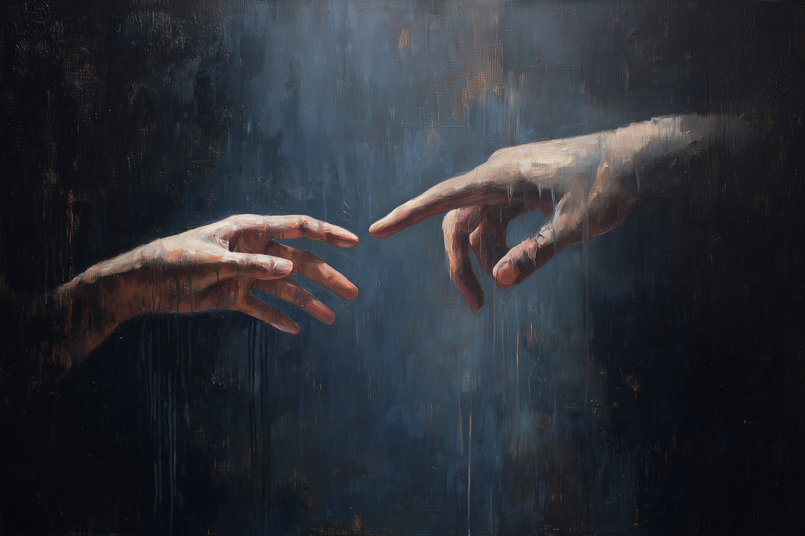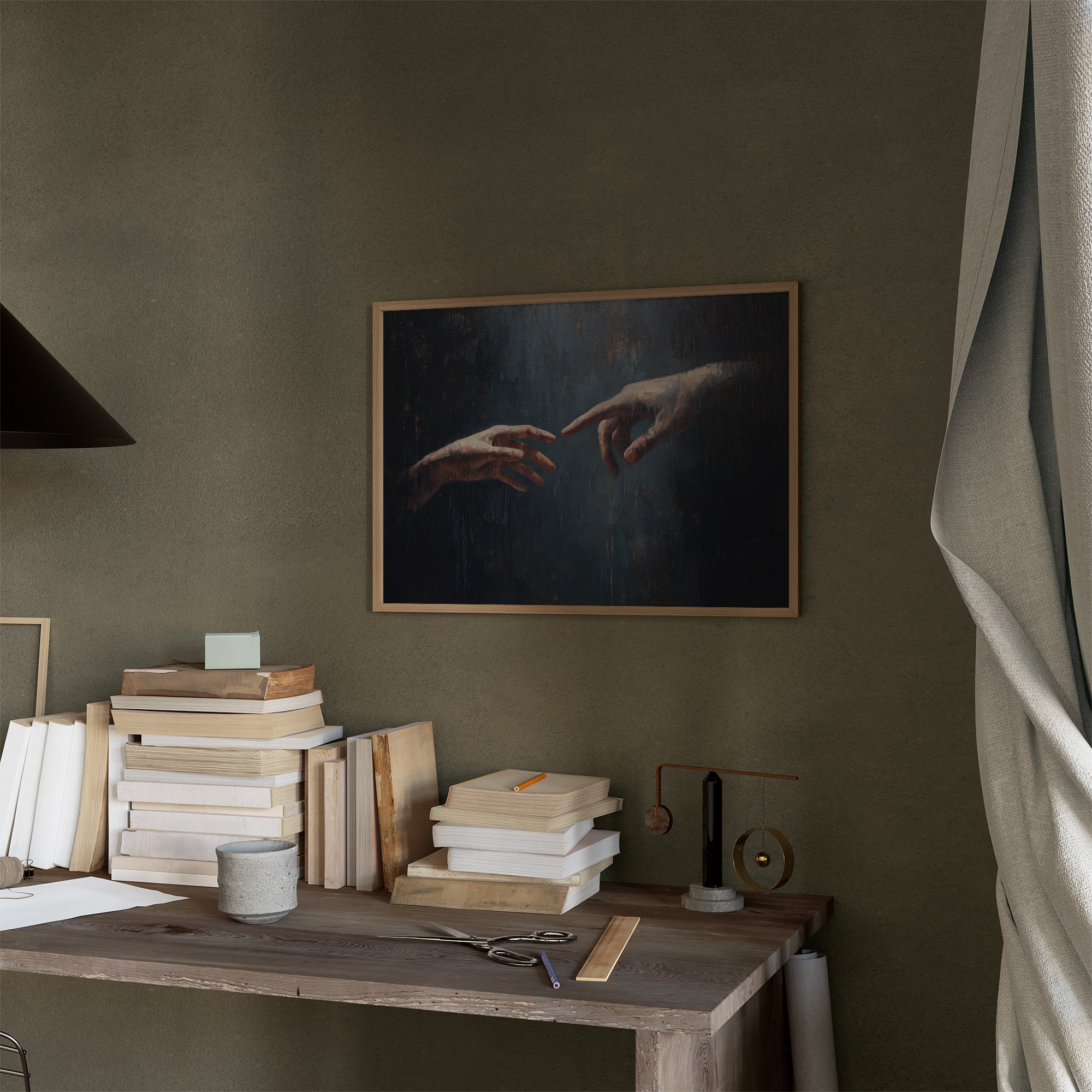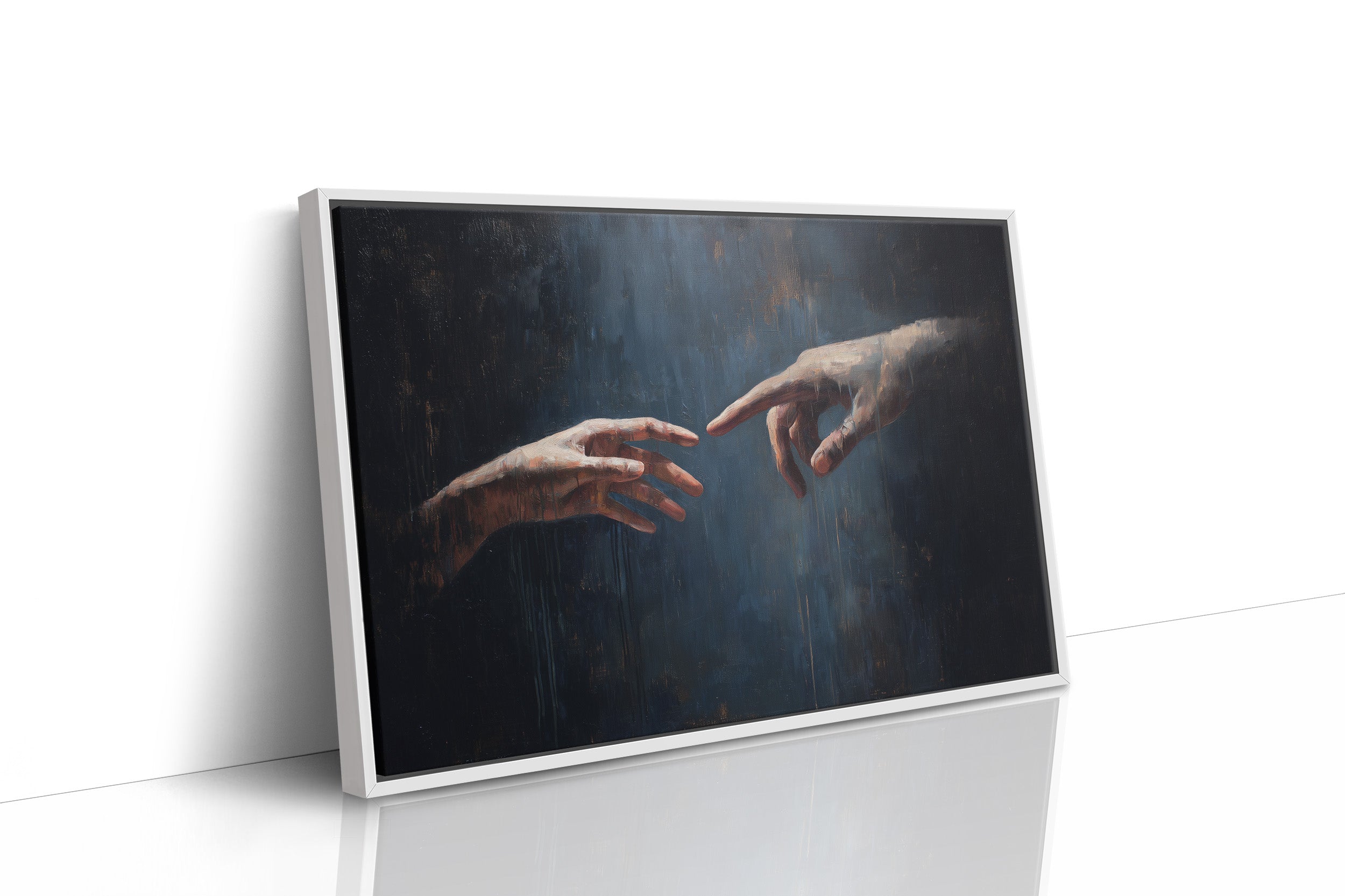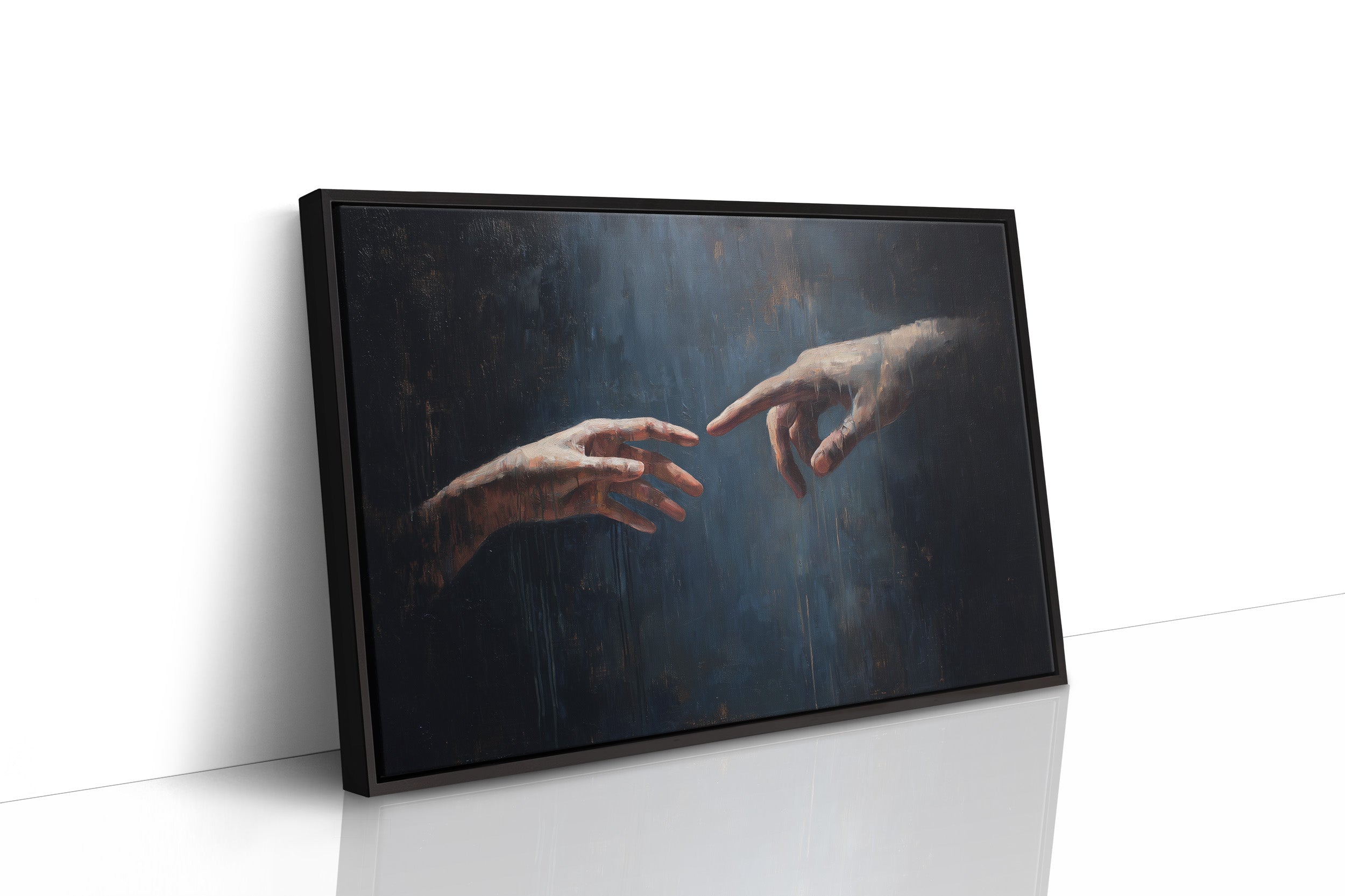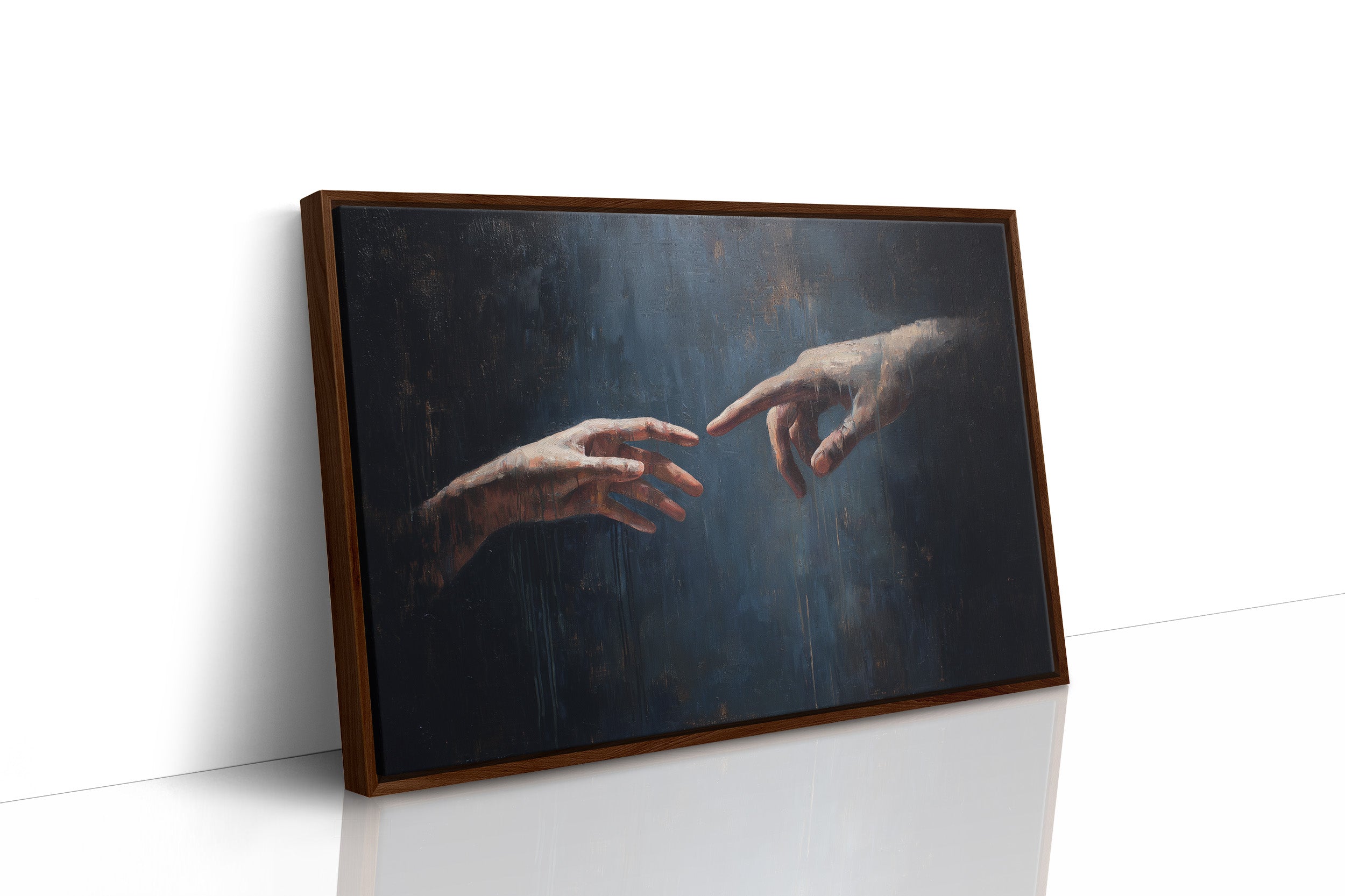 A moment suspended in time, where two hands nearly touch across a deep blue void, bathed in ethereal light. The classical painting sits framed in rich wood against a backdrop of countless book spines, creating a dialogue between artistic expression and literary knowledge. The contrast between the dark, moody painting and the warm wooden bookshelves evokes a sense of timelessness, where human connection remains our most profound story.