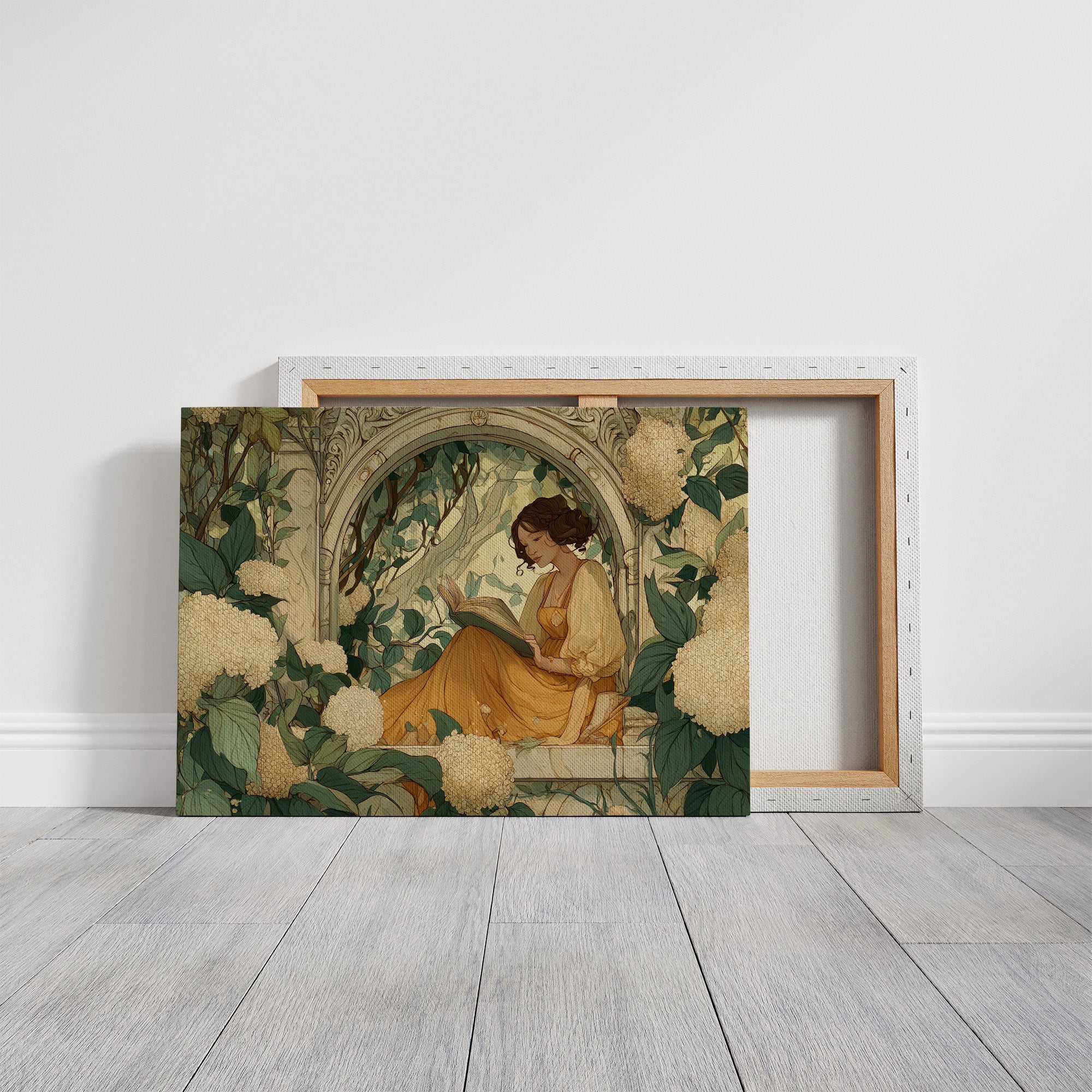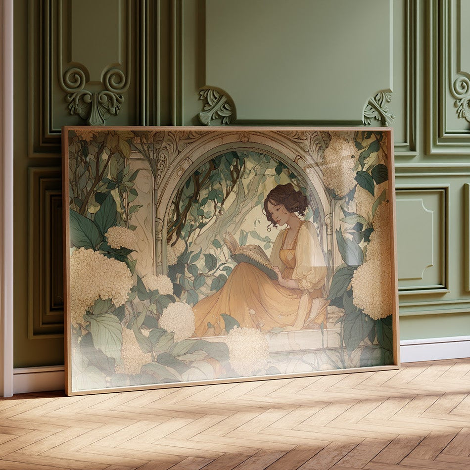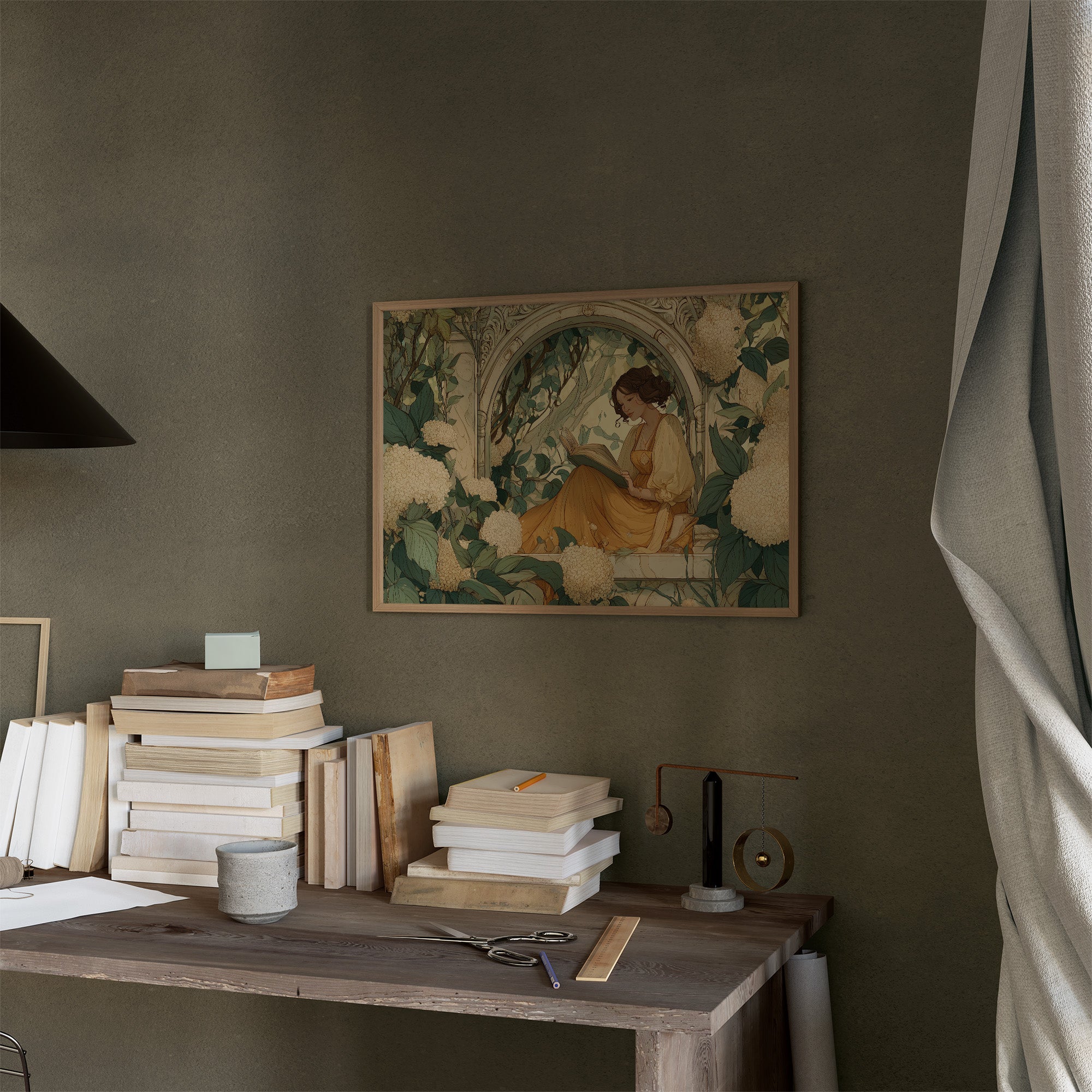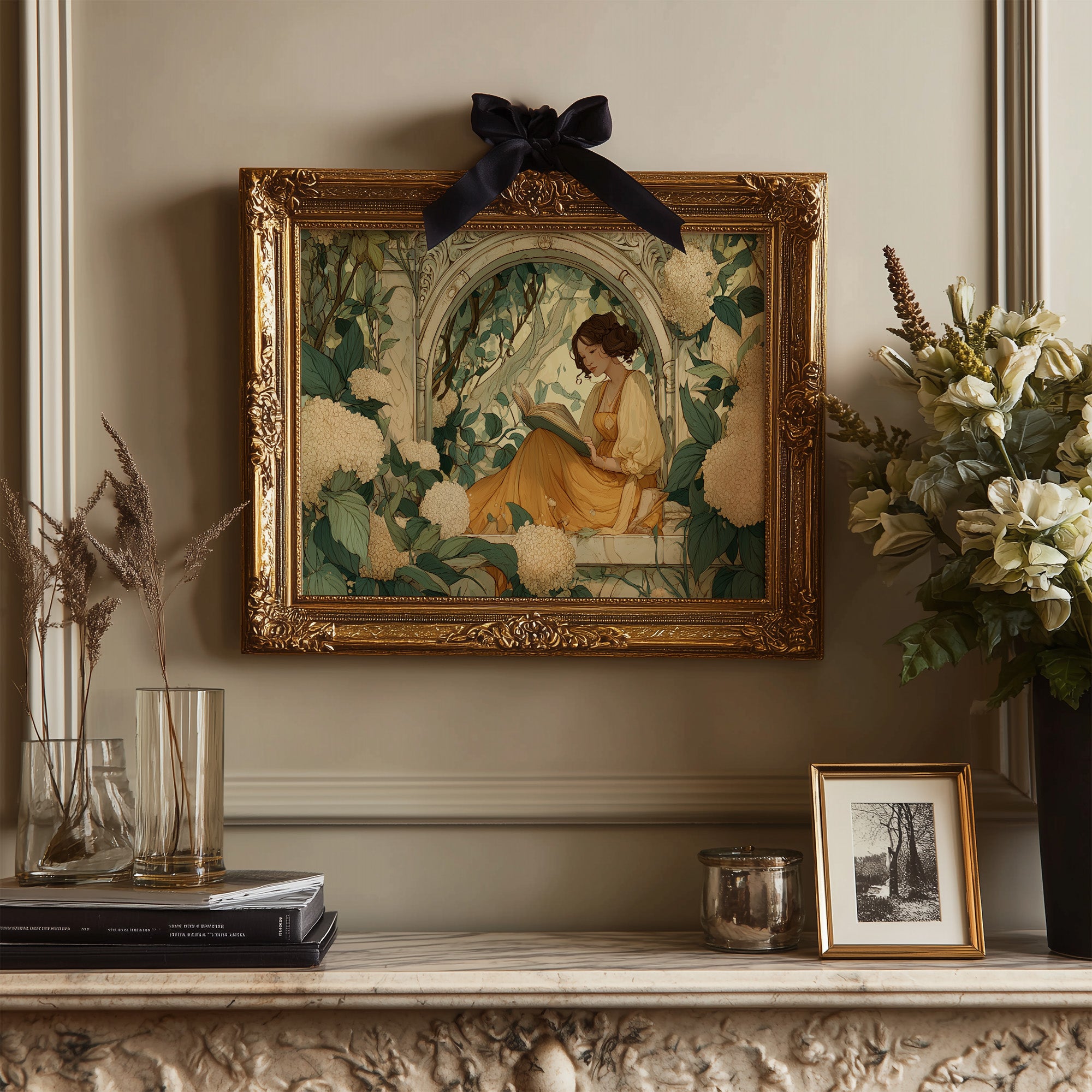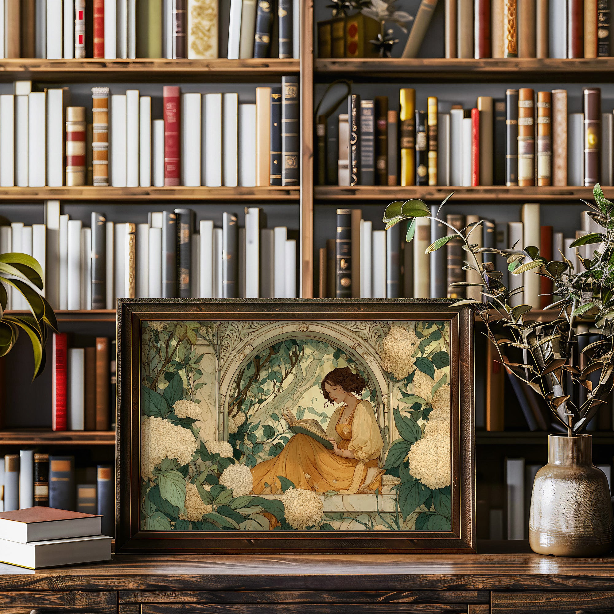 Sunlight caresses the pages as she loses herself between worlds, surrounded by creamy hydrangea blooms and verdant leaves. The Art Nouveau framing creates a perfect portal where literature and nature intertwine, the golden dress catching light like afternoon sun through library windows. Rich wooden bookshelves stand sentinel behind the artwork, creating layers of stories both within the frame and beyond it.