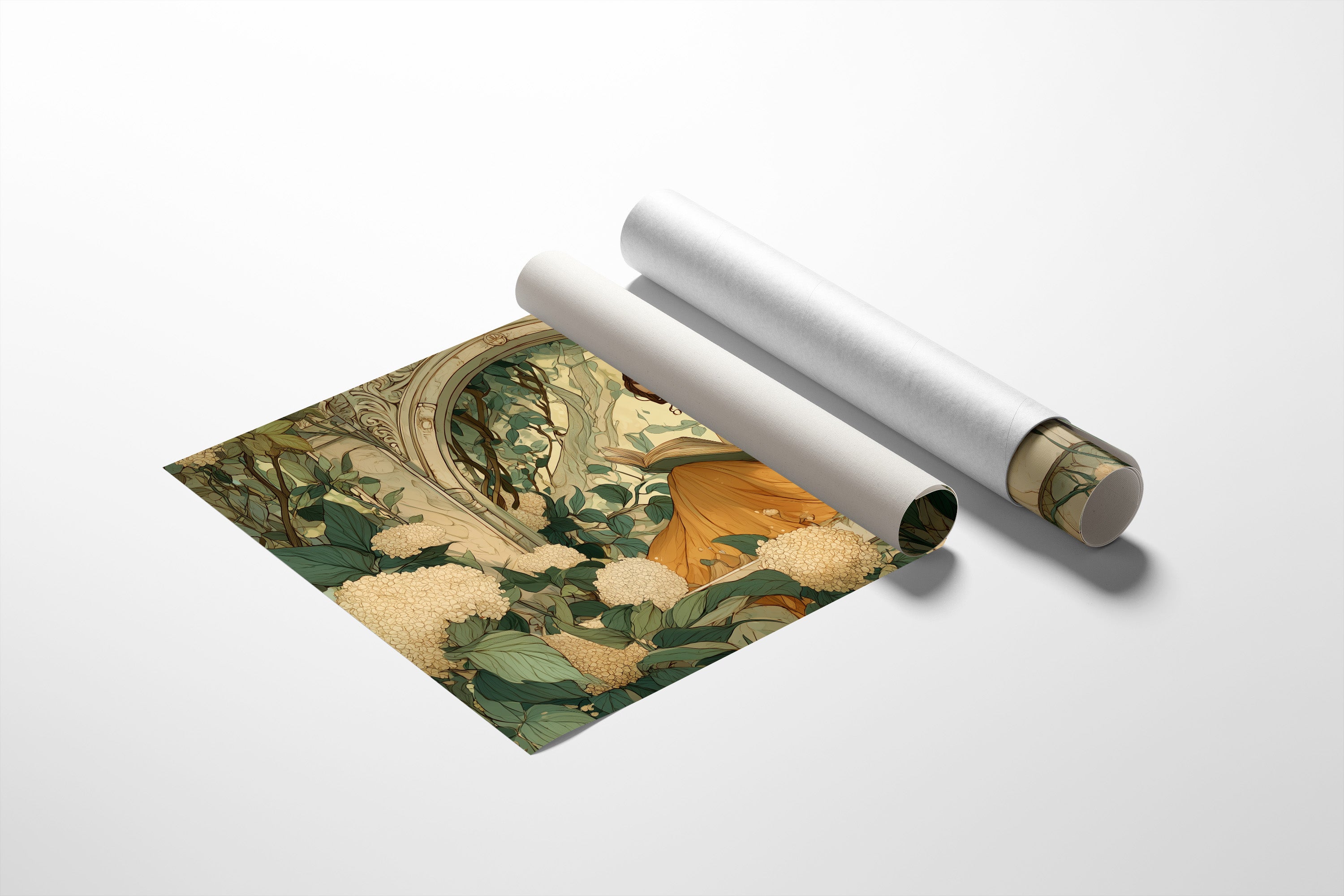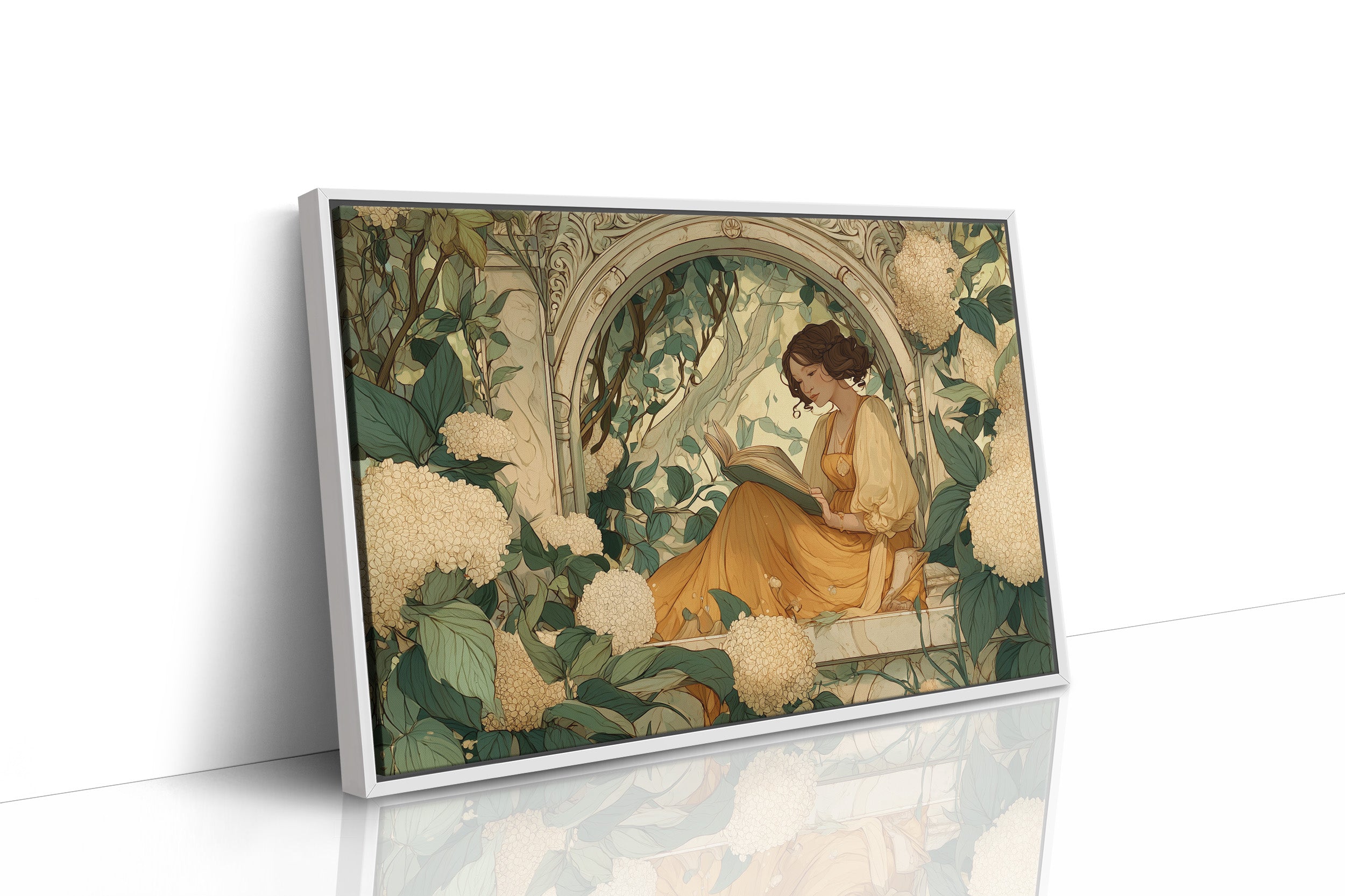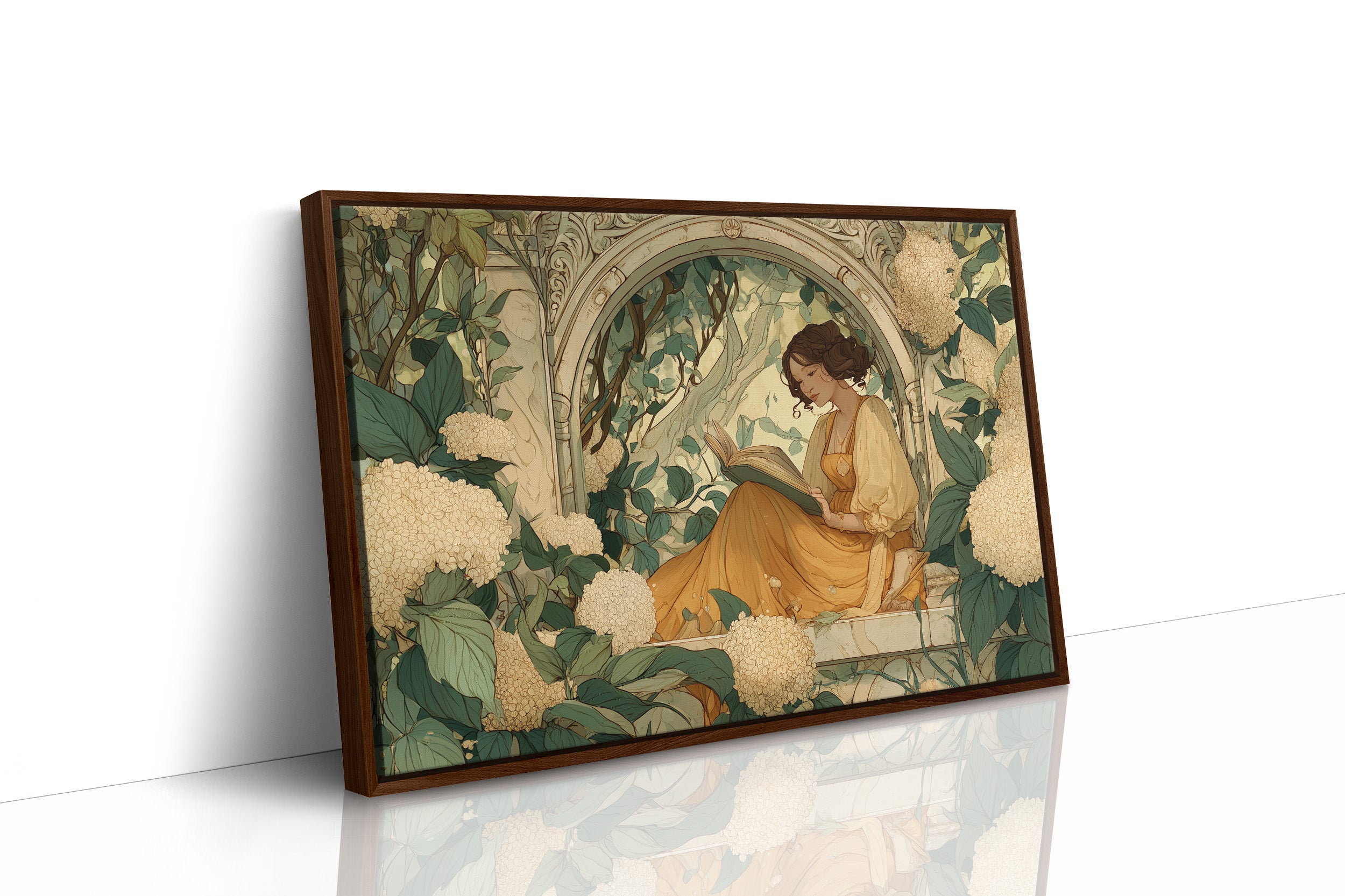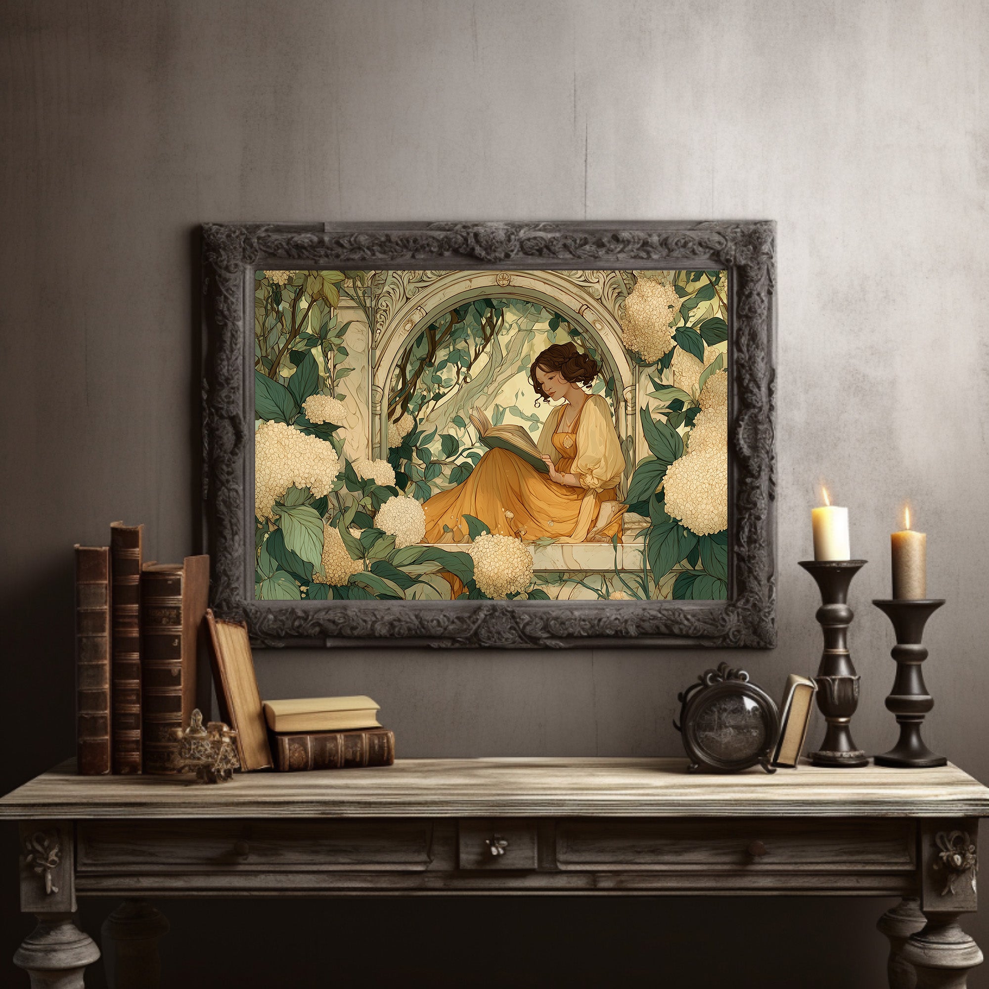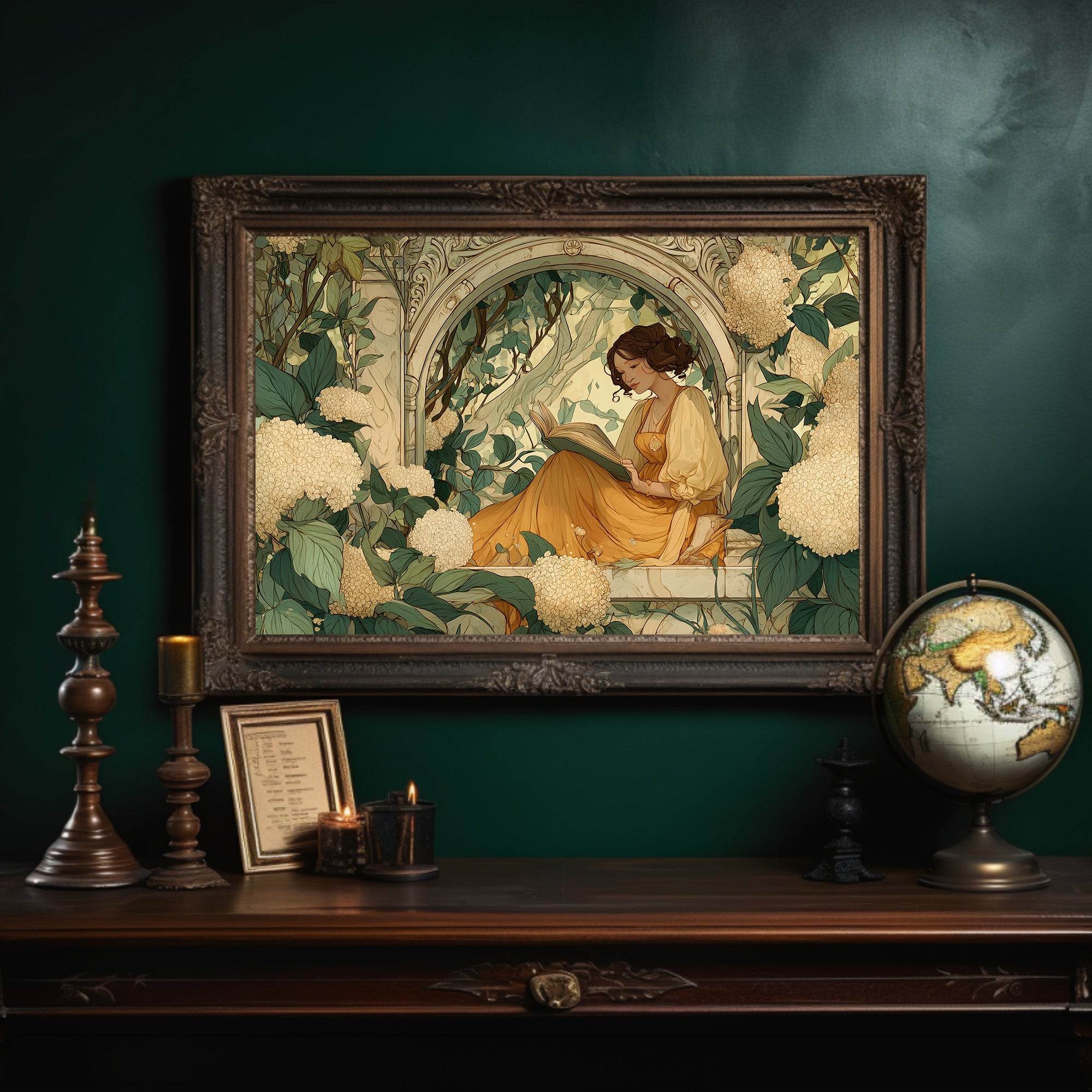 Sunlight caresses the pages as she loses herself between worlds, surrounded by creamy hydrangea blooms and verdant leaves. The Art Nouveau framing creates a perfect portal where literature and nature intertwine, the golden dress catching light like afternoon sun through library windows. Rich wooden bookshelves stand sentinel behind the artwork, creating layers of stories both within the frame and beyond it.