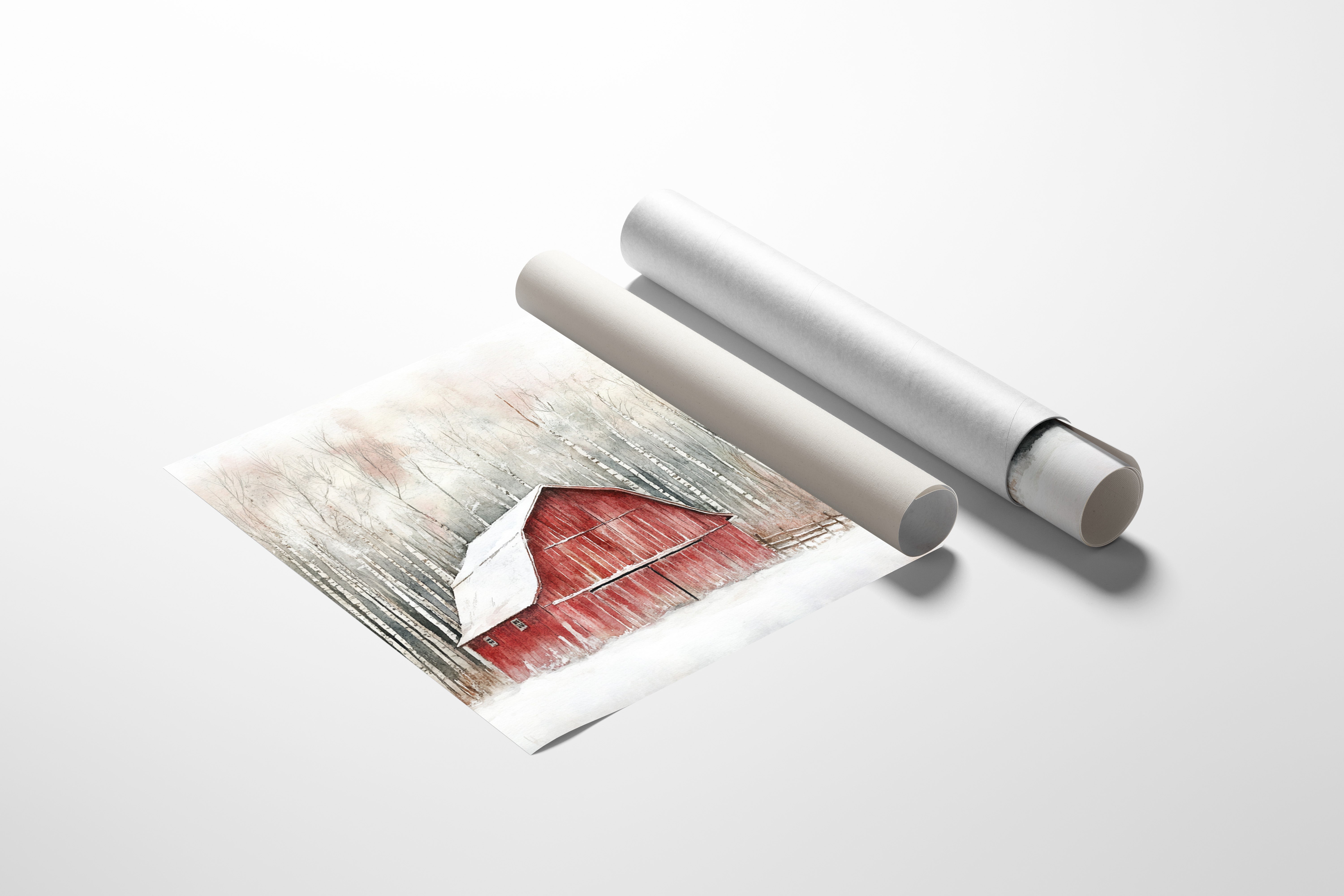 Snow settles softly around a weathered barn, its crimson walls standing bold against the white winter landscape. Delicate birch trees create a ethereal backdrop, their pale trunks rising like gentle sentinels through the misty morning air. A majestic evergreen stands guard at the edge of the scene, its snow-laden branches adding depth to the serene winter tableau. The rustic wooden fence traces a quiet line through the snow, connecting the barn to the surrounding wilderness. This peaceful scene would bring a touch of nostalgic winter charm to a living room or study, especially paired with warm, natural textures.