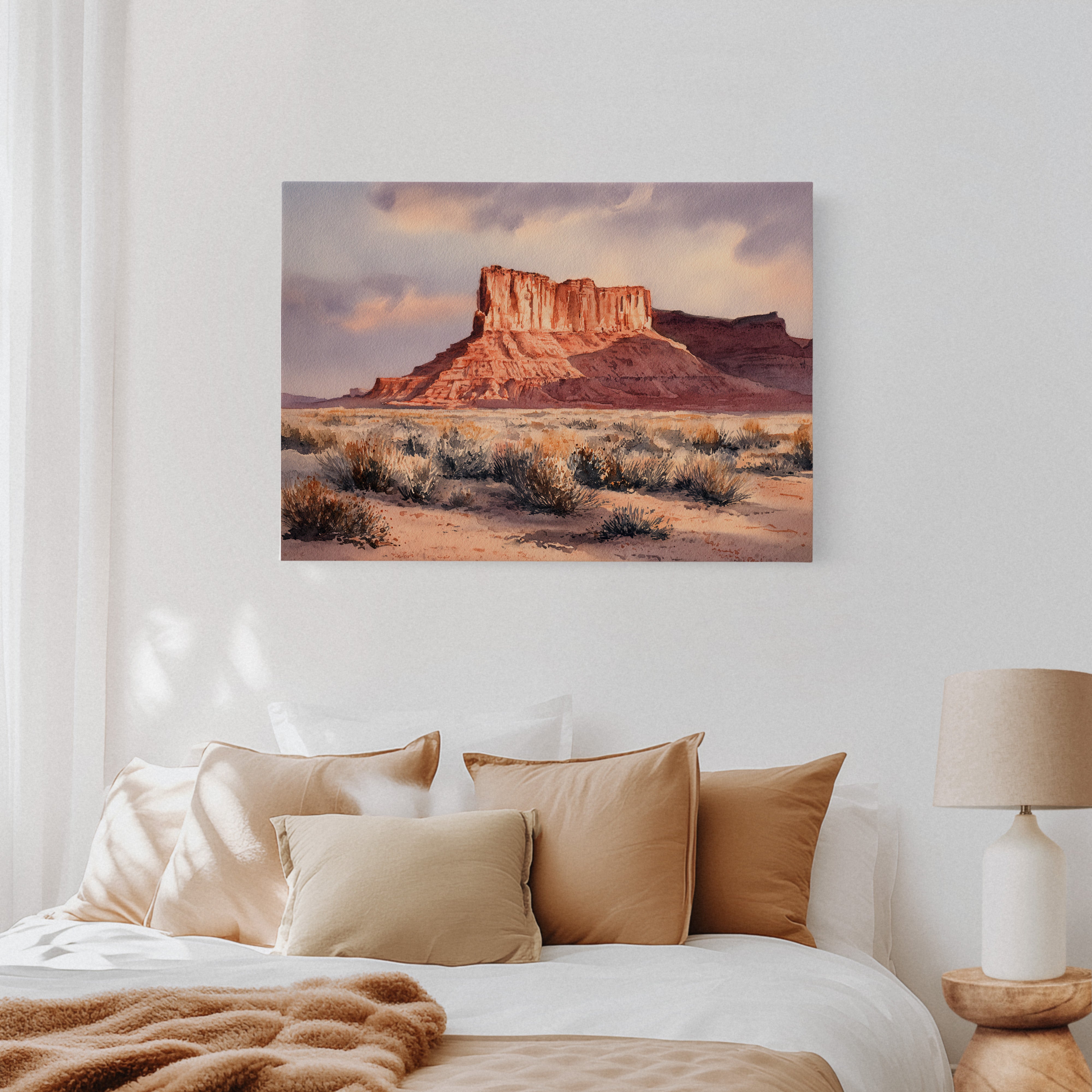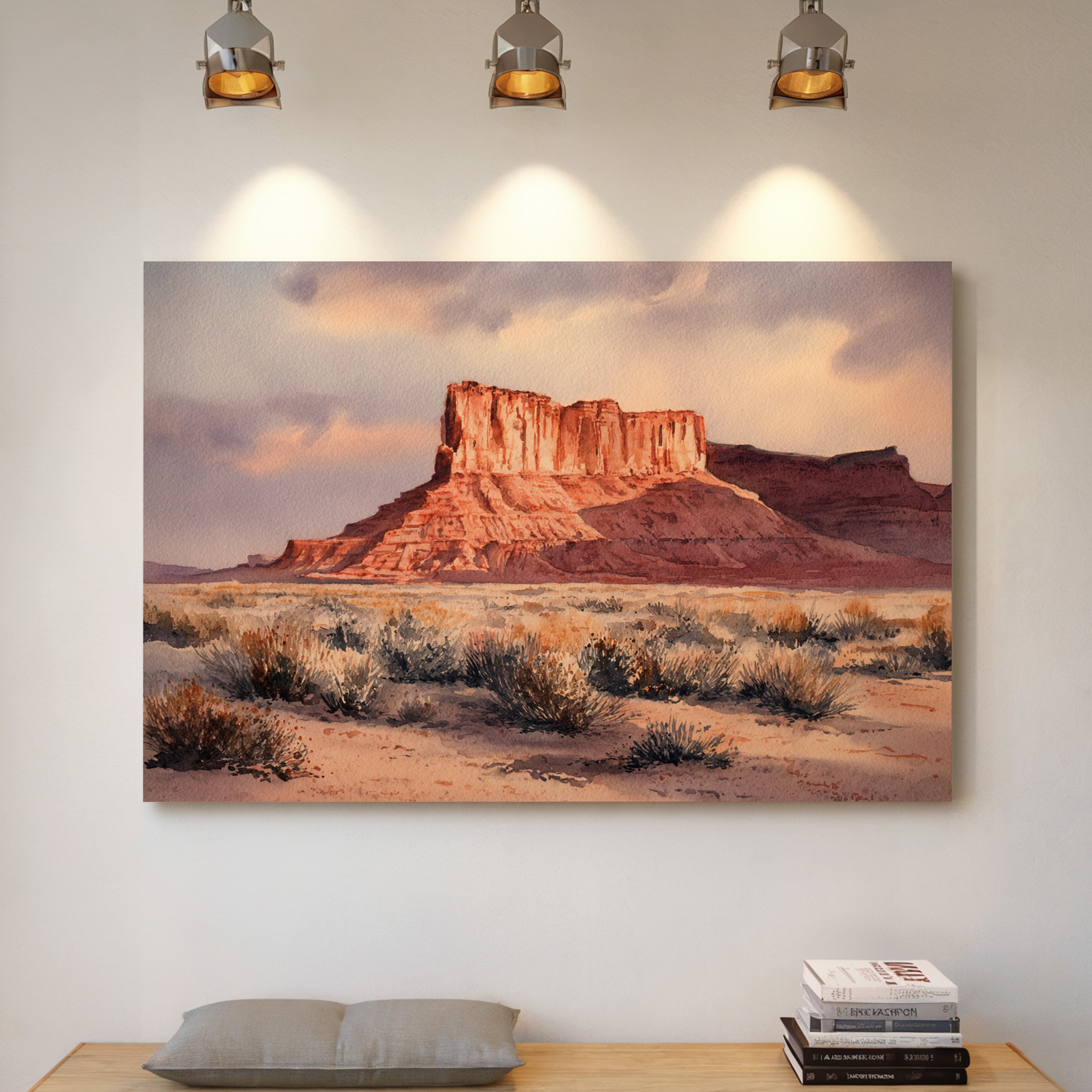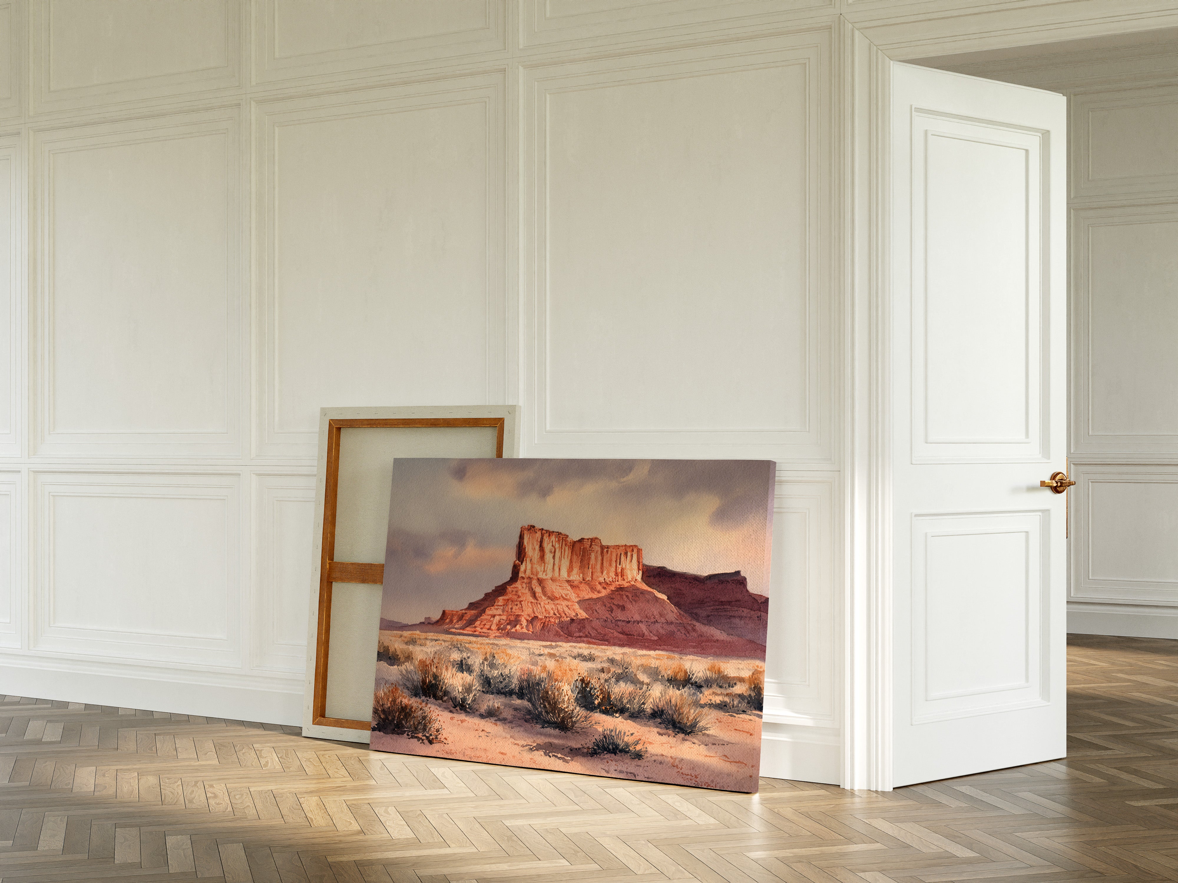 Sunlight bathes the towering mesa in warm copper tones, casting long shadows across the desert floor. The weathered sandstone formation stands like a natural fortress, its stratified layers telling stories of millennia past. Scattered sage and desert brush dot the foreground, their muted greens and golds creating a delicate contrast against the sun-baked earth. The lavender sky hints at approaching dusk, when the desert's fierce heat gives way to cool stillness. This piece brings the majesty of the American Southwest into living spaces, ideal for creating a focal point in great rooms or offices where its peaceful grandeur can be fully appreciated.