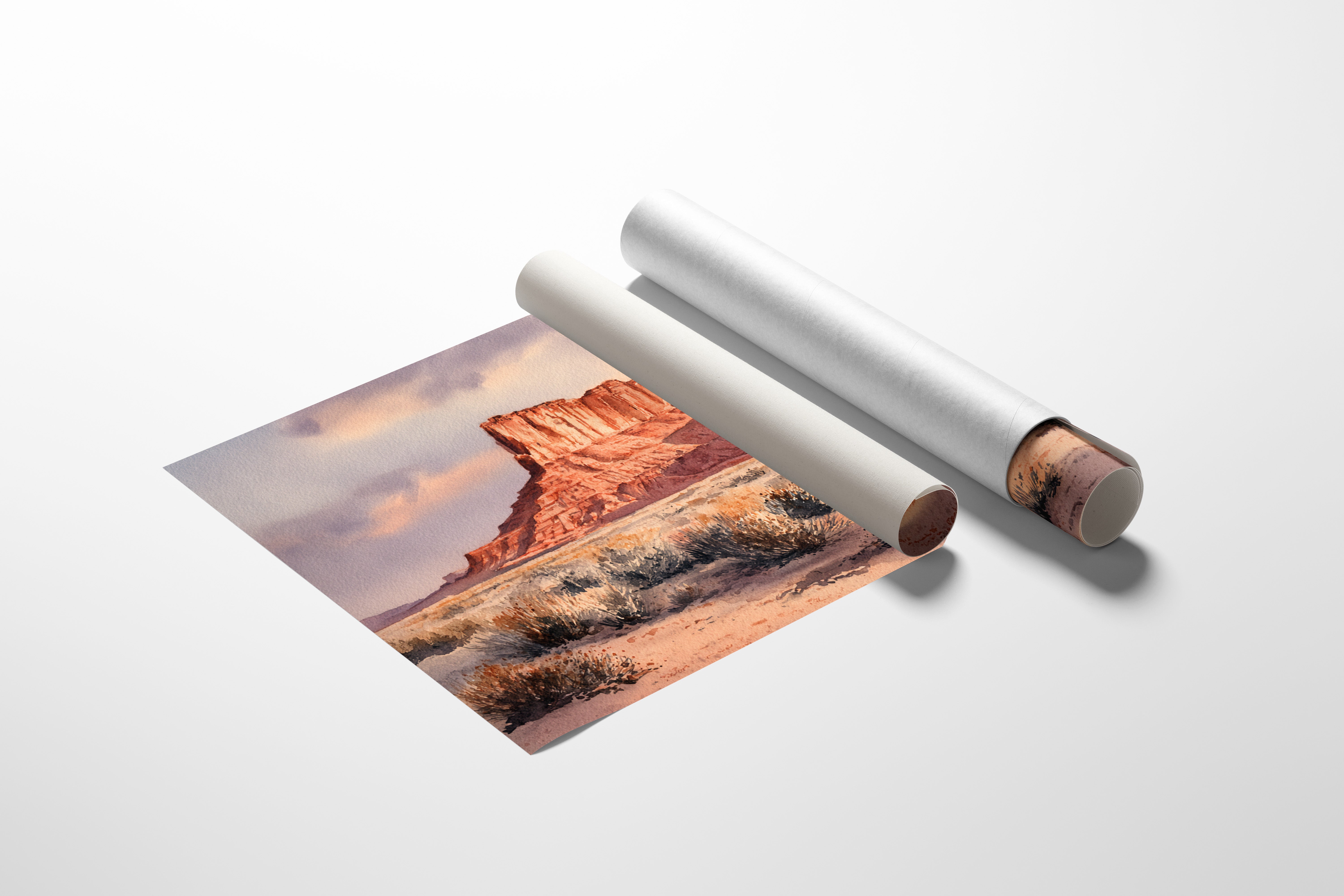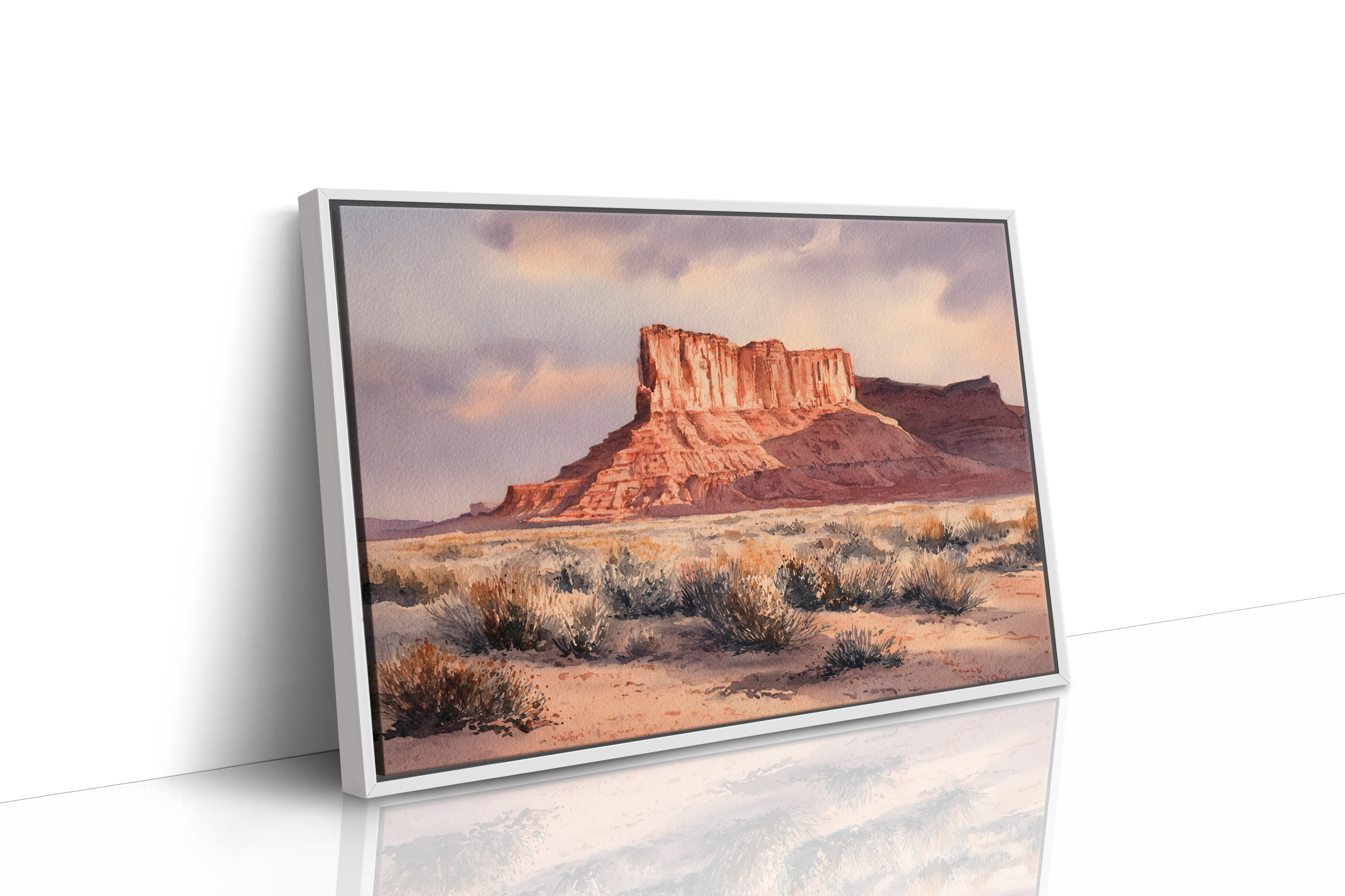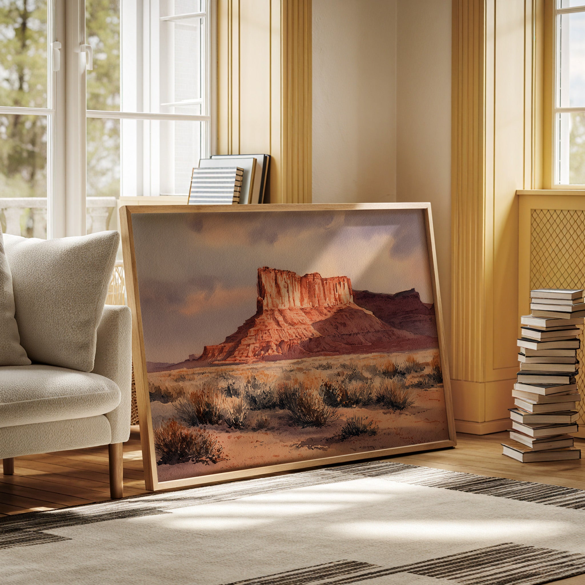 Sunlight bathes the towering mesa in warm copper tones, casting long shadows across the desert floor. The weathered sandstone formation stands like a natural fortress, its stratified layers telling stories of millennia past. Scattered sage and desert brush dot the foreground, their muted greens and golds creating a delicate contrast against the sun-baked earth. The lavender sky hints at approaching dusk, when the desert's fierce heat gives way to cool stillness. This piece brings the majesty of the American Southwest into living spaces, ideal for creating a focal point in great rooms or offices where its peaceful grandeur can be fully appreciated.