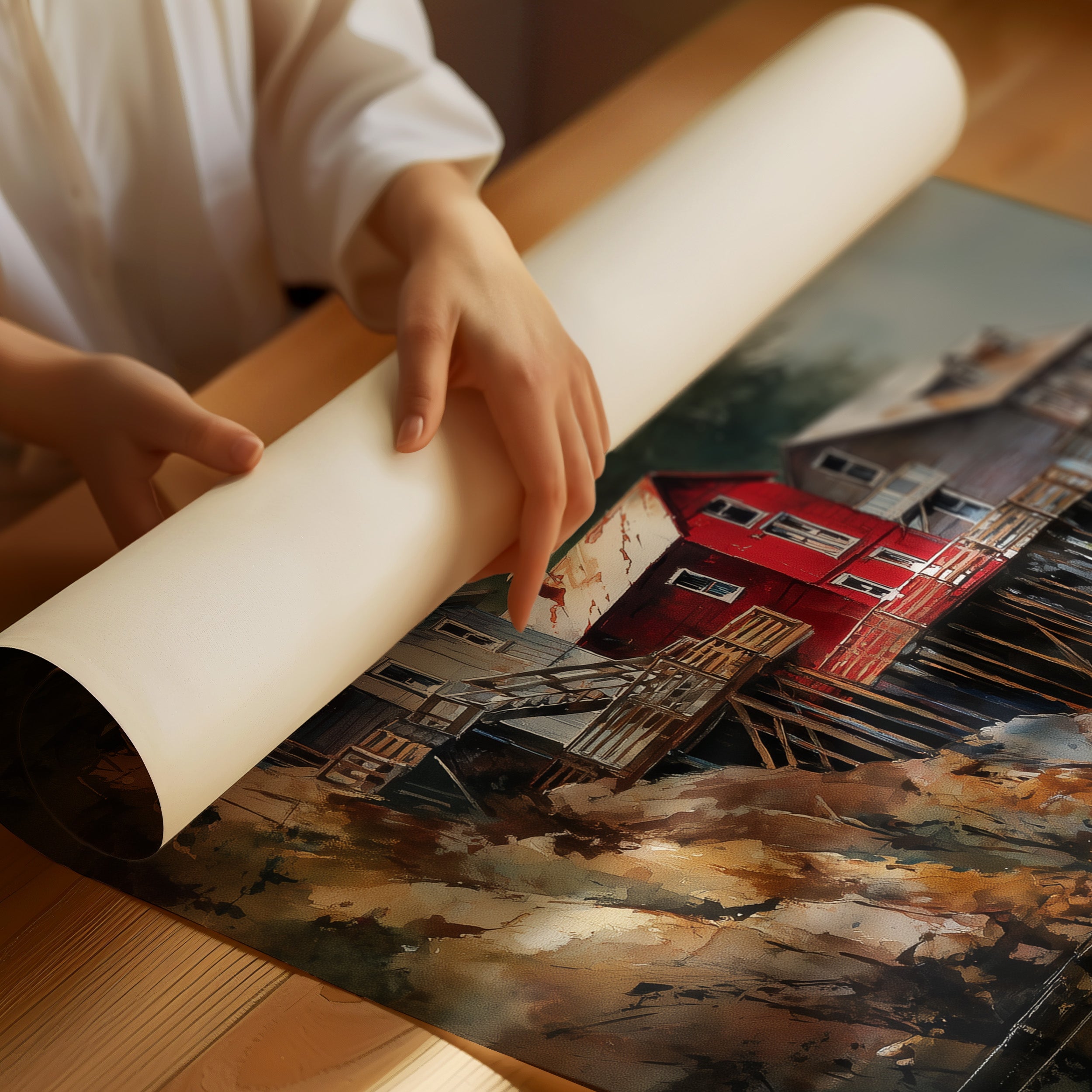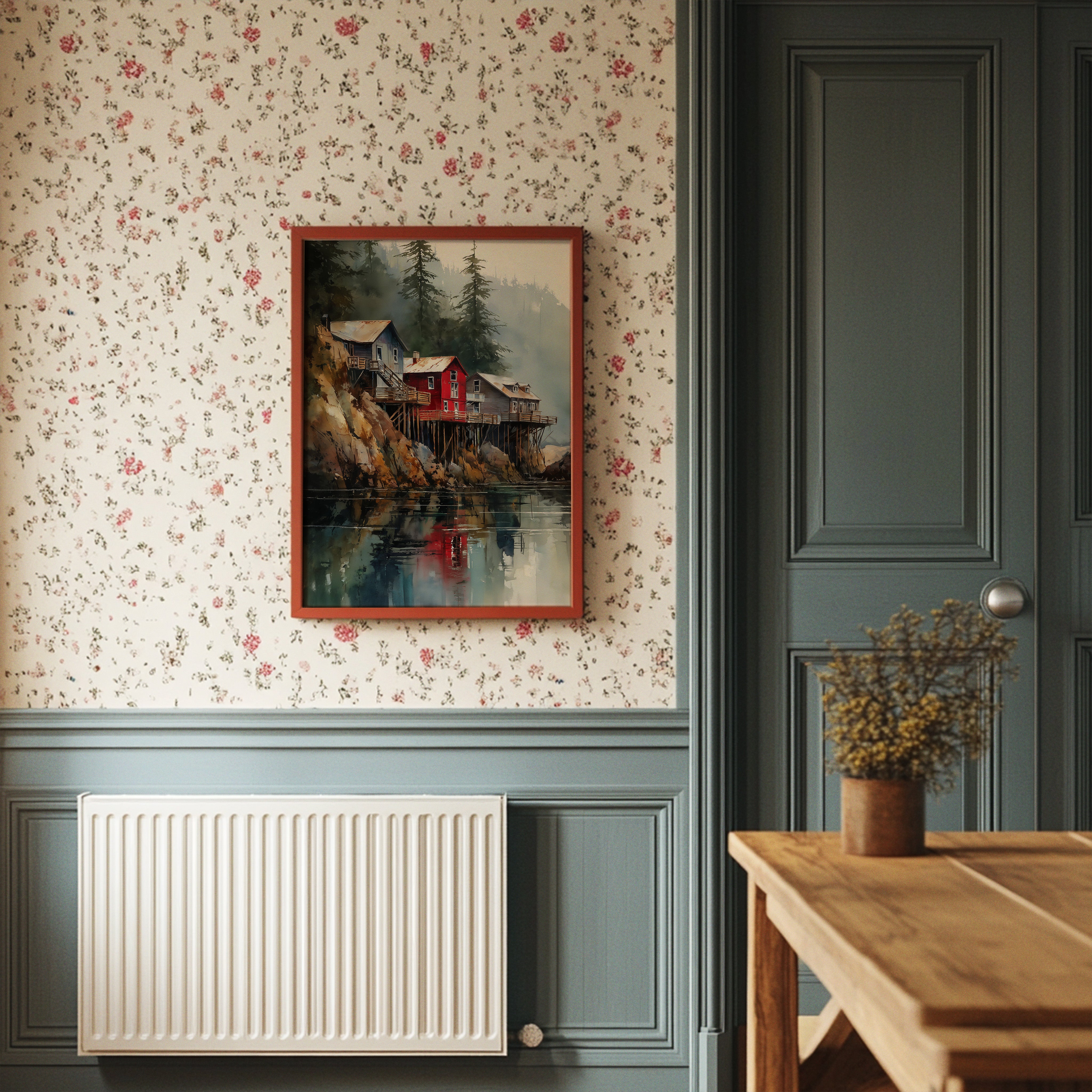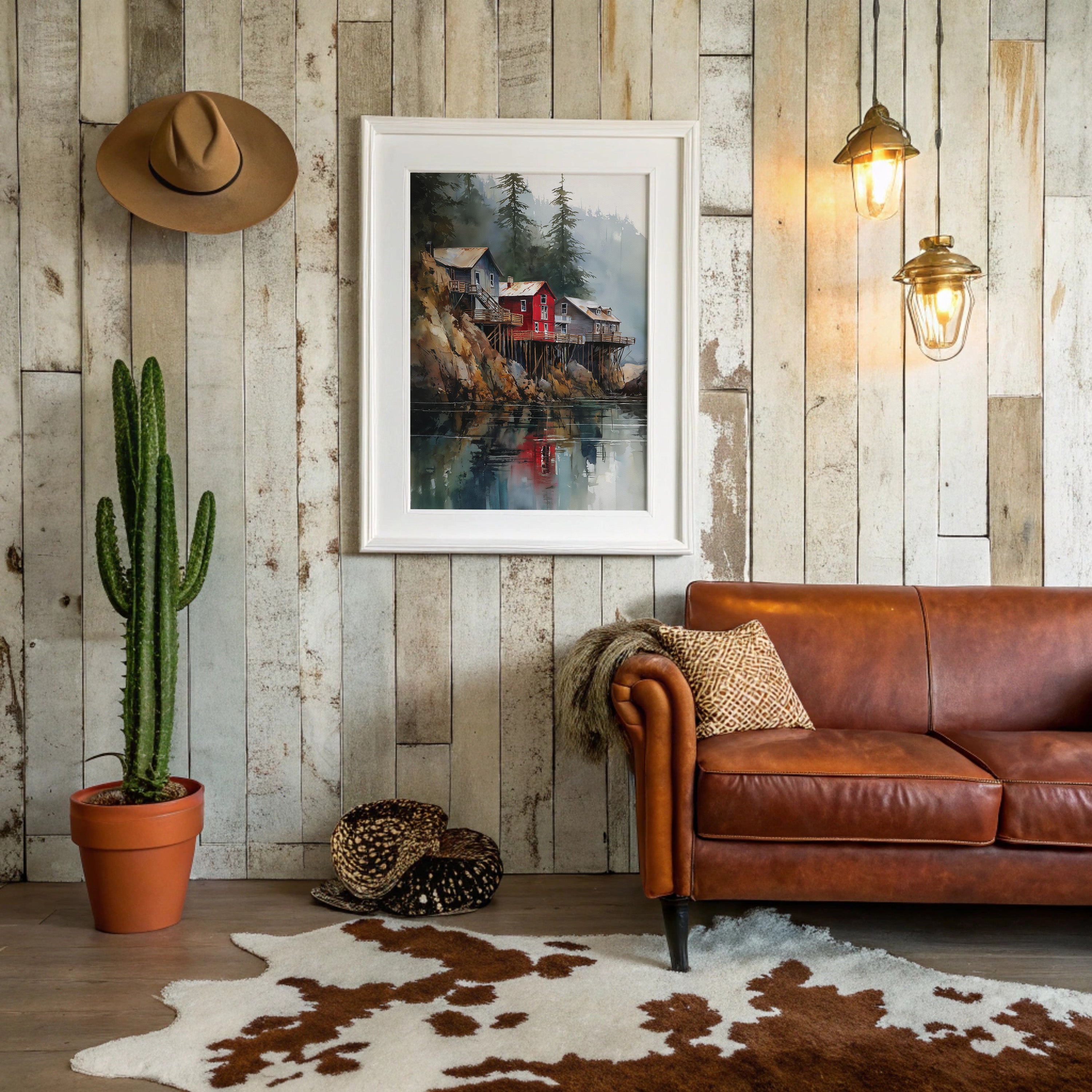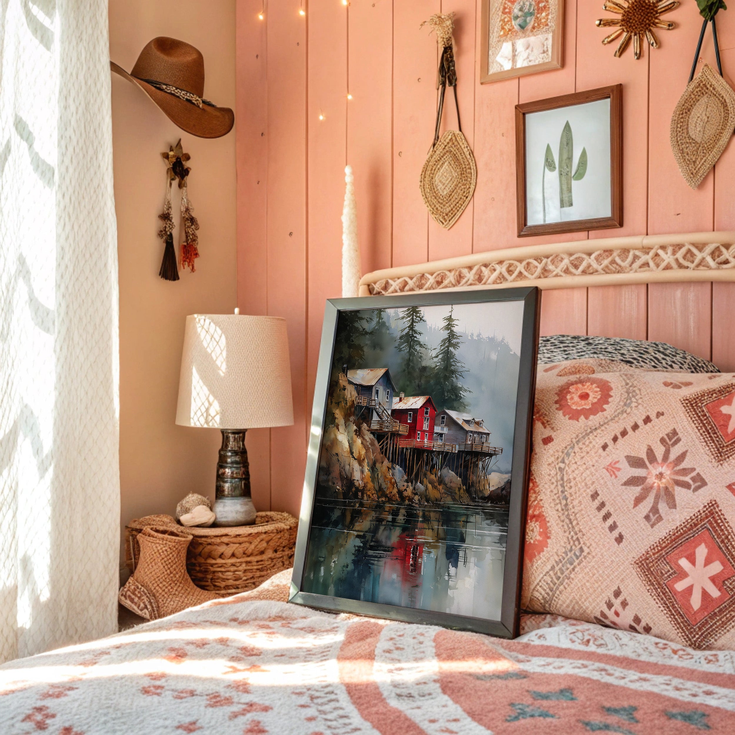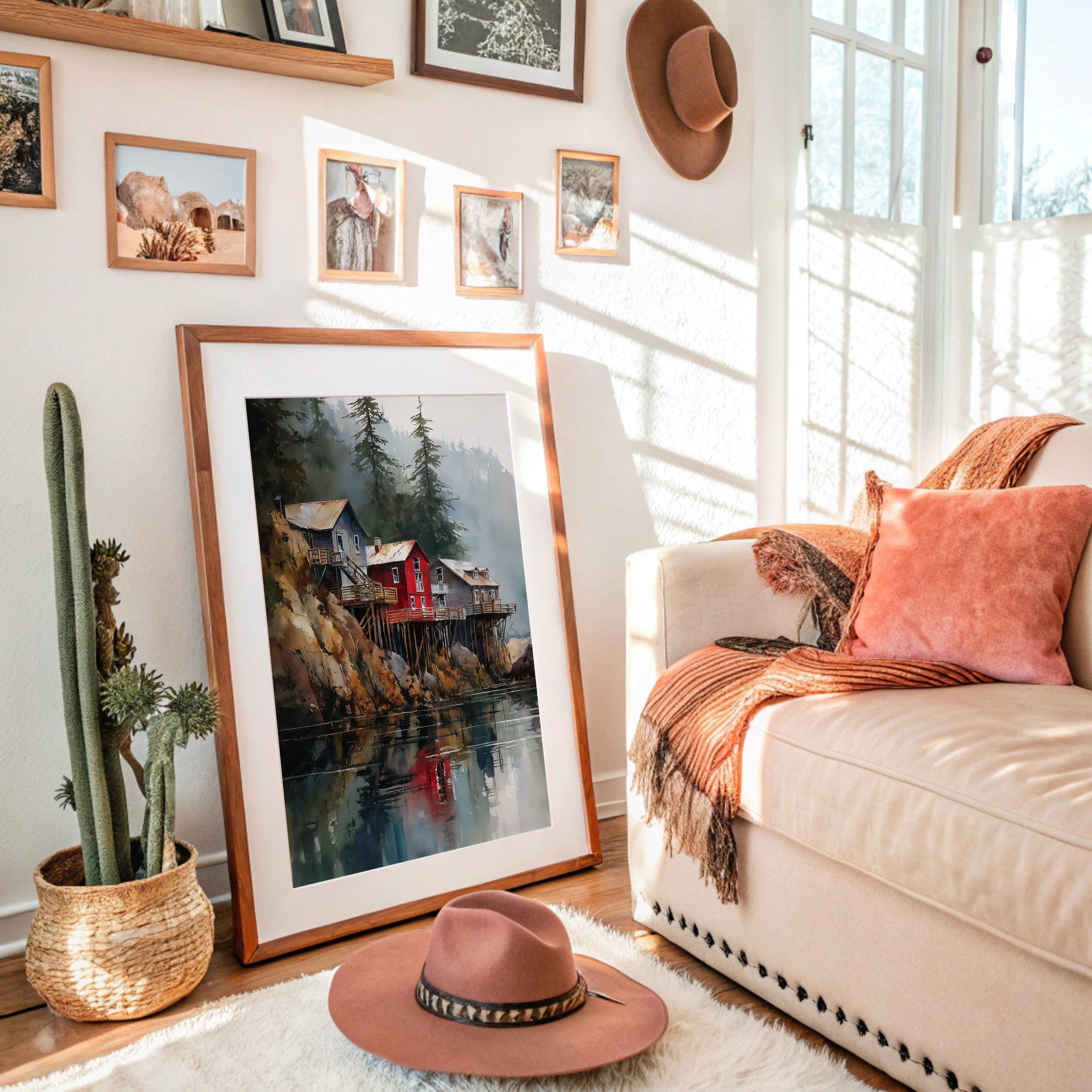 Mist clings to evergreen spires as weathered houses balance delicately above glassy waters, their reflections painting double stories in the calm bay below. This contemporary coastal scene captures the rugged romance of Pacific Northwest living. Perched on stilts against dramatic rocky cliffs, the collection of homes - anchored by a striking red dwelling - stands as a testament to humanity's determined dance with nature. The scene's moody atmosphere is enhanced by the perfect mirror of still waters, creating a dreamlike symmetry between sky and sea. This piece brings serene coastal energy to modern rustic spaces, perfectly complementing rooms that blend natural elements with contemporary comfort. The rich colors and peaceful composition invite quiet contemplation of where land meets sea.
