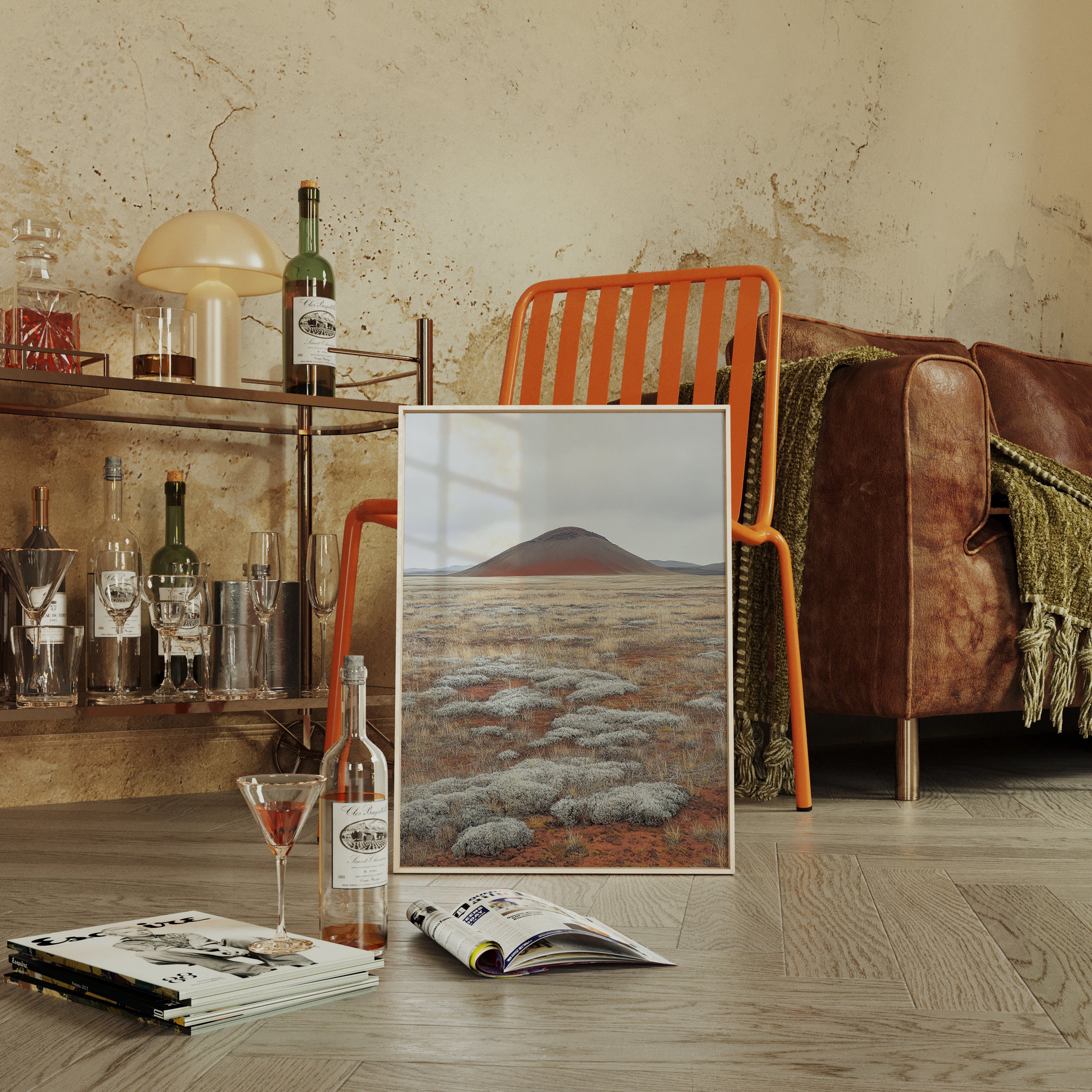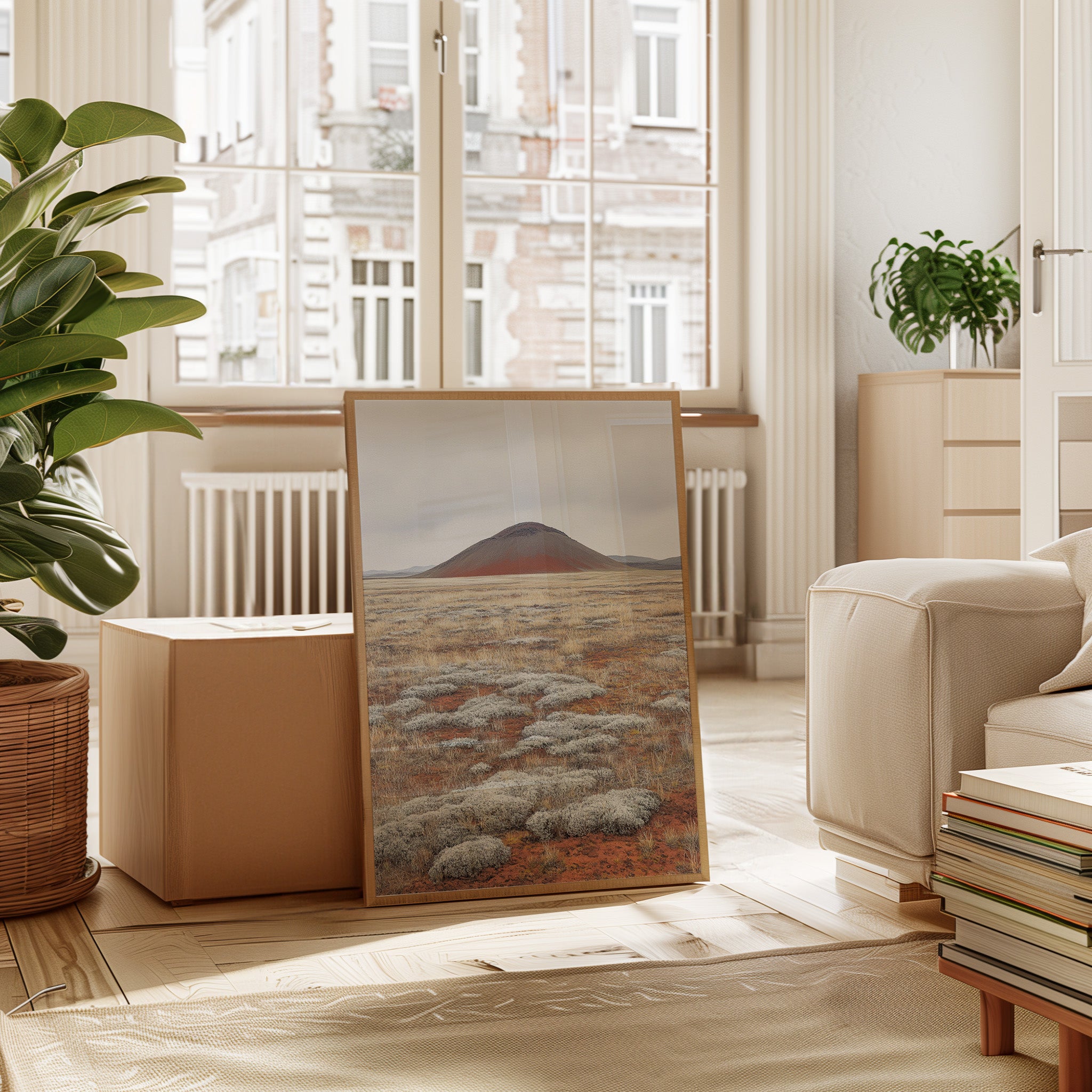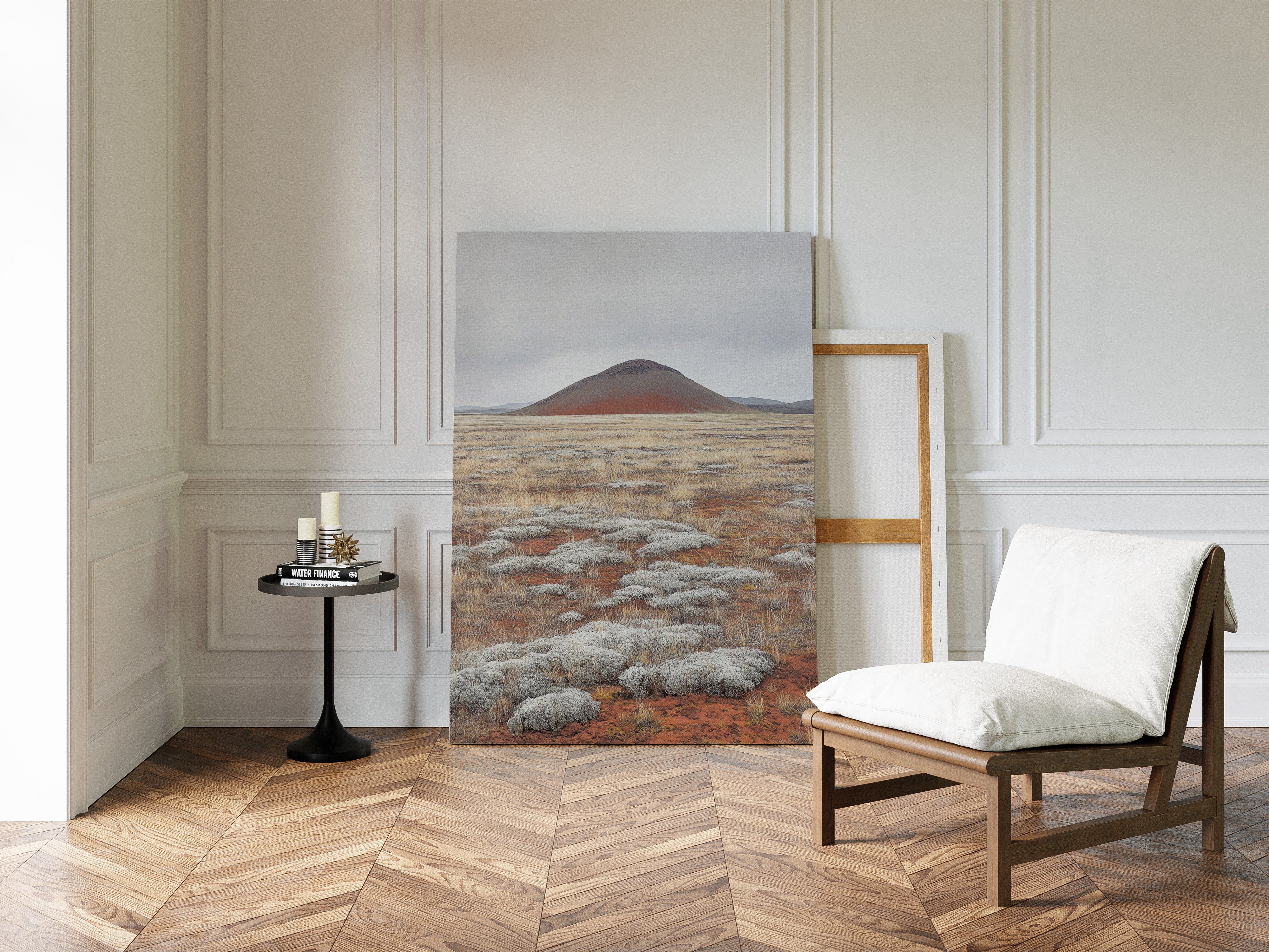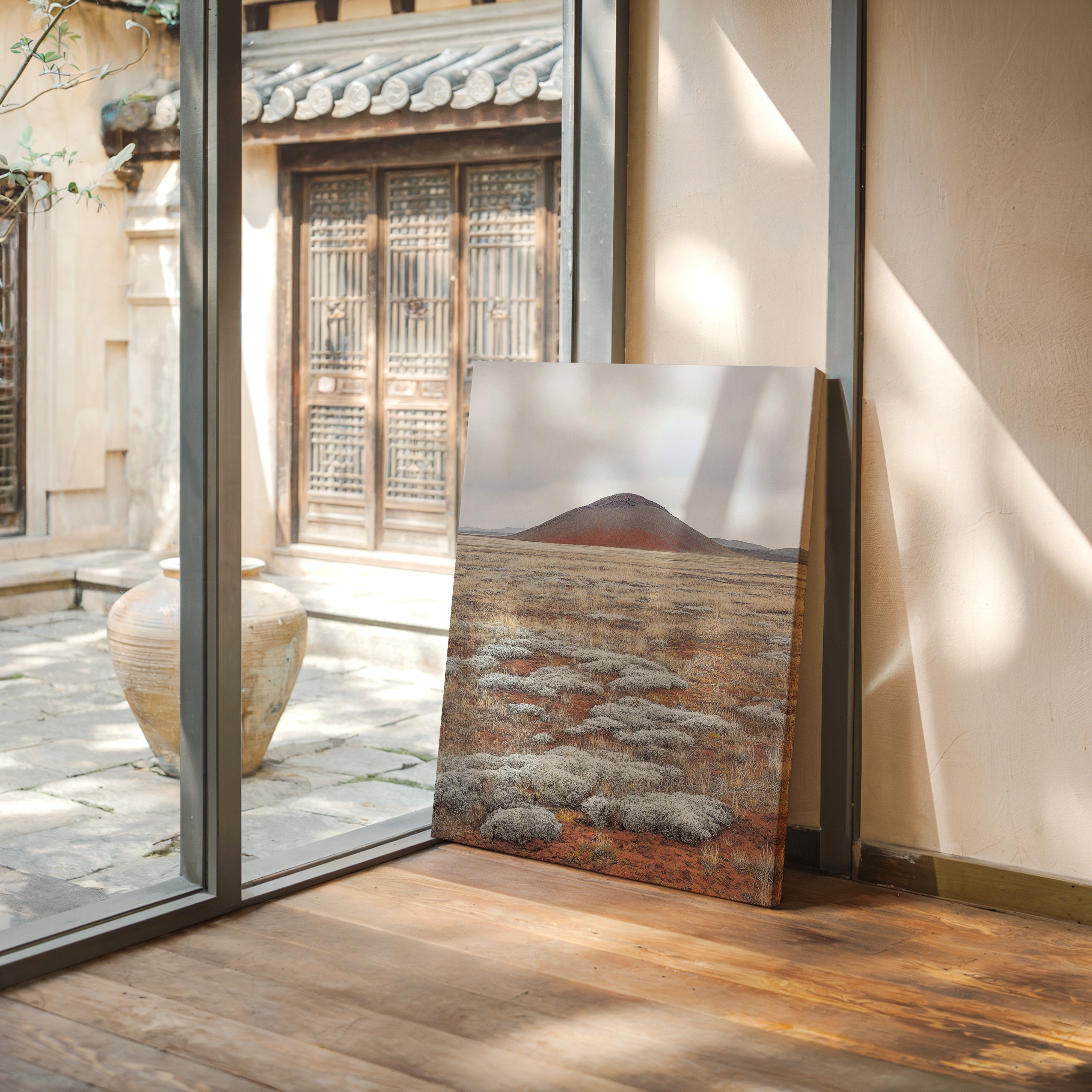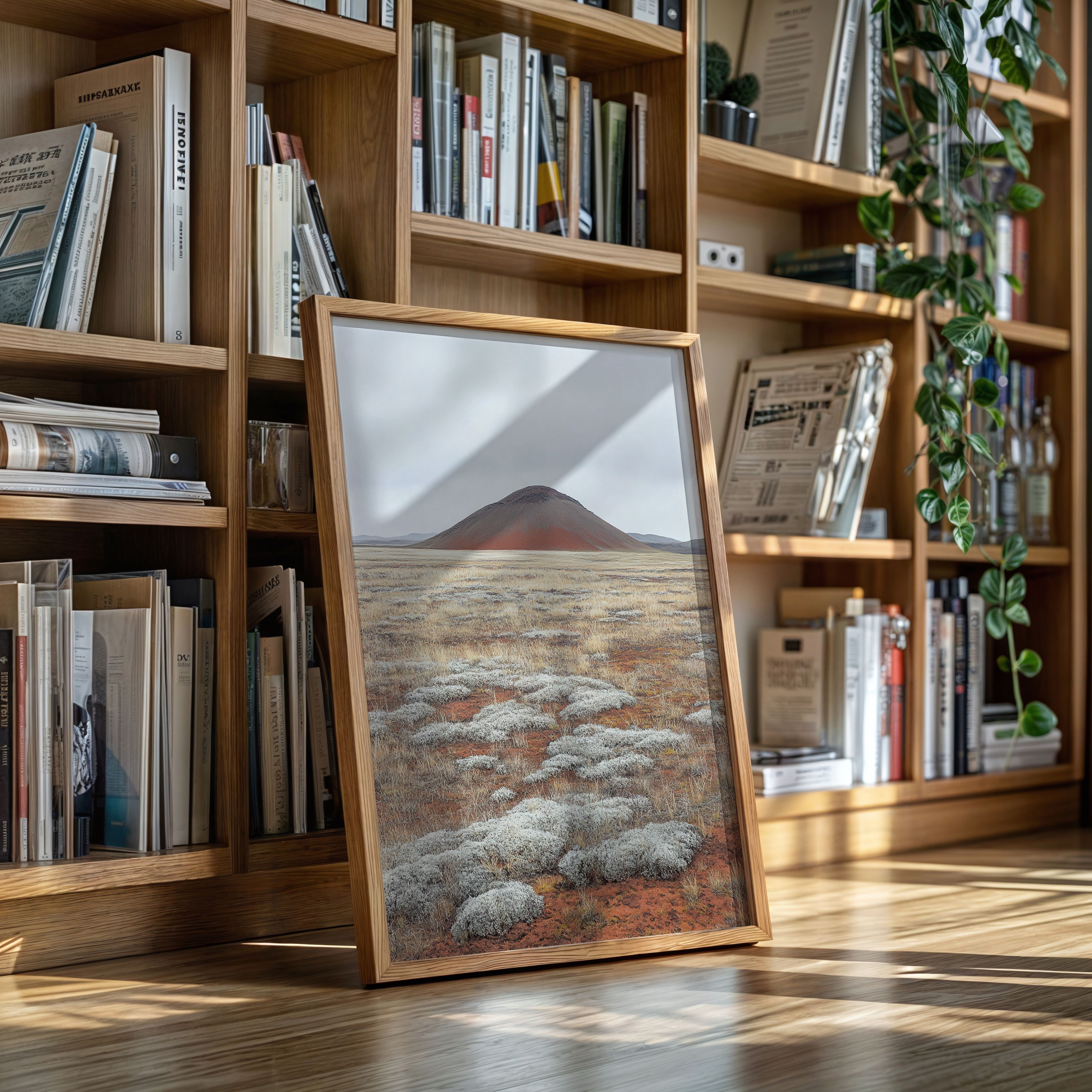 A solitary volcanic peak rises from the earth like an ancient sentinel, its russet slopes a stark contrast against the muted sky. The foreground unfolds in a mesmerizing patchwork of silver-white sage clusters scattered across rust-colored soil, creating a natural mosaic that stretches toward the horizon. The landscape speaks of geological time, where hardy desert plants have claimed their space among mineral-rich earth, each element perfectly balanced in this high desert composition. This serene scene would bring a sense of earthen minimalism to a contemporary living room or add natural sophistication to a modern office space.