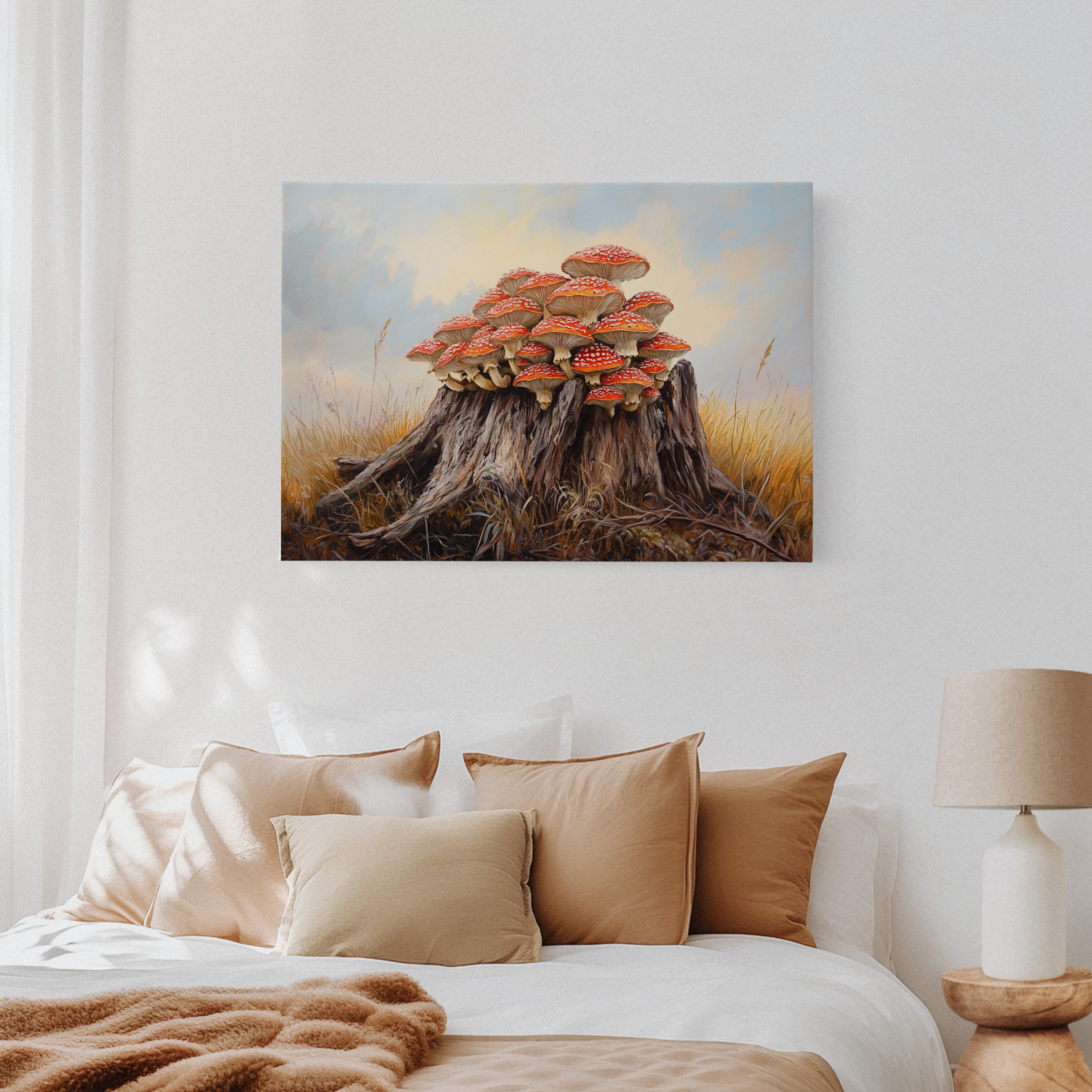 Red Mushrooms Crown Ancient Stump | Gallery Canvas / 11" x 9" | $65.00