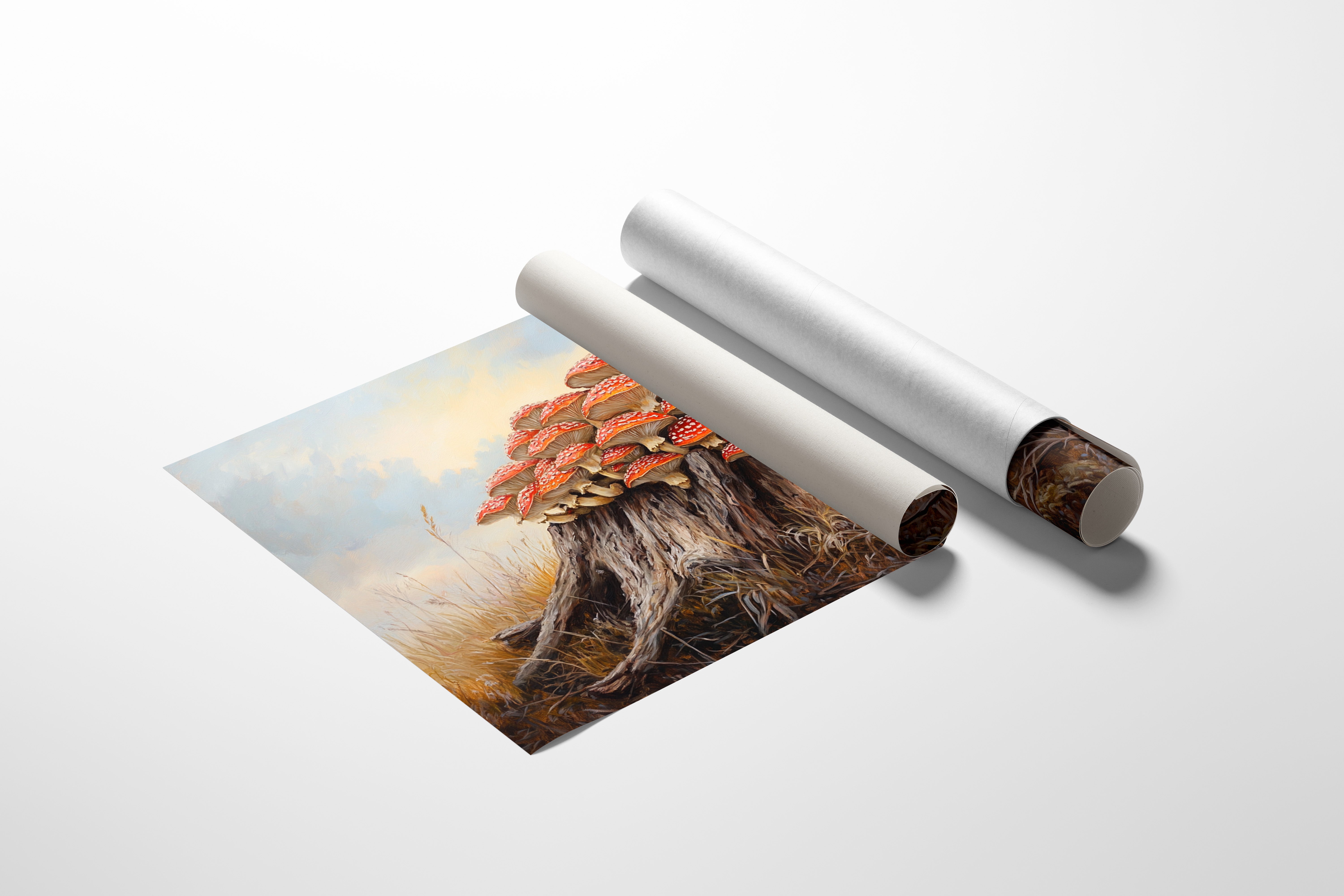 A cluster of vibrant red amanita mushrooms creates a natural crown atop a weathered tree stump, their spotted caps glowing like autumn lanterns. The delicate white spots scatter across the crimson caps like stars, while delicate gills underneath reveal nature's intricate architecture. Golden prairie grass sways in the surrounding field, catching the warm light of a dreamy sky painted in soft blues and peachy hues. This piece would bring an enchanted forest feeling to a reading nook or create a whimsical focal point in a naturalist-inspired living space.