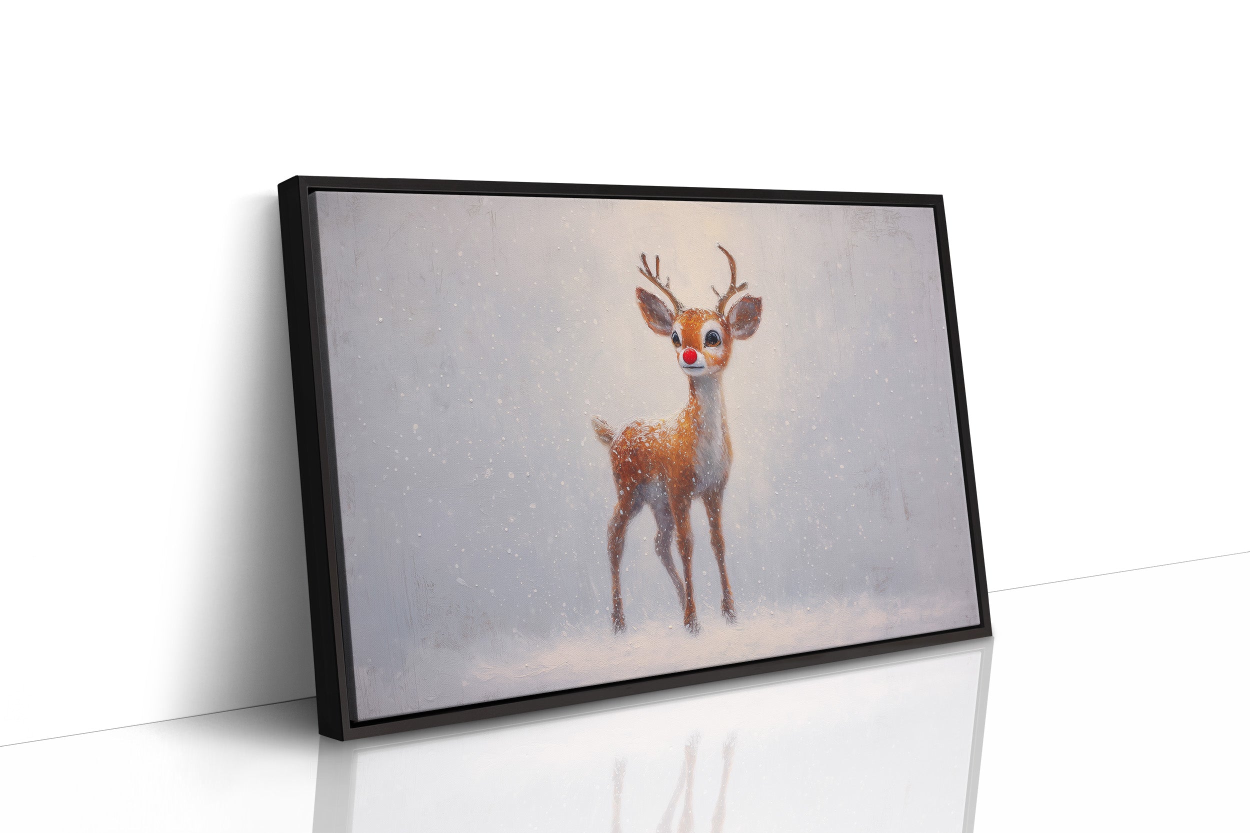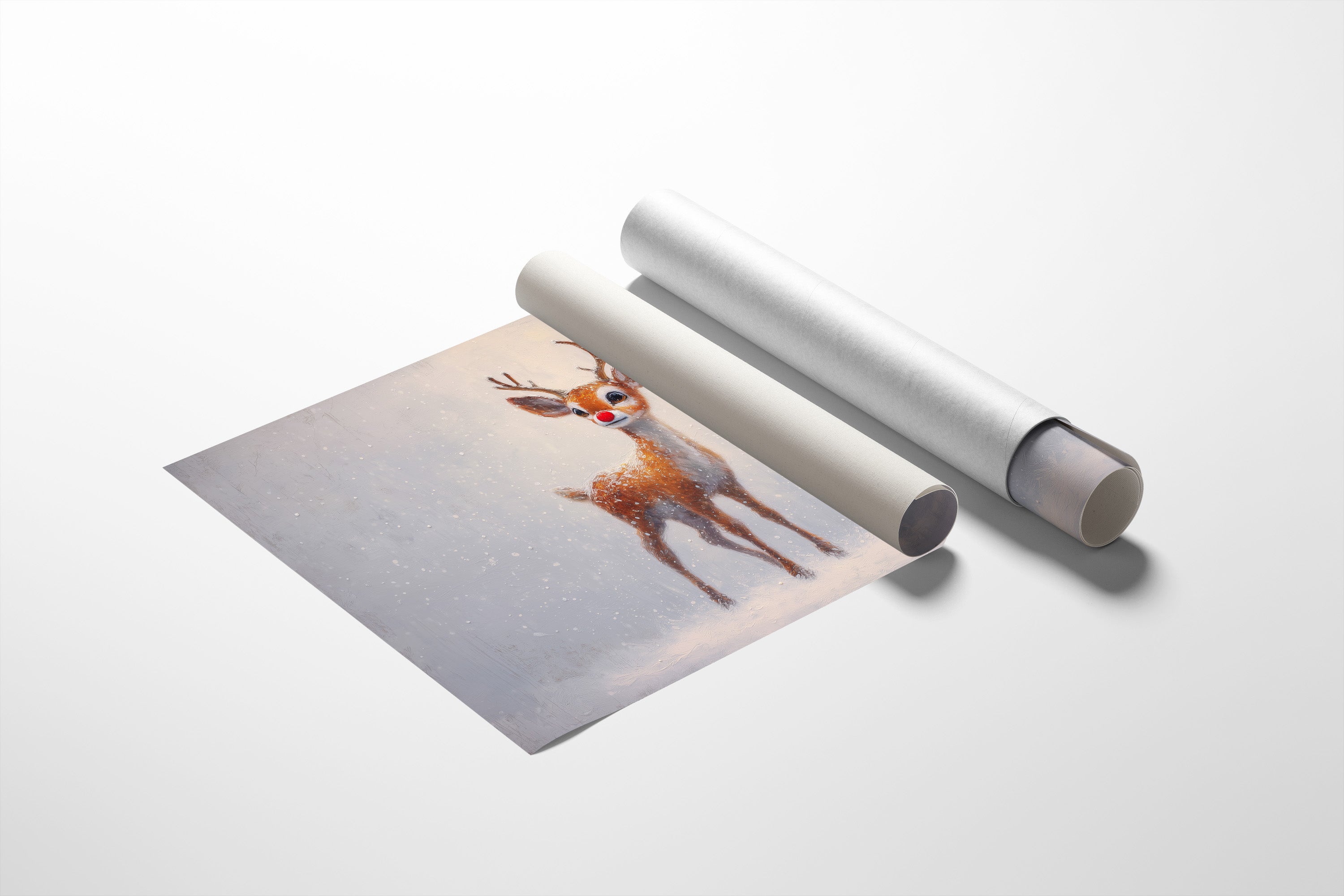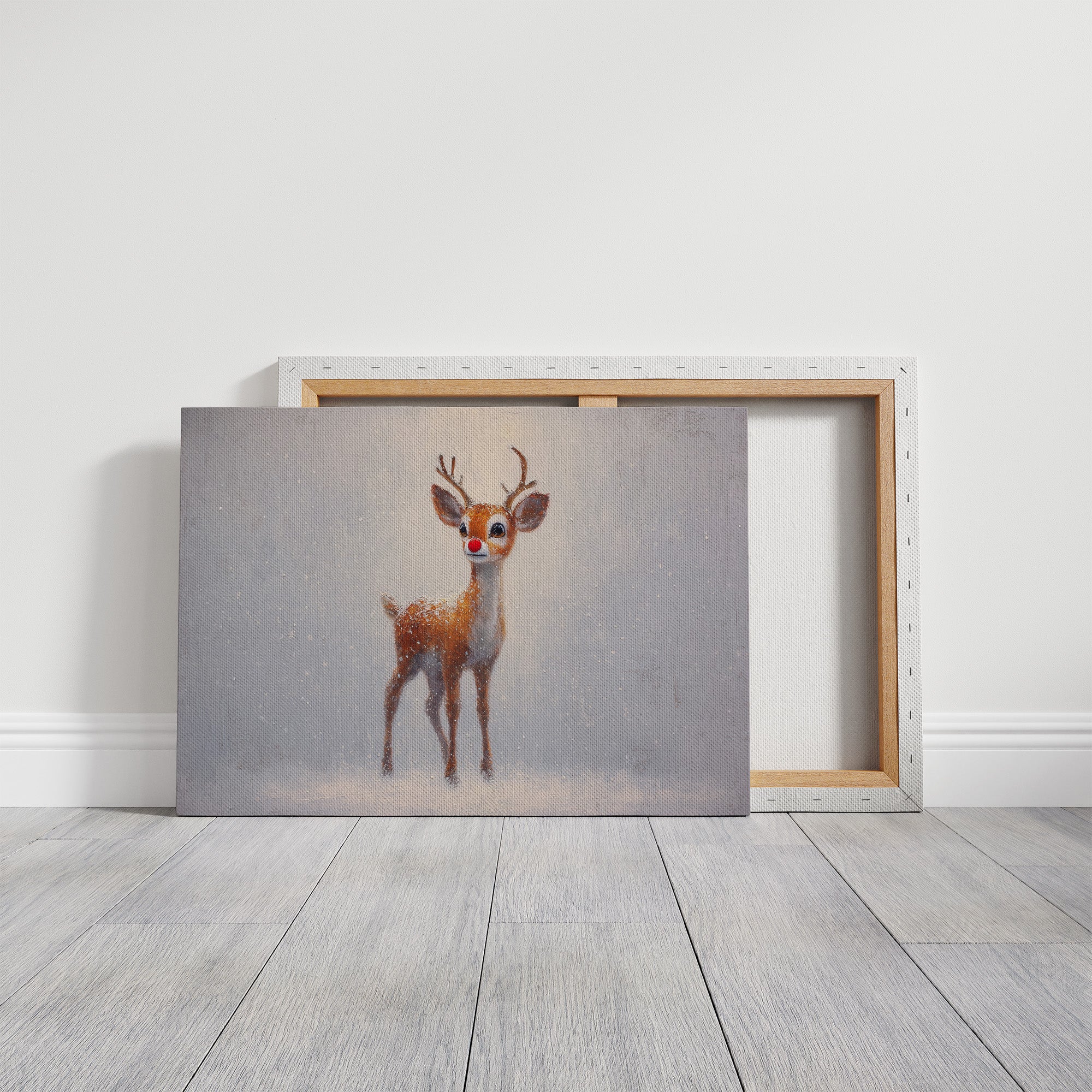 Soft snowflakes dance around a whimsical young deer, its bright red nose glowing with innocent charm against a misty winter backdrop. The delicate brushstrokes capture both vulnerability and wonder, creating a heartwarming scene that speaks to childhood nostalgia. The gentle greys and warm browns blend seamlessly, while touches of white snow add a magical sparkle to this beloved holiday character. Perfect for creating a cozy storytelling corner in a child's room or adding a touch of seasonal wonder to living spaces during the winter months.