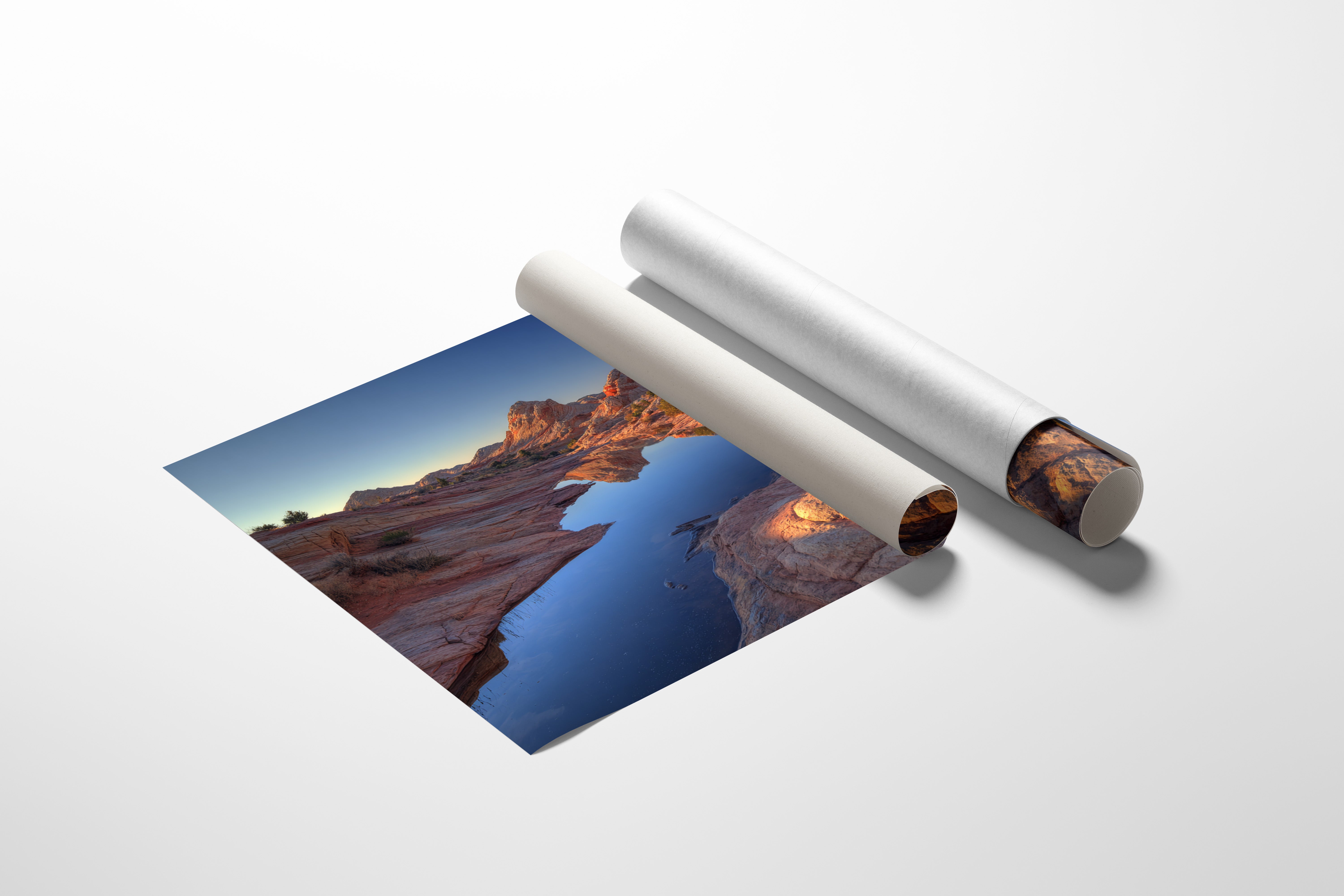 Golden morning light spills across ancient sandstone formations, their weathered faces glowing like molten copper against the cool blue sky. The still waters of a hidden desert pool create a perfect mirror, doubling the majesty of the rugged landscape in its pristine surface. Striated rock faces tell stories of geological time, their layers painted in rich terracotta, salmon, and burnt orange hues. This tranquil scene captures the raw beauty of the American Southwest, where water meets wilderness in unexpected harmony. Perfect for spaces seeking to bring the dramatic serenity of desert landscapes indoors, especially in meditation rooms or grand entryways where its peaceful reflection can set a contemplative mood.
