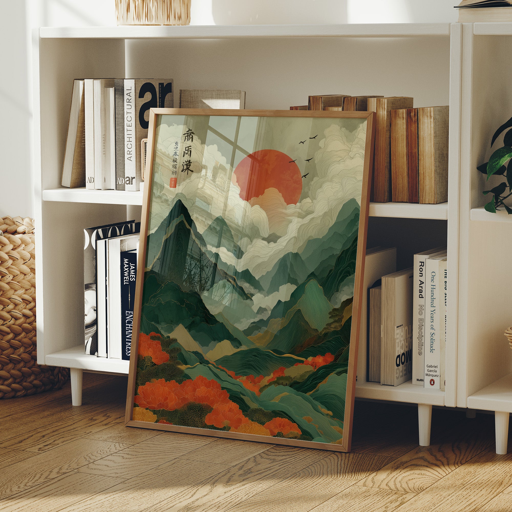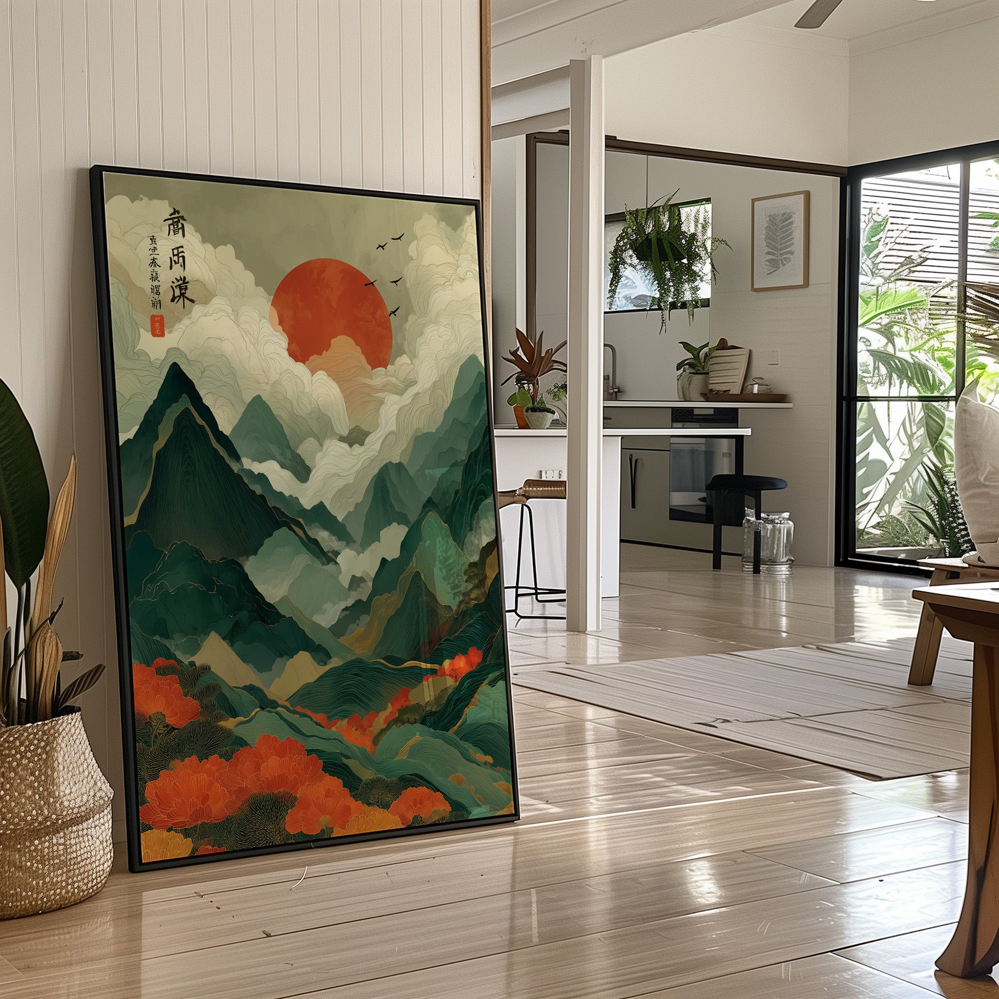 Layers of emerald mountains dissolve into ethereal mist, while a bold crimson sun commands the sky. The composition weaves together deep forest greens with vibrant coral accents, creating a mesmerizing dance of traditional Asian landscape artistry. Rolling clouds and soaring birds add movement to the scene, while delicate calligraphy grounds the piece in cultural authenticity. This striking piece would transform a reading nook or meditation space into a contemplative sanctuary, bringing tranquil energy to any modern interior.