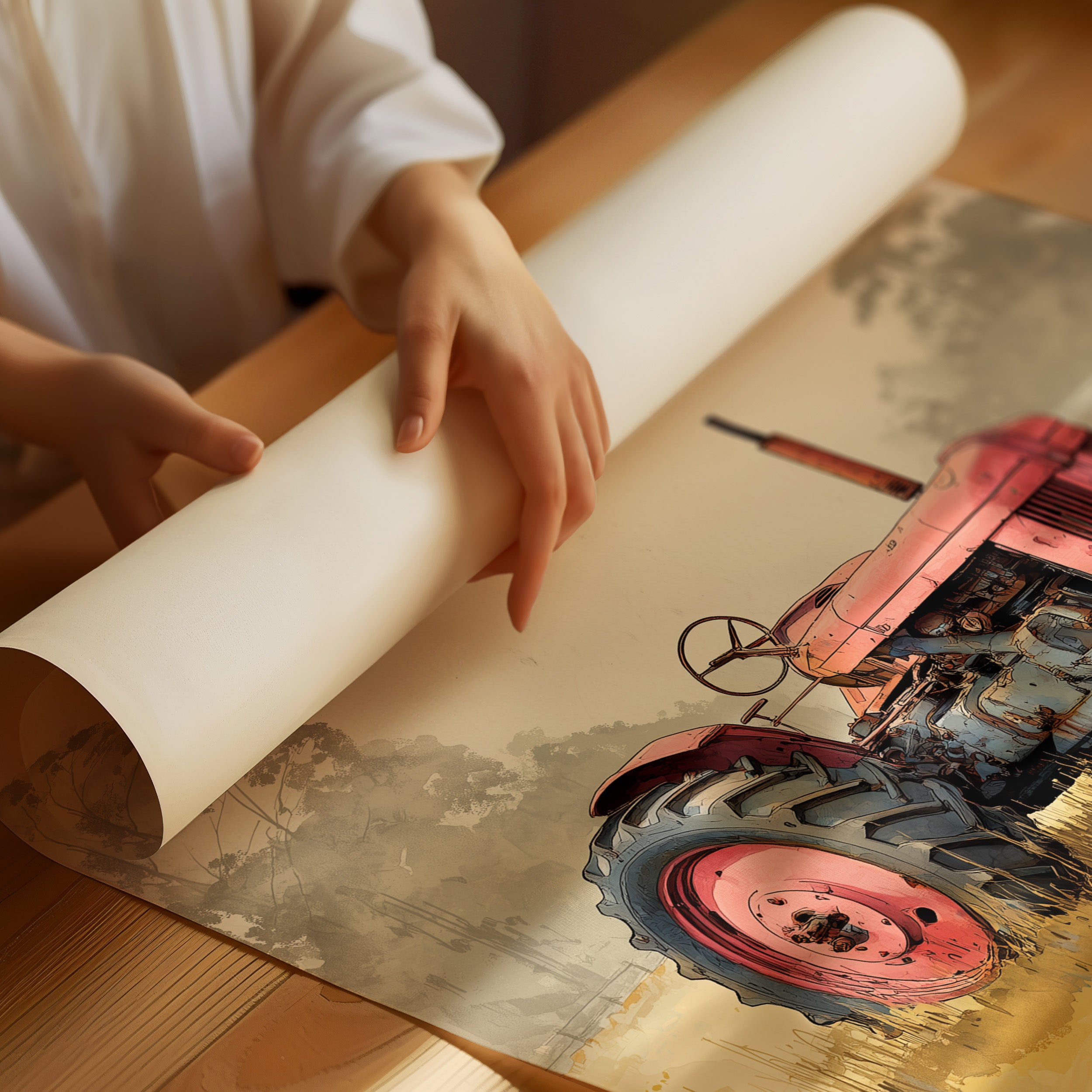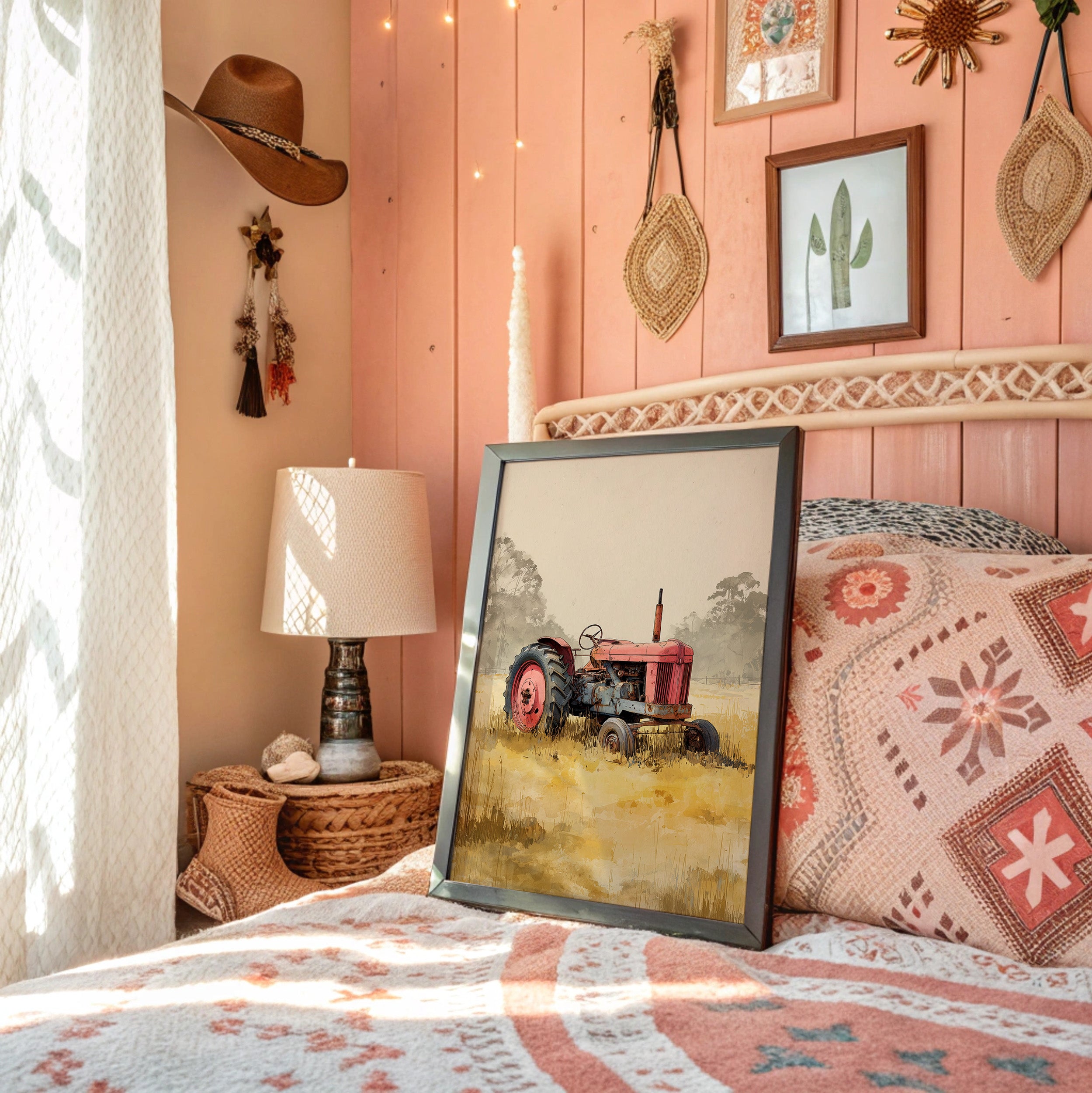 A vintage red tractor stands solitary in a sun-drenched field, its weathered form telling stories of harvests past. Warm golden hues wash across the pastoral scene, while misty trees fade into the distant horizon, creating a nostalgic tableau of rural life. The watercolor-style rendering captures both the machine's sturdy presence and the ethereal quality of morning light on the prairie. This piece brings rustic charm and a touch of americana to any space, perfectly suited for a modern farmhouse living room or a cozy den where old memories meet contemporary style.