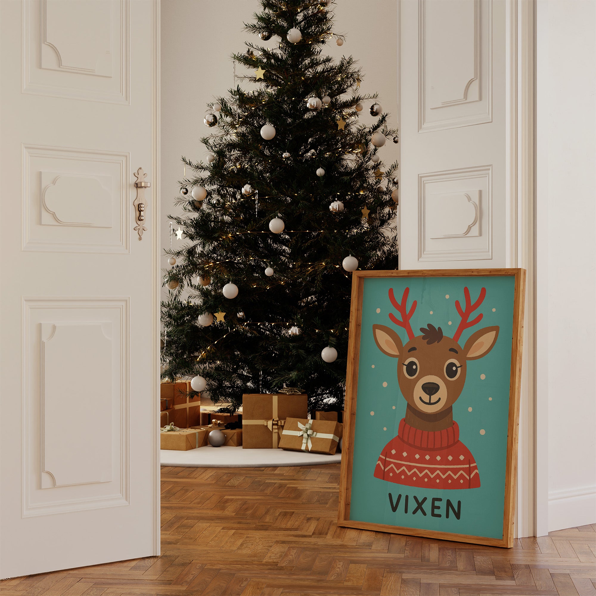 Gentle eyes peek out from a festive portrait, where a charming deer in a cozy red sweater brings holiday spirit to life against a vibrant turquoise backdrop. The whimsical illustration captures childlike wonder with its simple lines and cheerful color palette, creating a nostalgic nod to classic Christmas tales. This playful piece adds a touch of seasonal joy to a minimalist space, complementing the white Christmas tree that stands beside it.