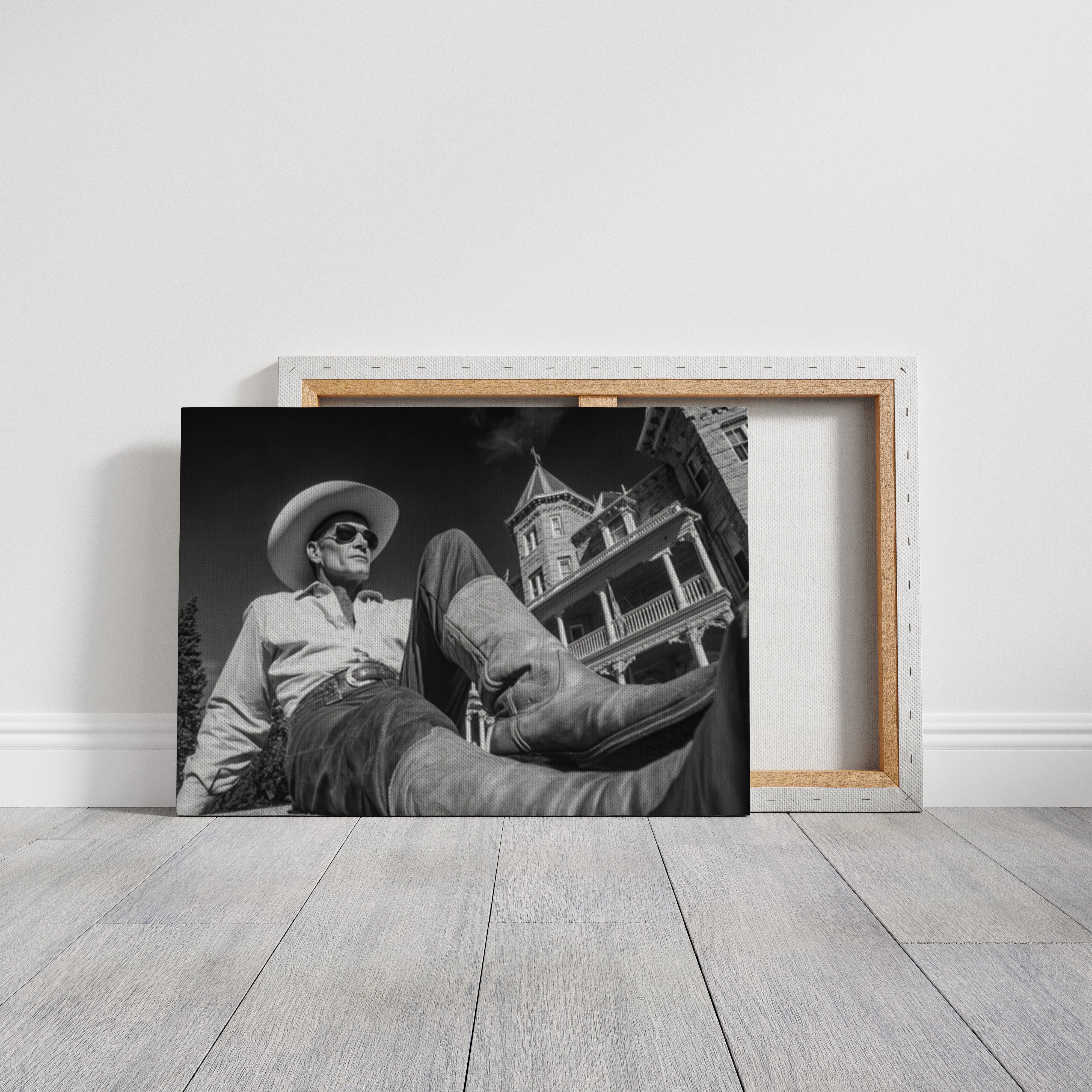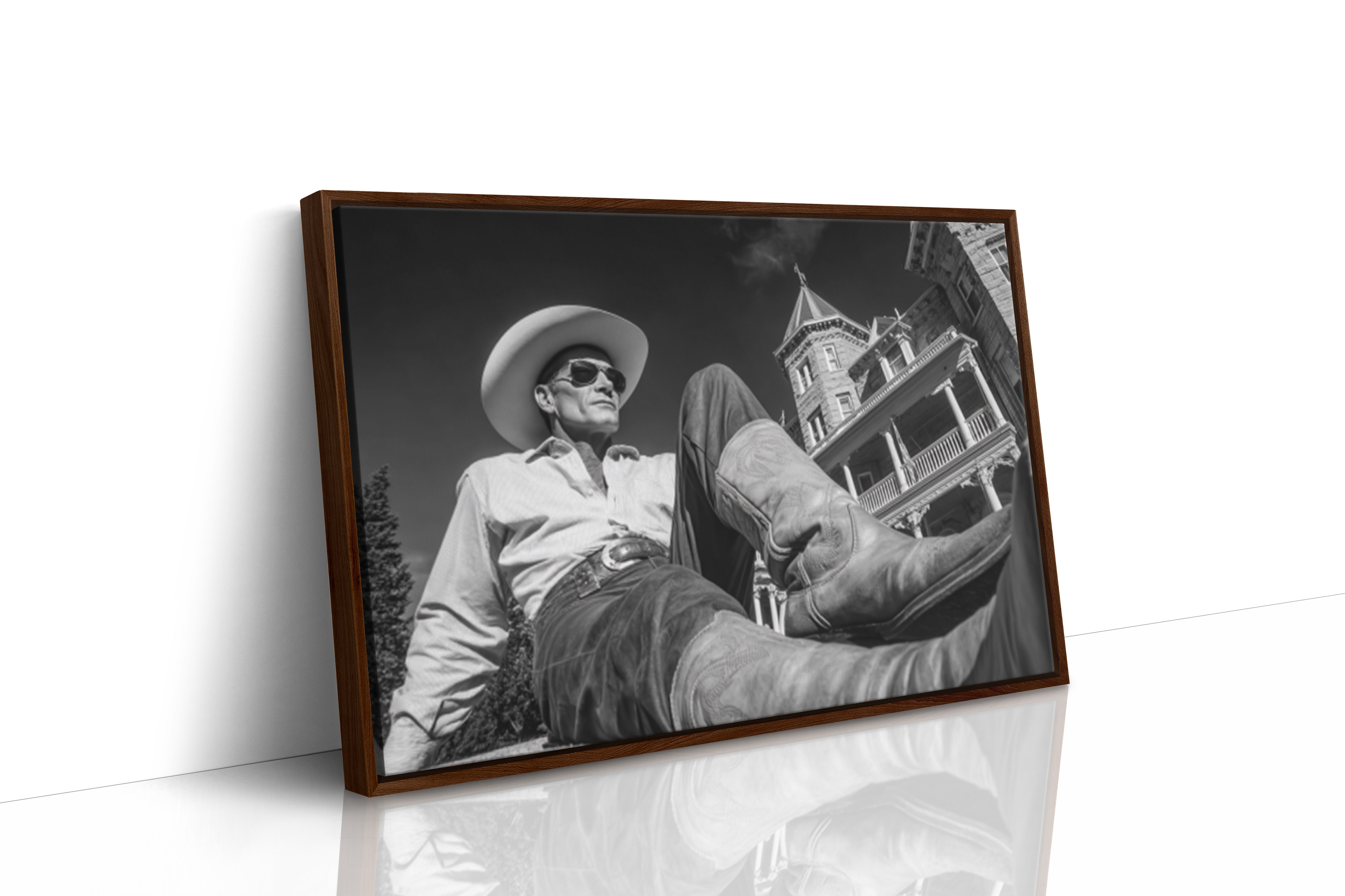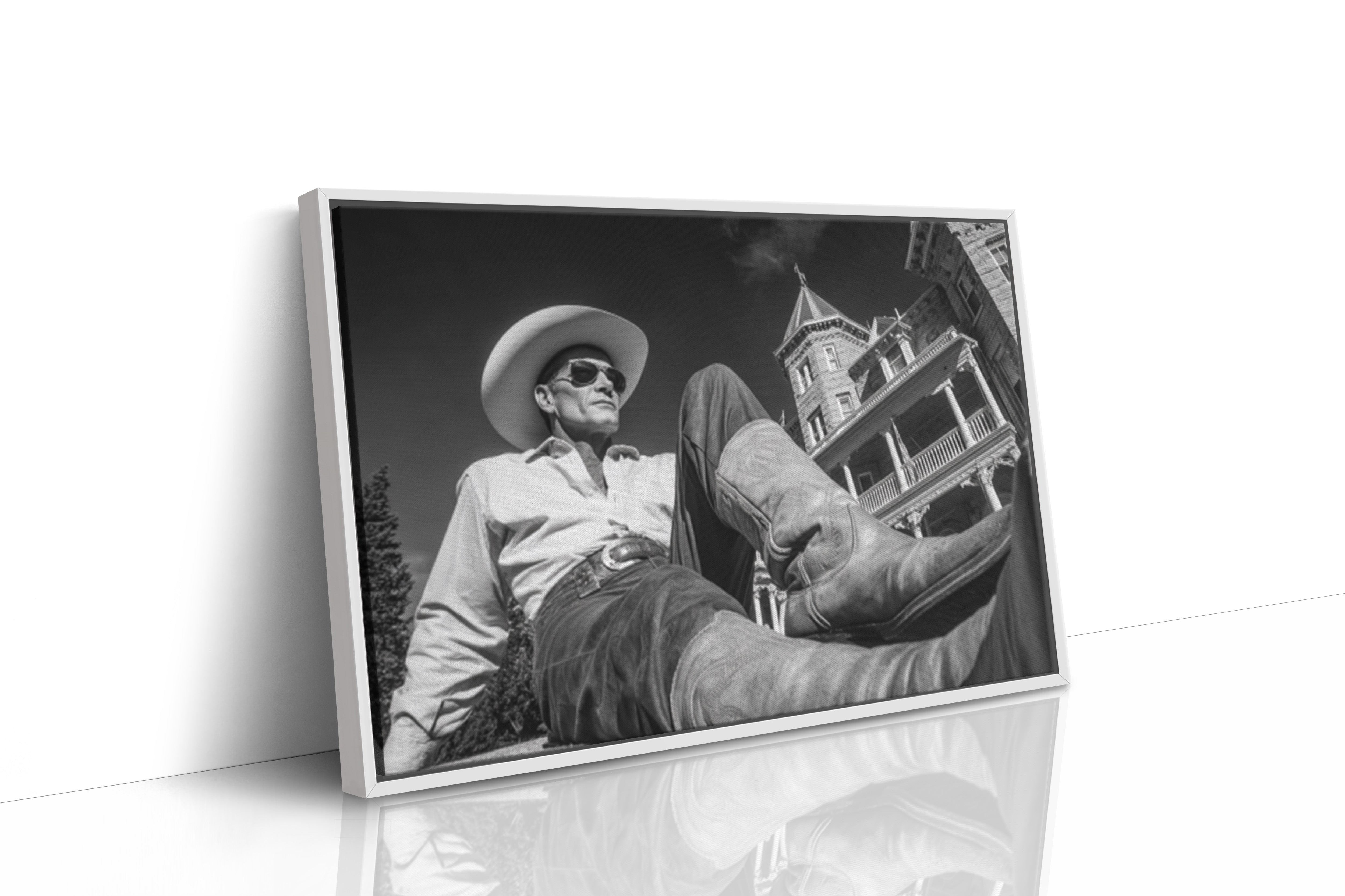 Part of our Frontier Elegance collection, this dramatically composed black and white photograph captures the timeless appeal of taking life at your own pace. The striking architectural backdrop and cinematic angle create a composition that celebrates both the rugged independence of cowboy culture and the refined beauty of America's gilded age.