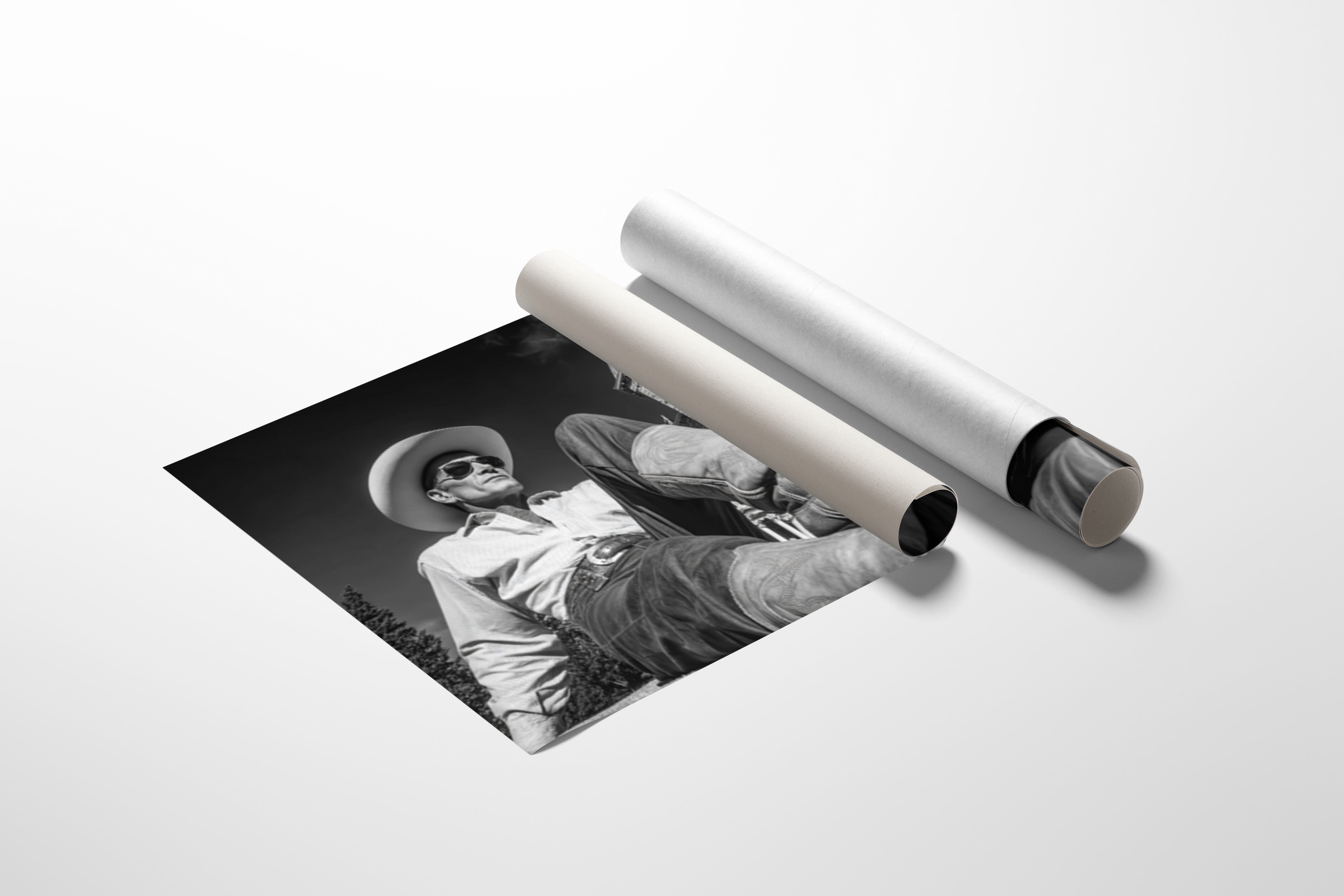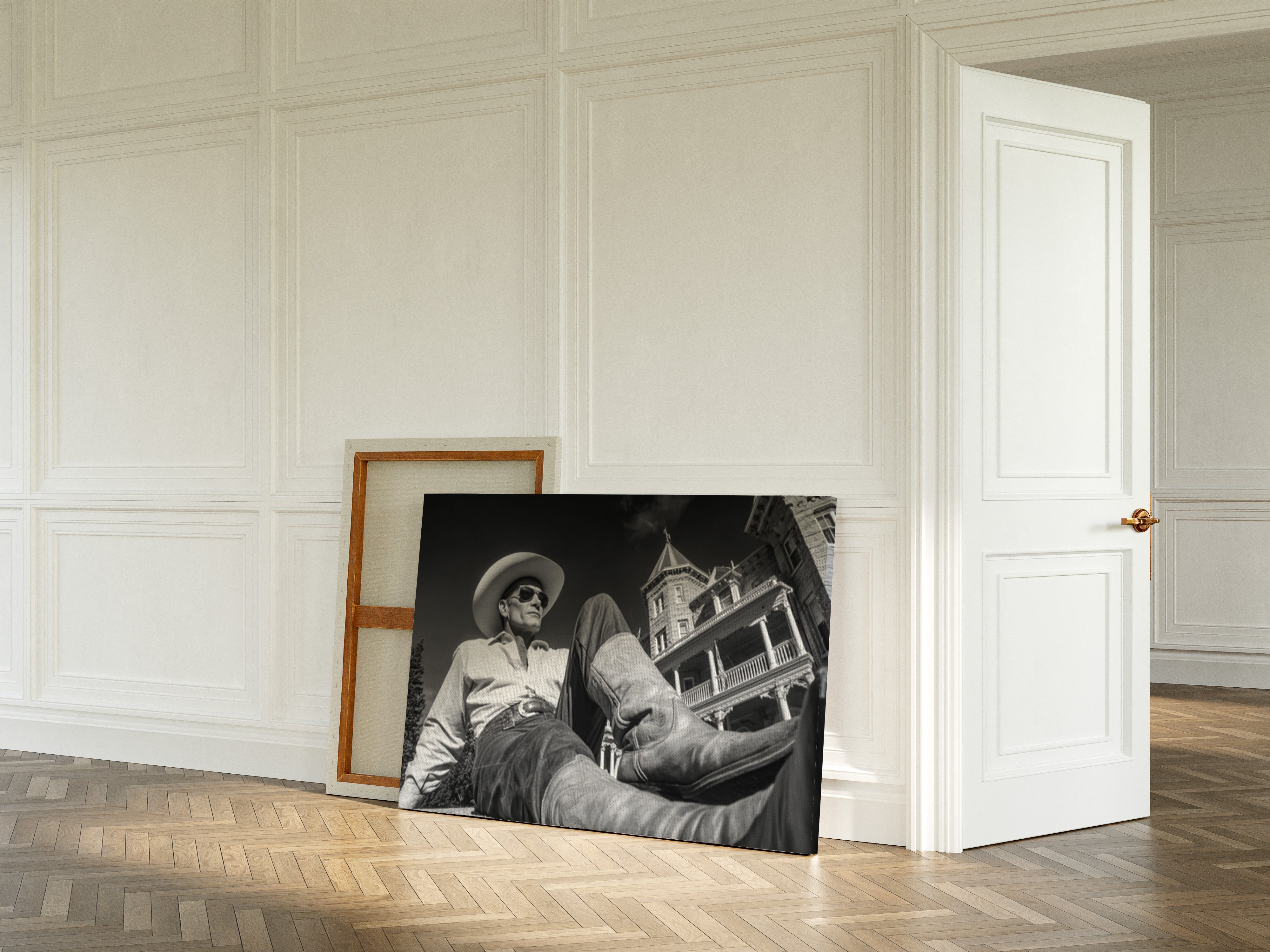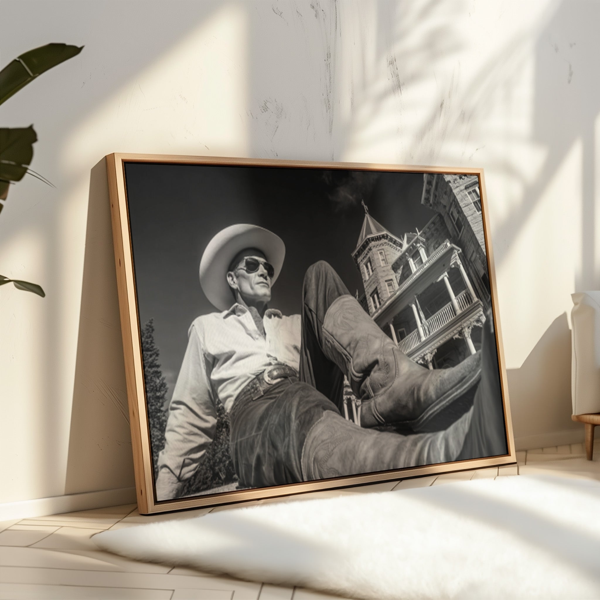 Part of our Frontier Elegance collection, this dramatically composed black and white photograph captures the timeless appeal of taking life at your own pace. The striking architectural backdrop and cinematic angle create a composition that celebrates both the rugged independence of cowboy culture and the refined beauty of America's gilded age.