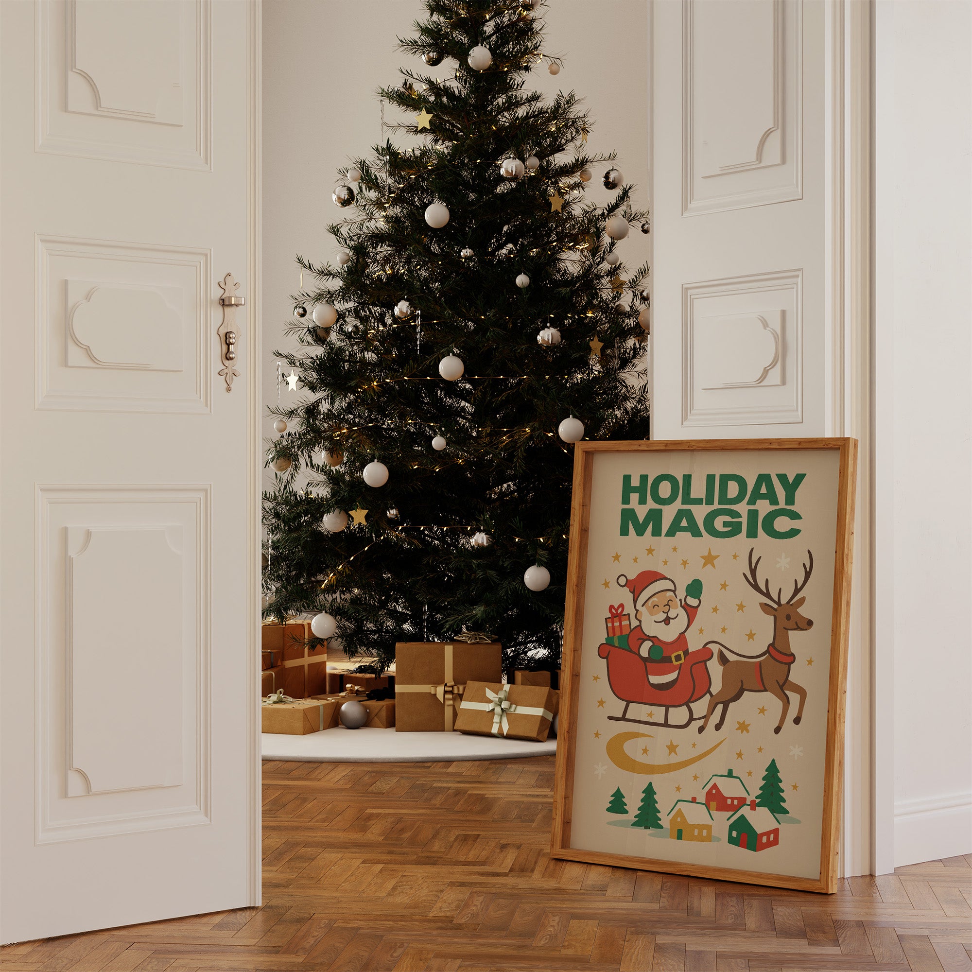 Nostalgia wraps around you like a warm blanket in this charming vintage-inspired holiday scene. A jolly Santa waves from his red sleigh, pulled by a prancing reindeer above a sleepy village dusted with snow, while golden stars scatter across the cream background like childhood memories. The bold green typography anchors this festive illustration with mid-century charm, capturing the innocent wonder of traditional Christmas tales. This piece brings cheerful retro energy to entryways, children's rooms, or any space needing a touch of seasonal joy without overwhelming modern decor.