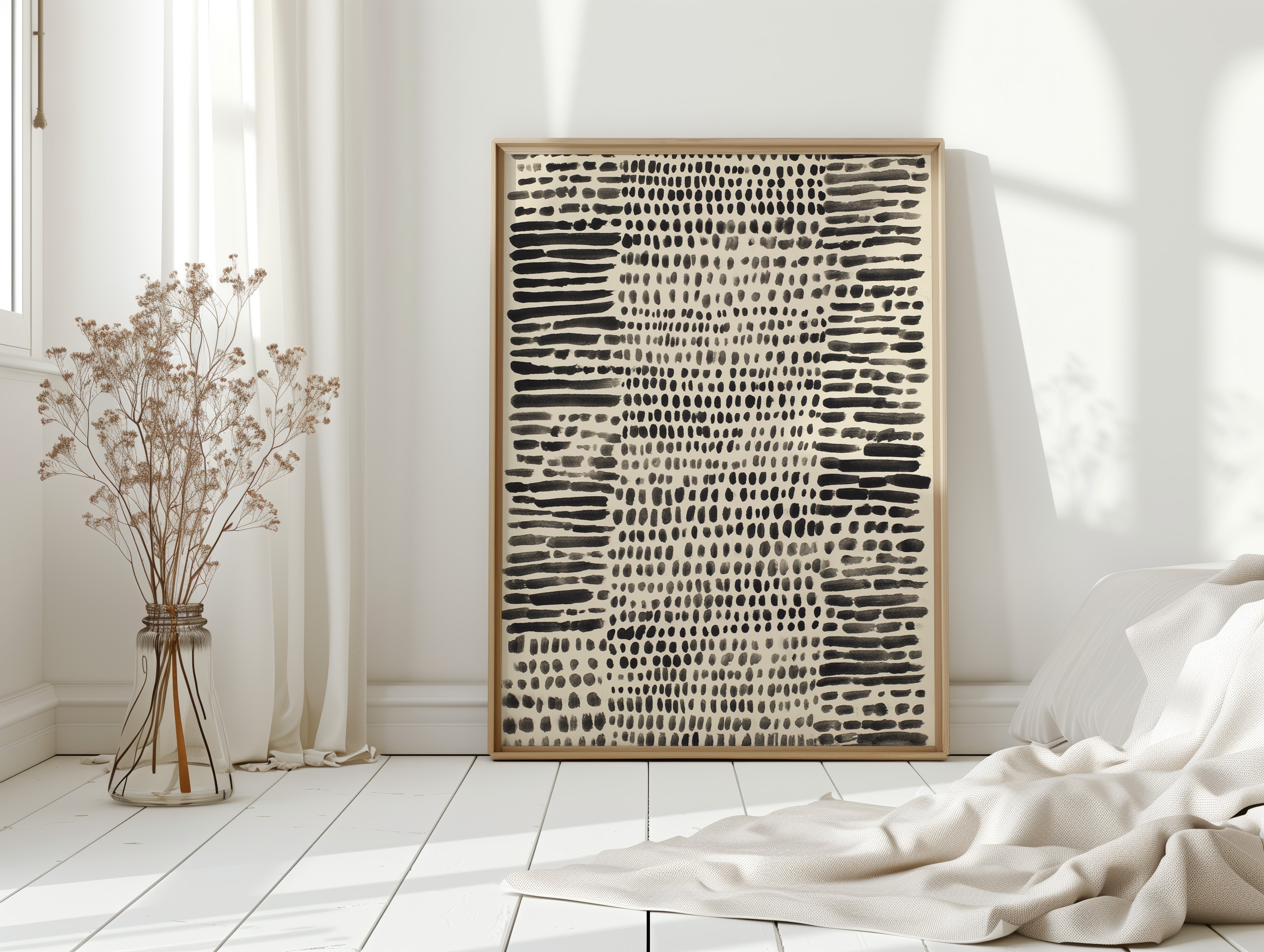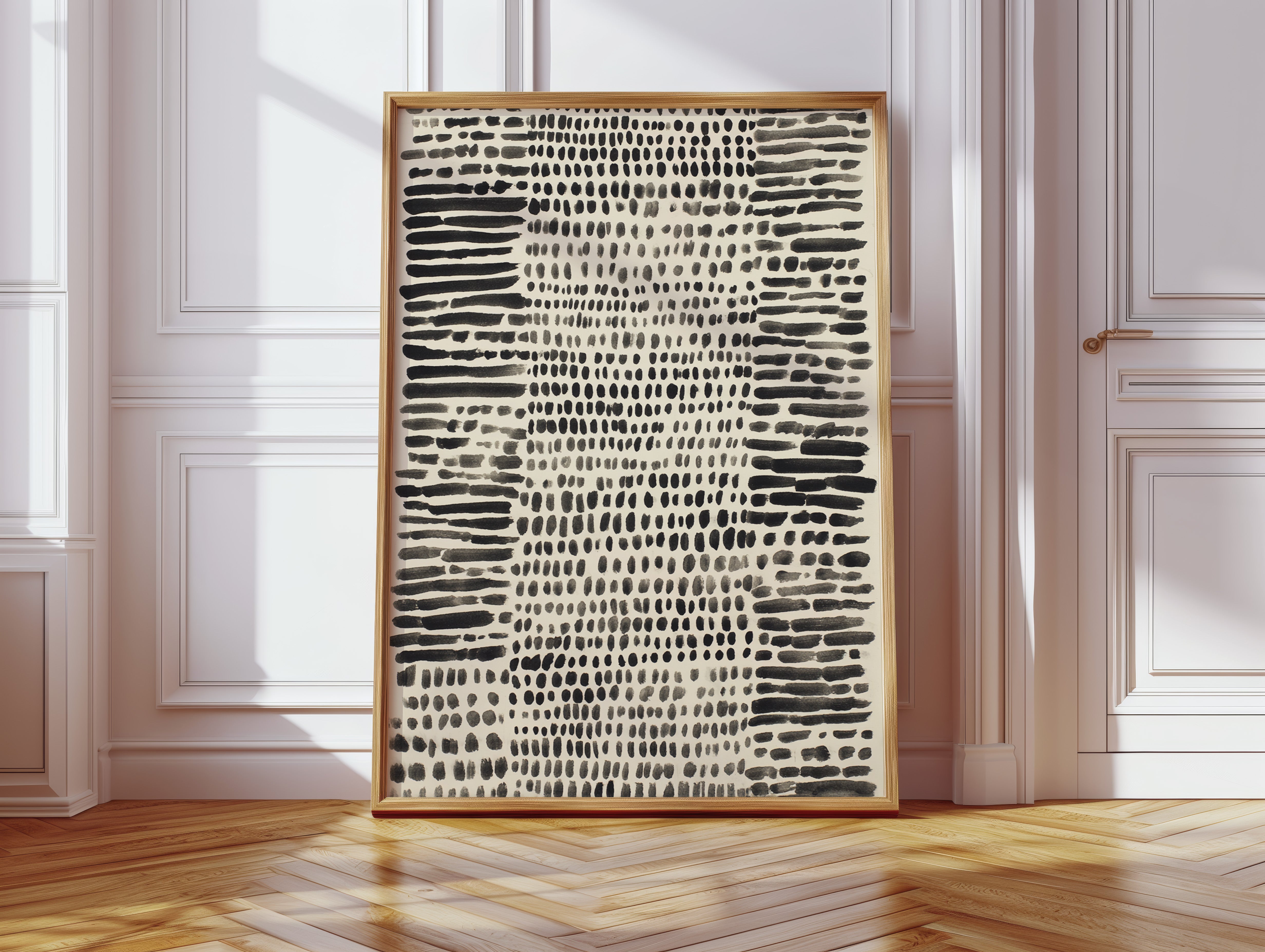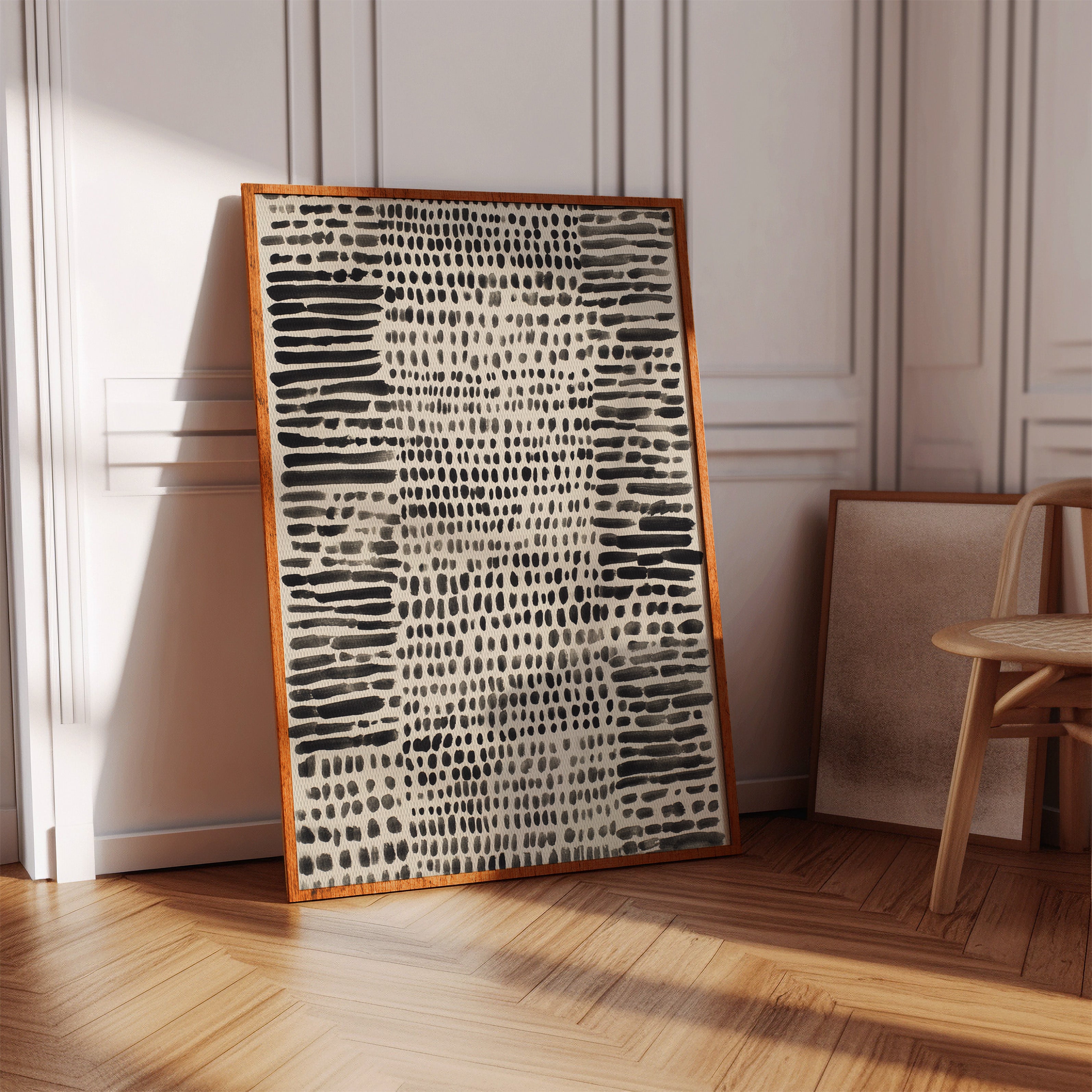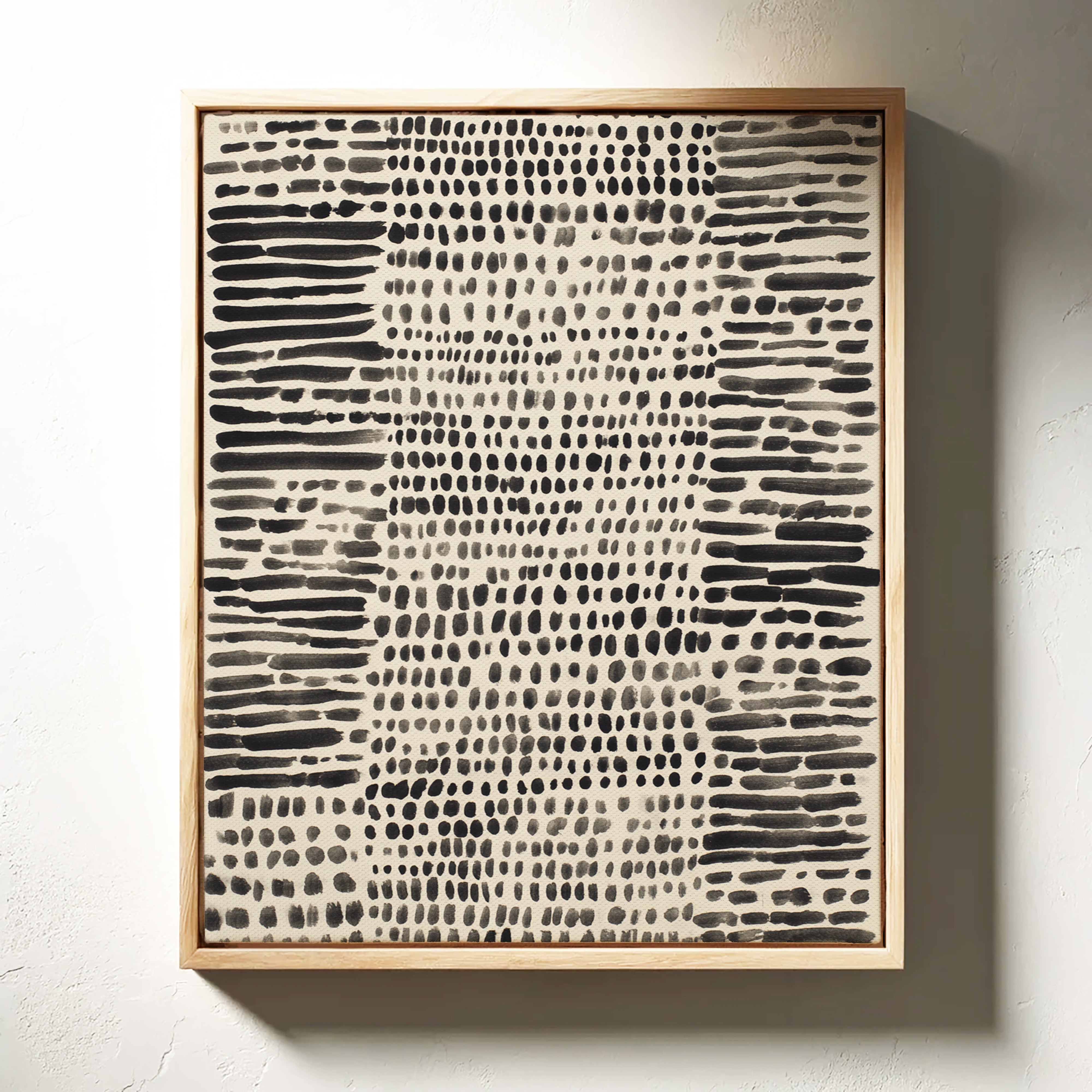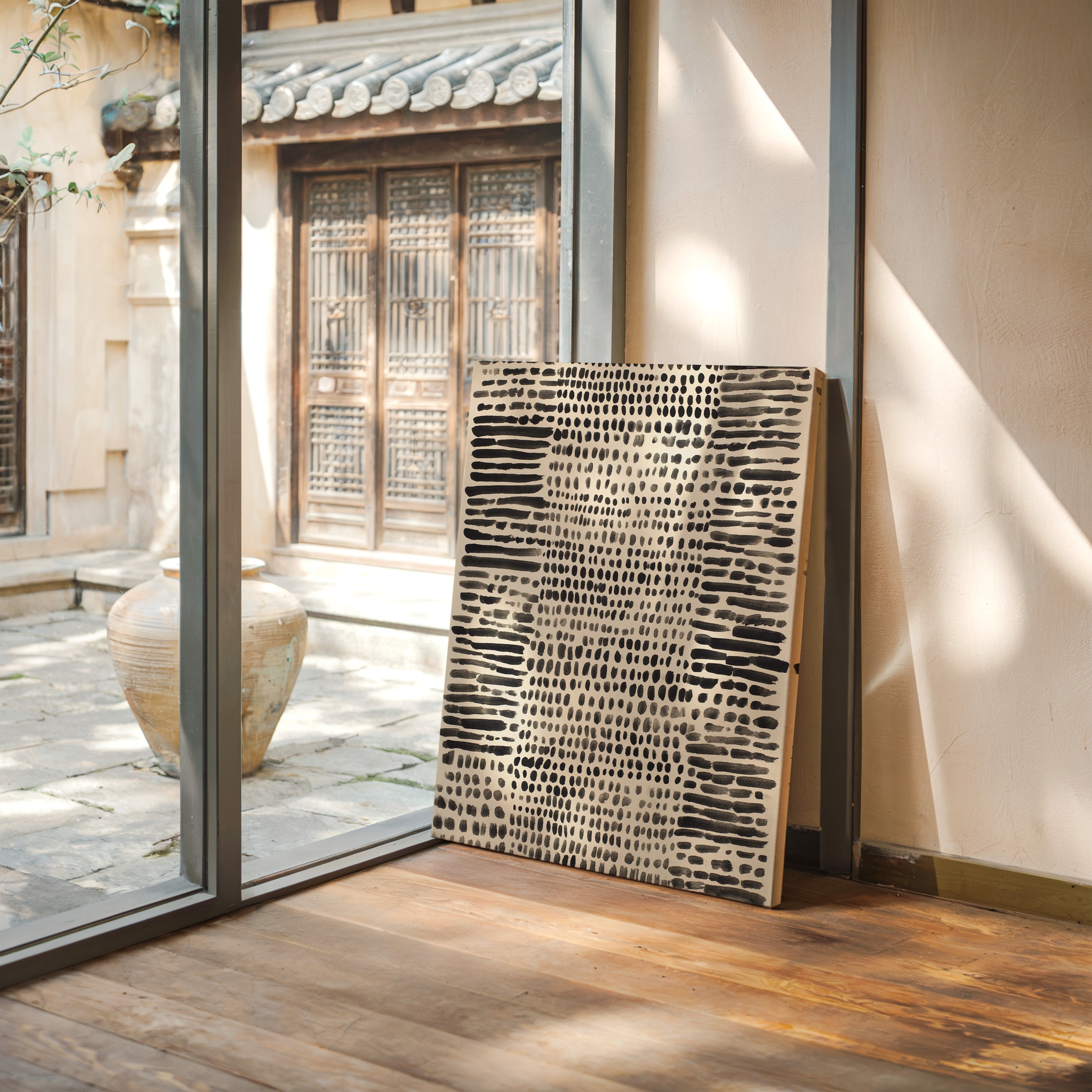 In a dance of monochrome, the strokes breathe life onto the canvas, each line a heartbeat, each dot a whisper of intent. This piece embodies the essence of artisanal craftsmanship, where each mark tells a story of patience and precision. The interplay of bold lines and delicate dots creates a visual symphony, drawing the eye into a world where simplicity meets complexity, and every detail invites exploration. Ideal for a modern living space or a serene reading nook, this artwork transforms walls into galleries of thought and inspiration.