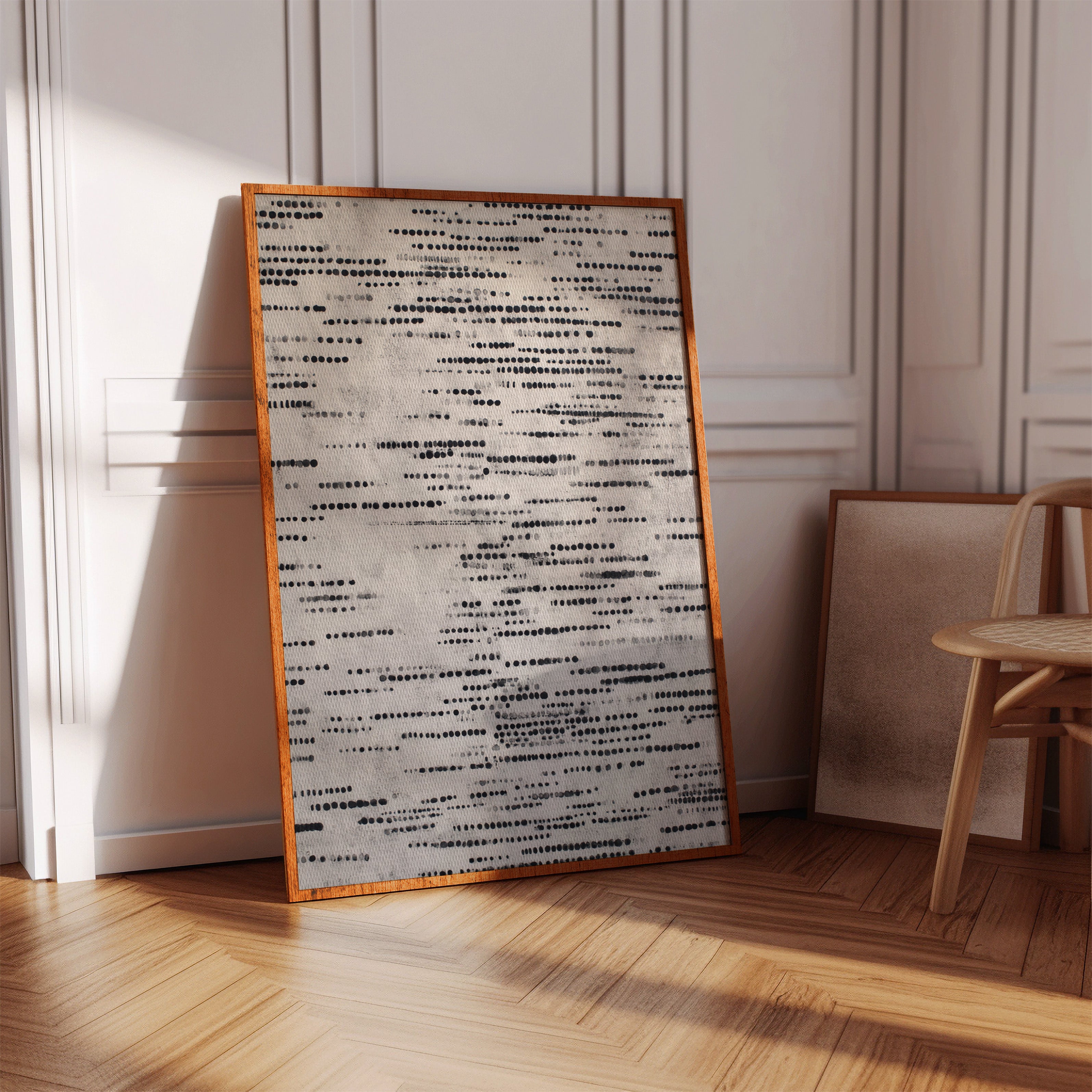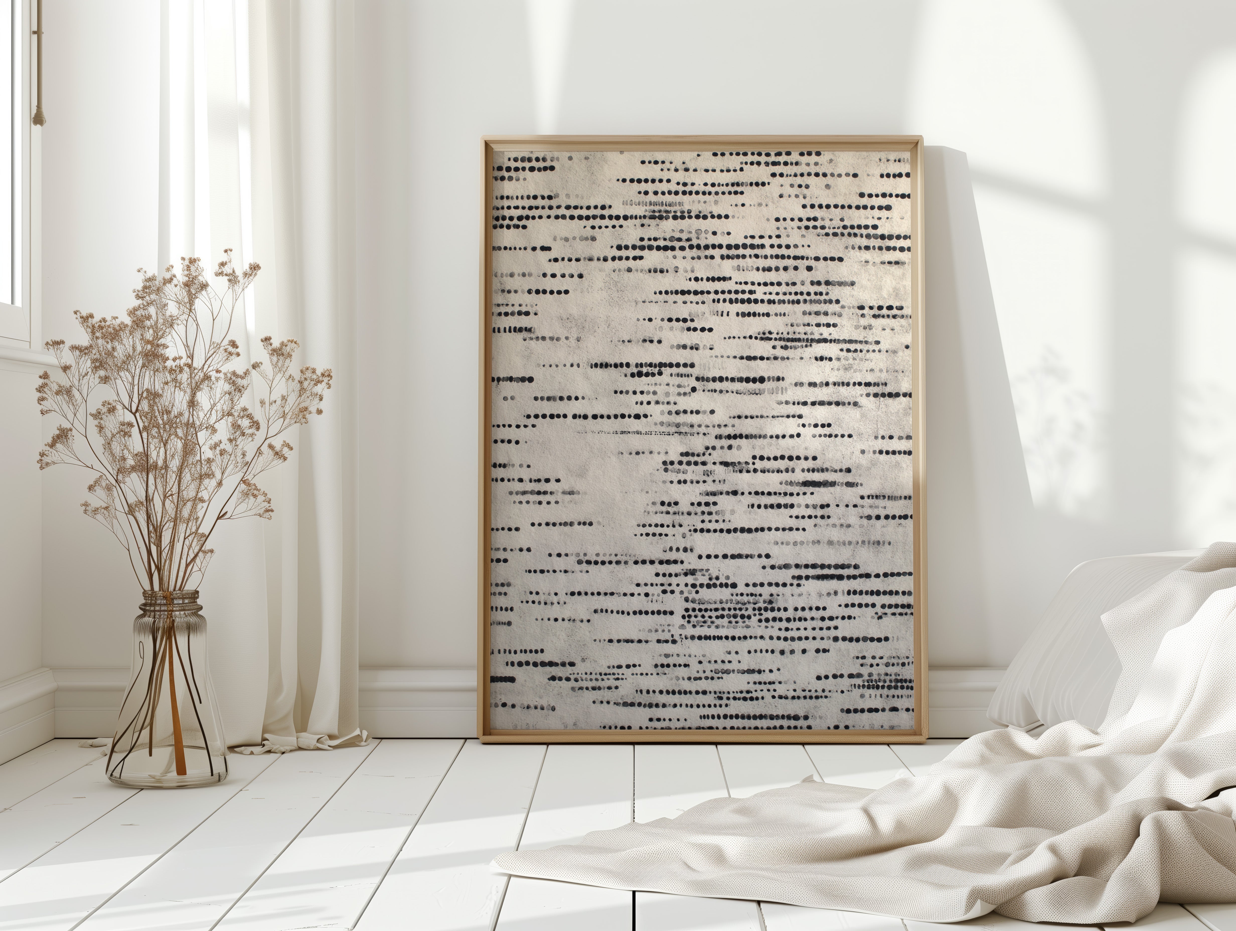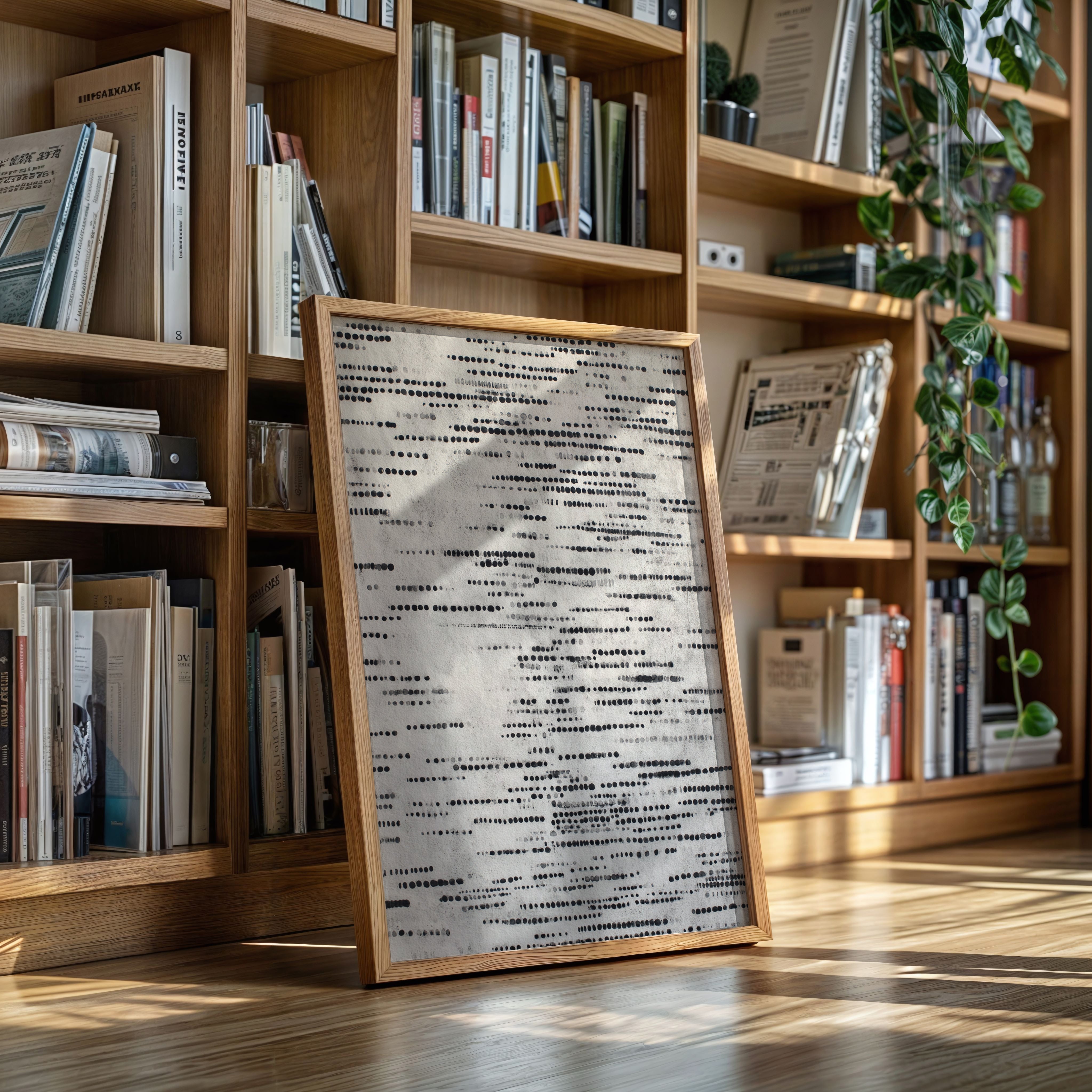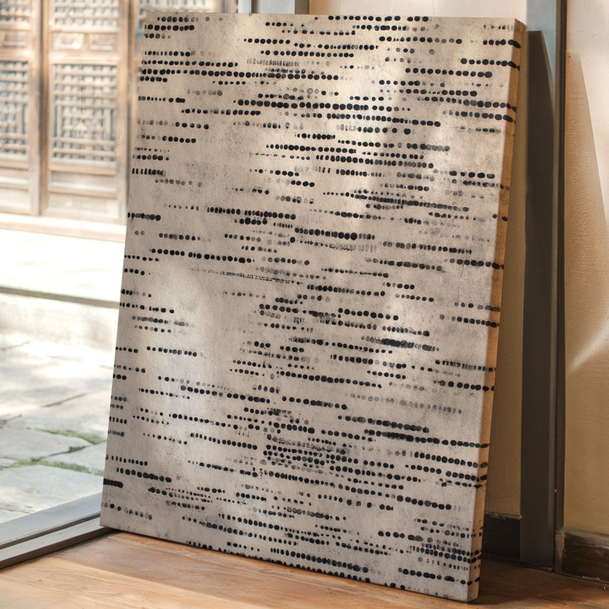 In a dance of circles and lines, a quiet symphony emerges, inviting the viewer to pause and reflect. This piece embodies the artisanal spirit, celebrating the beauty of handmade craftsmanship. Each dot tells a story, layered in shades of black and gray, evoking a tactile connection to the past and a whisper of the present. Perfect for a serene reading nook or a contemplative corner of your home, where thoughts can flow freely.