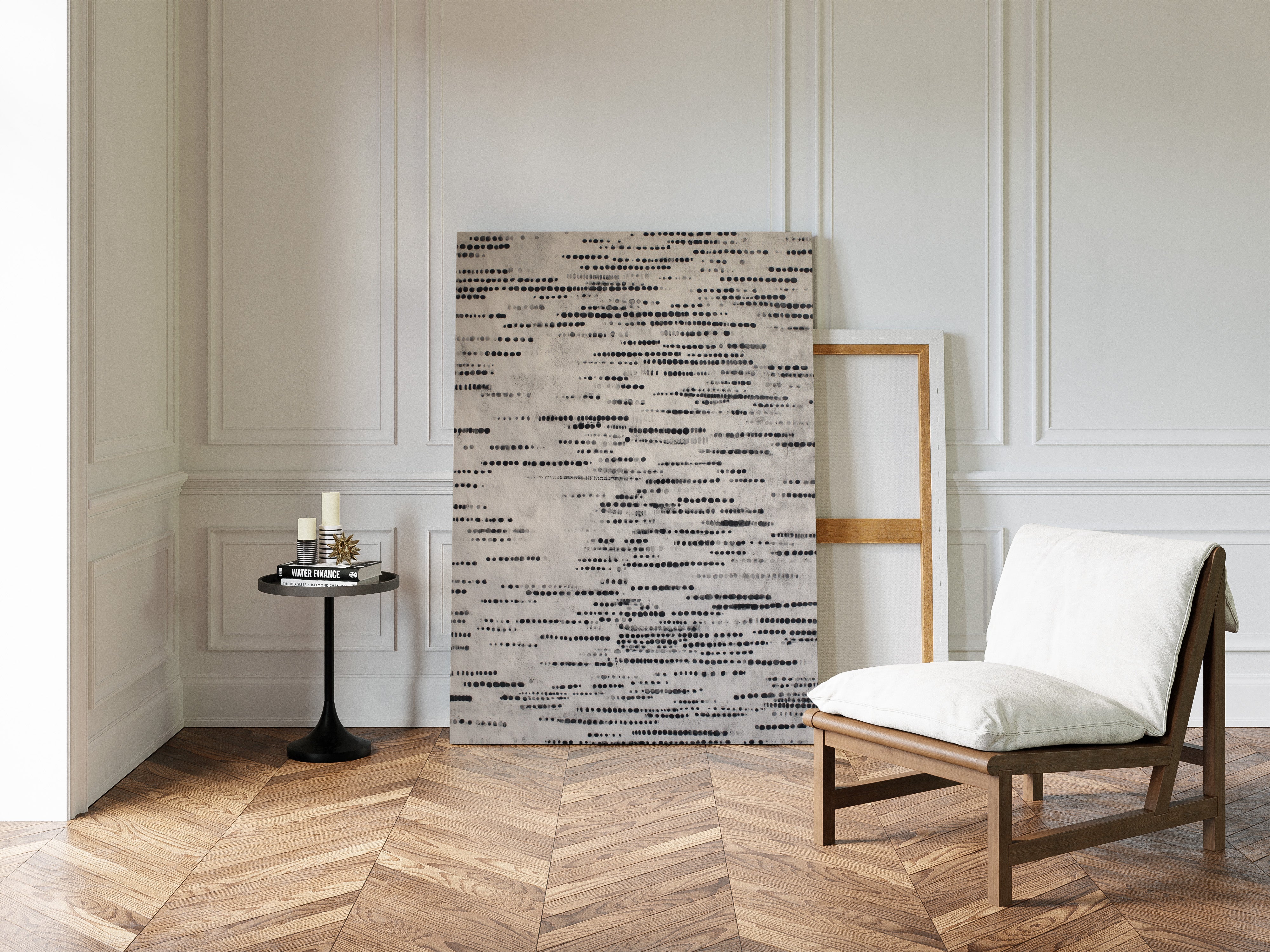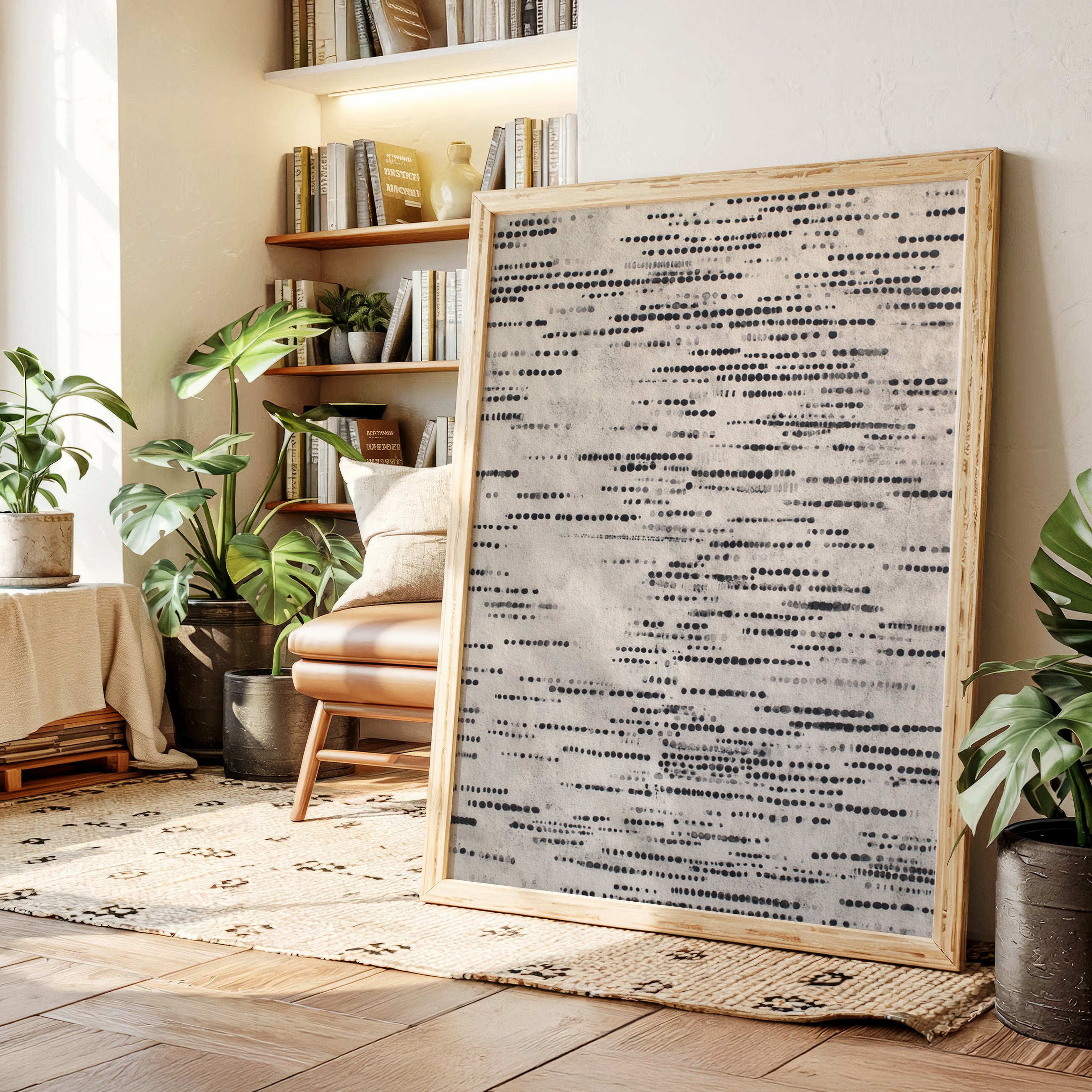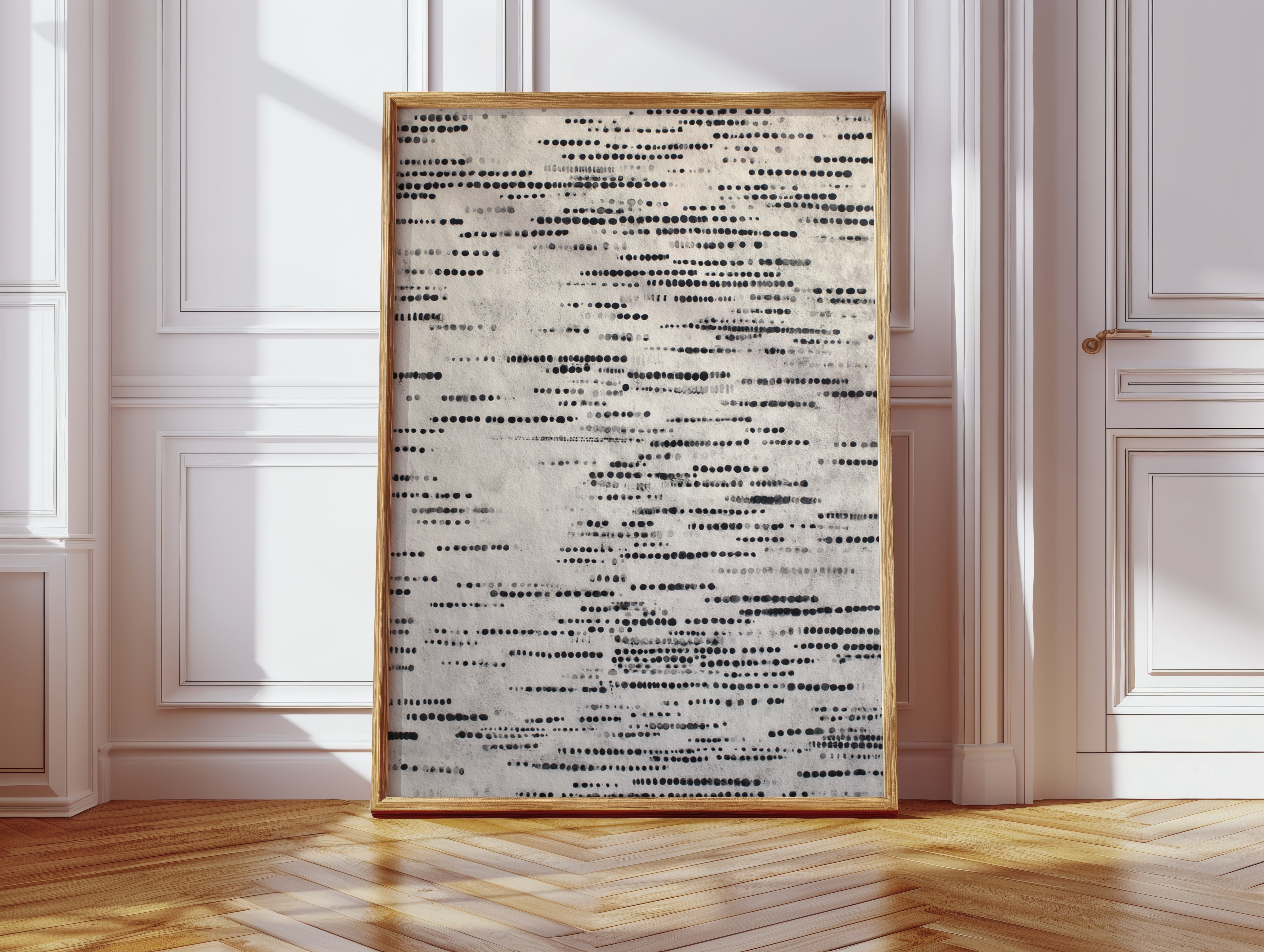 In a dance of circles and lines, a quiet symphony emerges, inviting the viewer to pause and reflect. This piece embodies the artisanal spirit, celebrating the beauty of handmade craftsmanship. Each dot tells a story, layered in shades of black and gray, evoking a tactile connection to the past and a whisper of the present. Perfect for a serene reading nook or a contemplative corner of your home, where thoughts can flow freely.