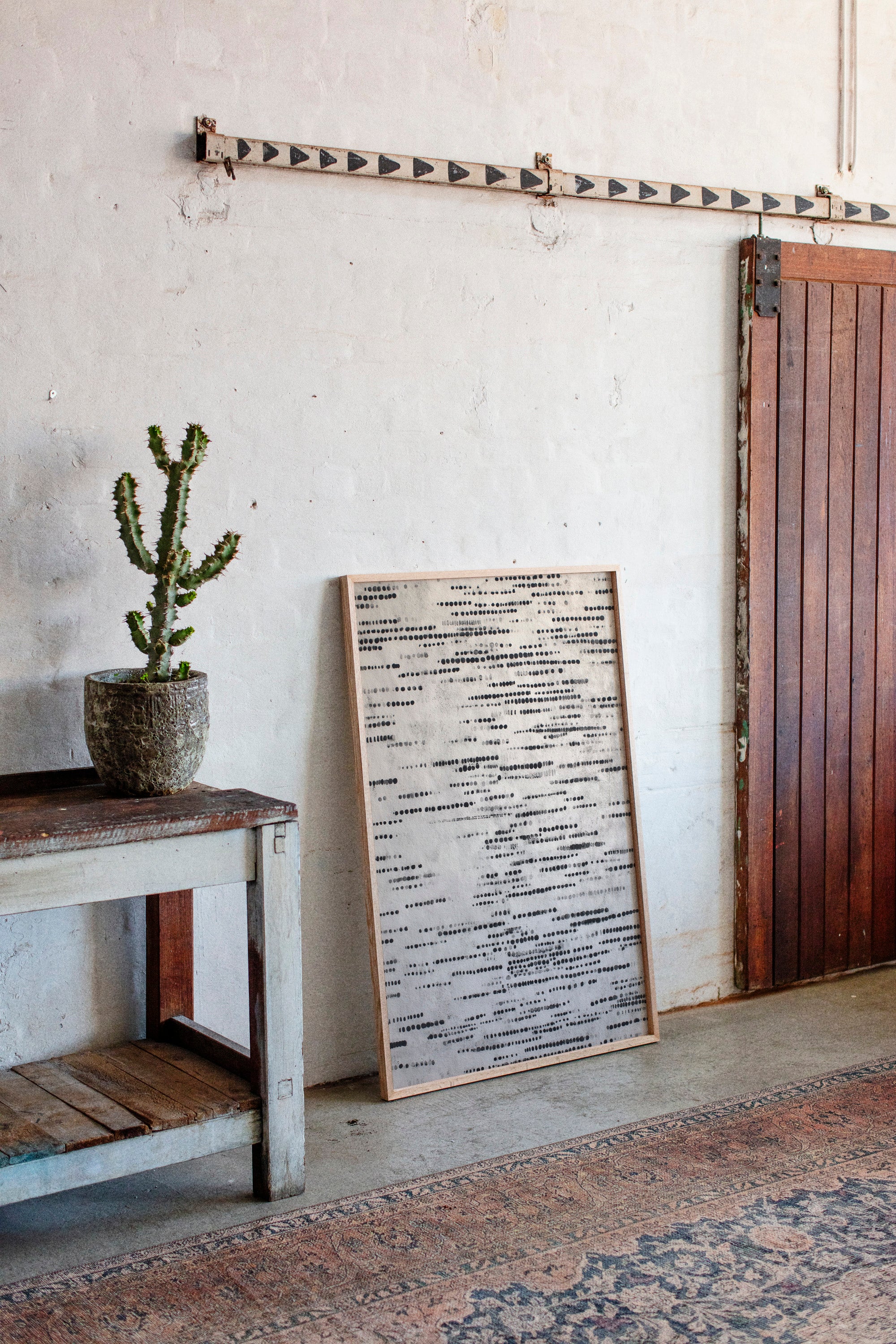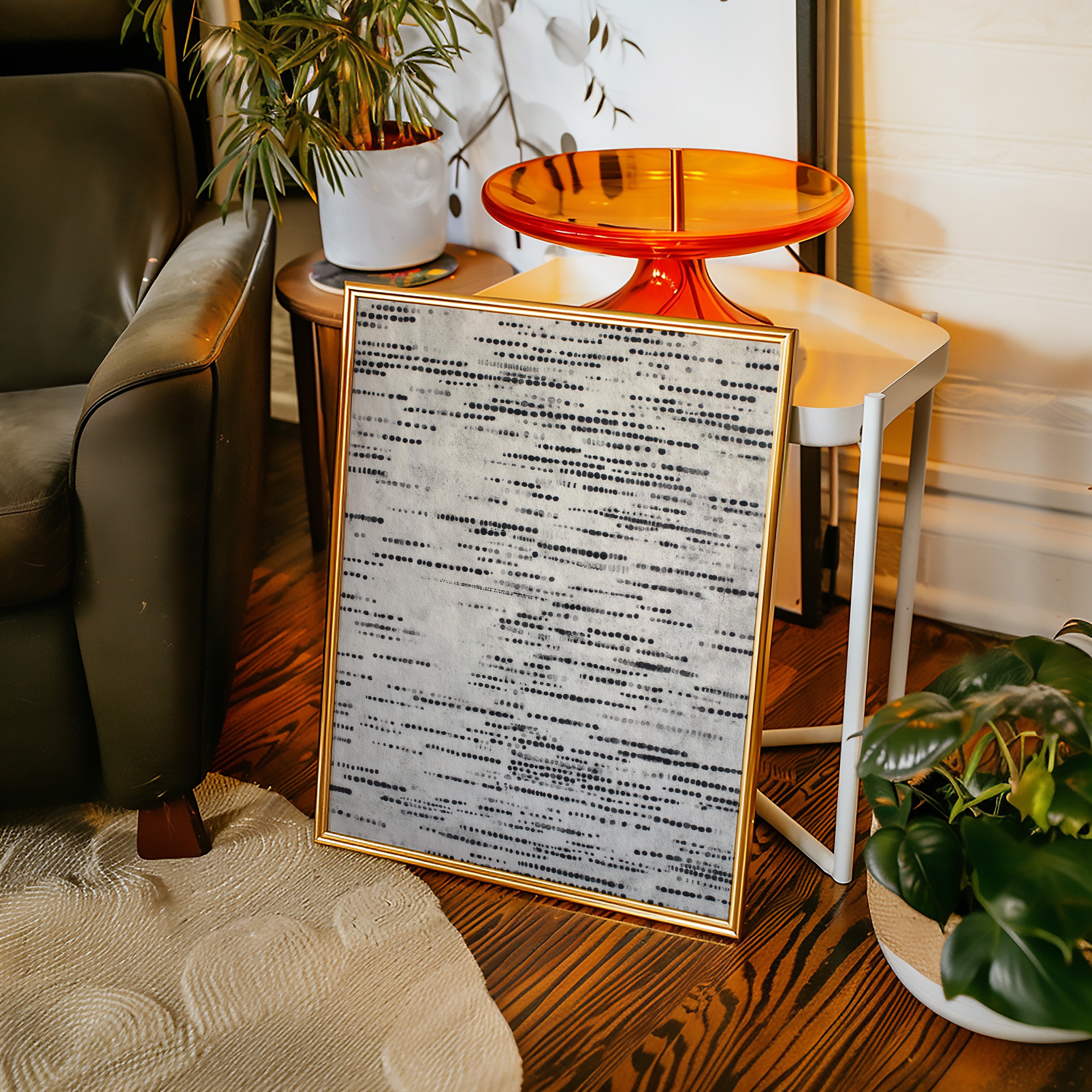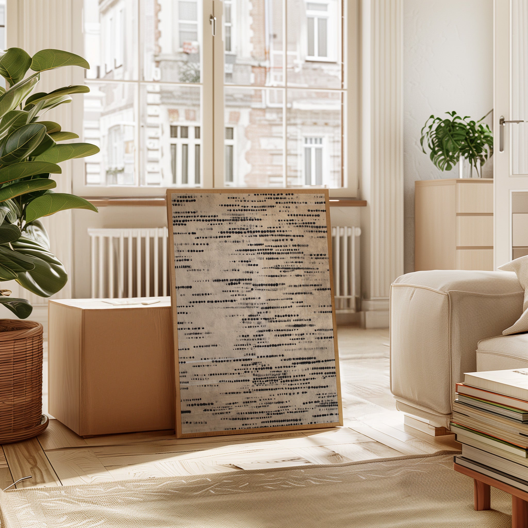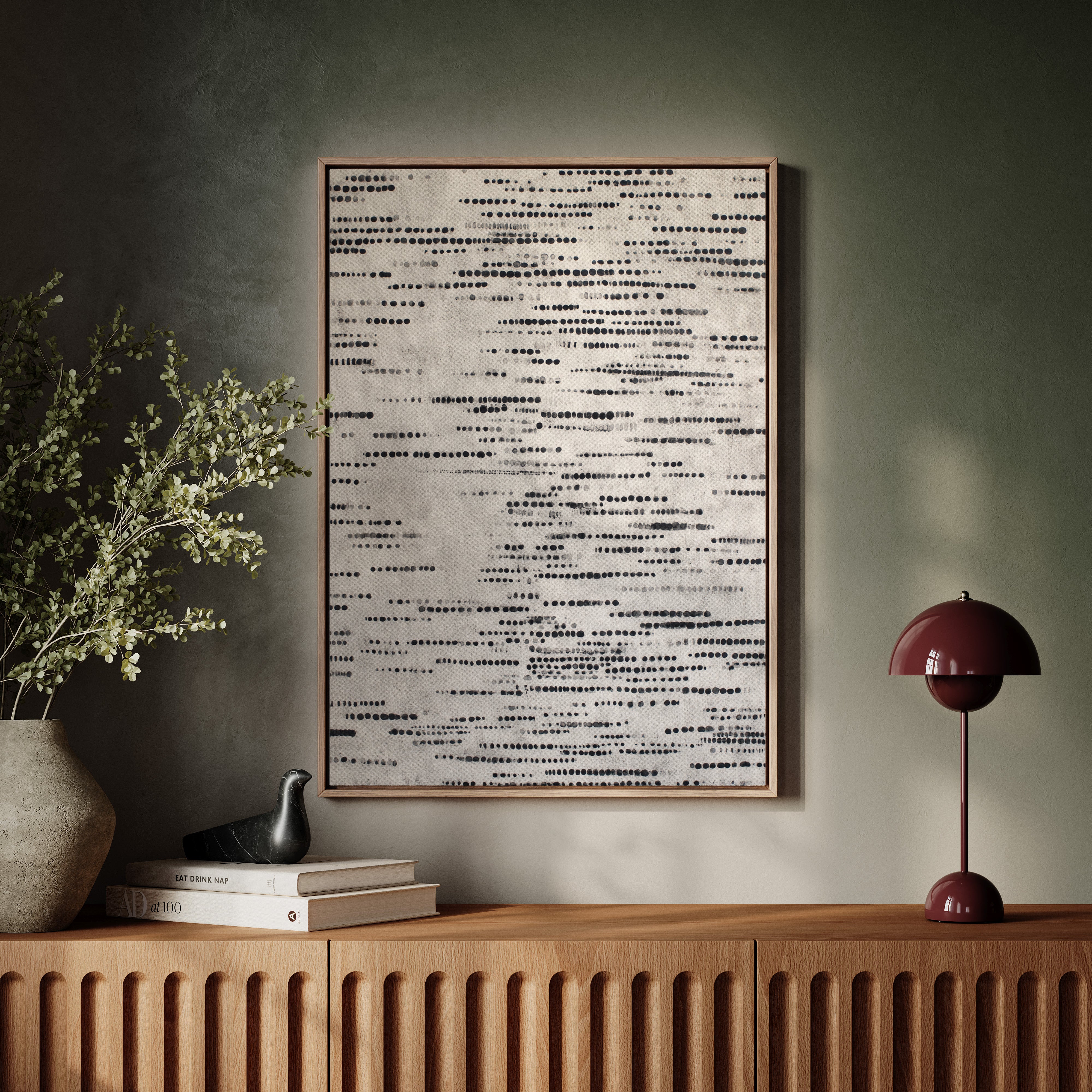 In a dance of circles and lines, a quiet symphony emerges, inviting the viewer to pause and reflect. This piece embodies the artisanal spirit, celebrating the beauty of handmade craftsmanship. Each dot tells a story, layered in shades of black and gray, evoking a tactile connection to the past and a whisper of the present. Perfect for a serene reading nook or a contemplative corner of your home, where thoughts can flow freely.