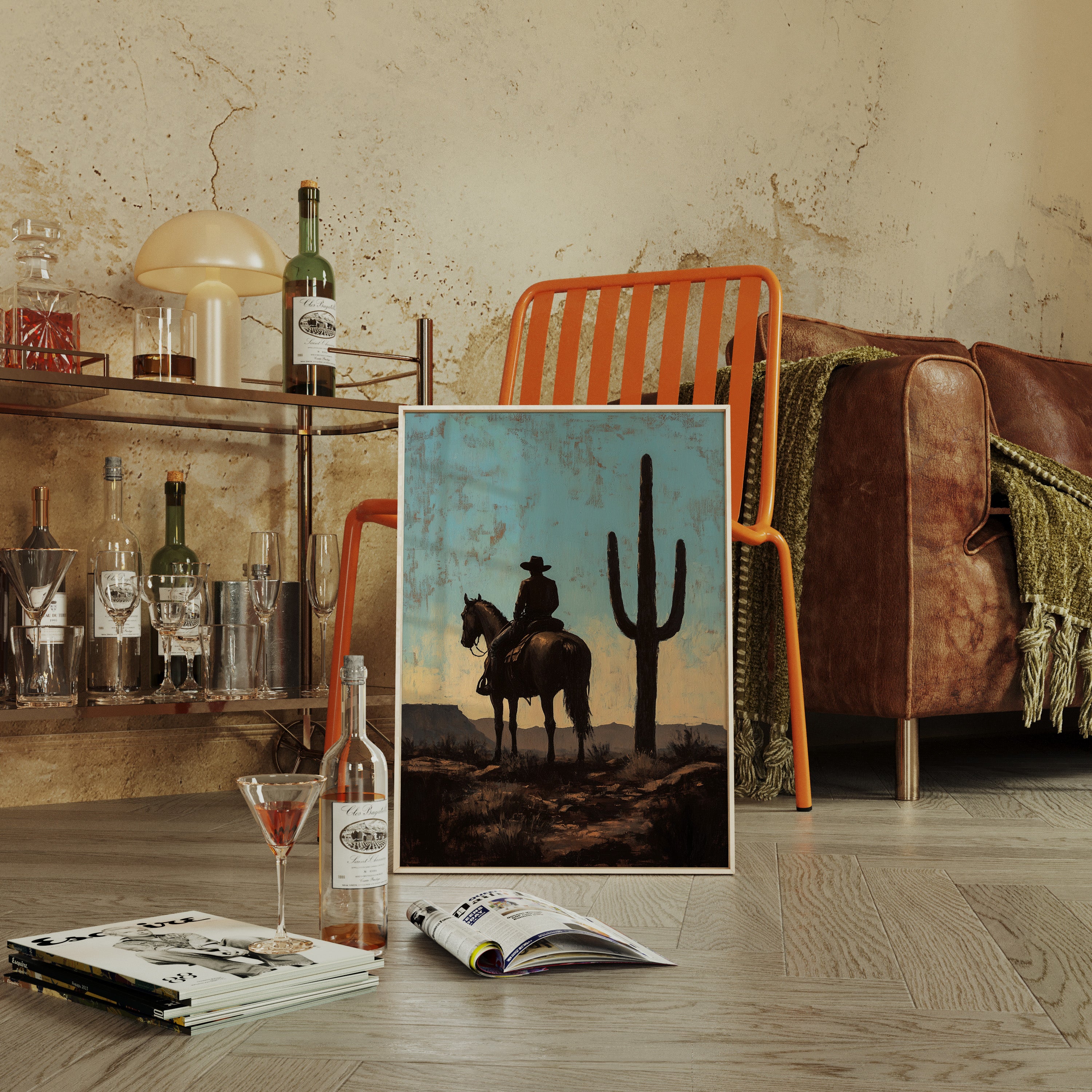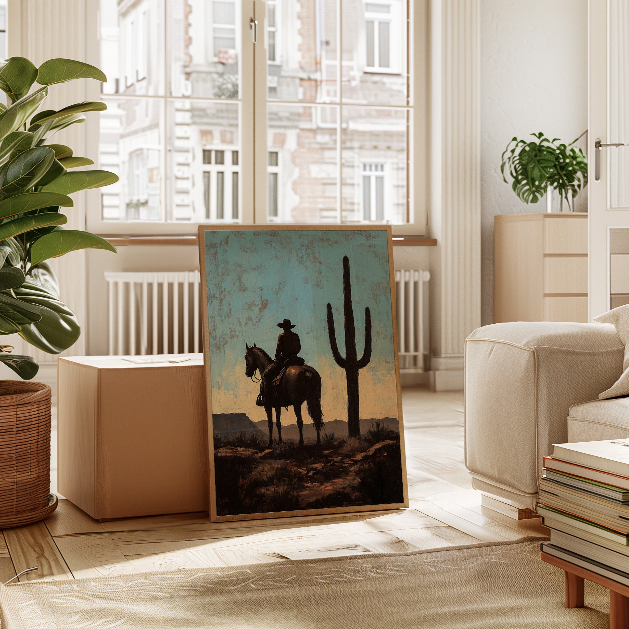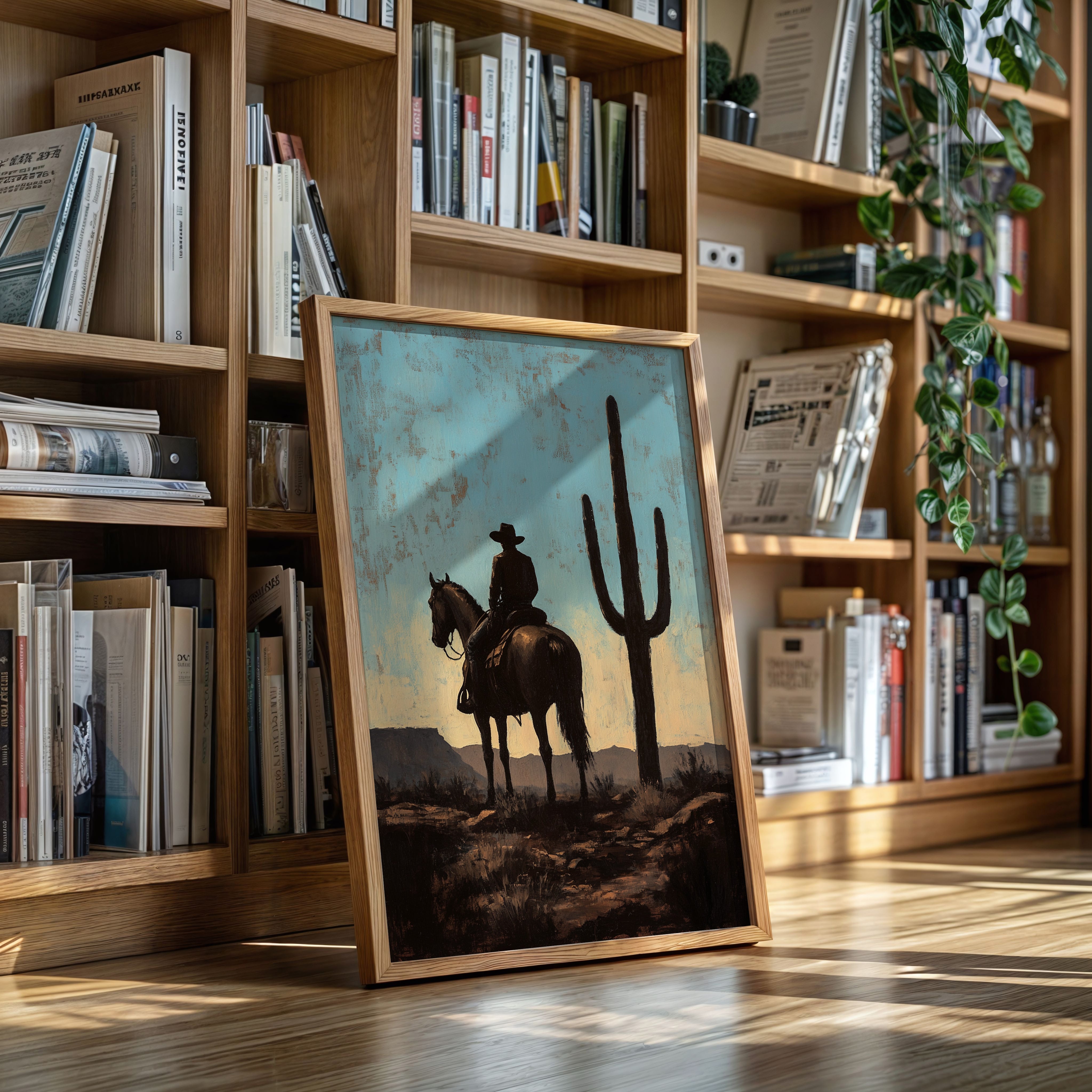 Shadow and silence fall across the desert as a lone rider pauses beside a towering saguaro. Painted with textured strokes and dusty light, this piece hums with stillness.