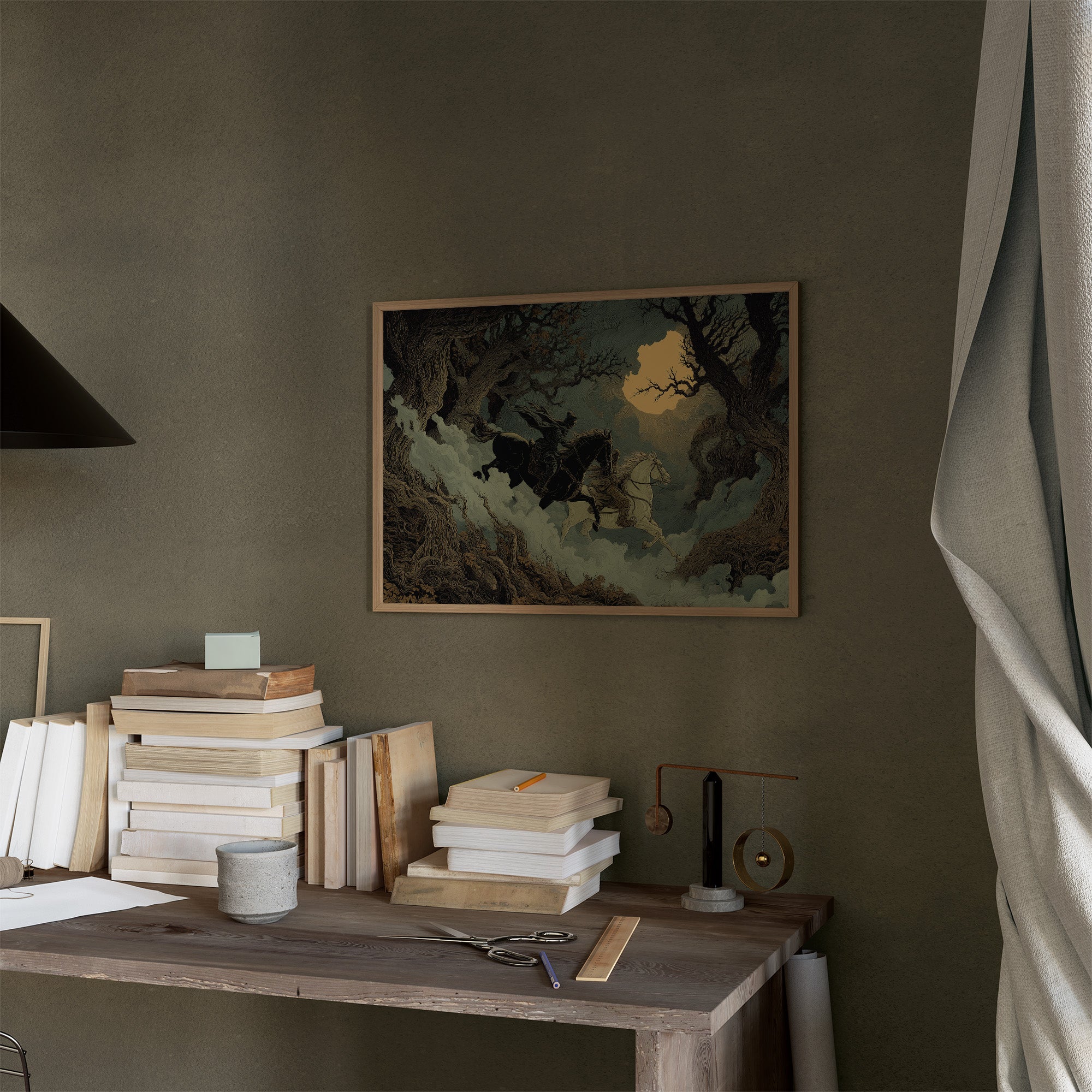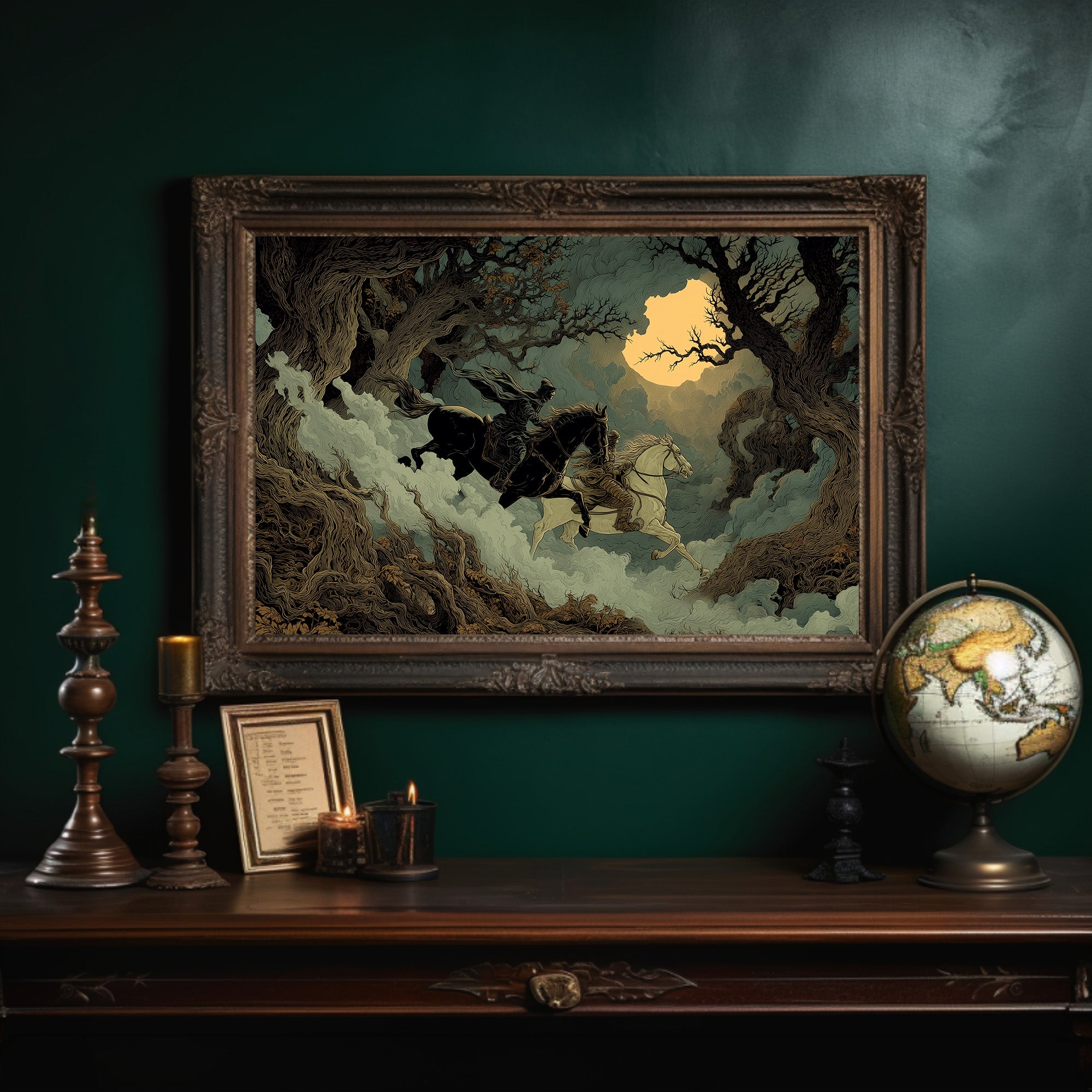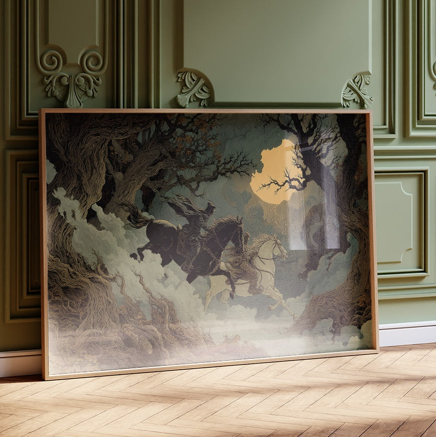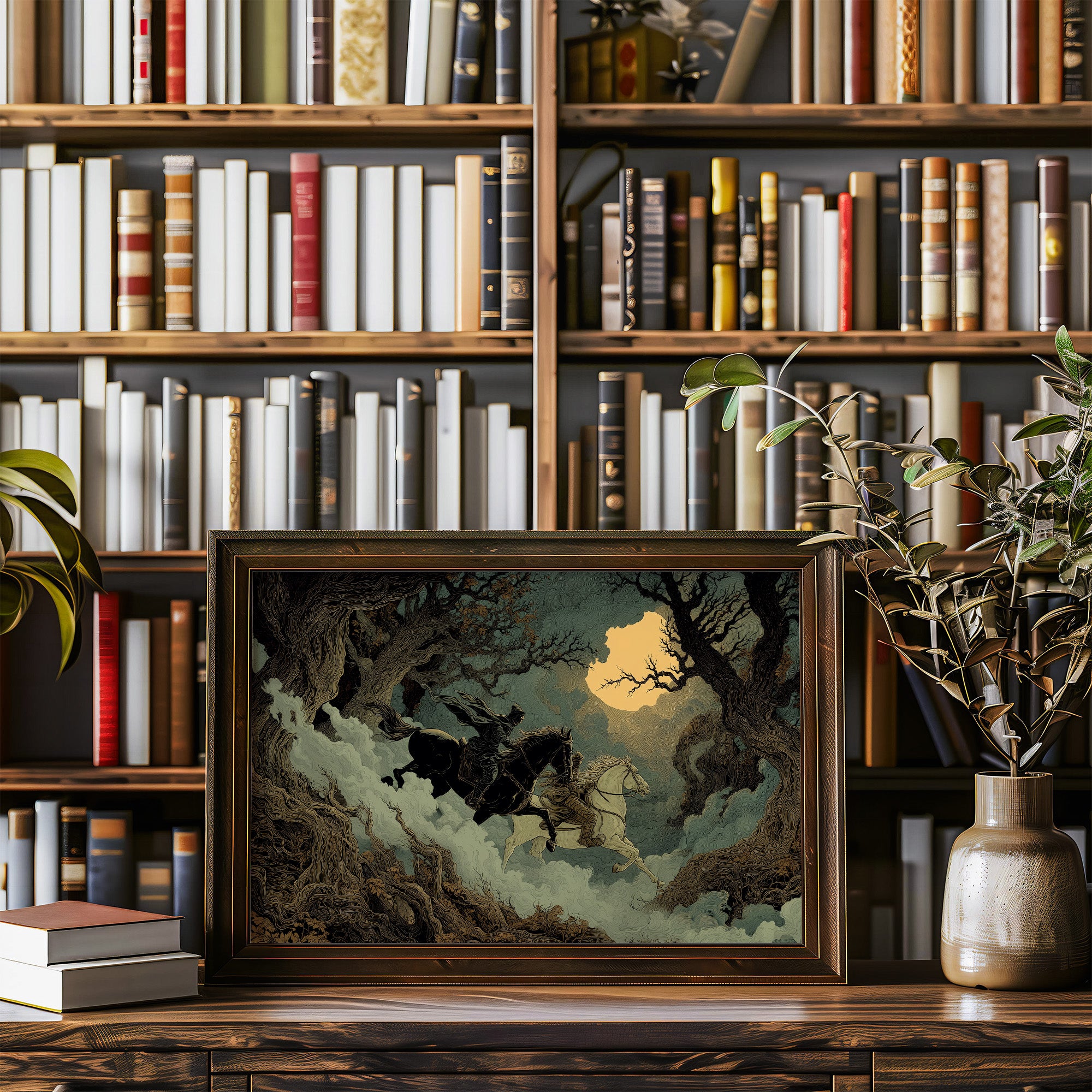Mist curls around ancient trees as two horsemen gallop through a mythical forest bathed in golden moonlight. The dramatic contrast between the dark silhouettes and the luminous amber glow creates a tale of pursuit and mystery, where twisted branches reach like spectral hands through billowing clouds. This haunting scene sits perfectly framed against a backdrop of collected wisdom, bringing a touch of folklore and adventure to a scholarly study or reading nook.