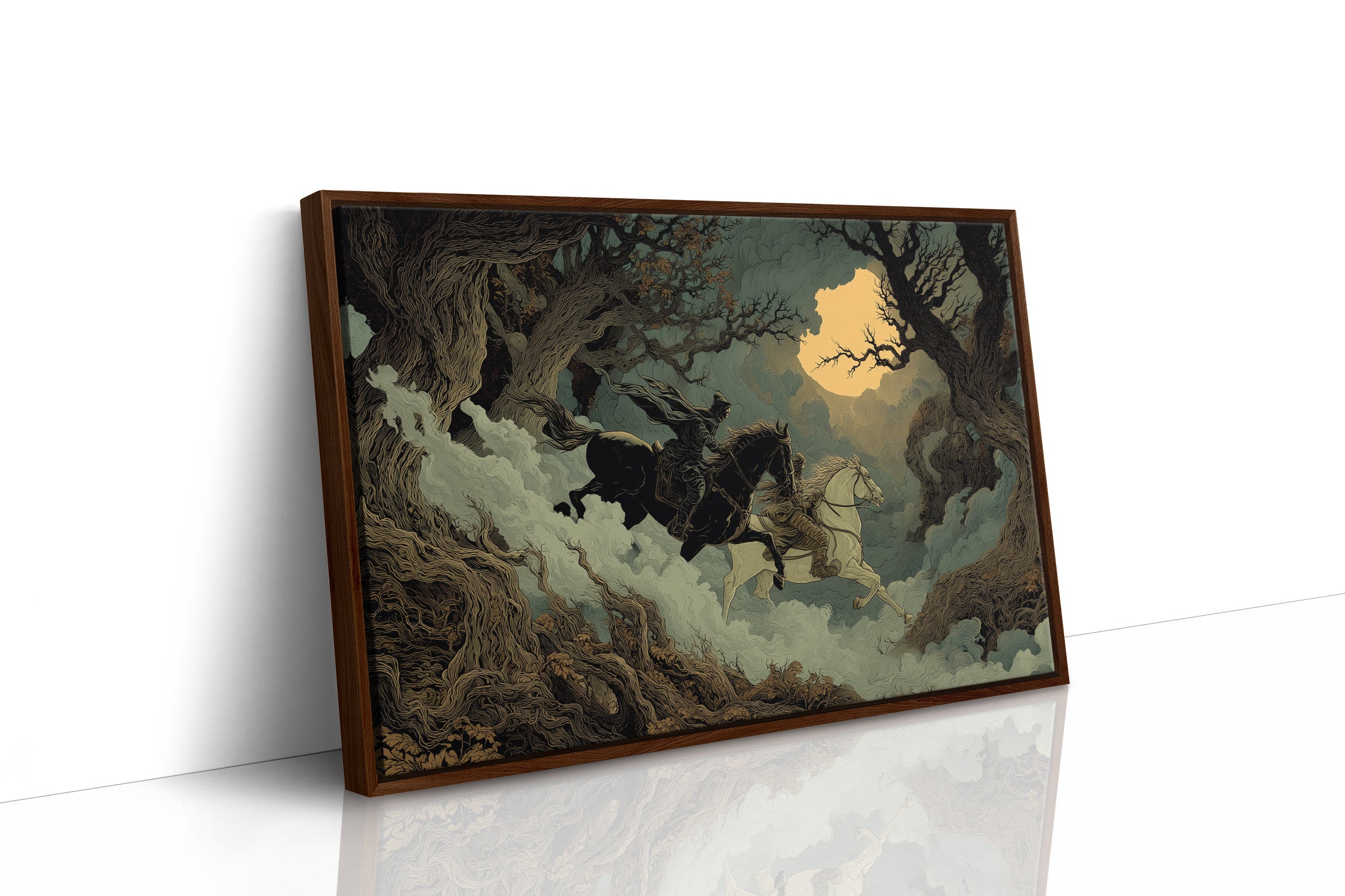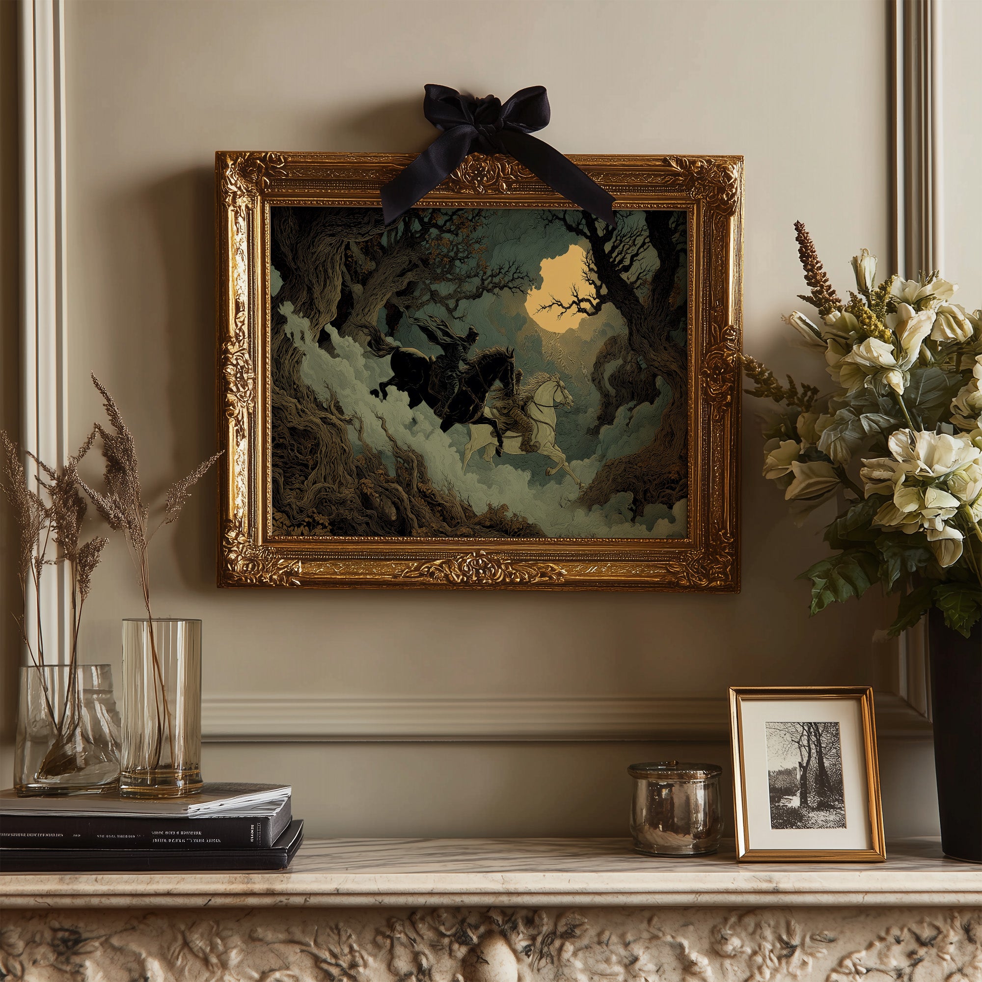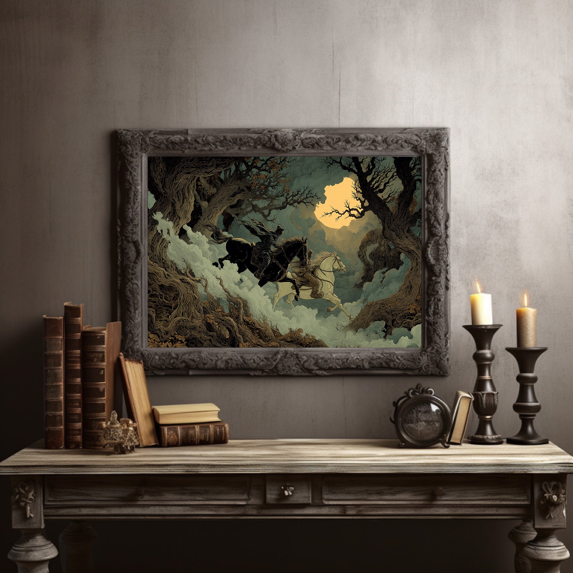 Mist curls around ancient trees as two horsemen gallop through a mythical forest bathed in golden moonlight. The dramatic contrast between the dark silhouettes and the luminous amber glow creates a tale of pursuit and mystery, where twisted branches reach like spectral hands through billowing clouds. This haunting scene sits perfectly framed against a backdrop of collected wisdom, bringing a touch of folklore and adventure to a scholarly study or reading nook.