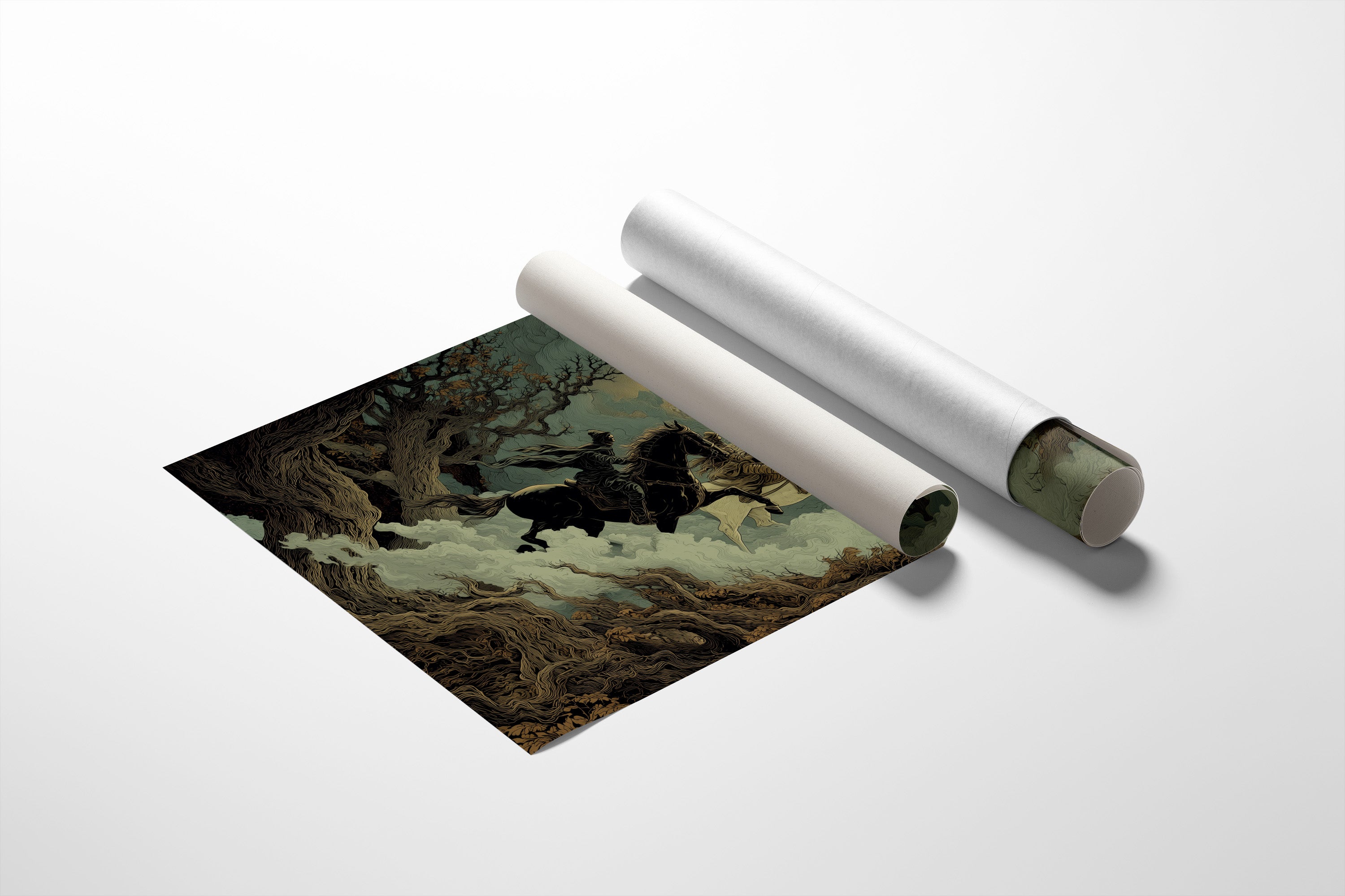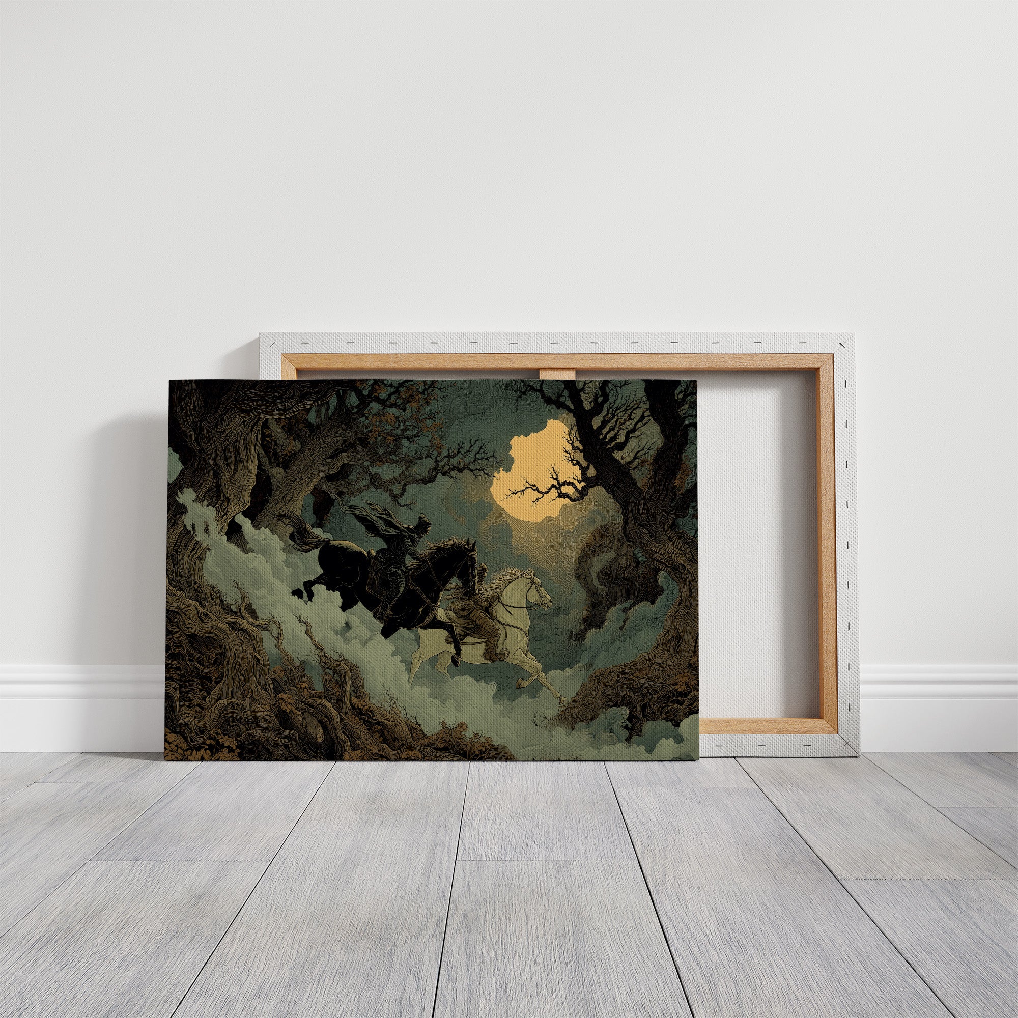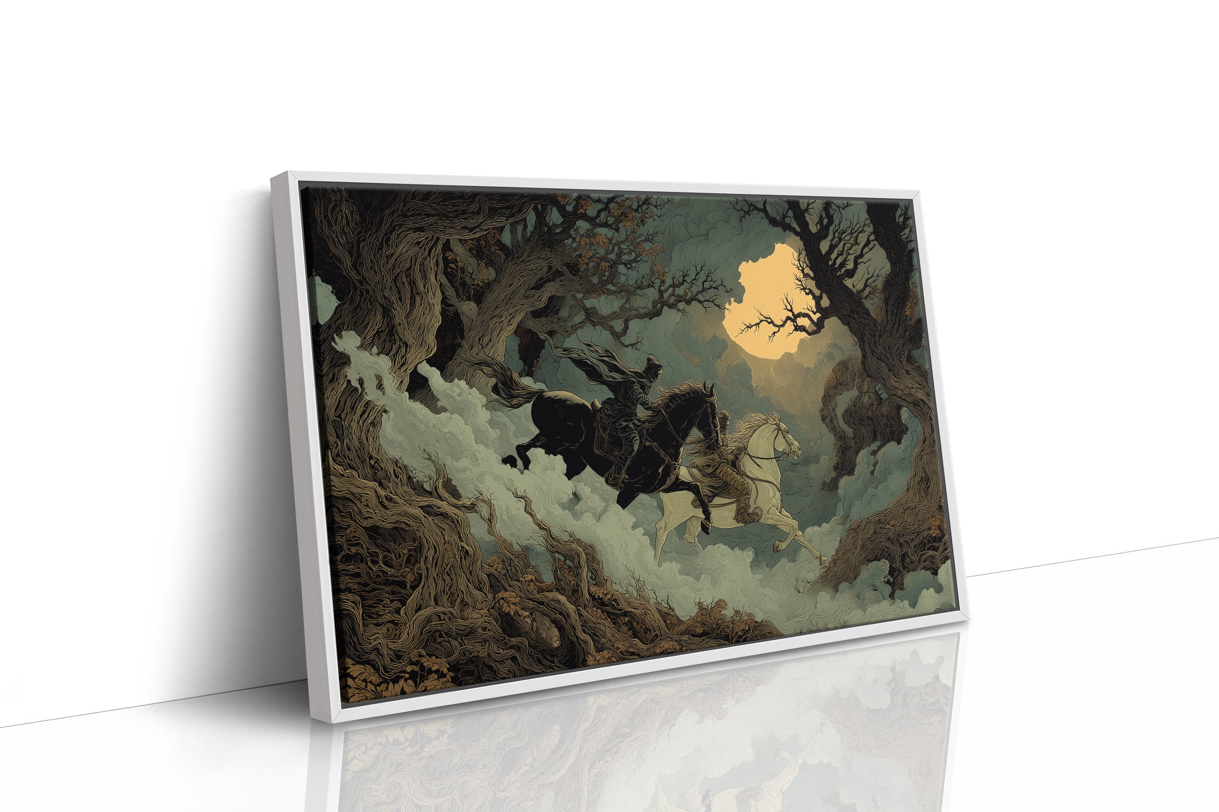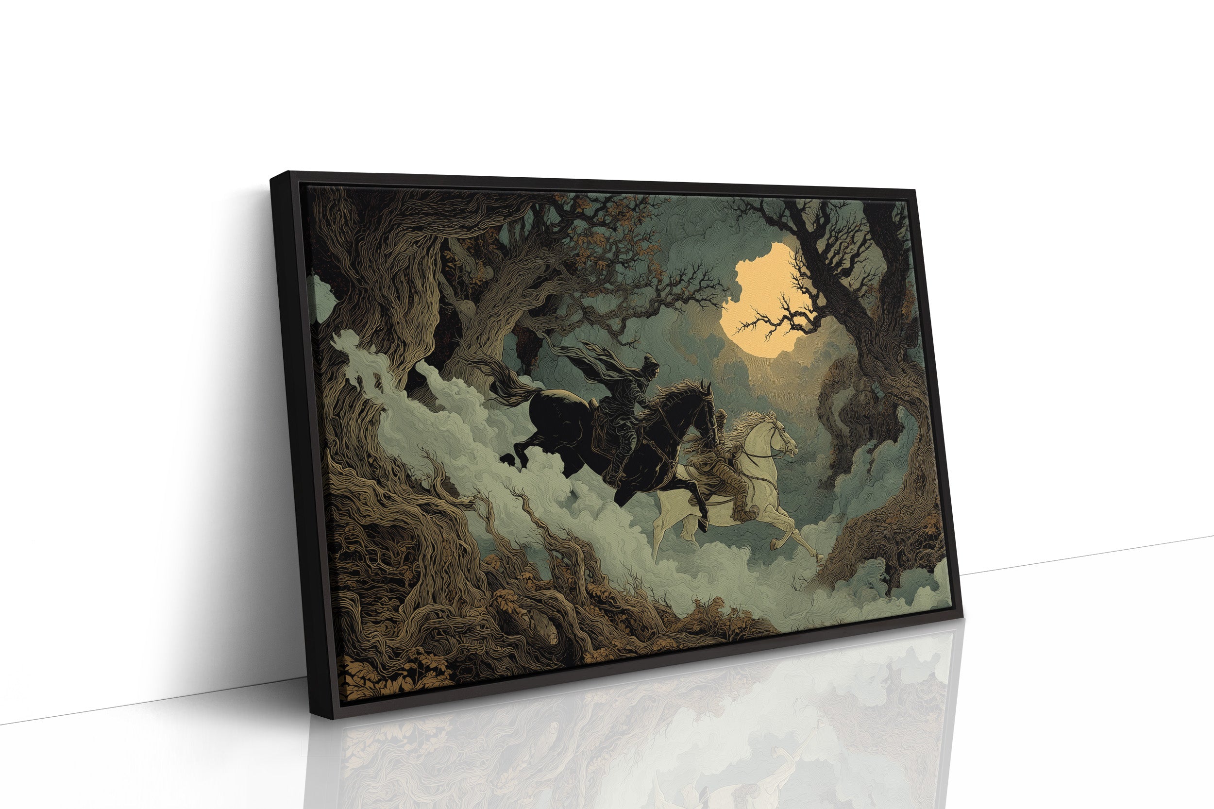 Mist curls around ancient trees as two horsemen gallop through a mythical forest bathed in golden moonlight. The dramatic contrast between the dark silhouettes and the luminous amber glow creates a tale of pursuit and mystery, where twisted branches reach like spectral hands through billowing clouds. This haunting scene sits perfectly framed against a backdrop of collected wisdom, bringing a touch of folklore and adventure to a scholarly study or reading nook.