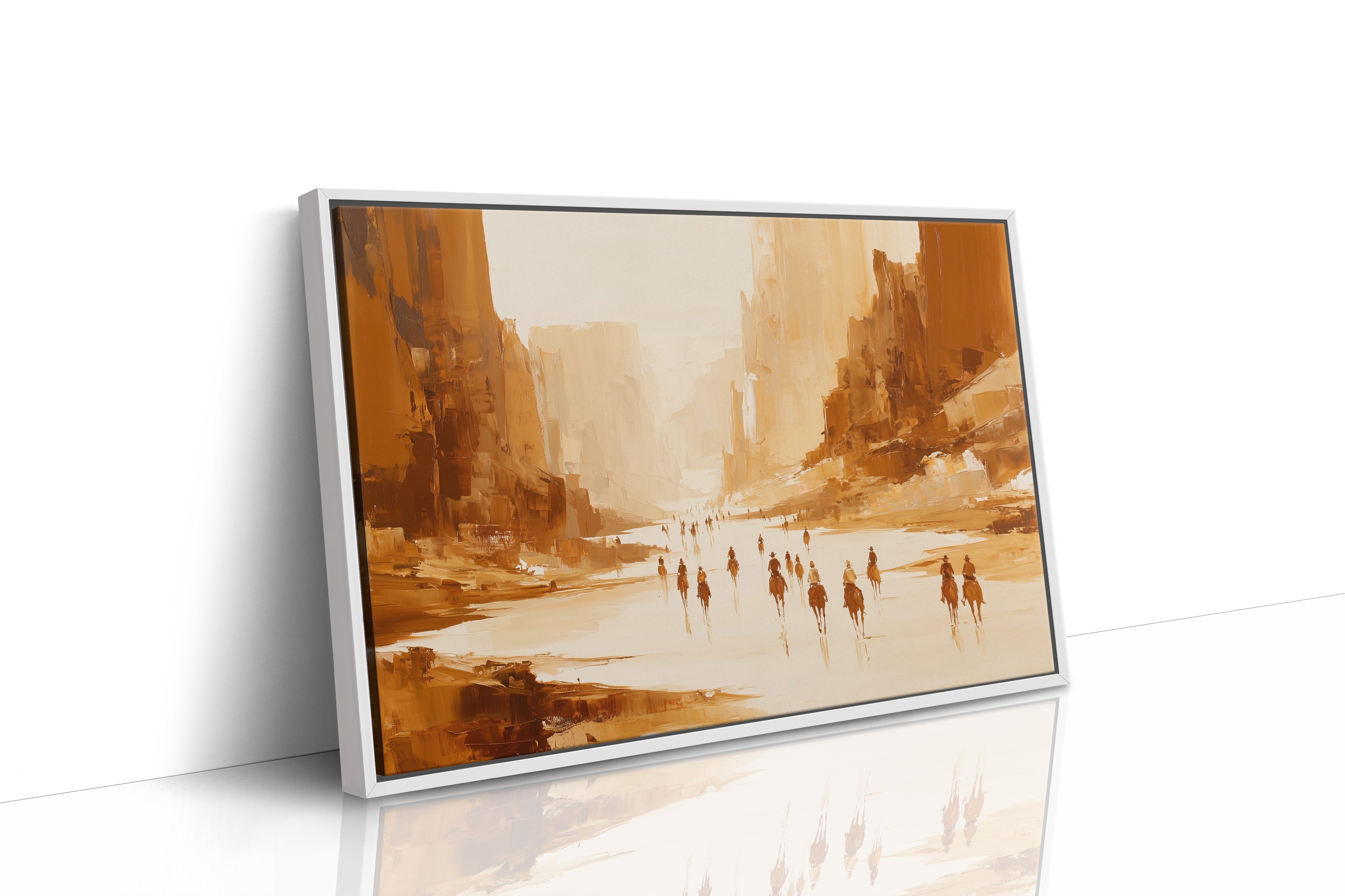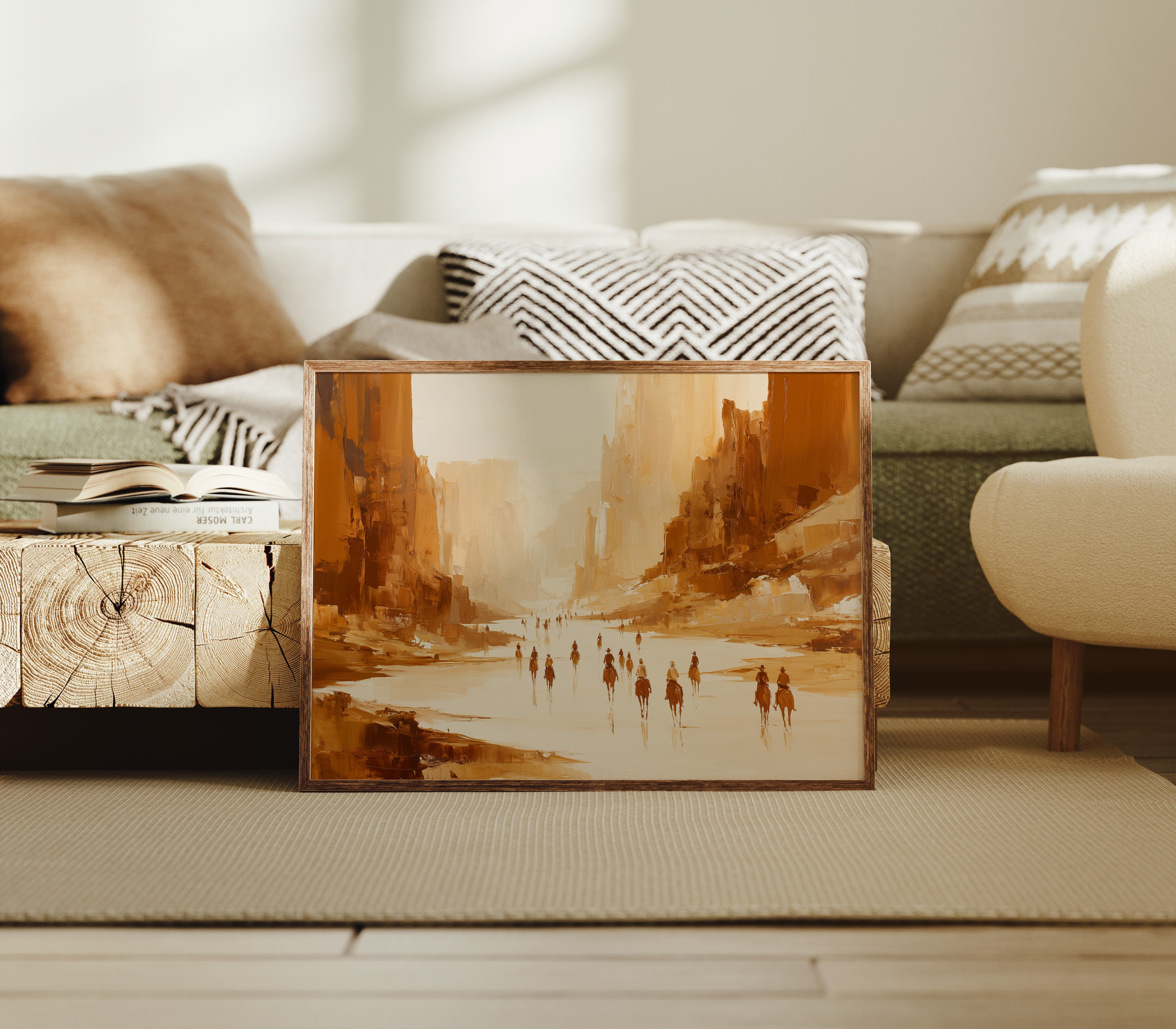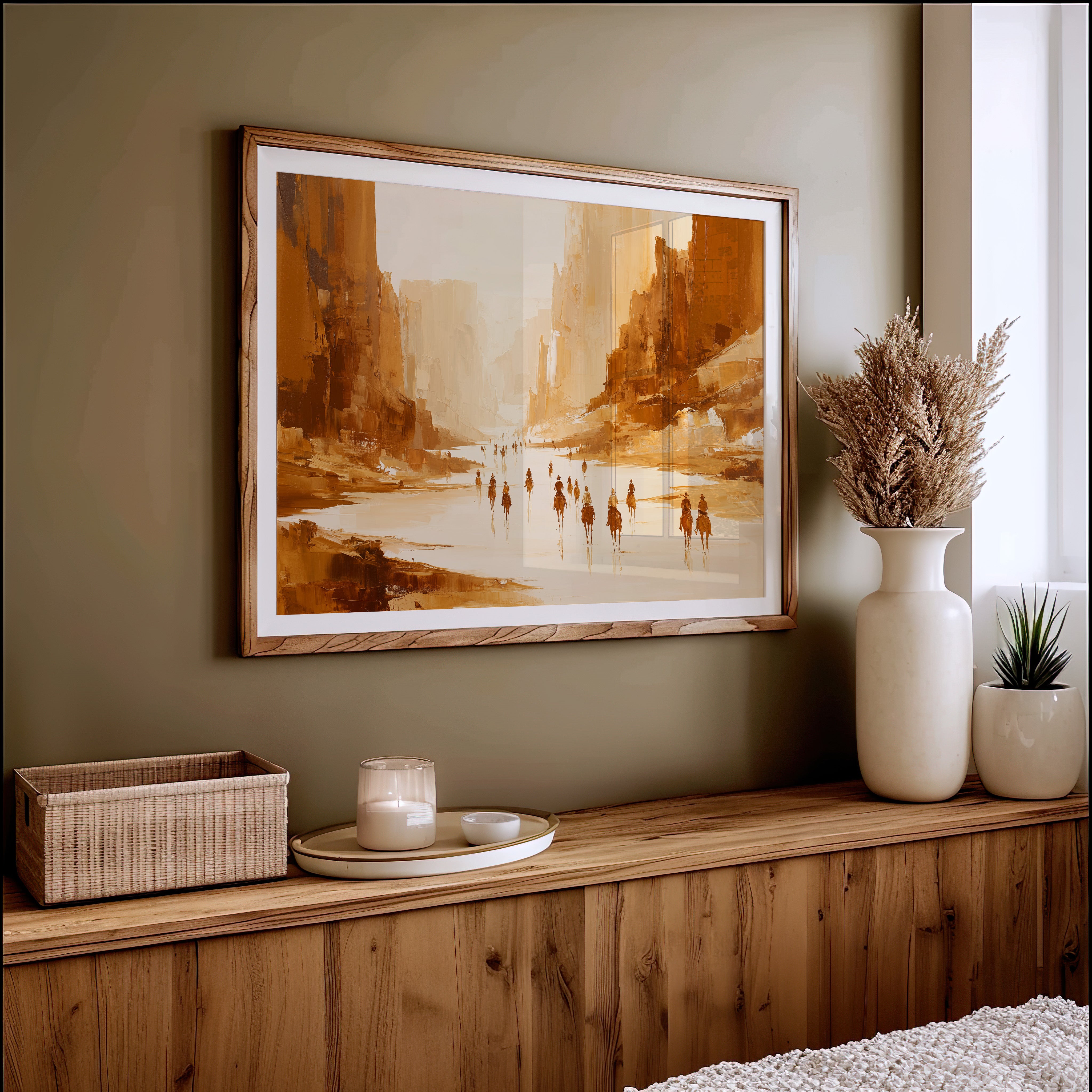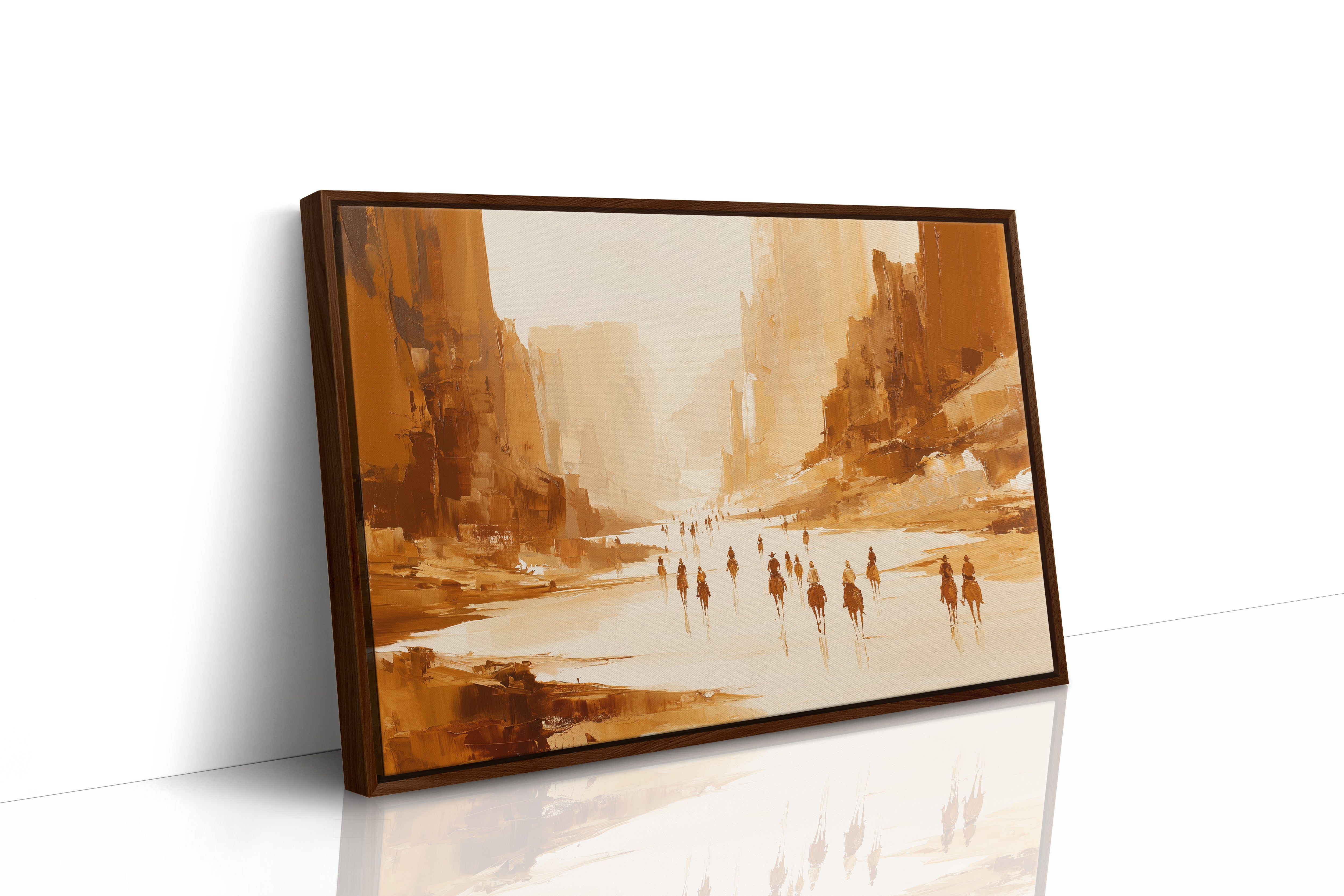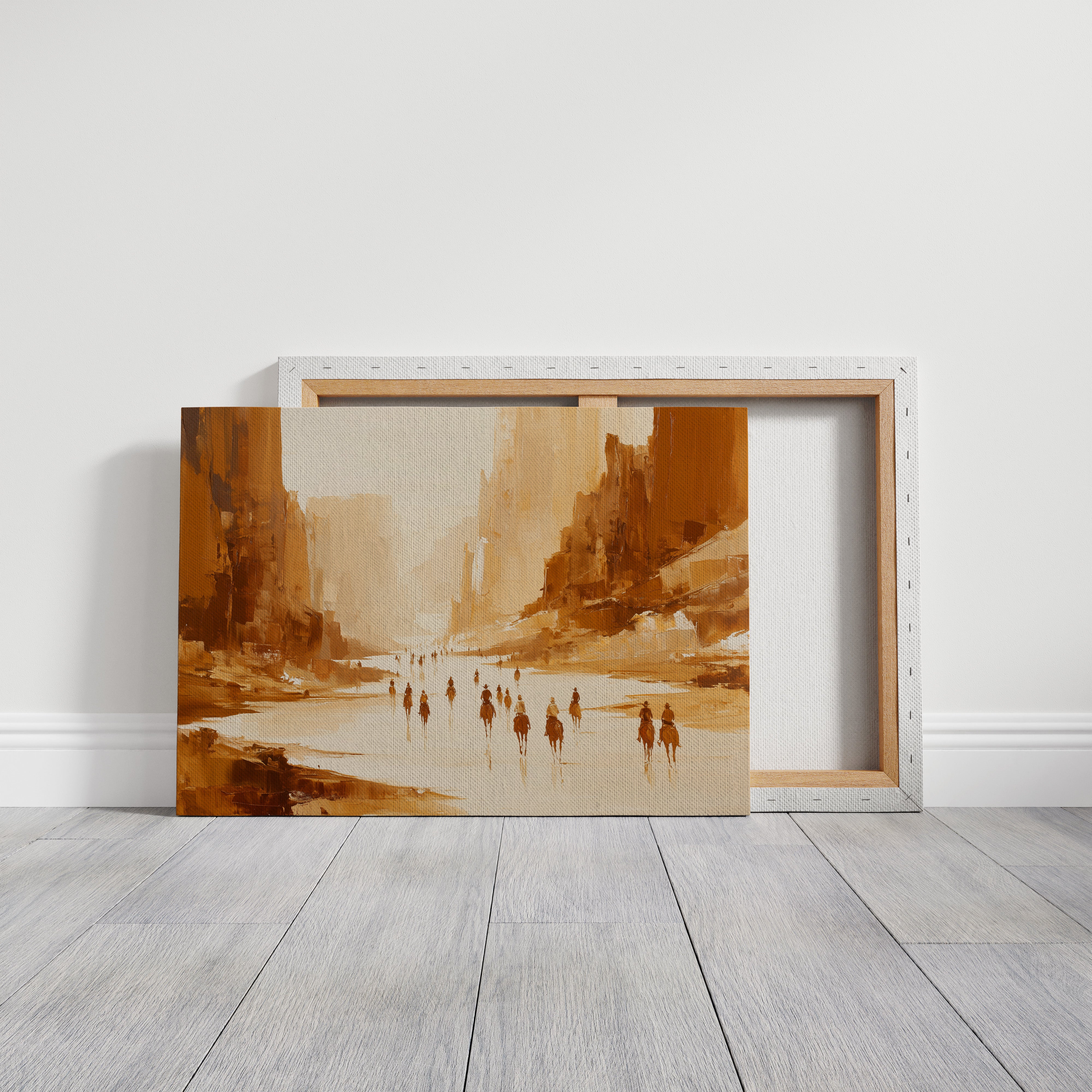 Time stands still in the golden haze, where riders become silhouettes against the vast canyon walls. This piece from our Contemporary collection reimagines the classic American West through a modern, minimalist lens. Towering sandstone cliffs frame the journey, their warm sepia tones melting into cream-colored mist, while the riders move in perfect rhythm across the sun-bleached canyon floor. Each brushstroke captures the timeless dialogue between human and landscape, adventure and solitude. This striking piece commands attention in a living room or office space, where its expansive scene creates a window into wilderness. The composition invites viewers to join the journey, to feel the morning light warming the ancient stones.