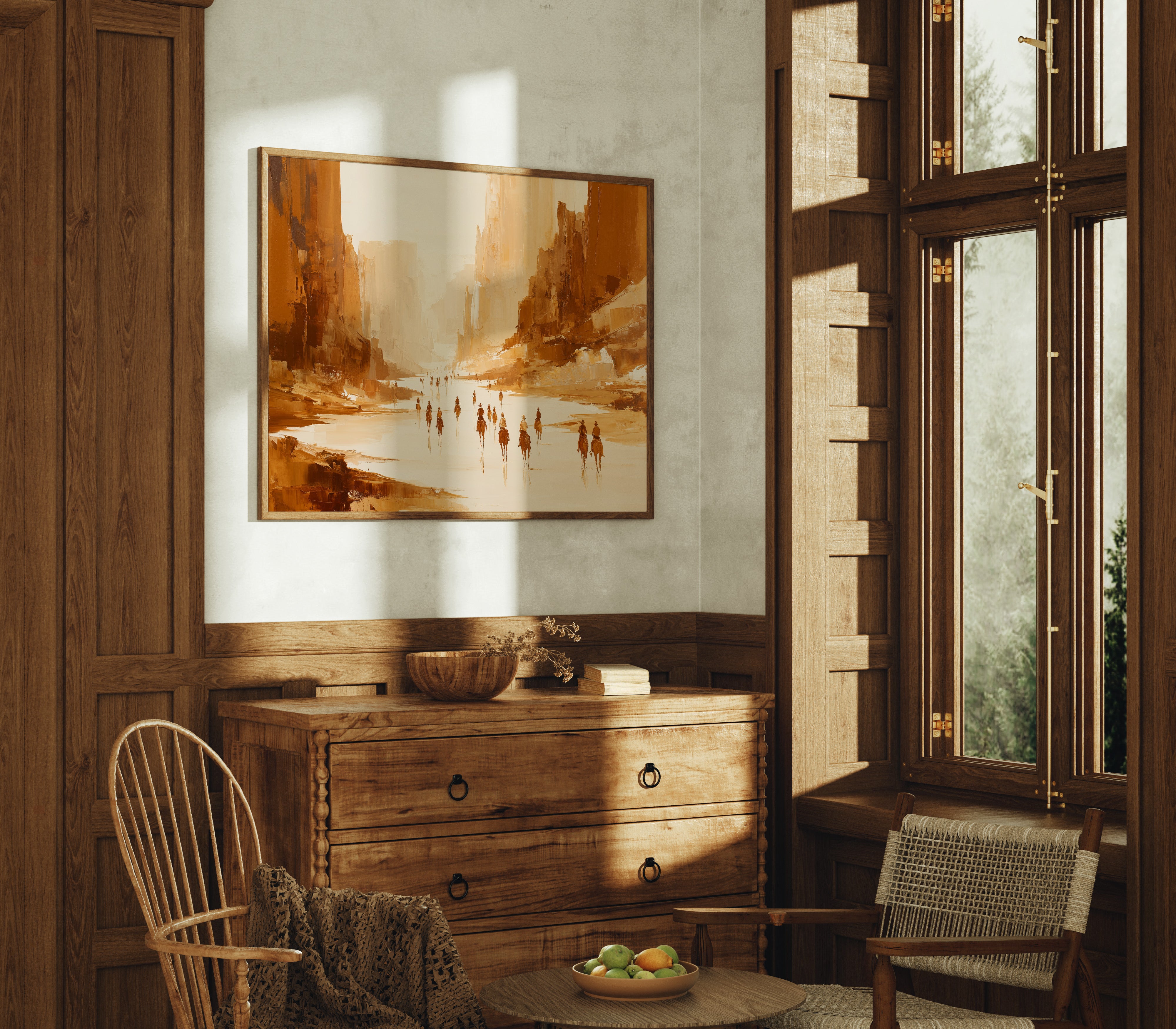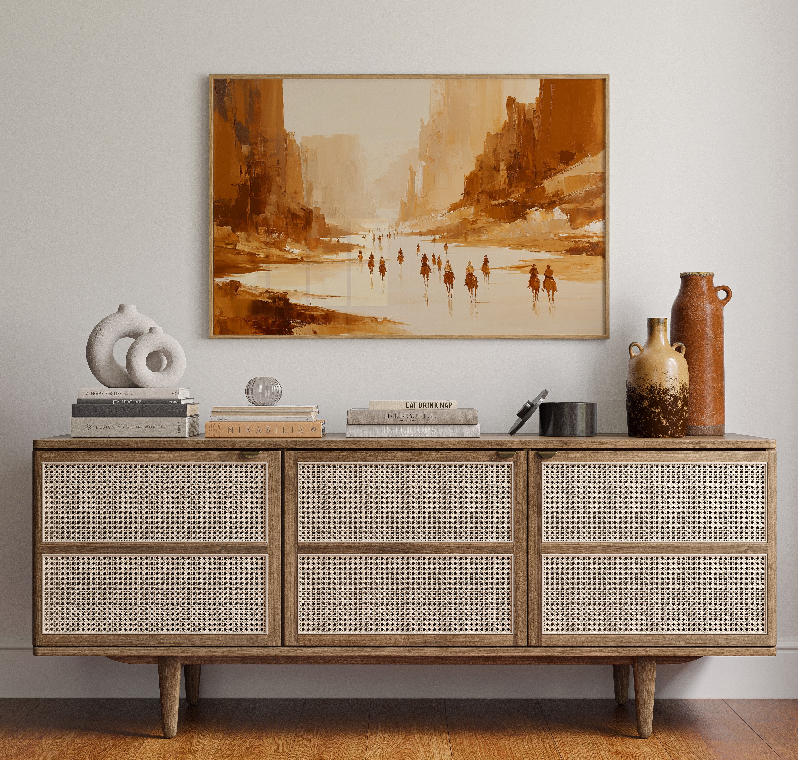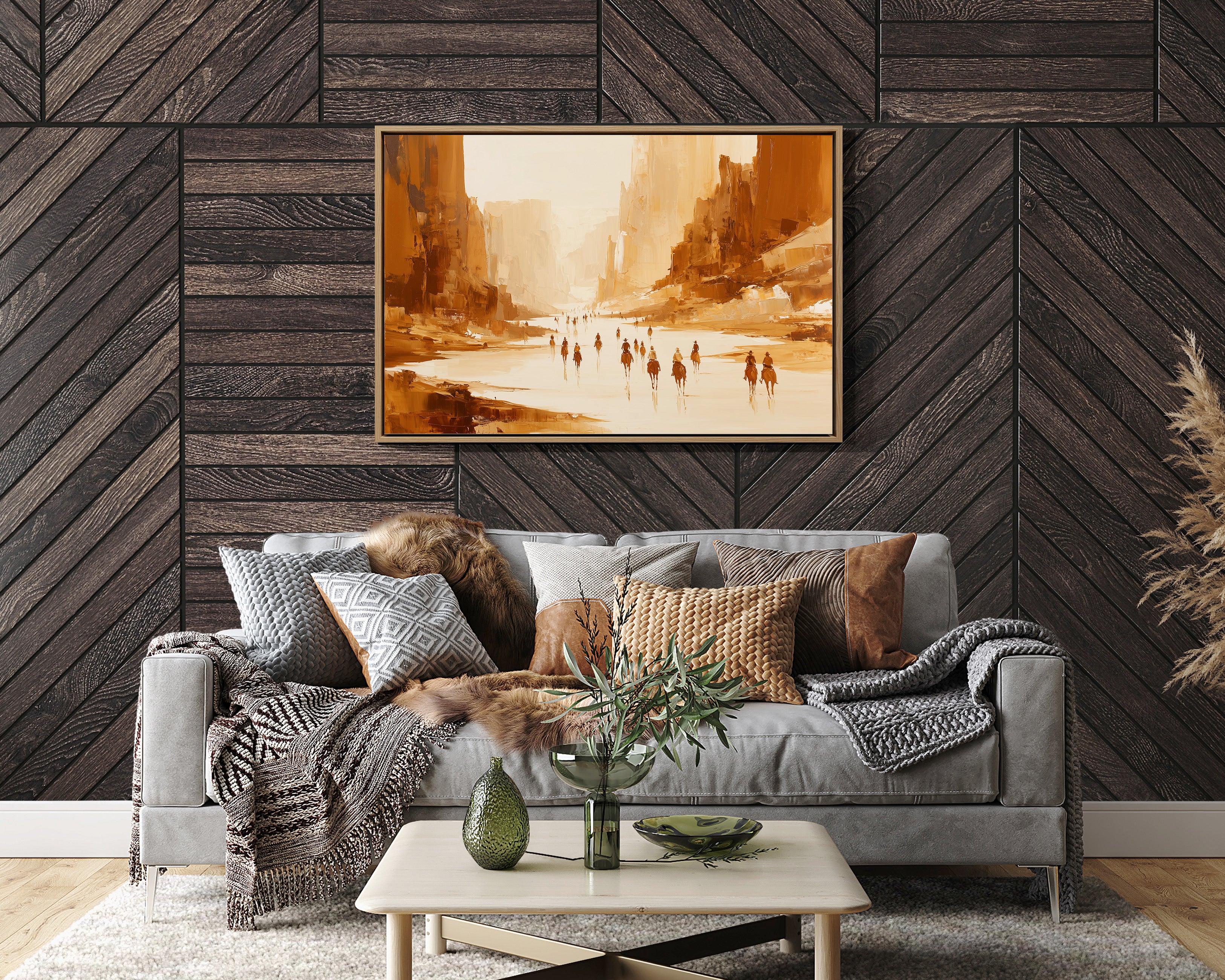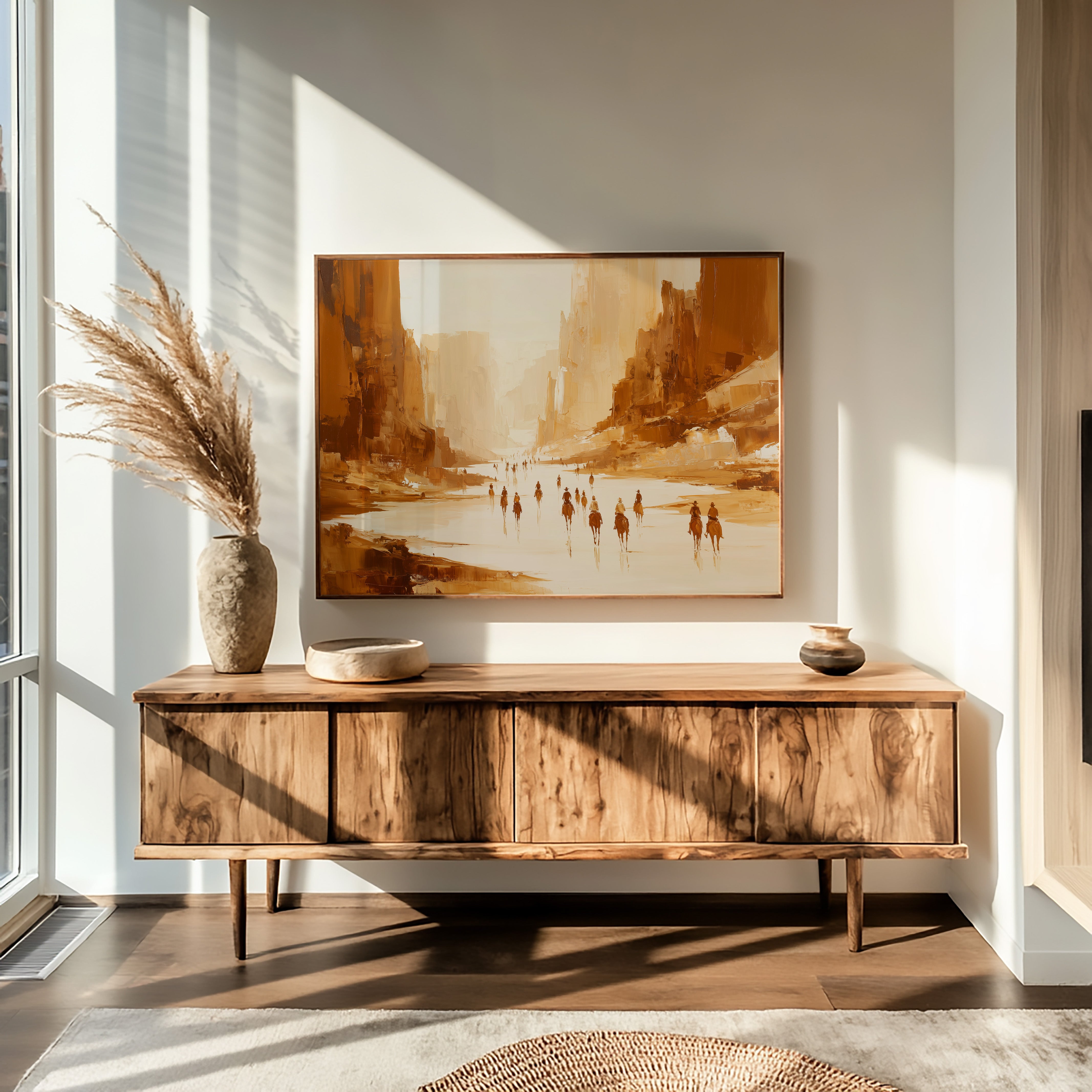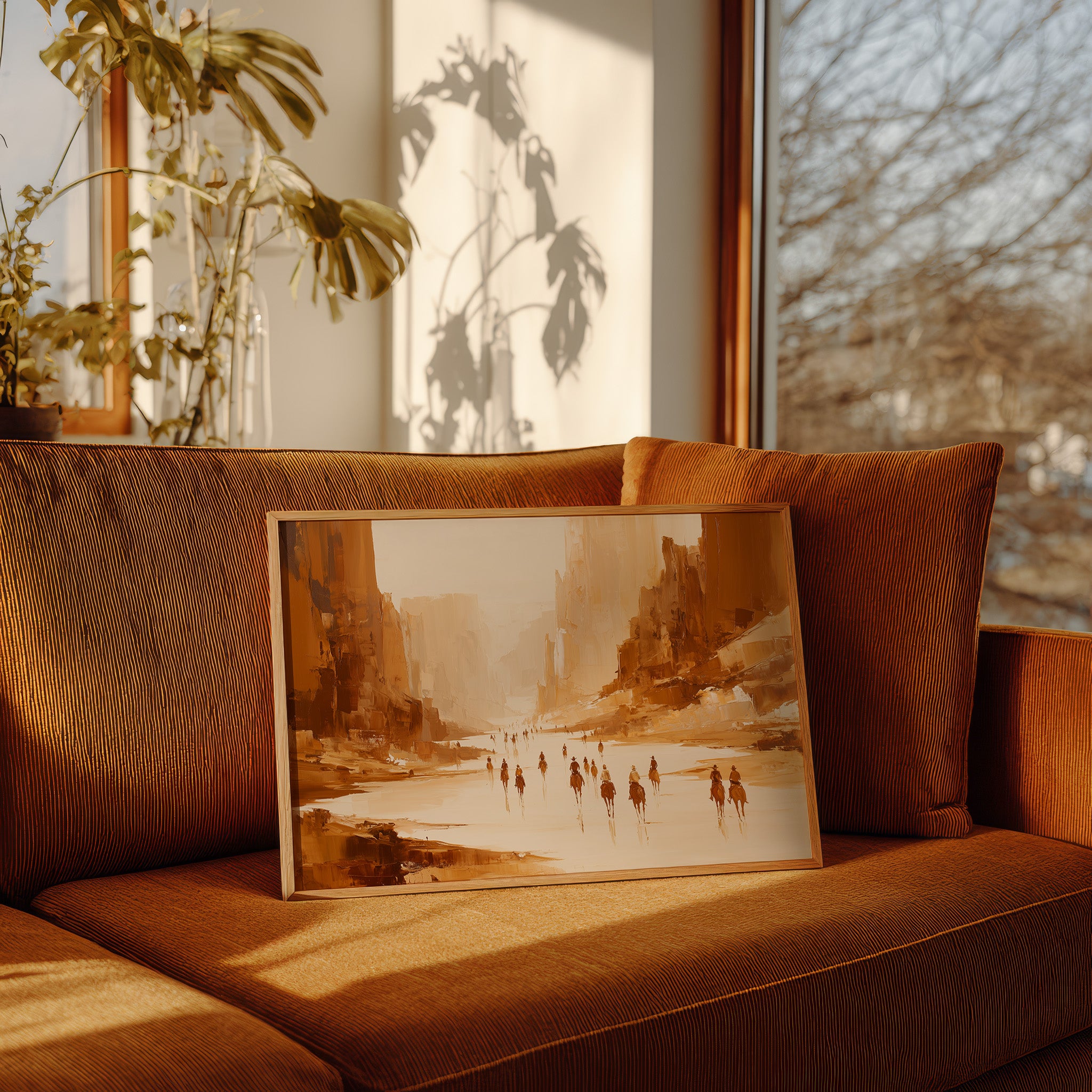 Time stands still in the golden haze, where riders become silhouettes against the vast canyon walls. This piece from our Contemporary collection reimagines the classic American West through a modern, minimalist lens. Towering sandstone cliffs frame the journey, their warm sepia tones melting into cream-colored mist, while the riders move in perfect rhythm across the sun-bleached canyon floor. Each brushstroke captures the timeless dialogue between human and landscape, adventure and solitude. This striking piece commands attention in a living room or office space, where its expansive scene creates a window into wilderness. The composition invites viewers to join the journey, to feel the morning light warming the ancient stones.