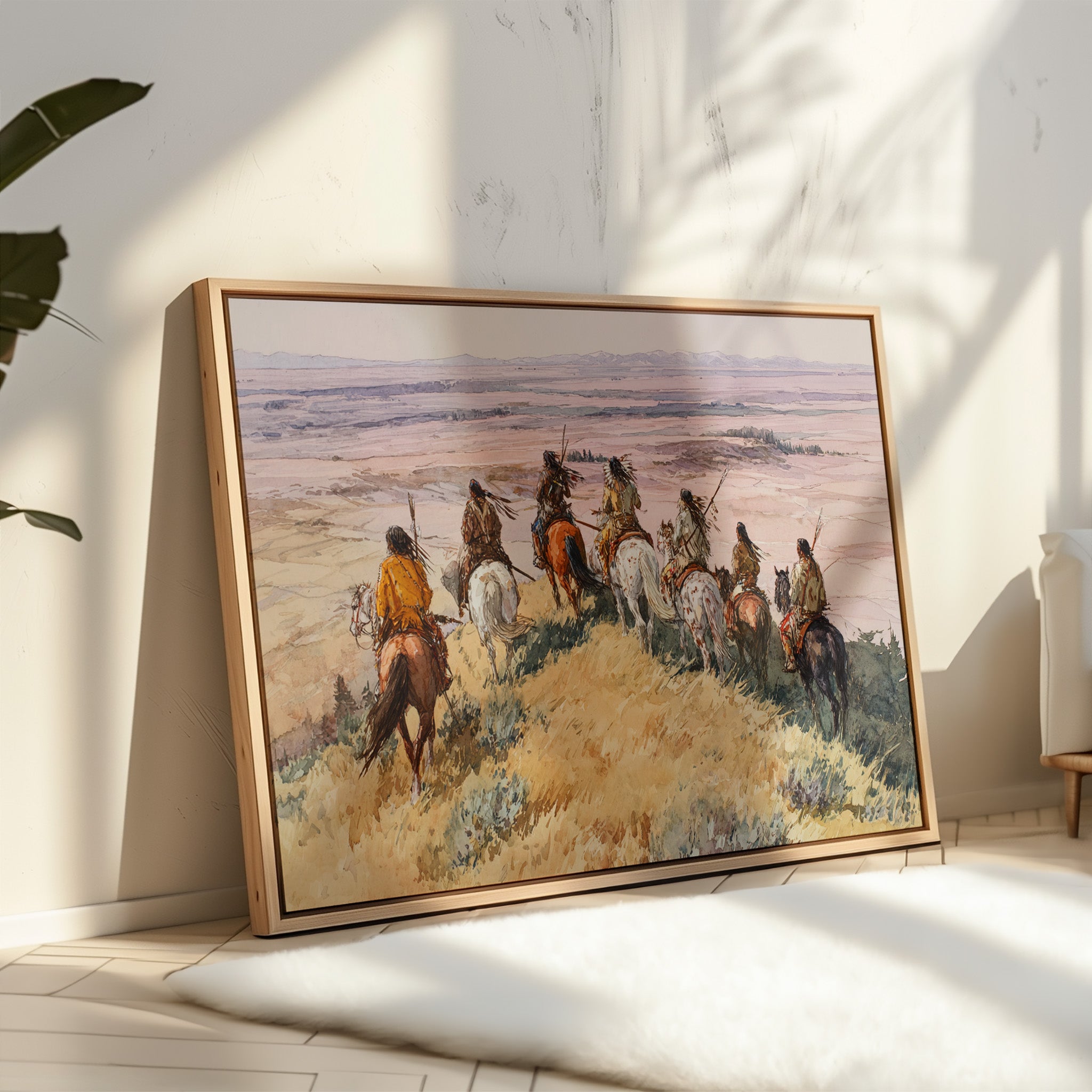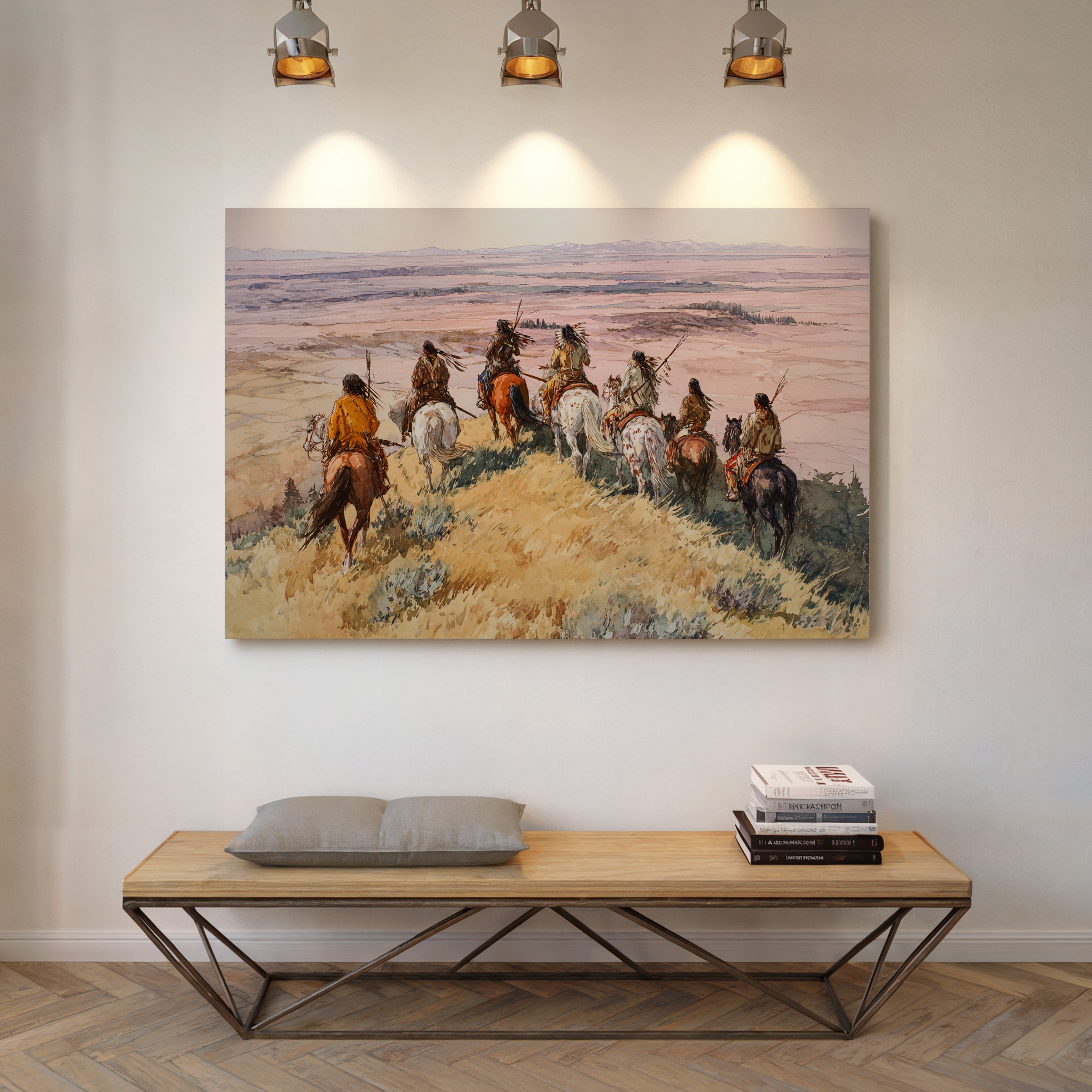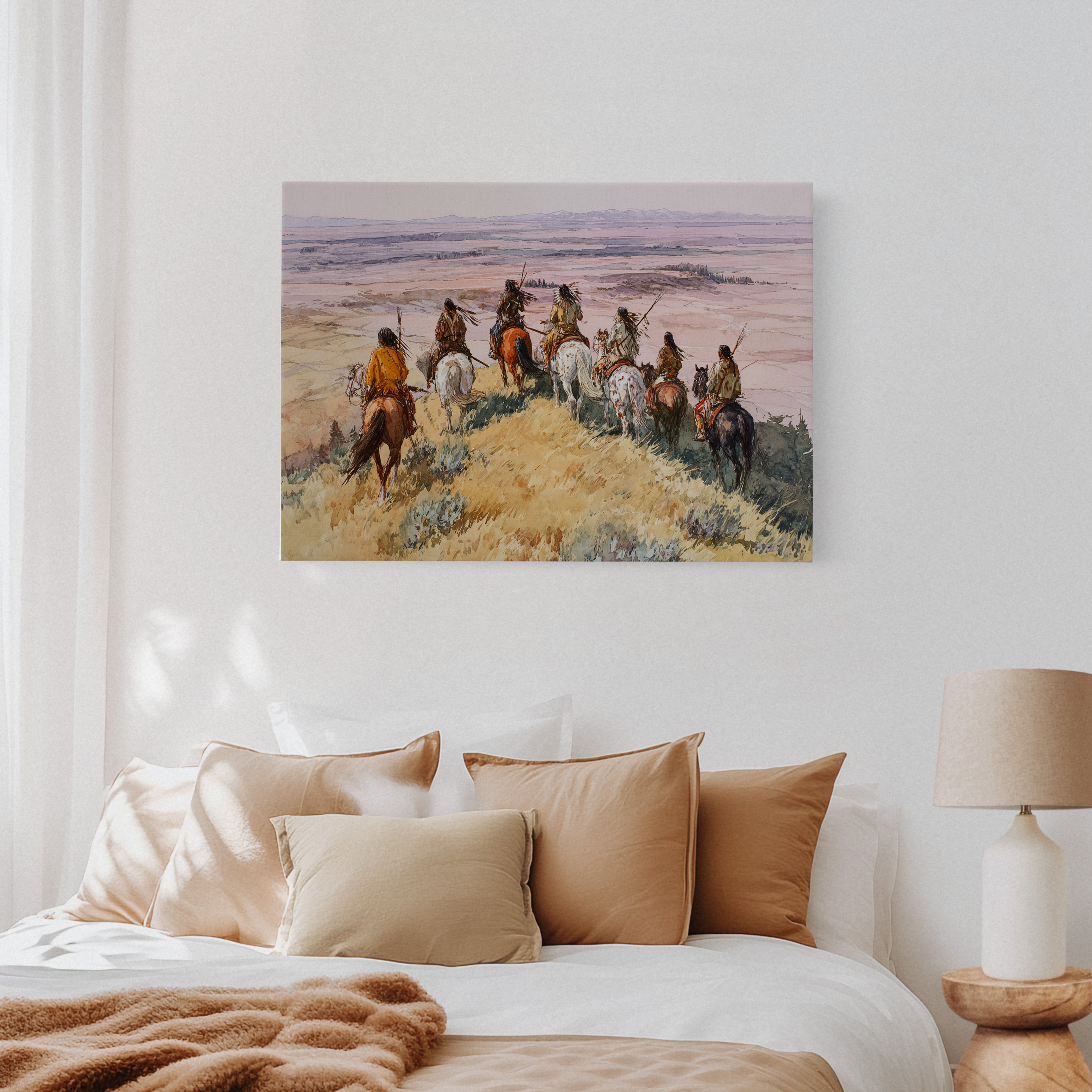 Atop sun-bleached grasslands, mounted figures pause along the ridgeline, their silhouettes stark against the vast horizon. Watercolor strokes capture the essence of movement - feathered headdresses dancing in the breeze, horses' manes catching the golden light. The landscape unfolds in gentle washes of amber and lavender, while distant mountains float like purple shadows at the edge of the plains. Each rider's form is rendered with careful detail, from the rich leather garments to the traditional regalia that speaks of heritage and ceremony. This piece would bring a profound sense of history and natural grandeur to a great room or study, where its panoramic composition can be fully appreciated.