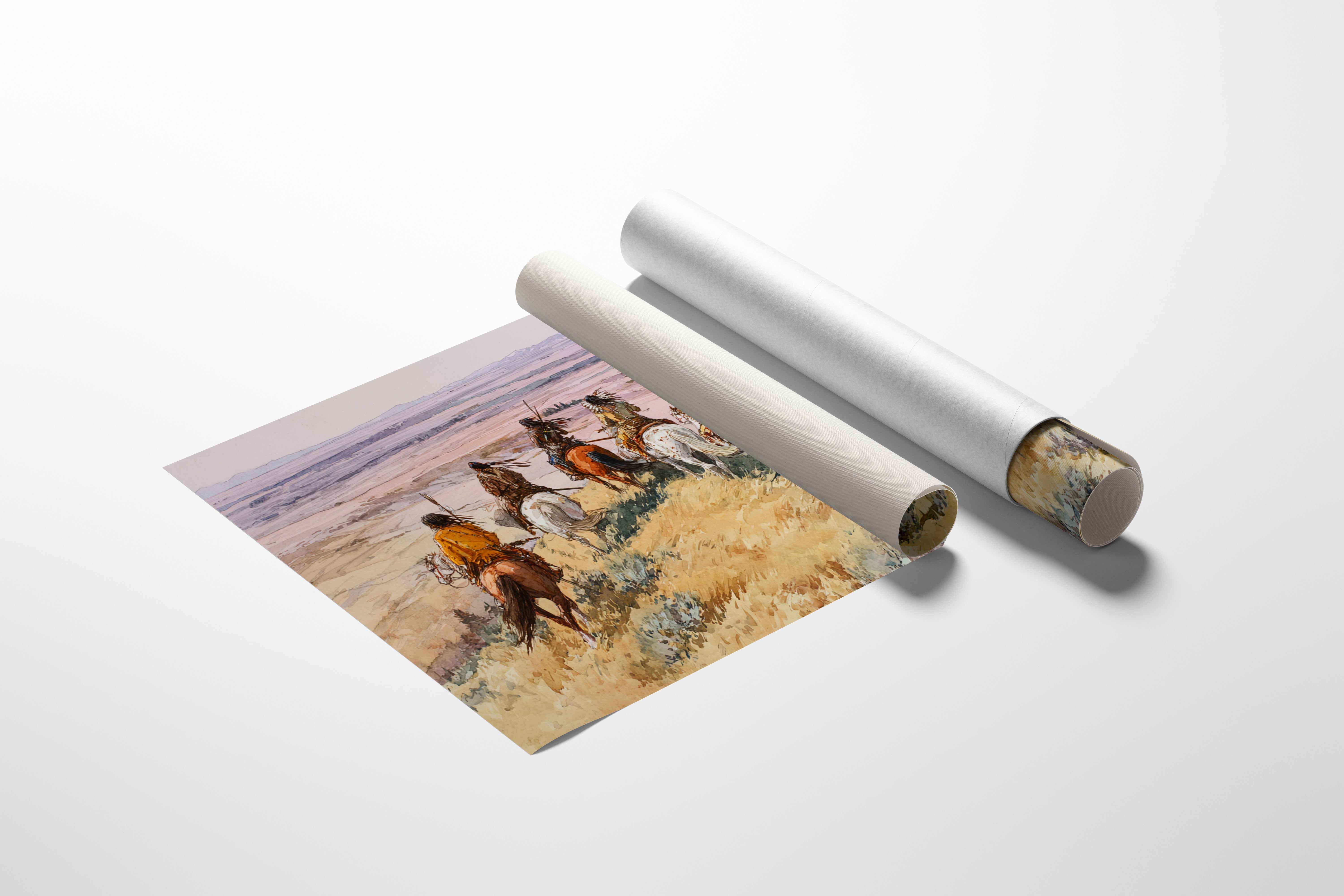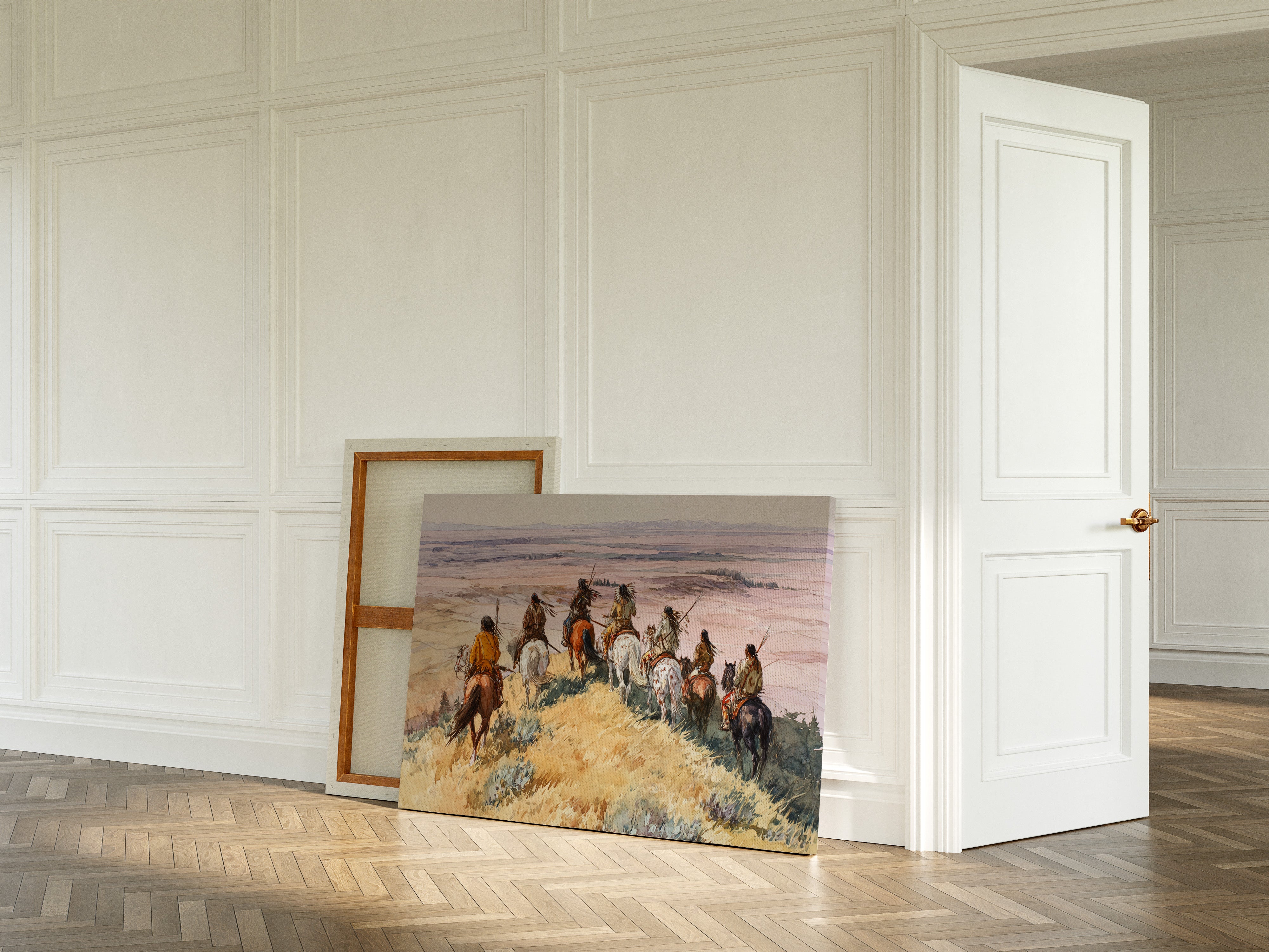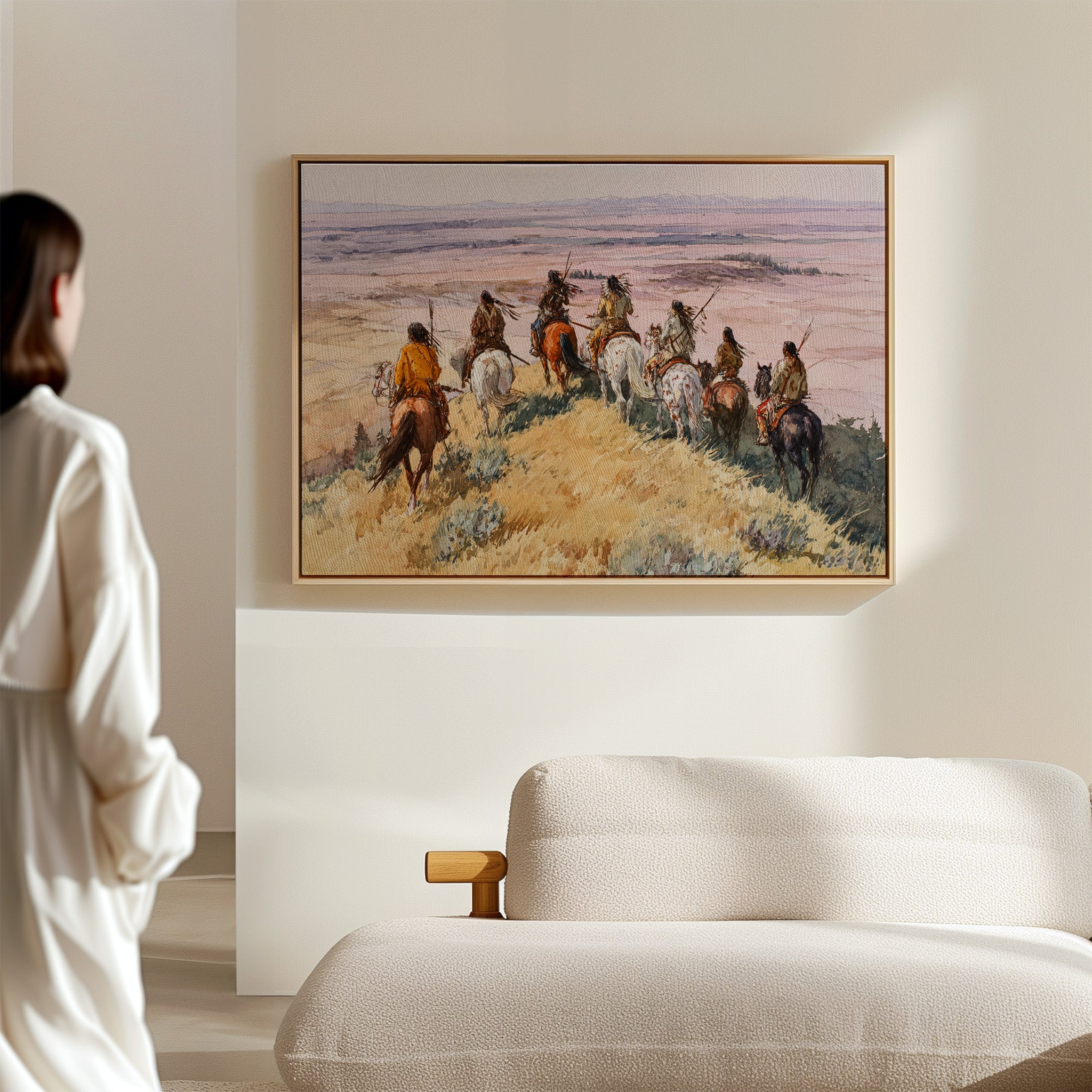 Atop sun-bleached grasslands, mounted figures pause along the ridgeline, their silhouettes stark against the vast horizon. Watercolor strokes capture the essence of movement - feathered headdresses dancing in the breeze, horses' manes catching the golden light. The landscape unfolds in gentle washes of amber and lavender, while distant mountains float like purple shadows at the edge of the plains. Each rider's form is rendered with careful detail, from the rich leather garments to the traditional regalia that speaks of heritage and ceremony. This piece would bring a profound sense of history and natural grandeur to a great room or study, where its panoramic composition can be fully appreciated.