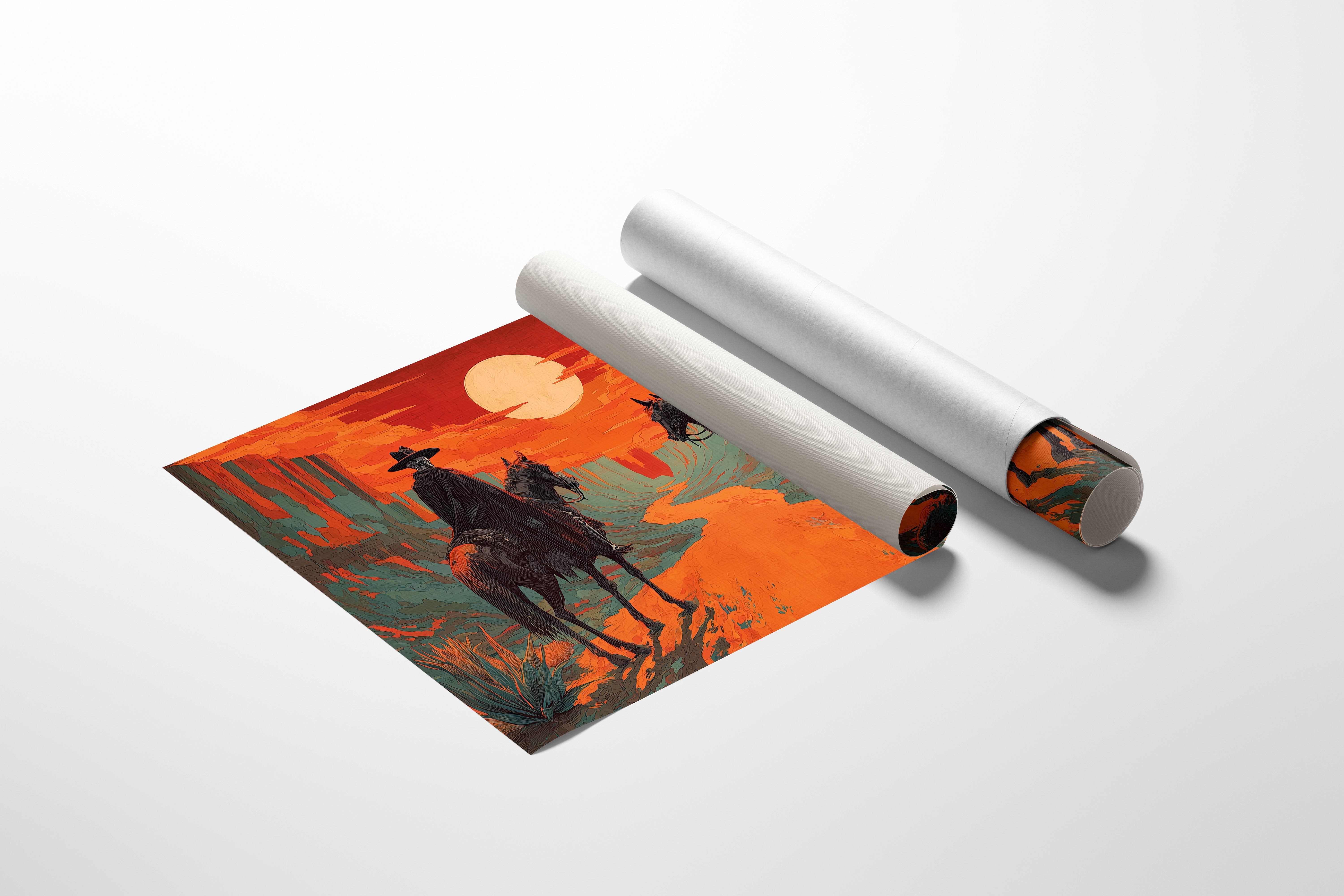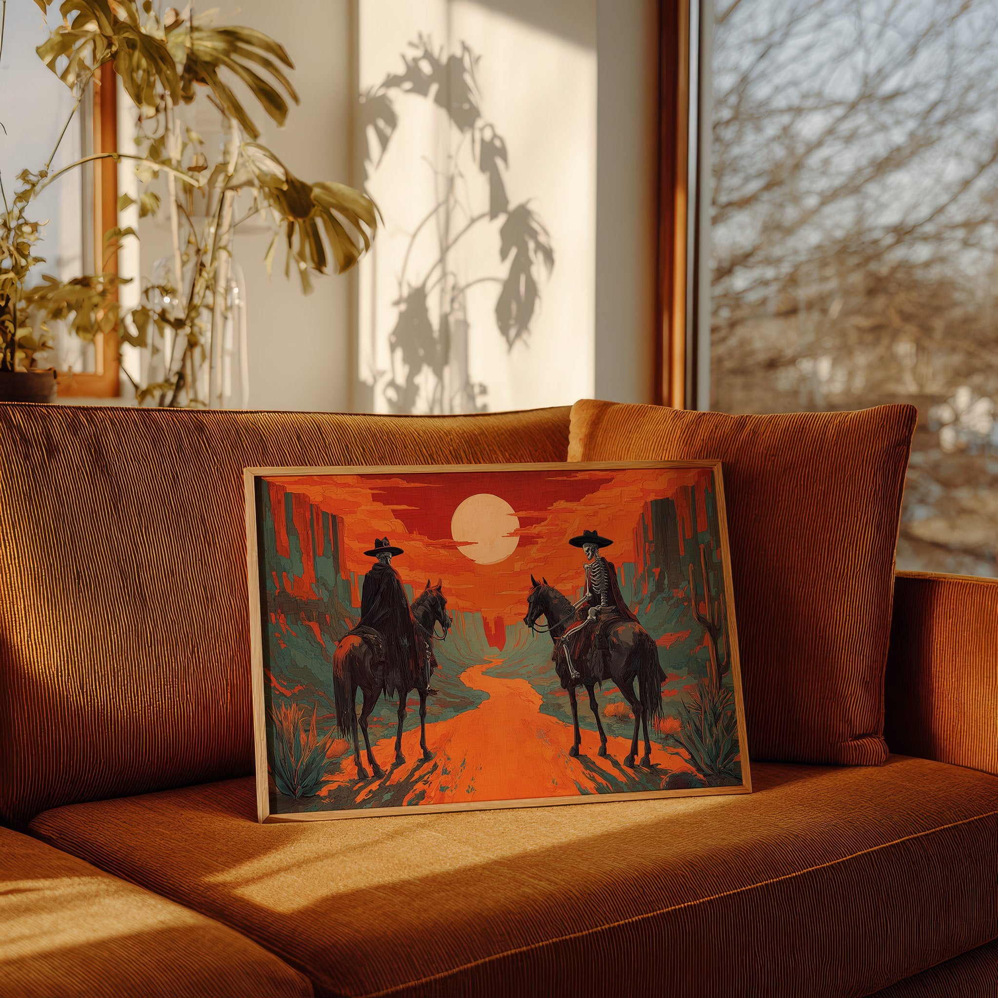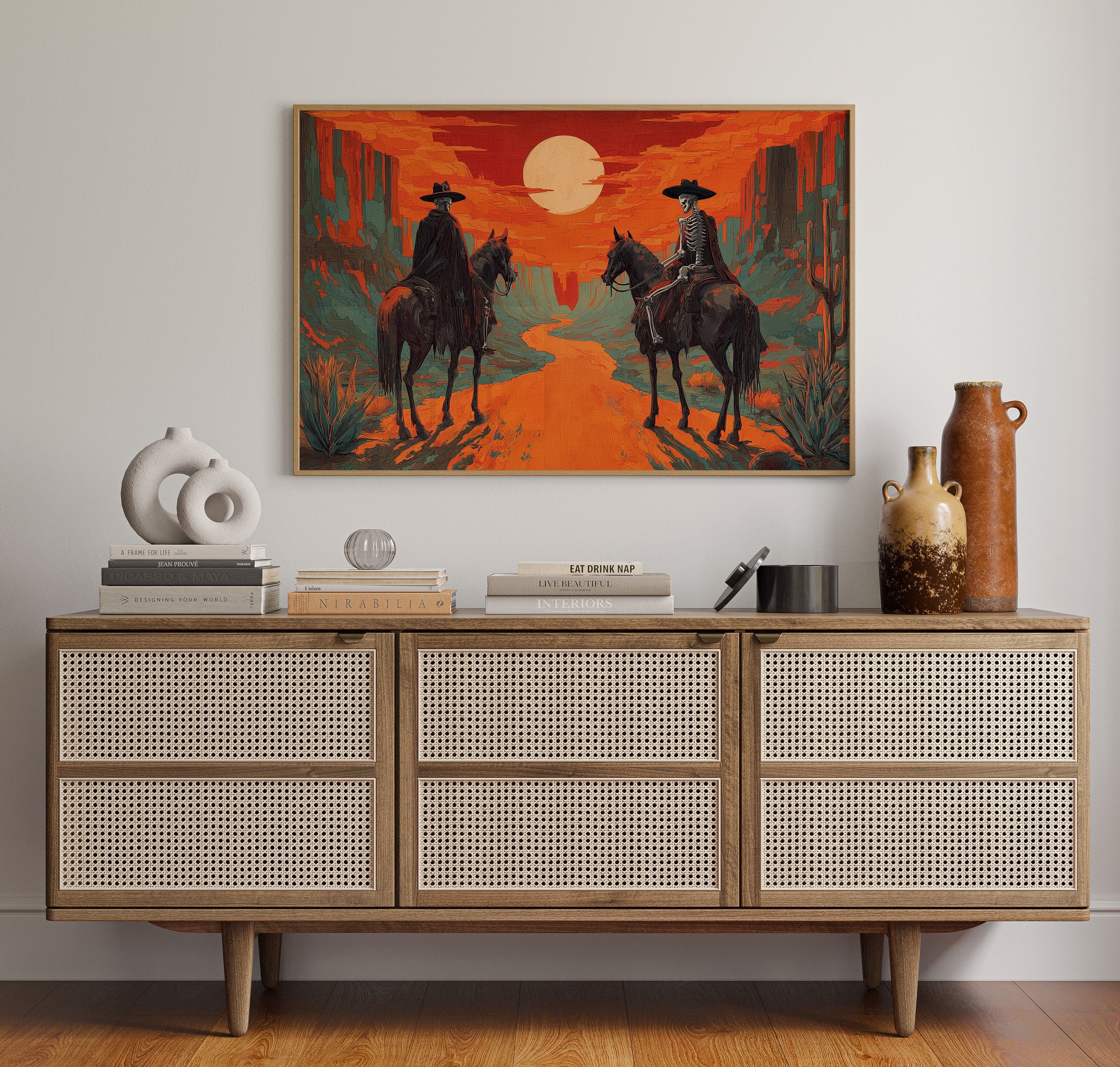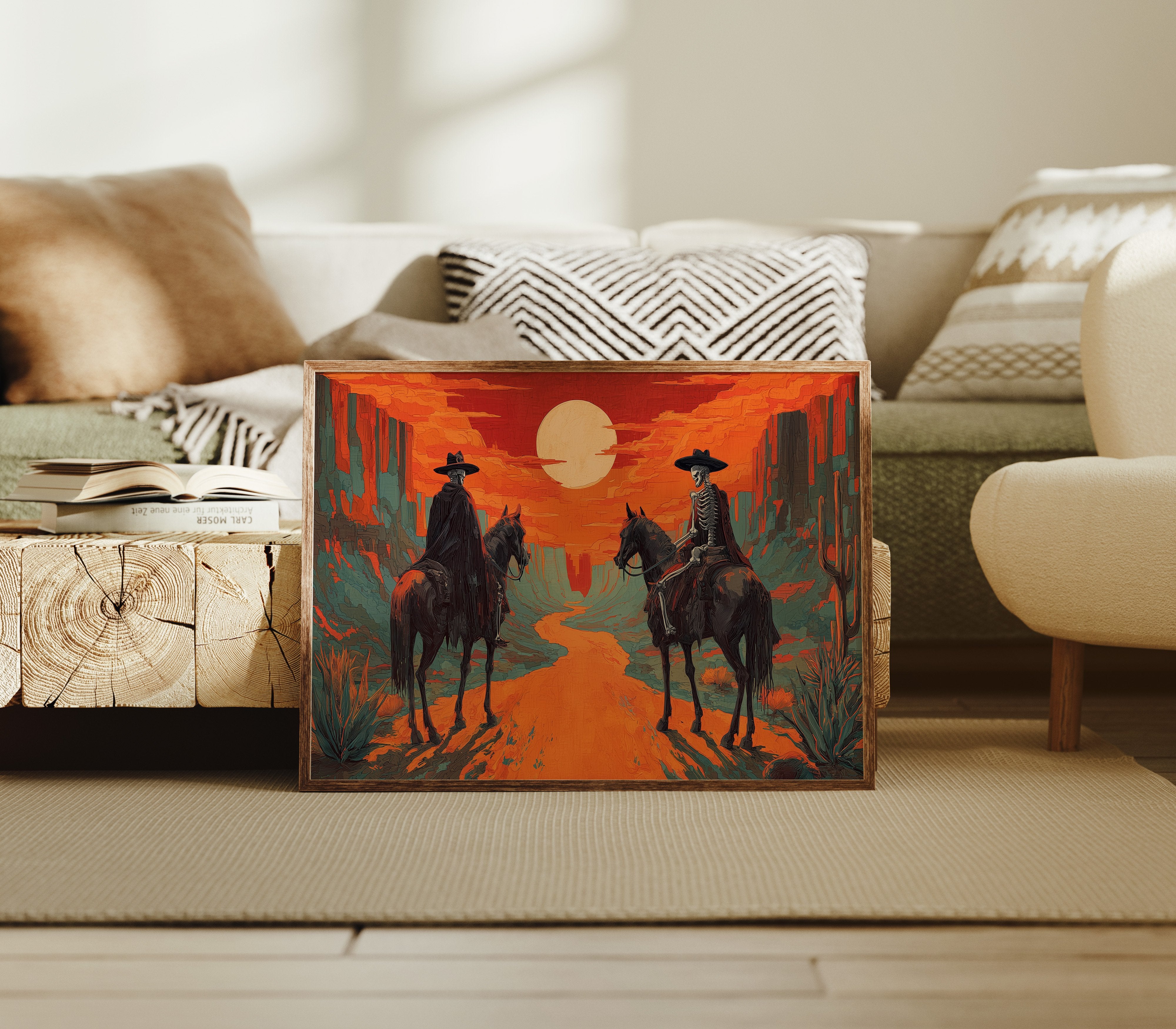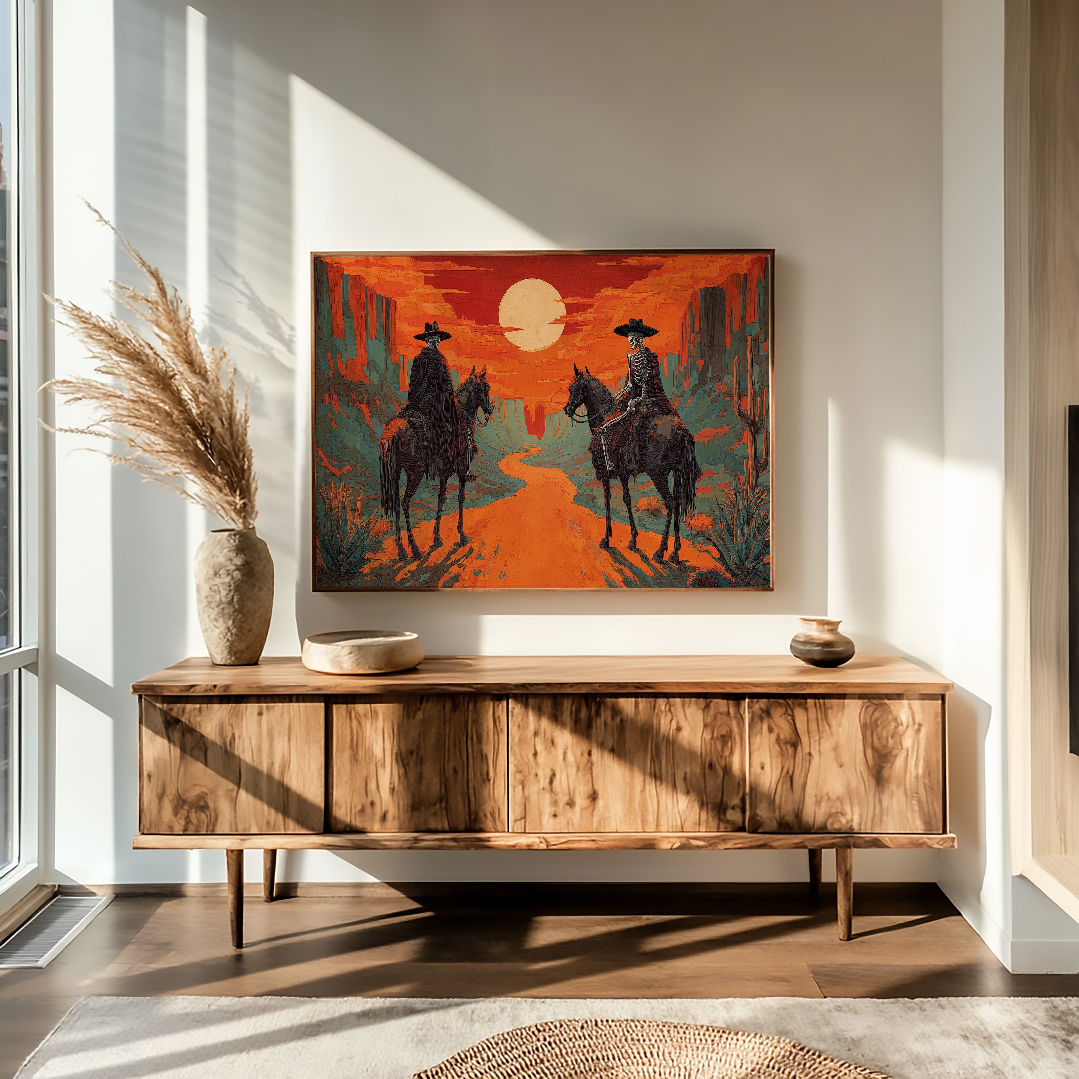 Heat radiates from the canvas as two silent figures on horseback converge where desert meets destiny. The fiery orange sky burns against teal canyon walls, creating a haunting dialogue between life and death as one rider appears skeletal against their shadowy companion. This bold southwestern narrative captures the mythical intersection of the mortal and eternal journey through an otherworldly landscape.