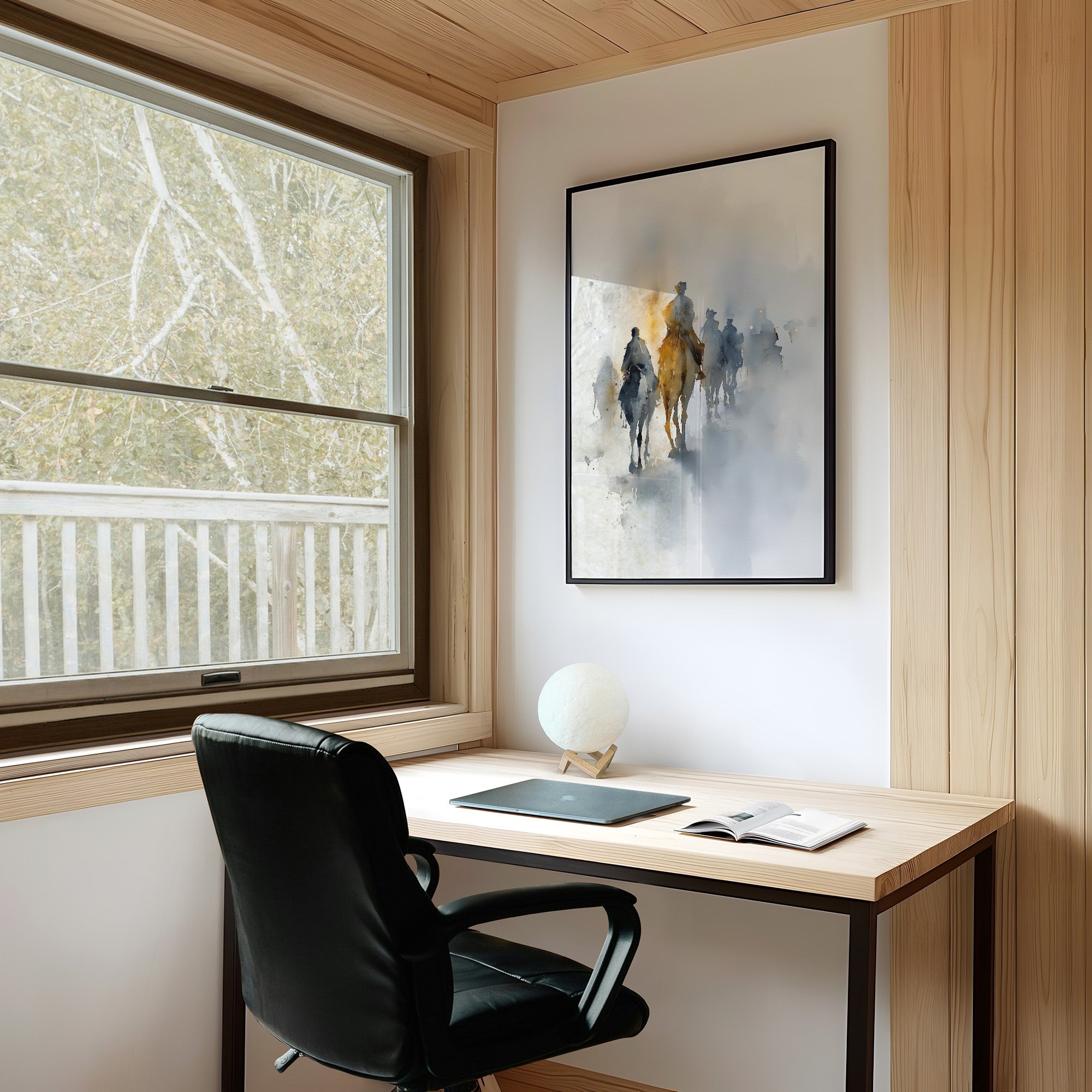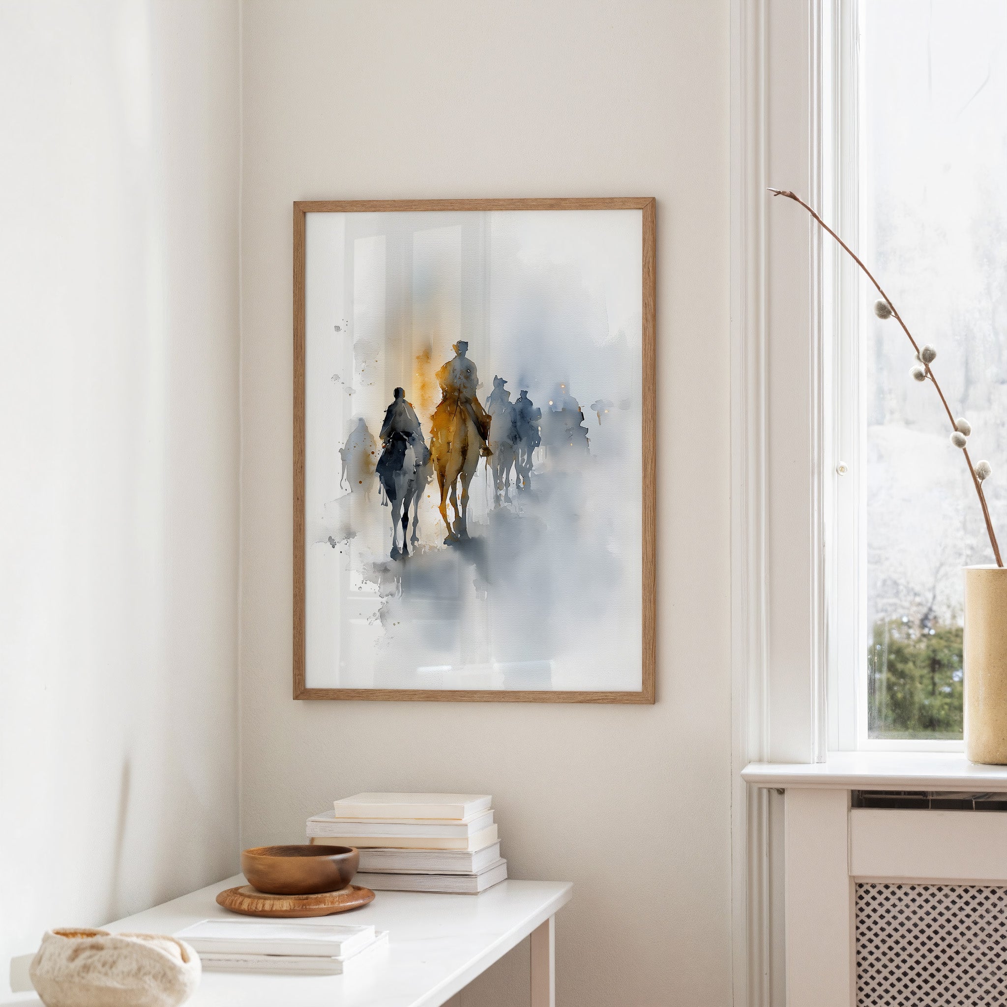 Figures emerge from watercolor mist, their forms barely tethered to reality. The amber-hued rider leads a procession through fog, each silhouette dissolving at its edges where pigment meets paper. The delicate brushstrokes capture movement and mystery, blending blues and golds that speak of dawn journeys and distant horizons.