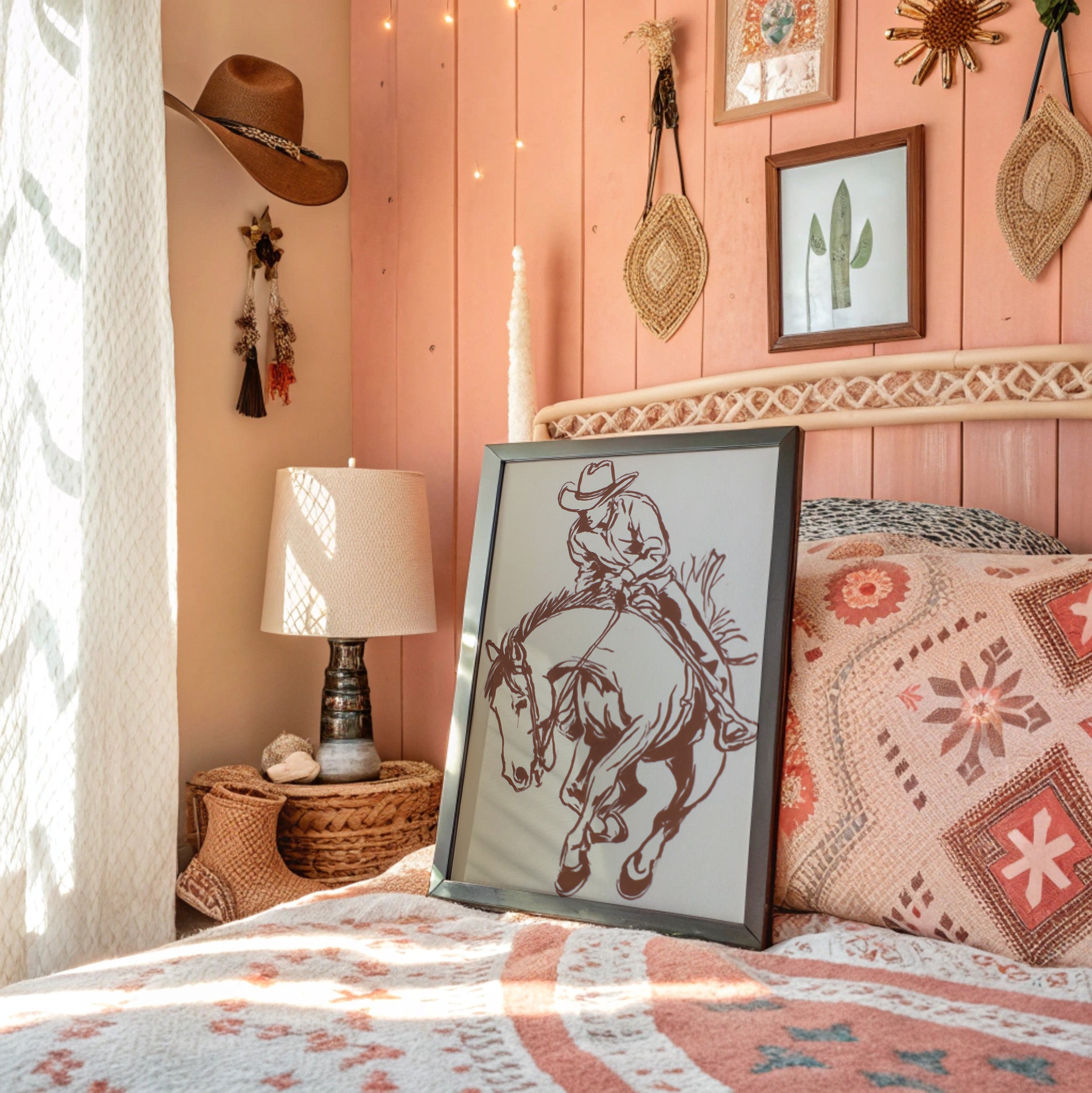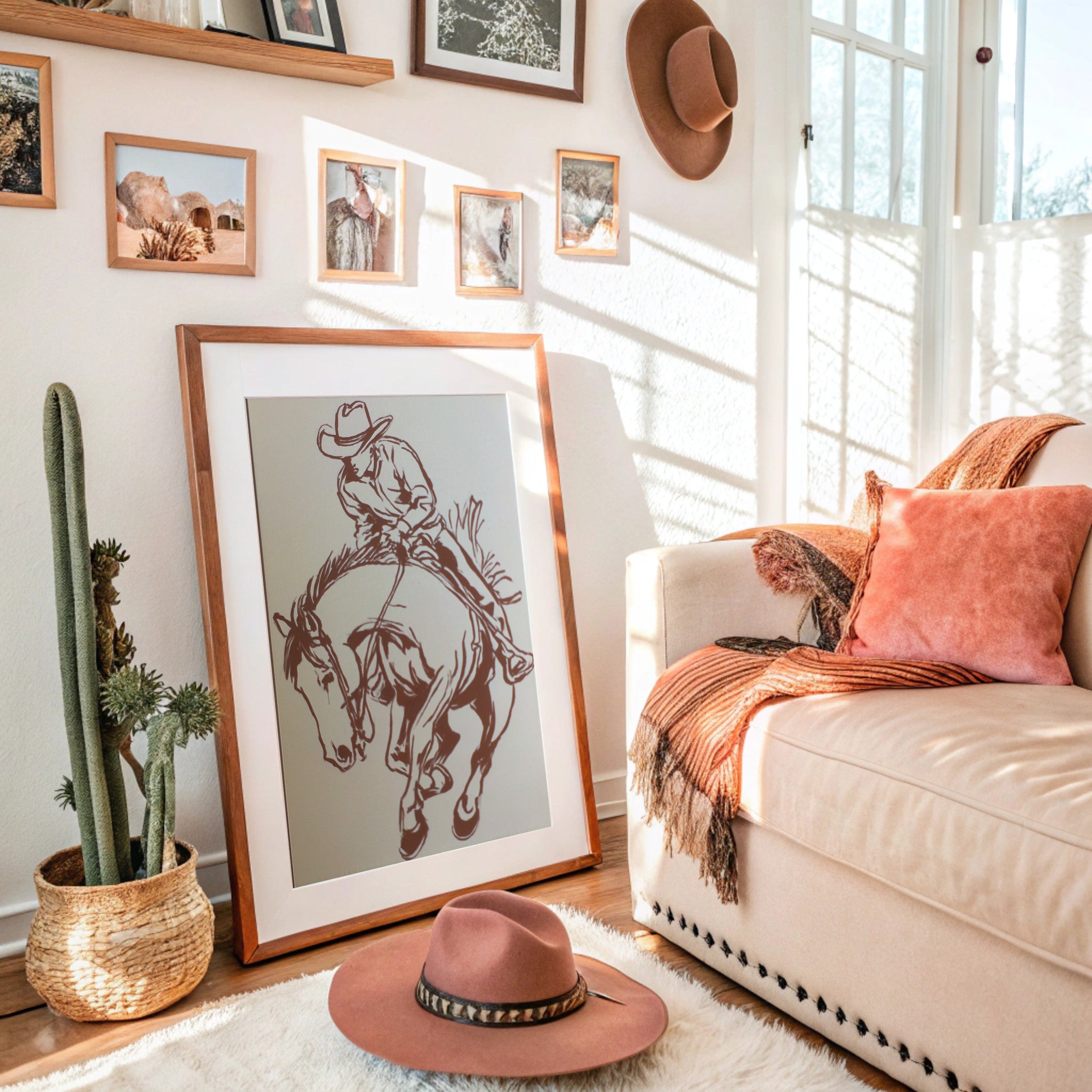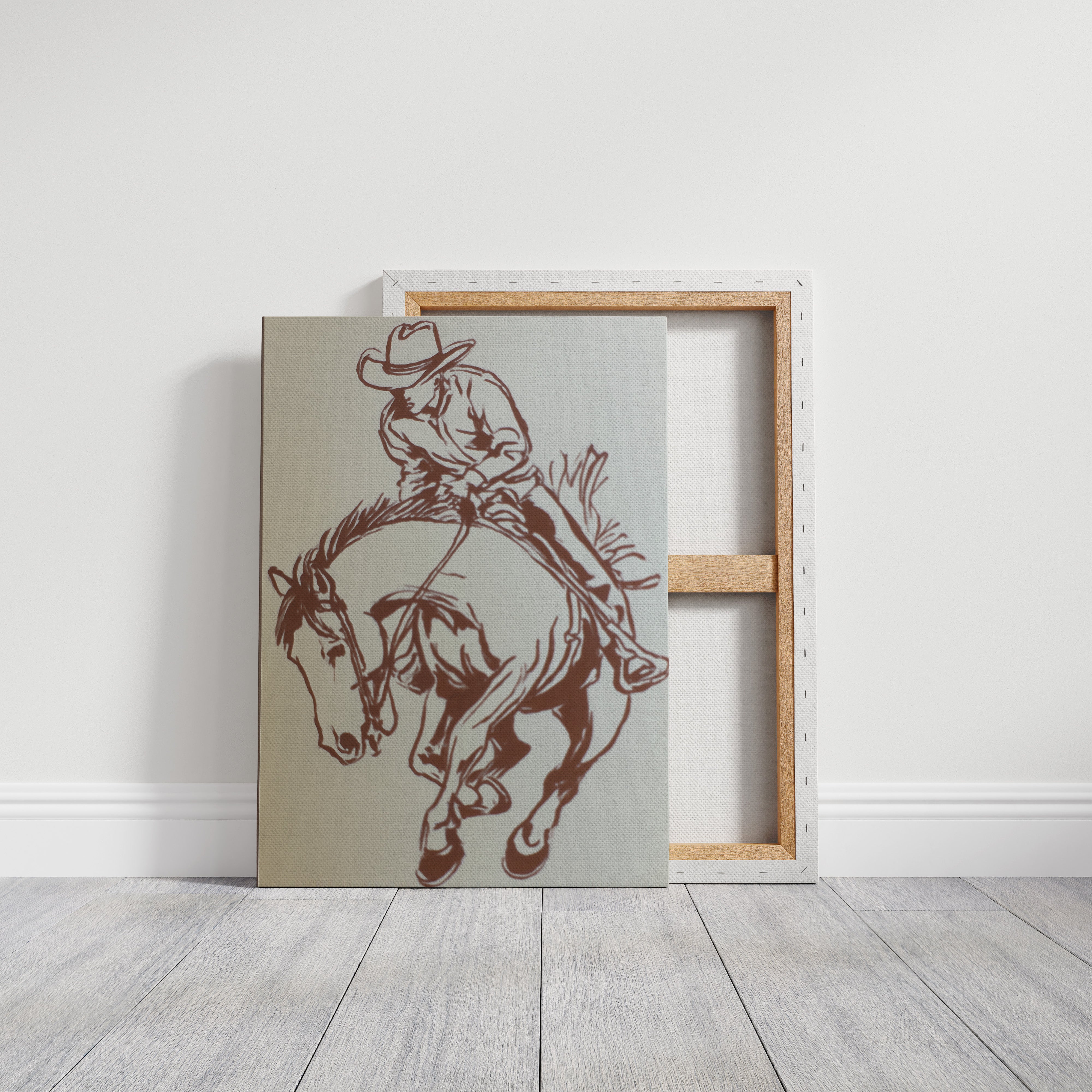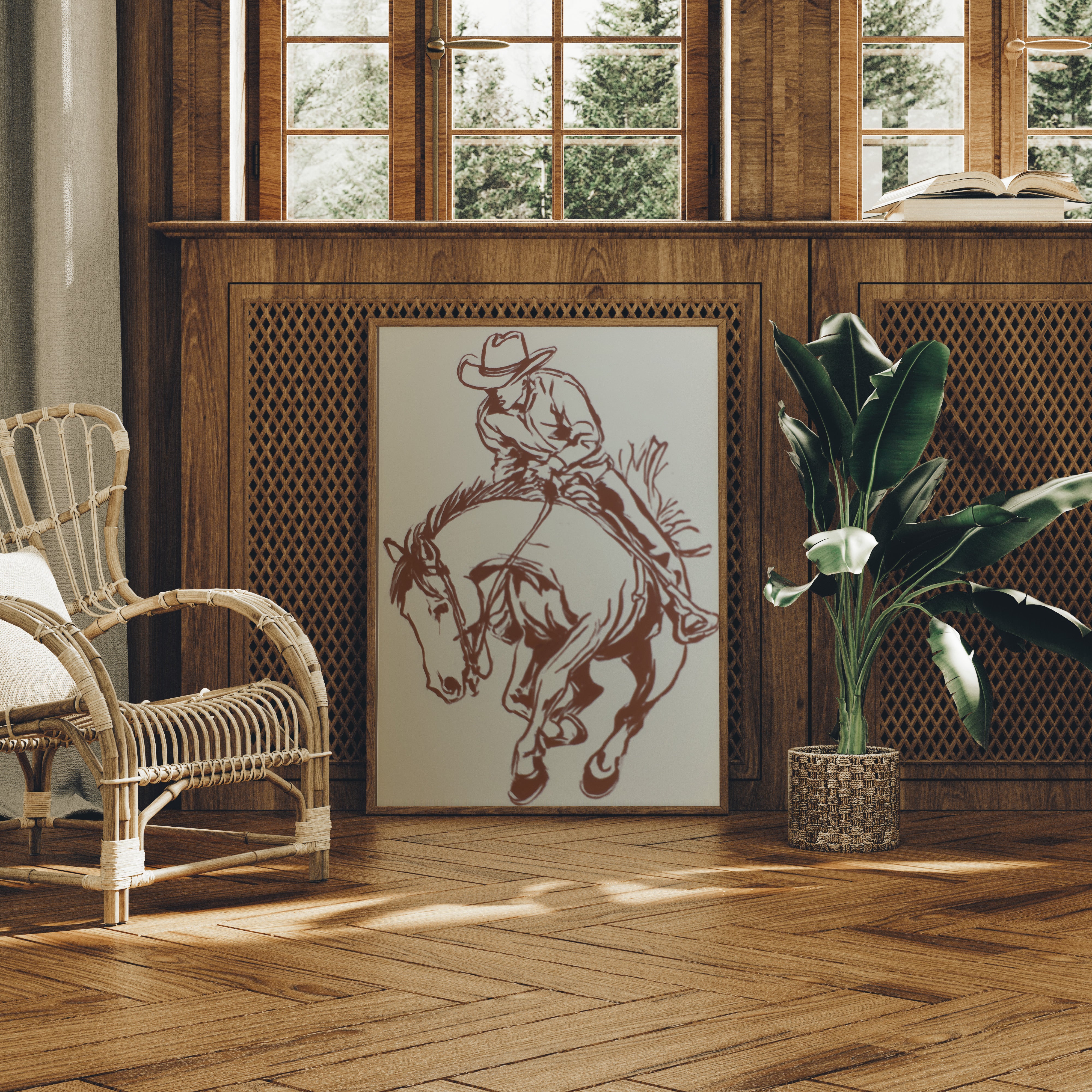 A moment suspended in time, where man and beast unite in a dance of wild energy. This piece embodies the spirit of contemporary artistry, capturing the raw essence of motion and connection. The bold strokes and earthy tones convey a sense of urgency and vitality, as the rider grips the reins with determination, and the horse propels forward with untamed grace. Ideal for a rustic living room or an inspiring workspace, this artwork invites a sense of adventure into any setting. Let it remind you of the exhilarating freedom found in the heart of nature.