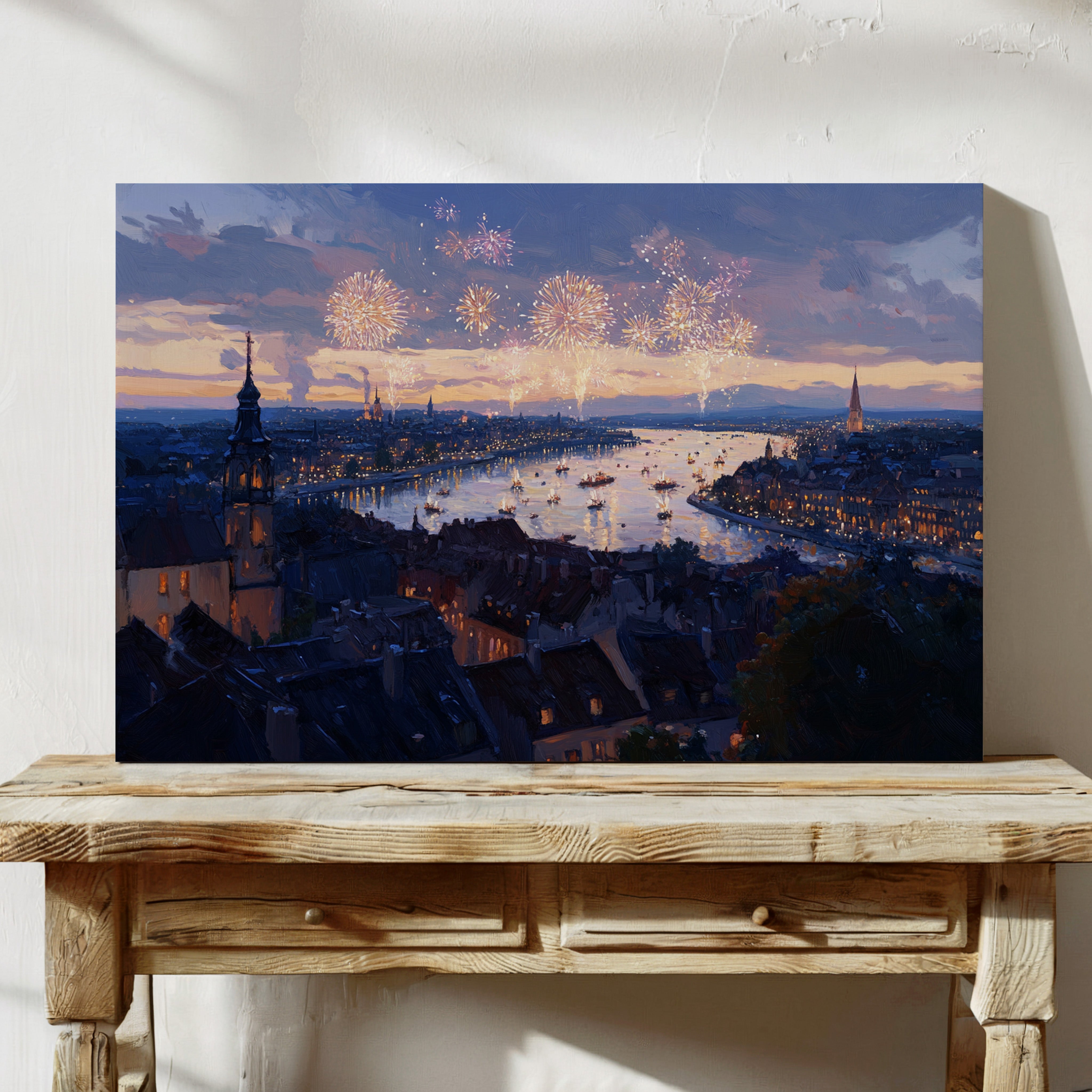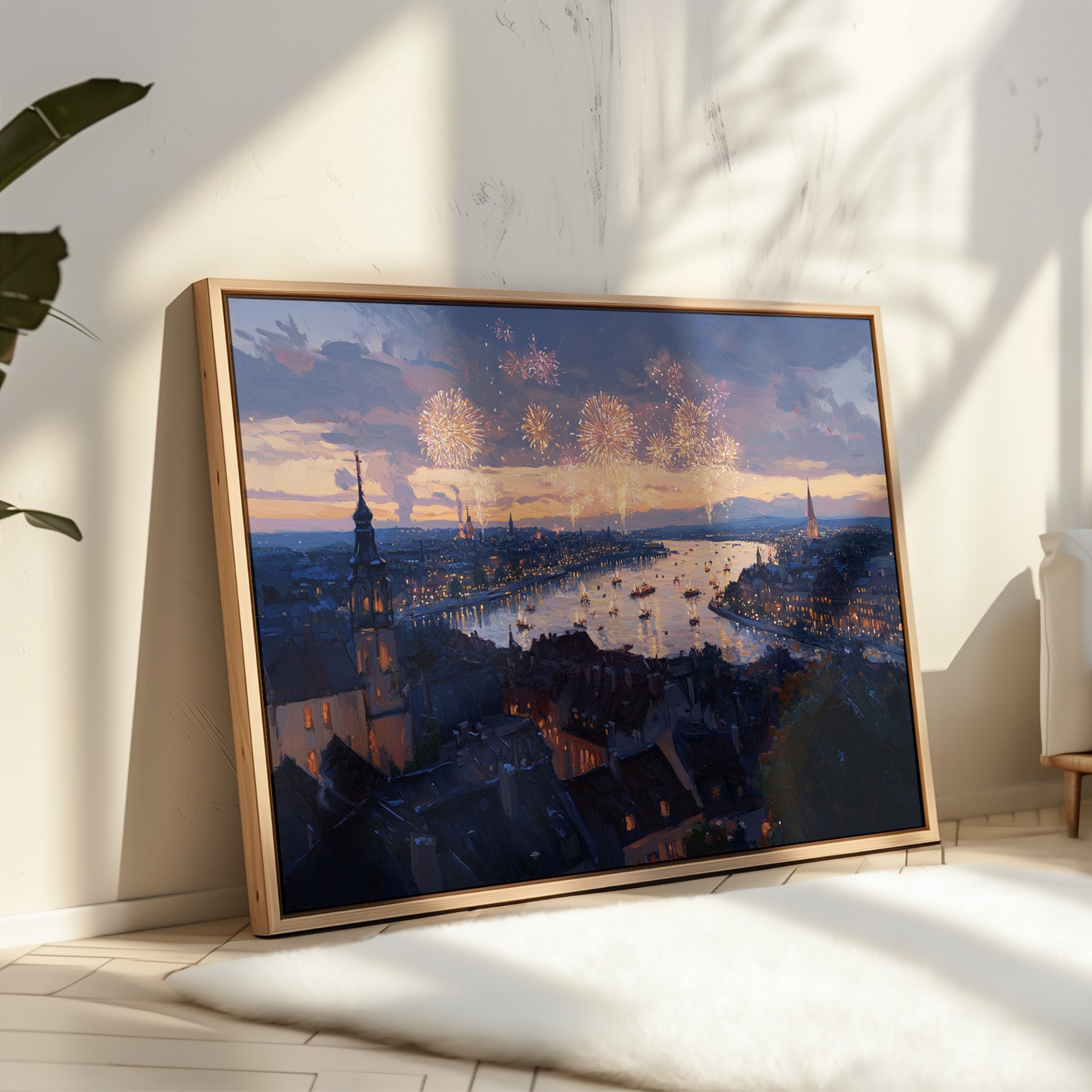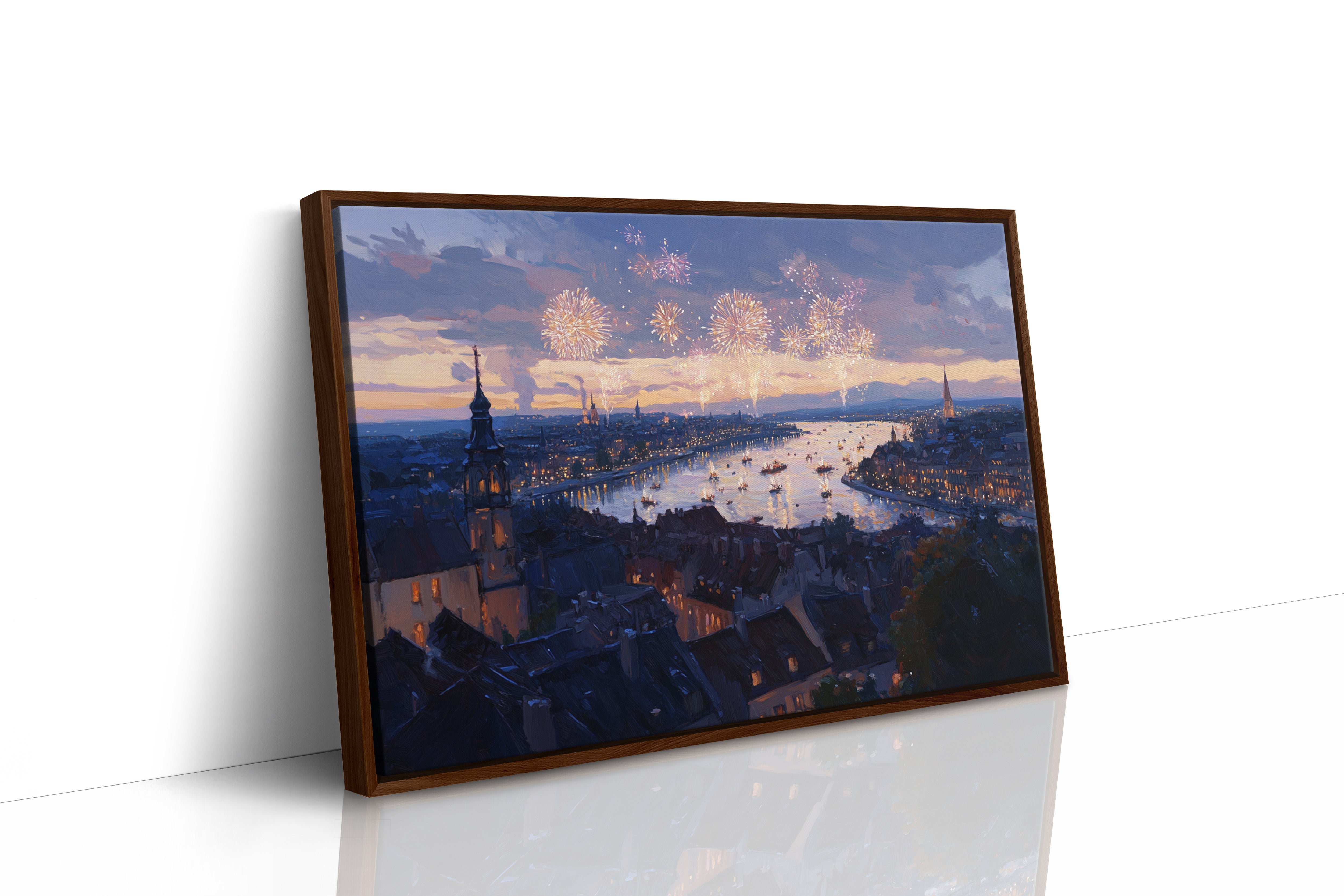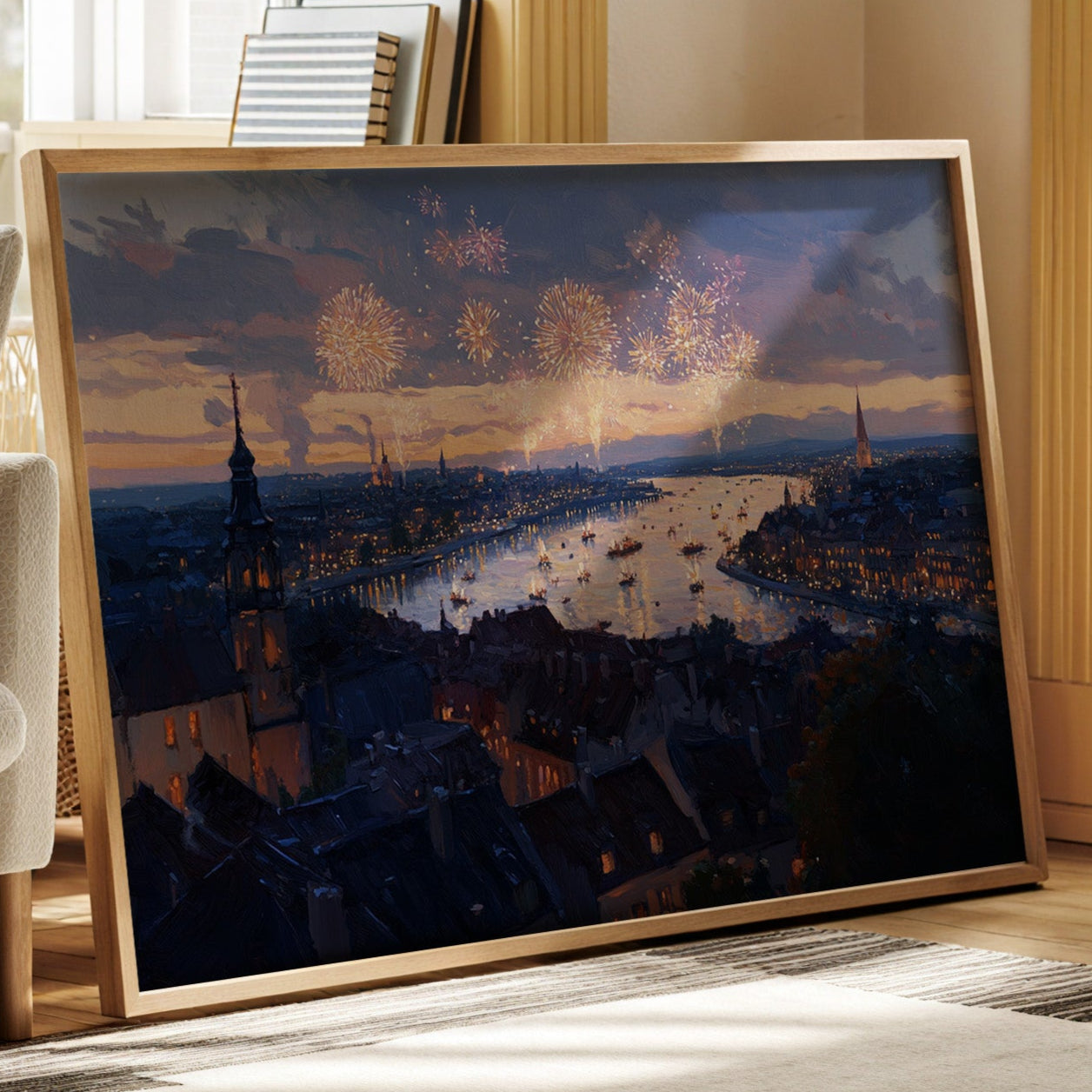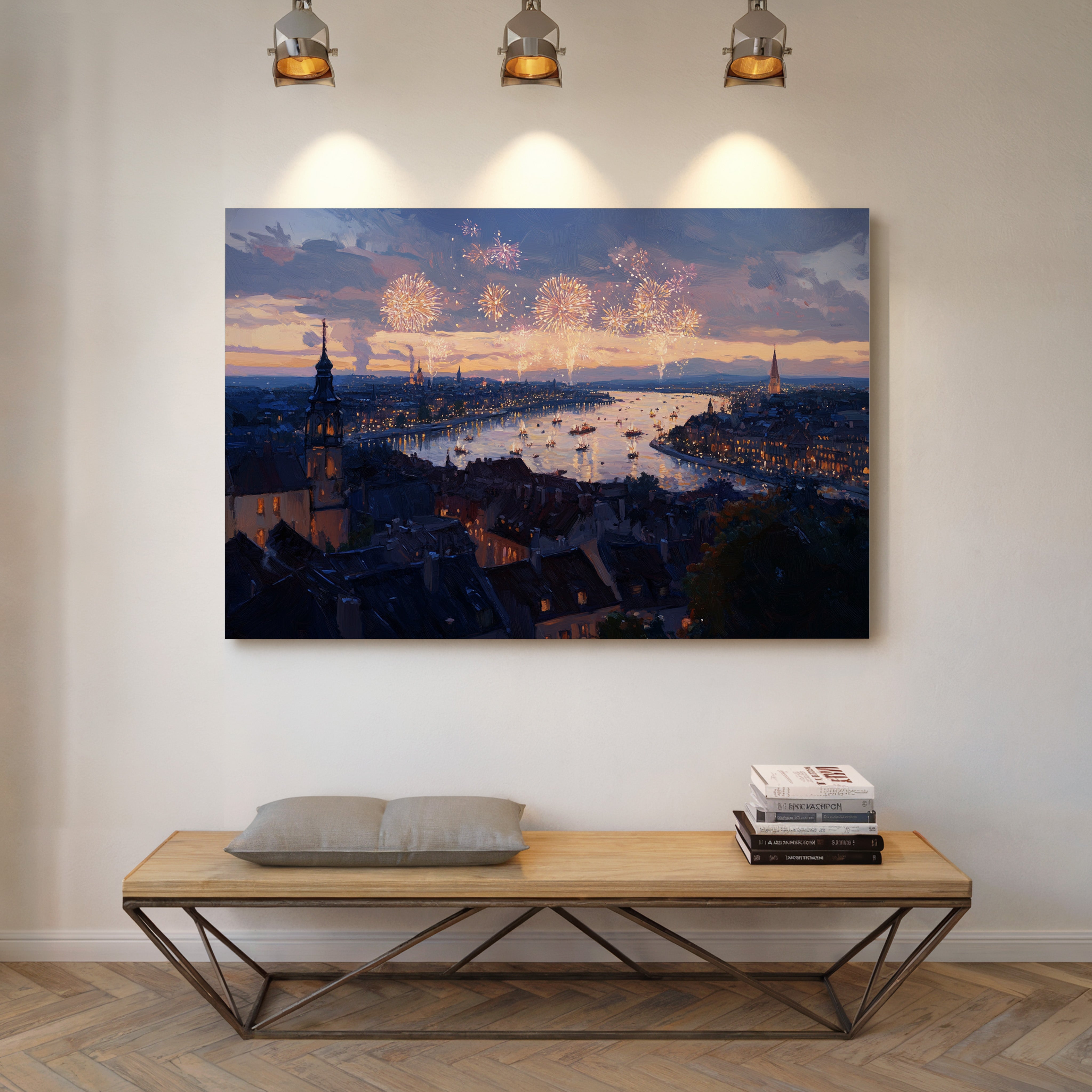 Fireworks paint the twilight sky with bursts of golden light, their reflections dancing across the tranquil river below. The historic cityscape unfolds like a storybook, with gothic spires and warm-lit windows creating a tapestry of old-world charm against the dusky horizon. Boats dot the gleaming waterway, their lanterns twinkling like earthbound stars while church steeples stand sentinel over centuries-old rooftops. This piece captures the magical moment when day surrenders to night, and celebration transforms a timeless city into a canvas of light and wonder. Perfect for adding a touch of European romance and architectural grandeur to a living room or study where stories of far-off places inspire dreams of adventure.