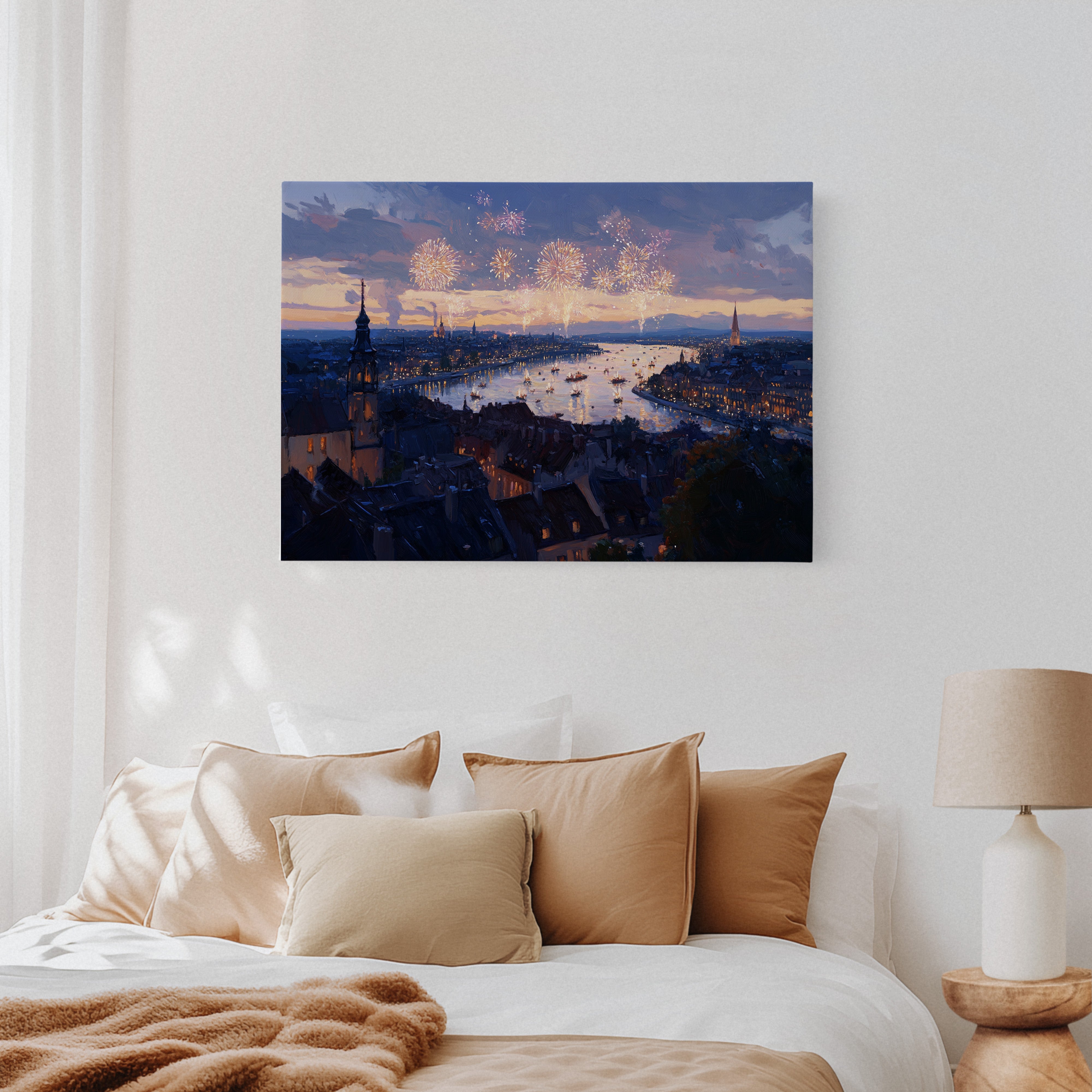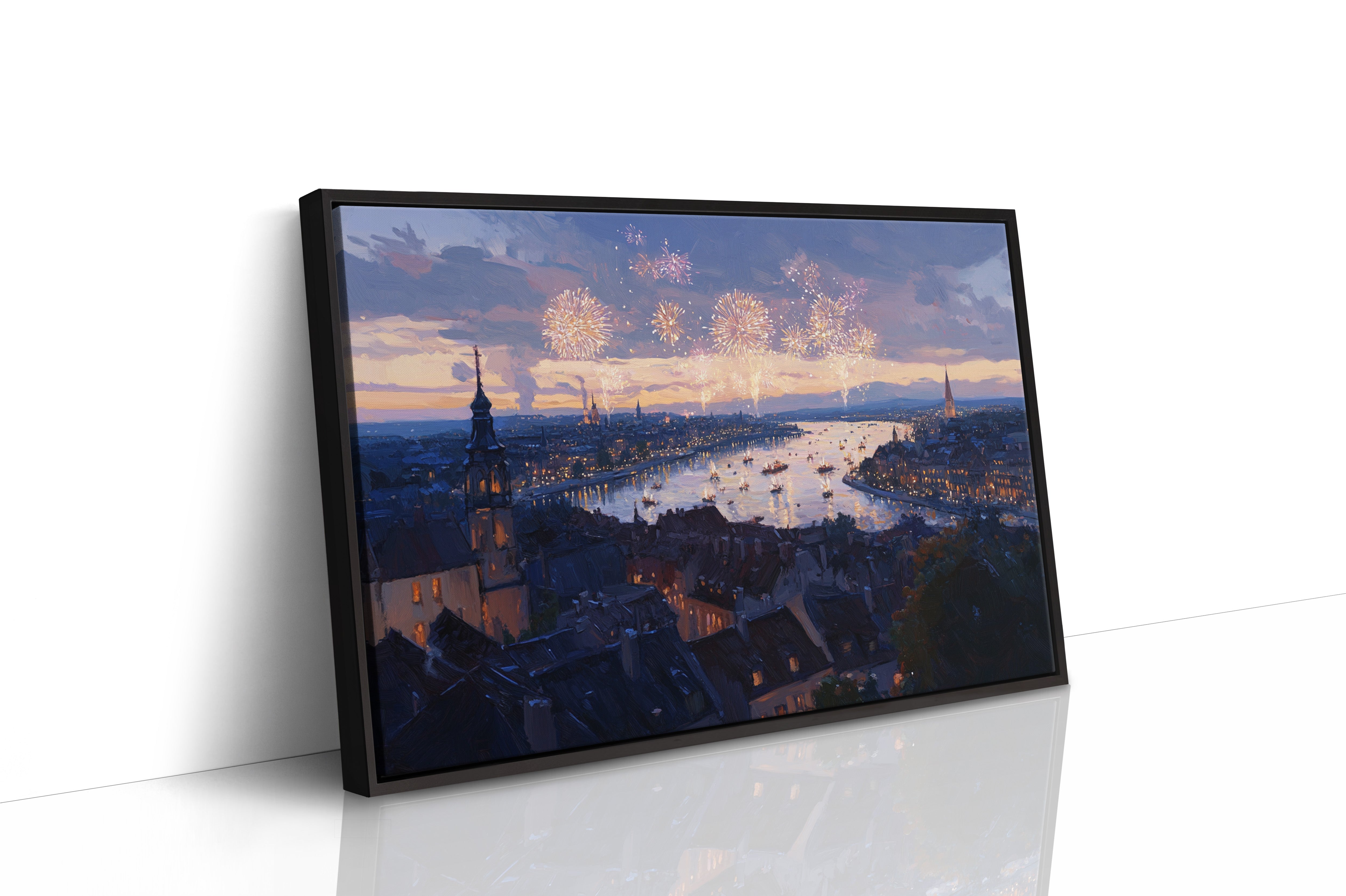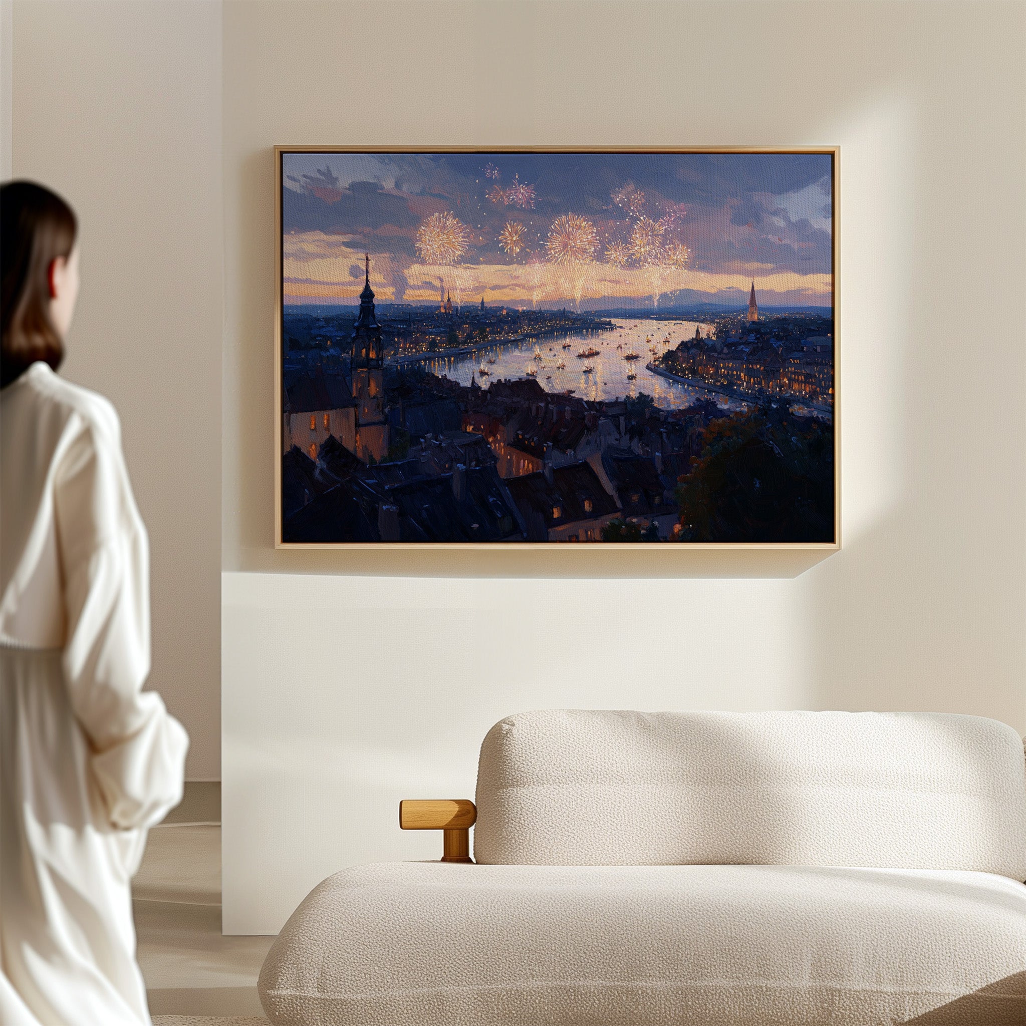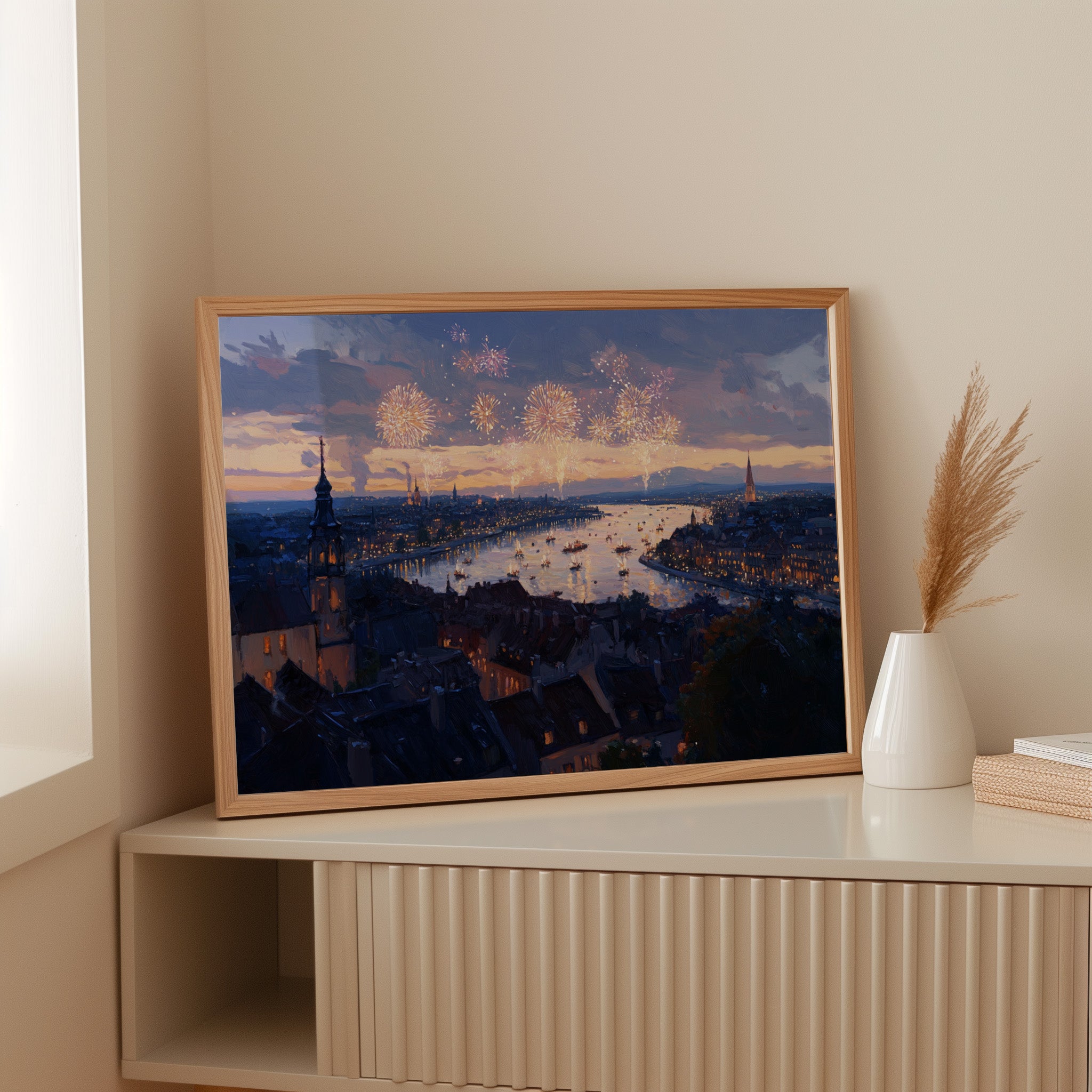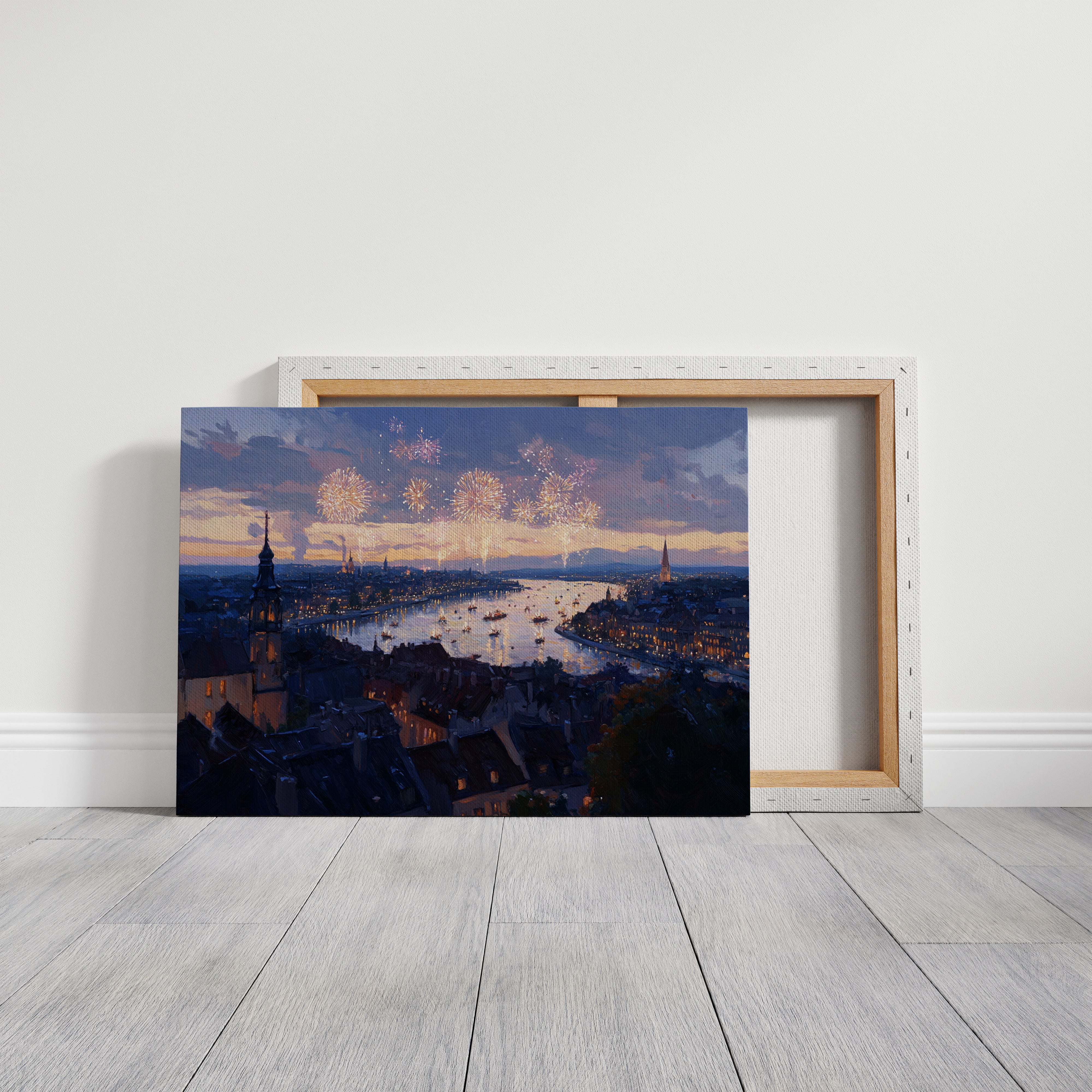 Fireworks paint the twilight sky with bursts of golden light, their reflections dancing across the tranquil river below. The historic cityscape unfolds like a storybook, with gothic spires and warm-lit windows creating a tapestry of old-world charm against the dusky horizon. Boats dot the gleaming waterway, their lanterns twinkling like earthbound stars while church steeples stand sentinel over centuries-old rooftops. This piece captures the magical moment when day surrenders to night, and celebration transforms a timeless city into a canvas of light and wonder. Perfect for adding a touch of European romance and architectural grandeur to a living room or study where stories of far-off places inspire dreams of adventure.