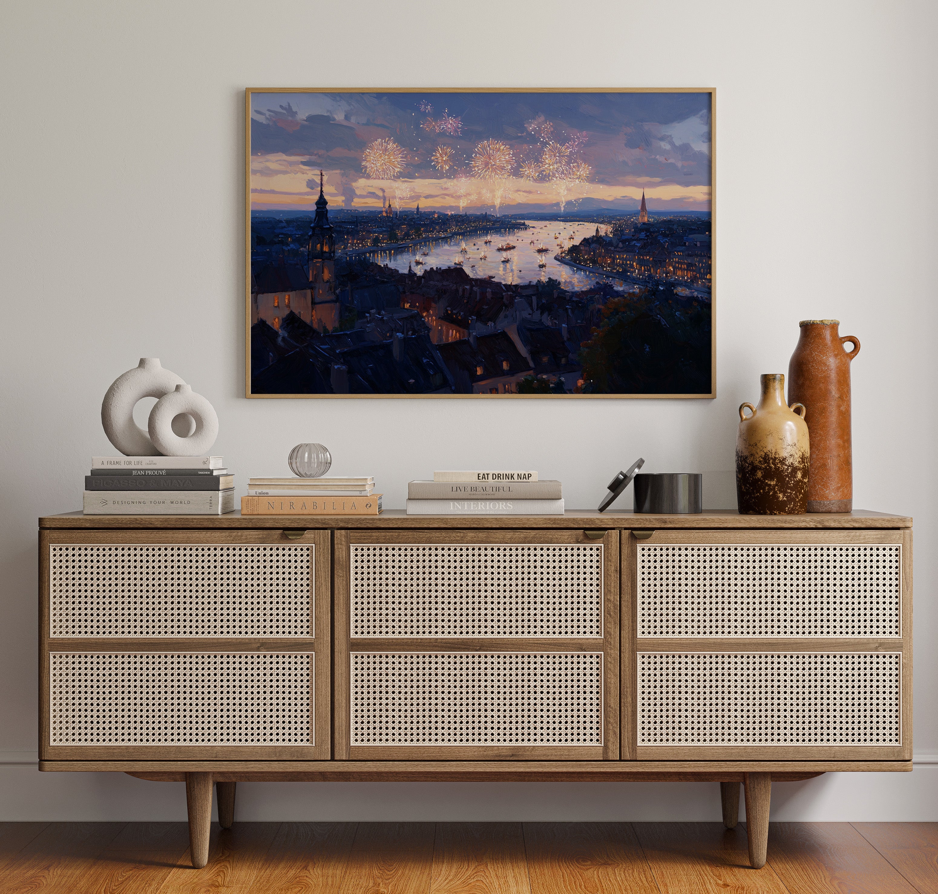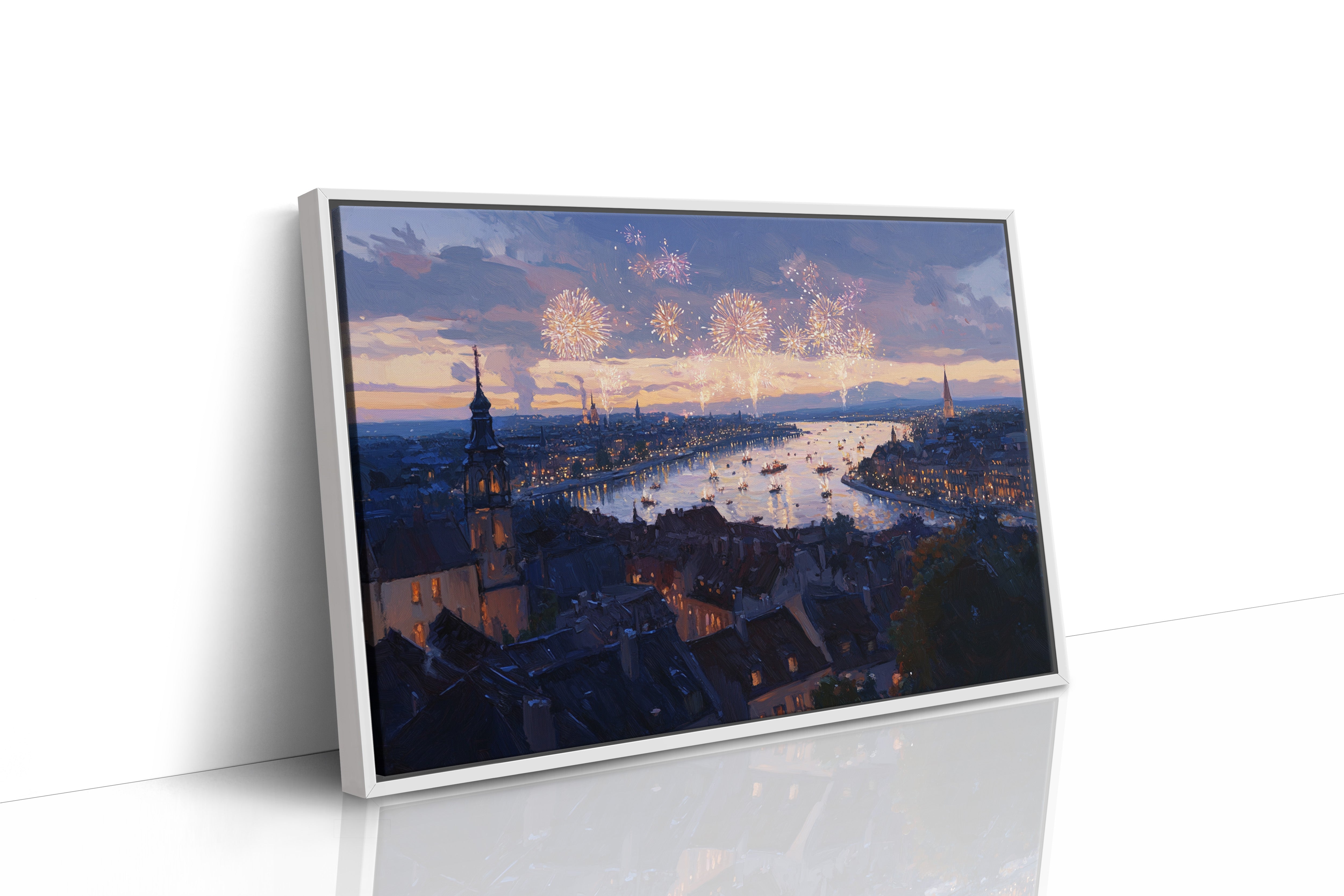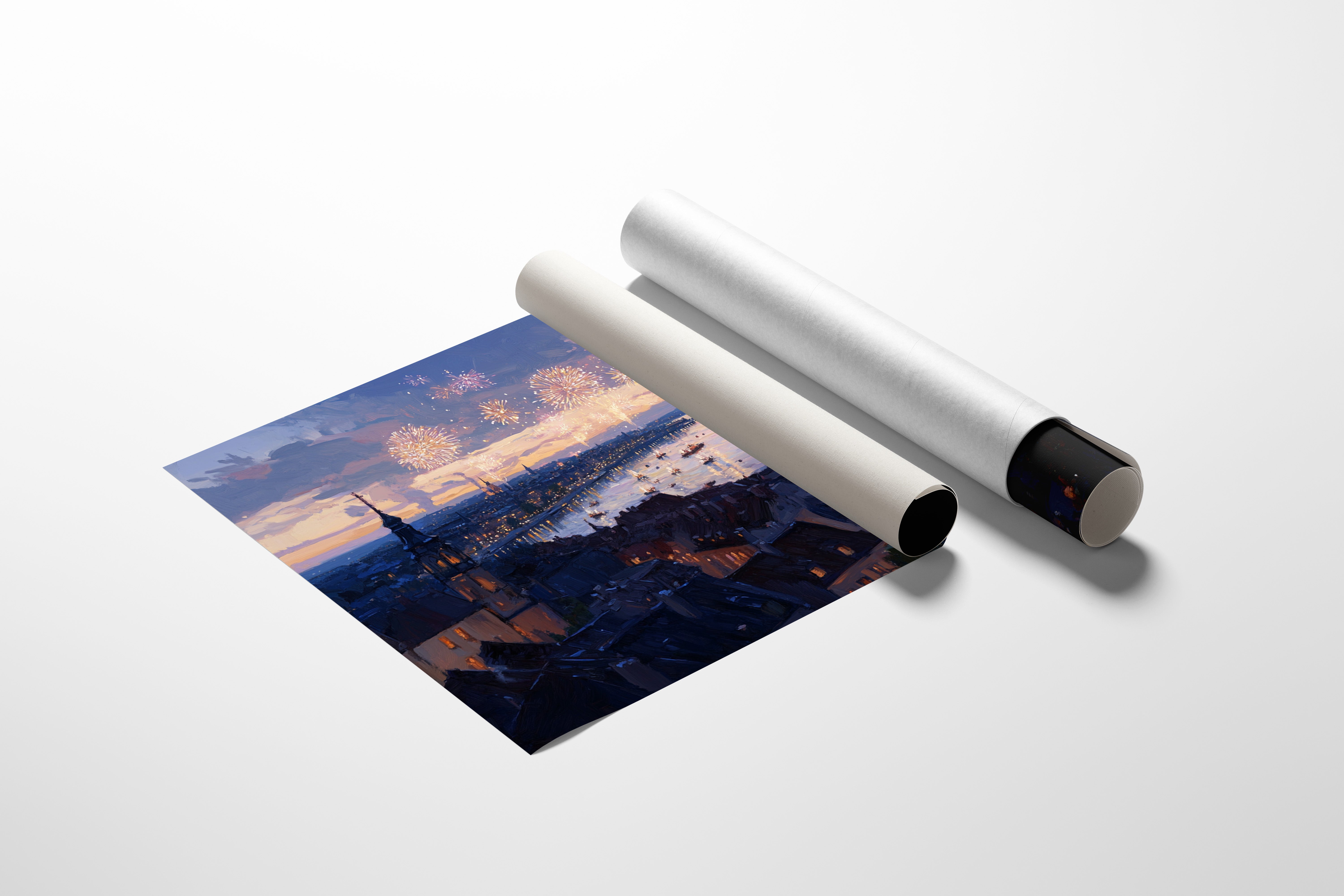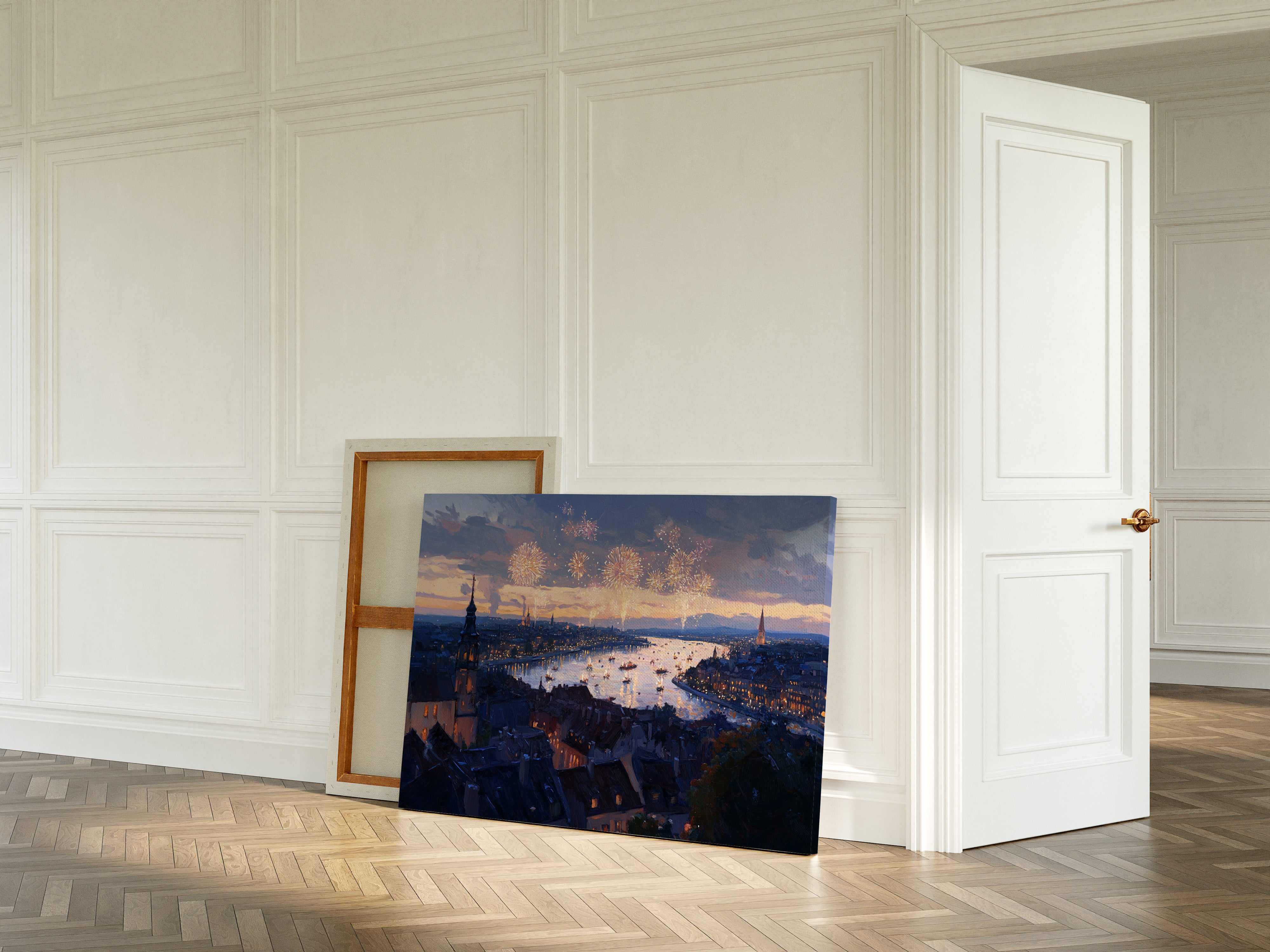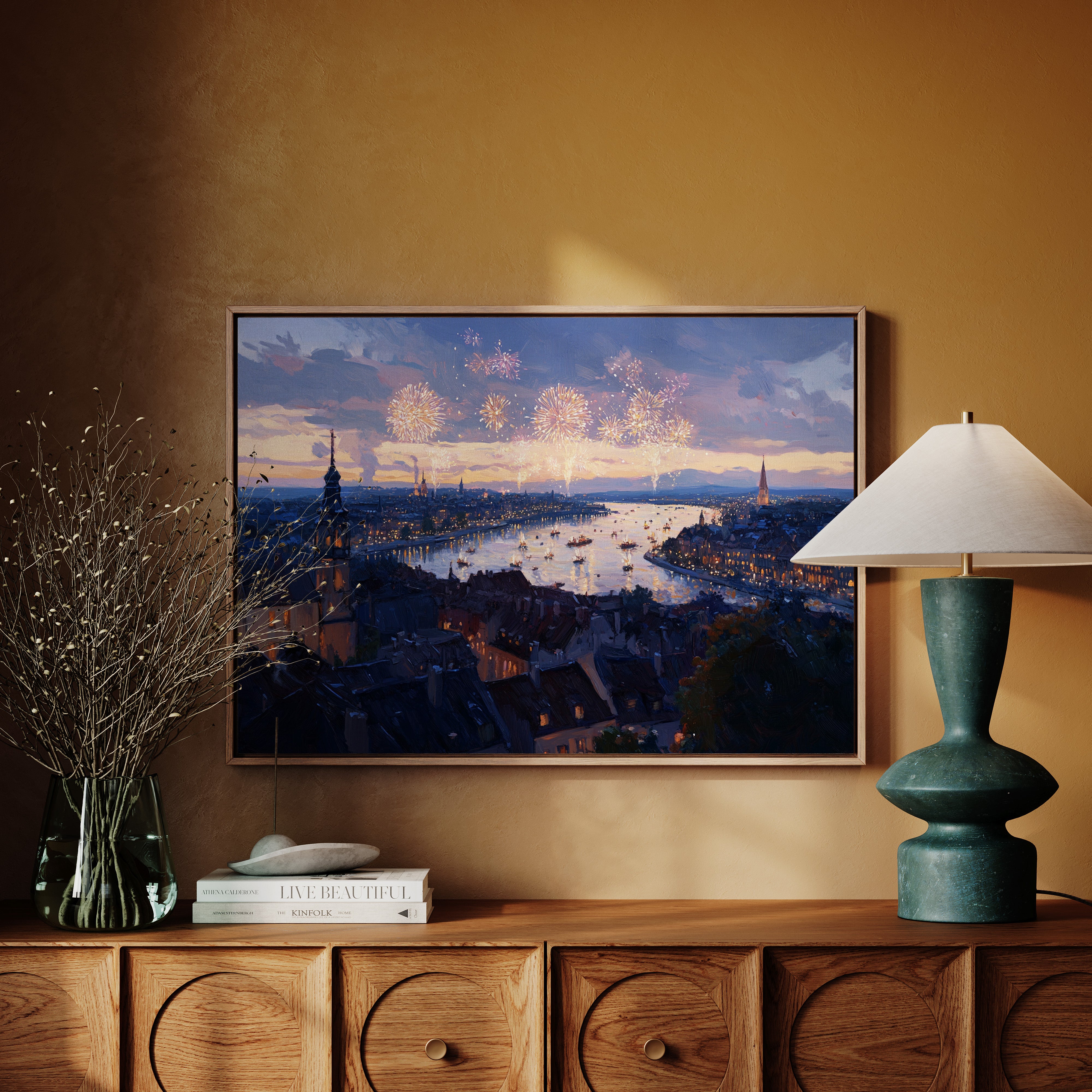 Fireworks paint the twilight sky with bursts of golden light, their reflections dancing across the tranquil river below. The historic cityscape unfolds like a storybook, with gothic spires and warm-lit windows creating a tapestry of old-world charm against the dusky horizon. Boats dot the gleaming waterway, their lanterns twinkling like earthbound stars while church steeples stand sentinel over centuries-old rooftops. This piece captures the magical moment when day surrenders to night, and celebration transforms a timeless city into a canvas of light and wonder. Perfect for adding a touch of European romance and architectural grandeur to a living room or study where stories of far-off places inspire dreams of adventure.