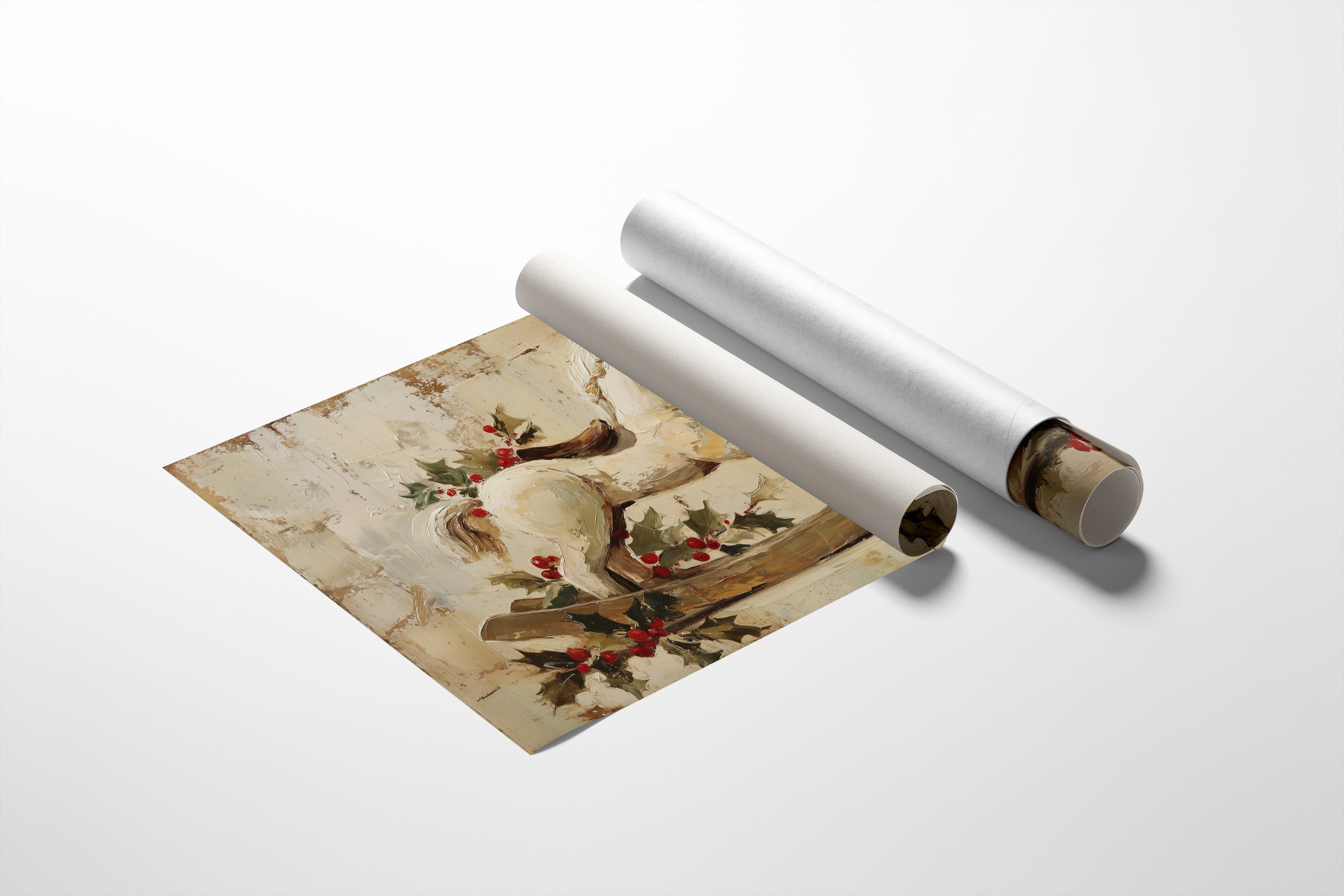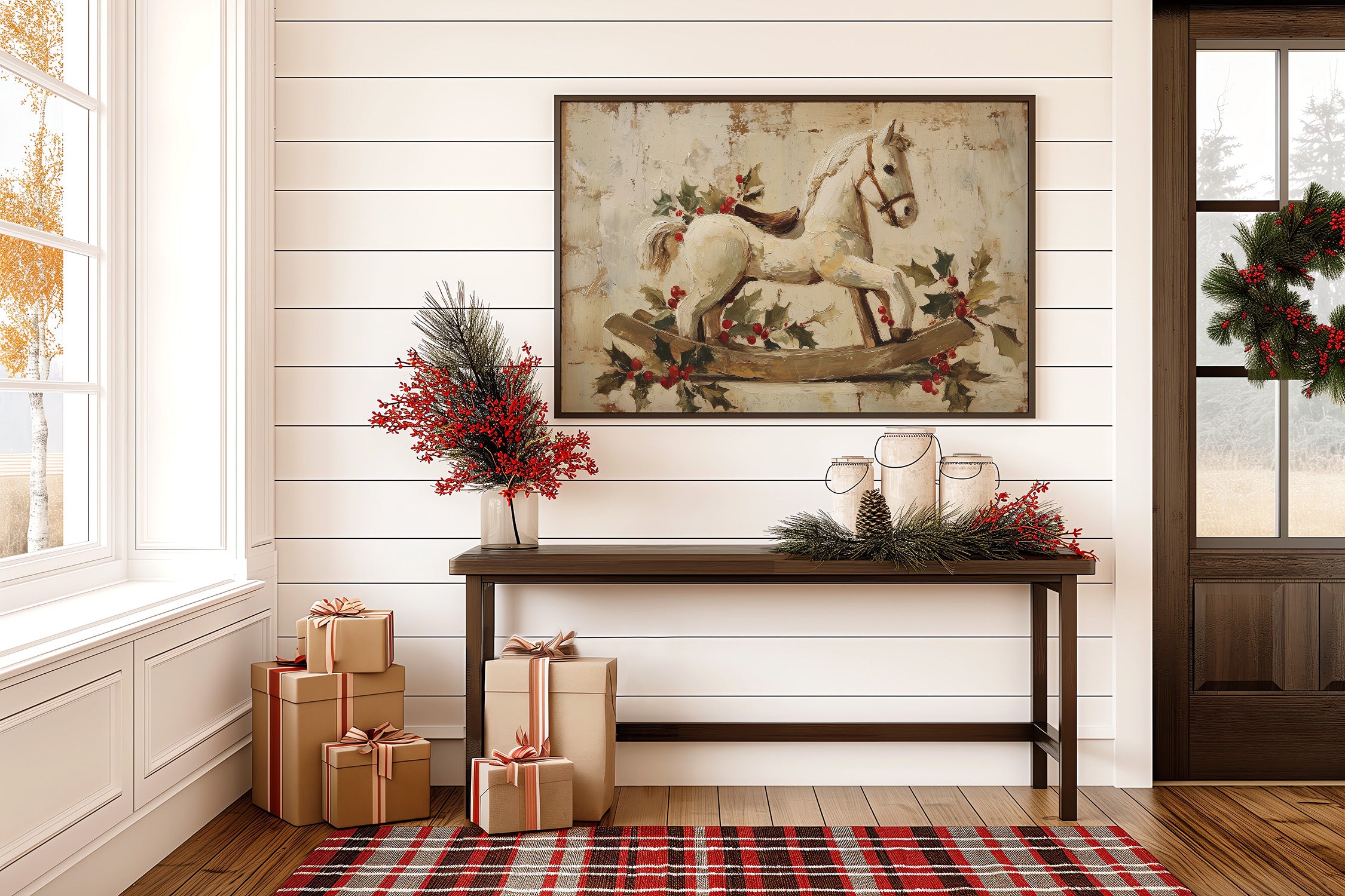 A vintage rocking horse stands gently poised, adorned with sprigs of holly and bright red berries against a softly textured neutral backdrop. Warm cream and earthy tones, paired with painterly brushstrokes, create a nostalgic holiday charm that feels both rustic and timeless. A cozy accent for nurseries, entryways, or seasonal living spaces, bringing festive warmth and classic farmhouse elegance to your walls.