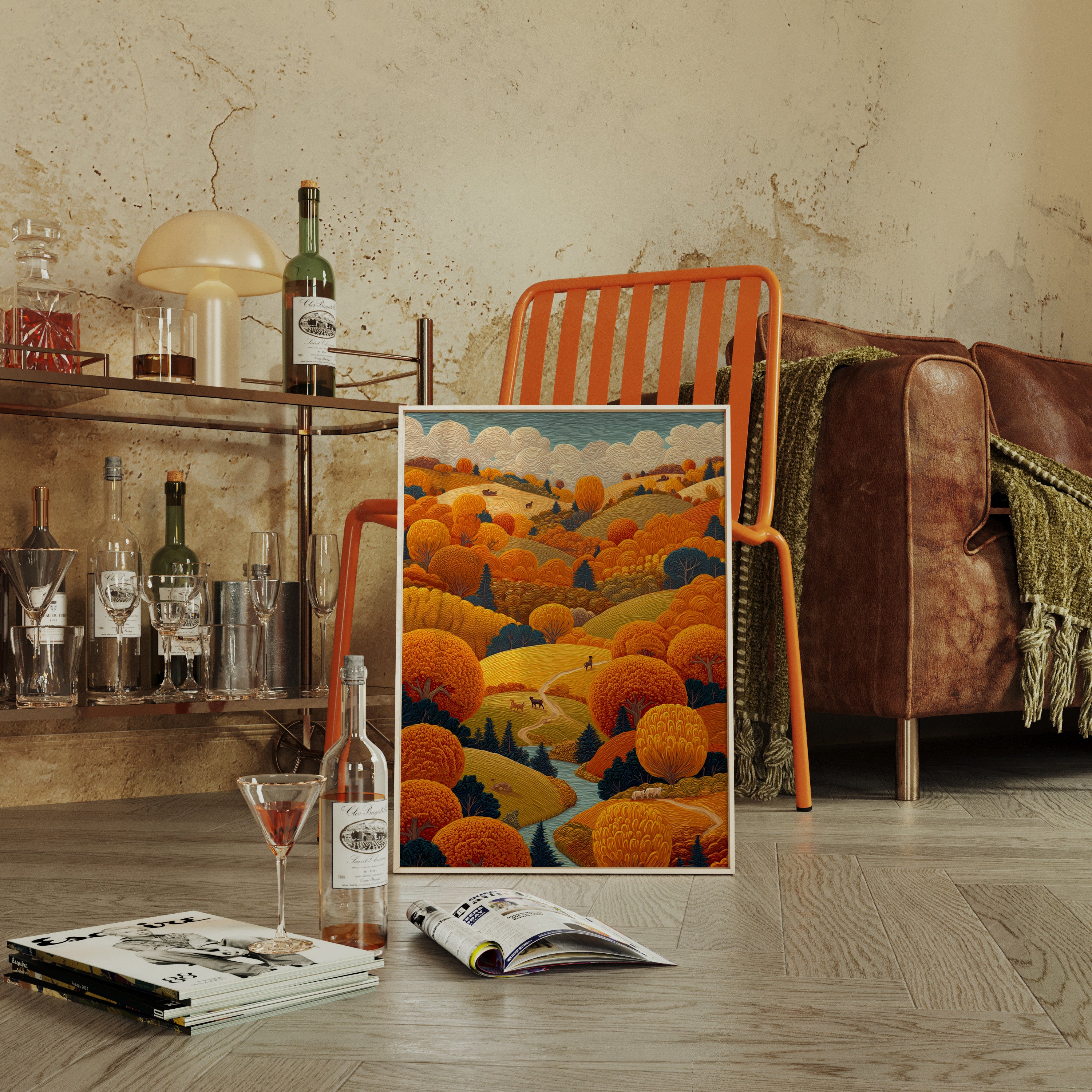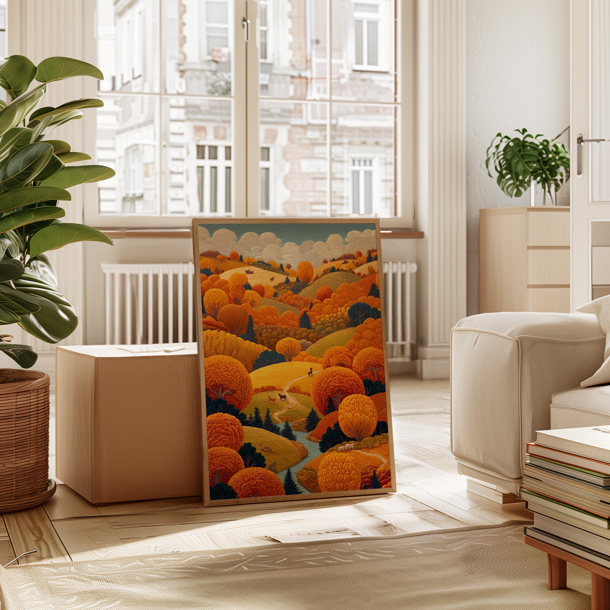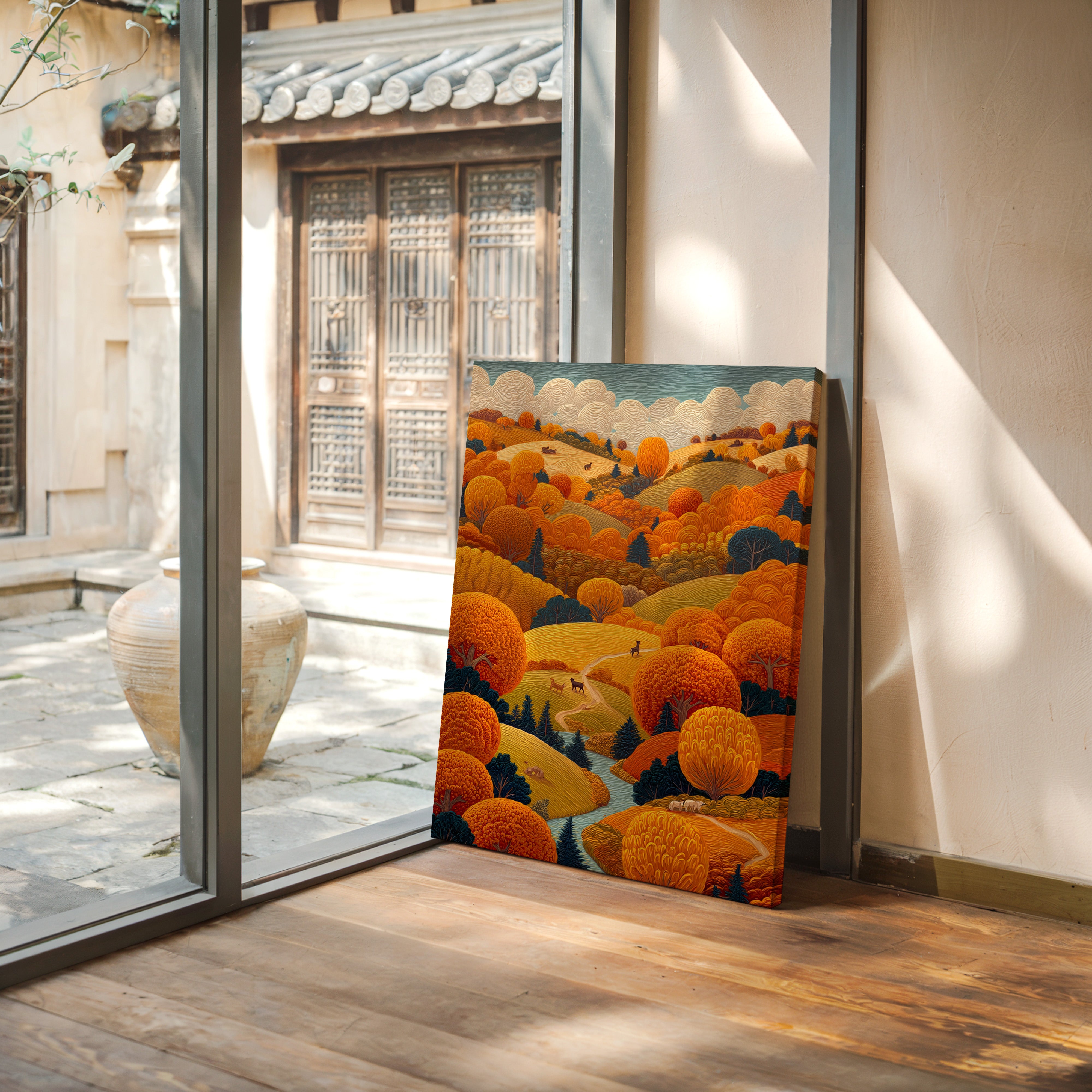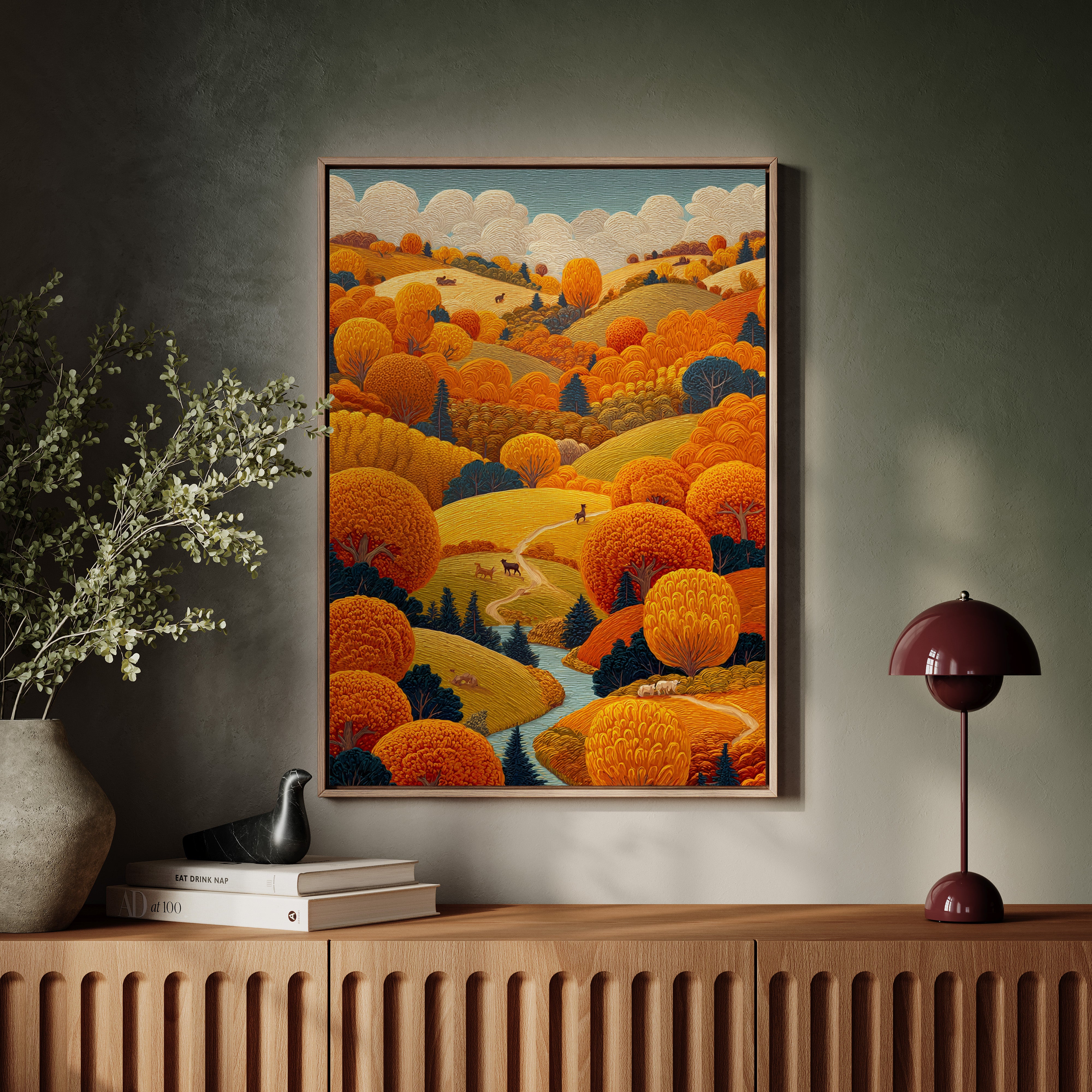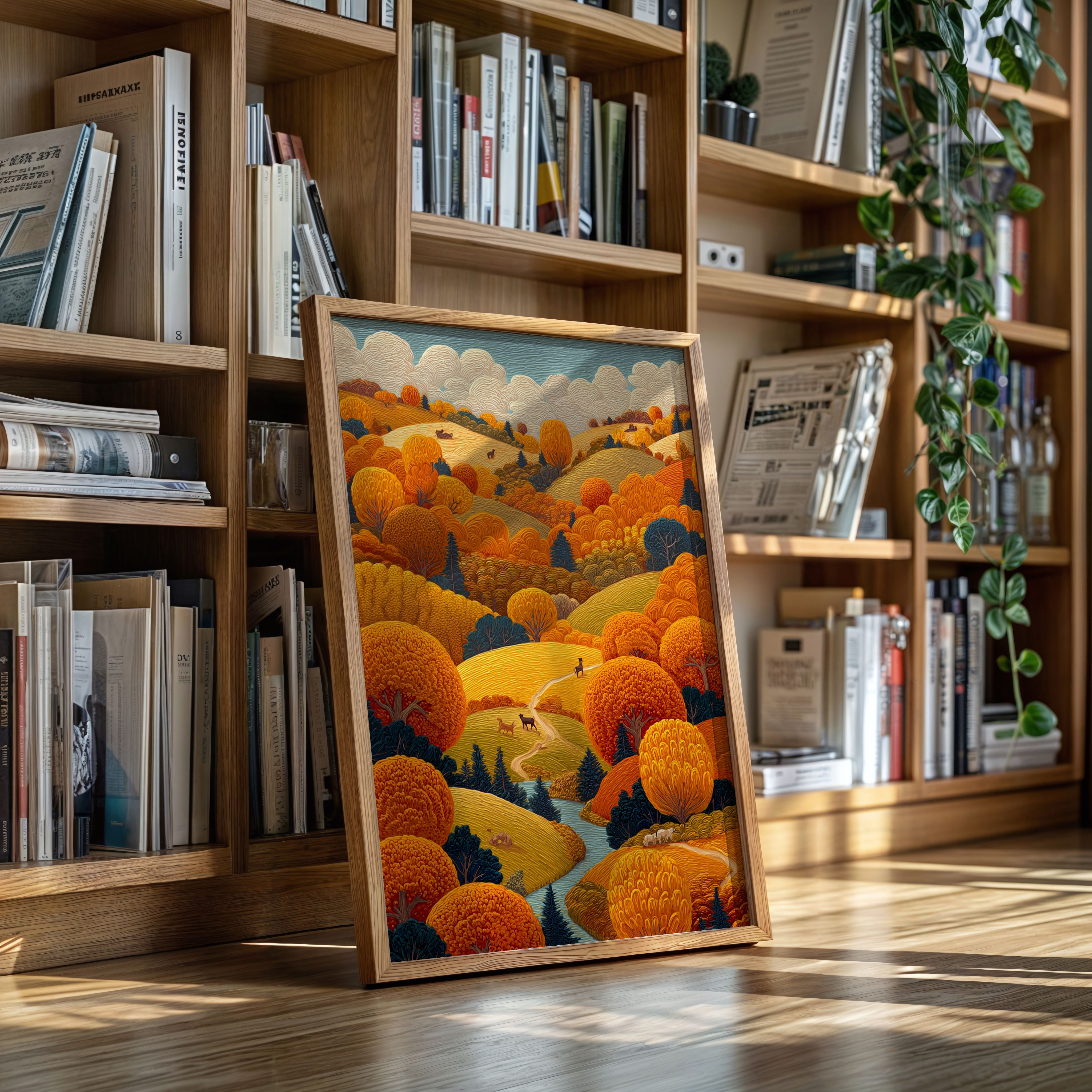 Golden light spills across undulating hills, where autumn has painted each tree in brilliant marigold and amber hues. Winding paths trace through the landscape like ribbons, leading to quiet moments where deer pause in sunlit clearings. The composition unfolds in layers of textured foliage, with deep teal evergreens standing sentinel among the fiery deciduous trees, while cottony clouds drift above in a turquoise sky. Perfect for creating a focal point in living spaces that yearn for warmth and seasonal splendor, this piece brings the magical transformation of fall indoors.