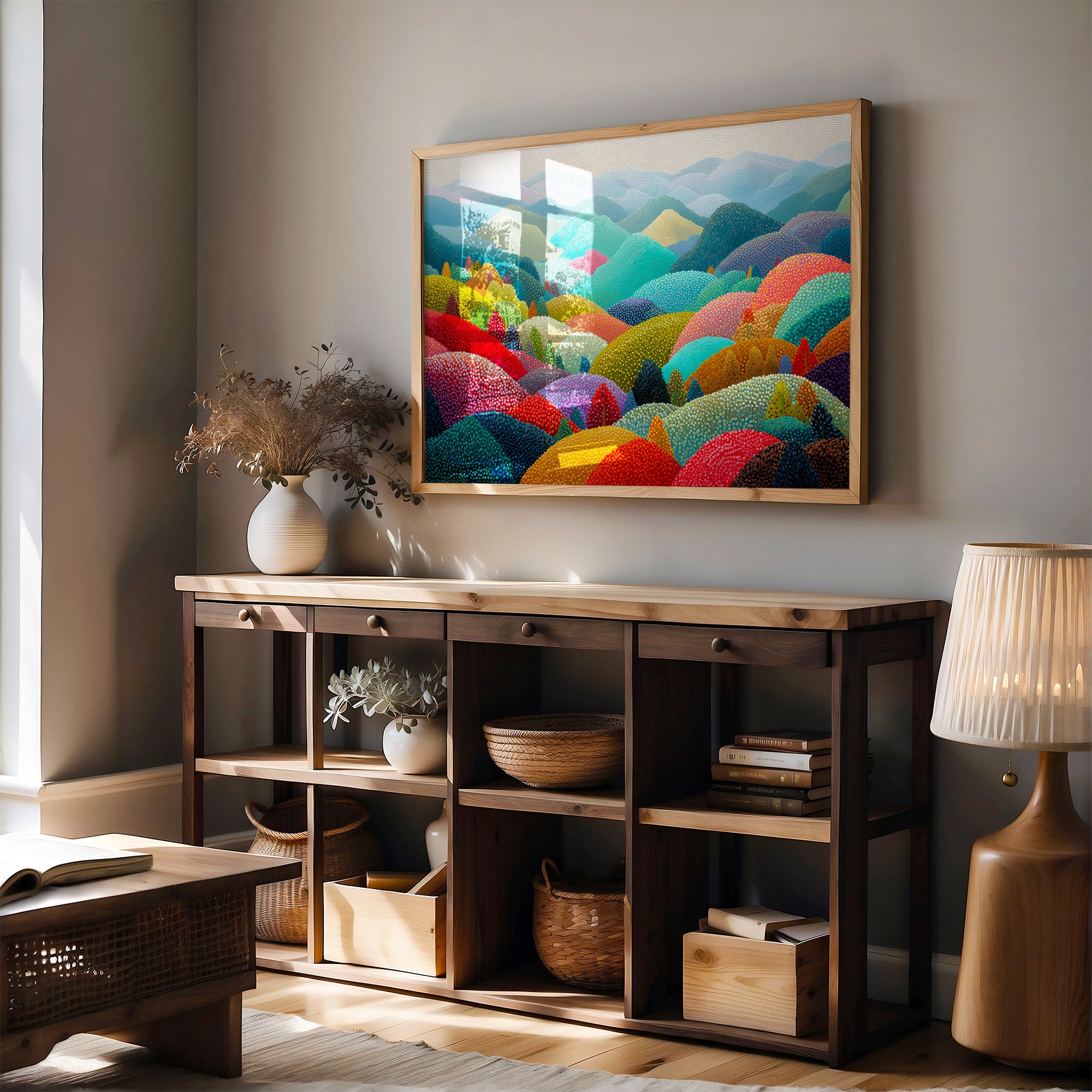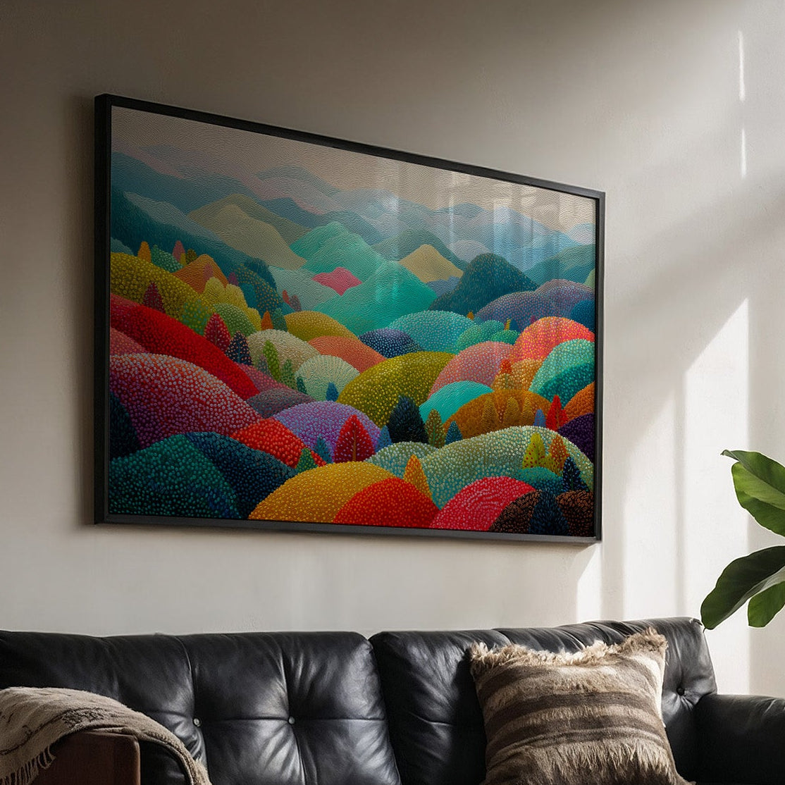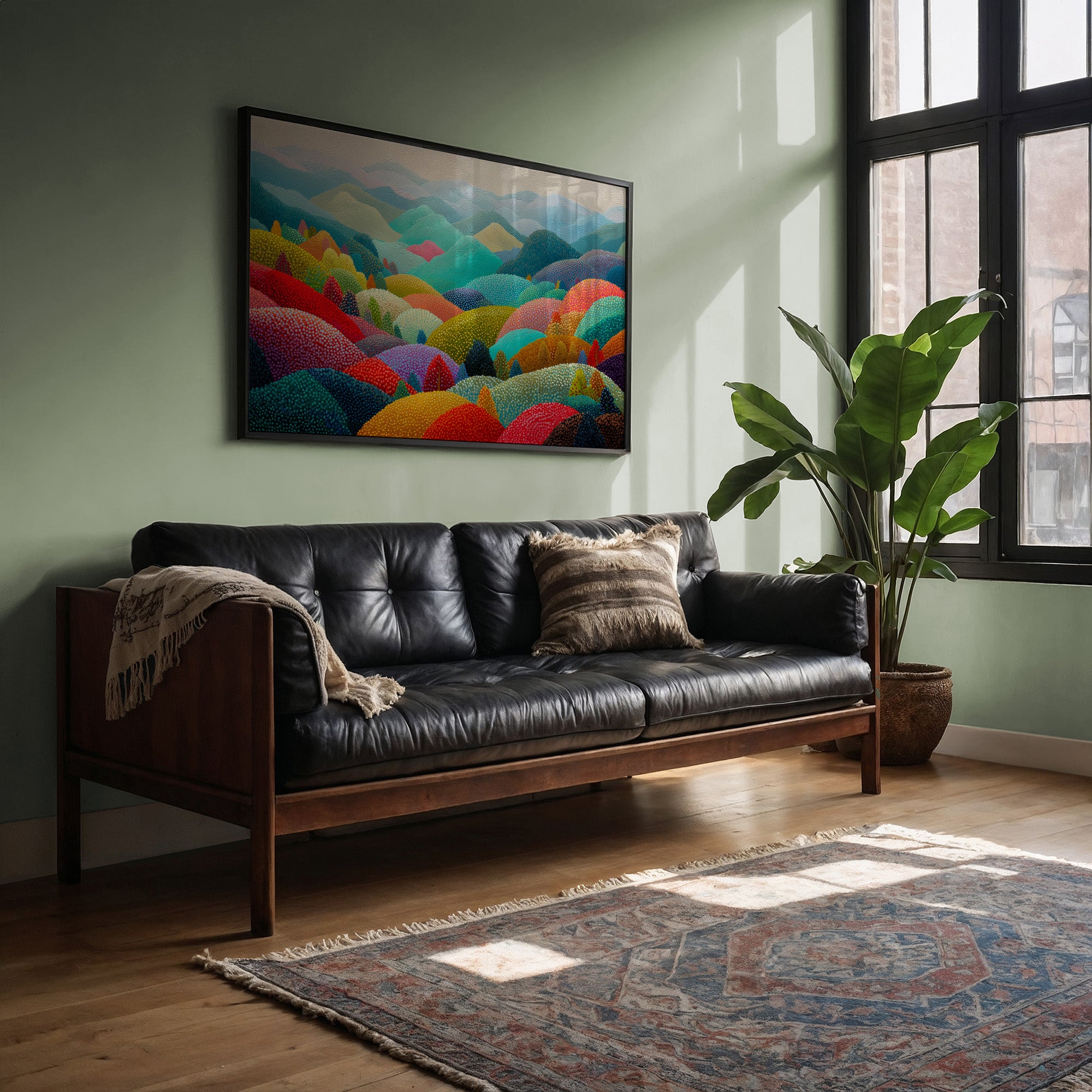 Golden afternoon light spills across a corduroy couch, casting delicate plant shadows that dance upon cream walls. Within a simple wooden frame, a vibrant landscape unfolds in pointillist detail - hills roll like colorful waves, each crowned with textured dots in jewel tones of turquoise, coral, and marigold. The scene captures an imaginative countryside where reality meets fantasy, rendered in a contemporary folk art style that brings warmth and whimsy to any space. This piece would transform a reading nook or living room into a contemplative sanctuary, inviting viewers to lose themselves in its dreamy terrain.