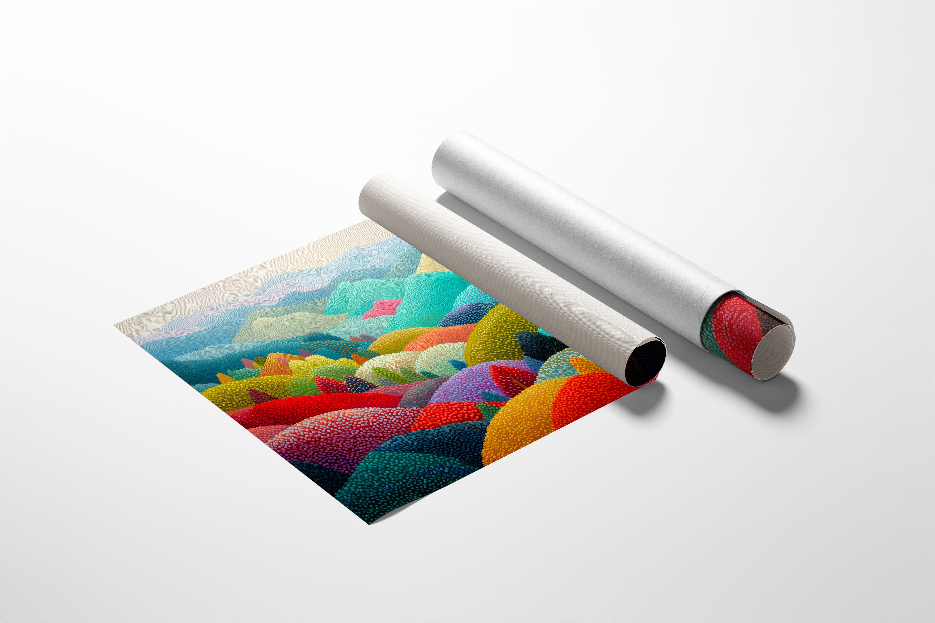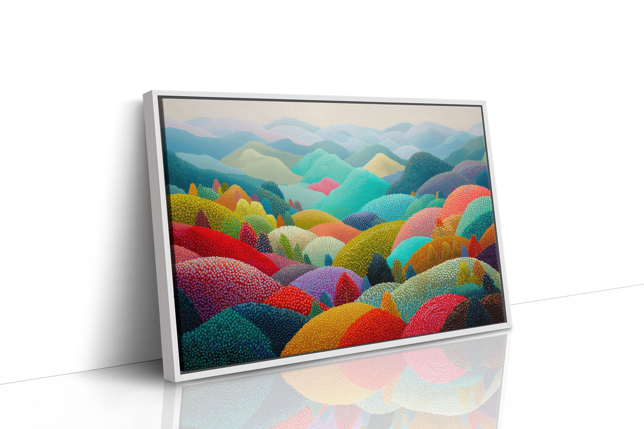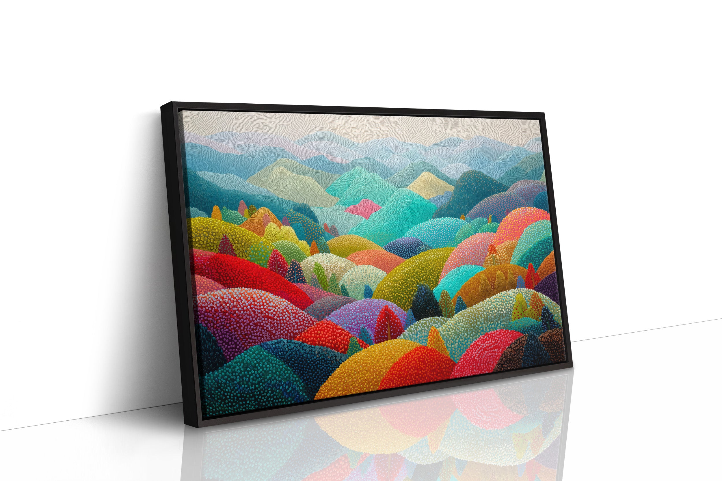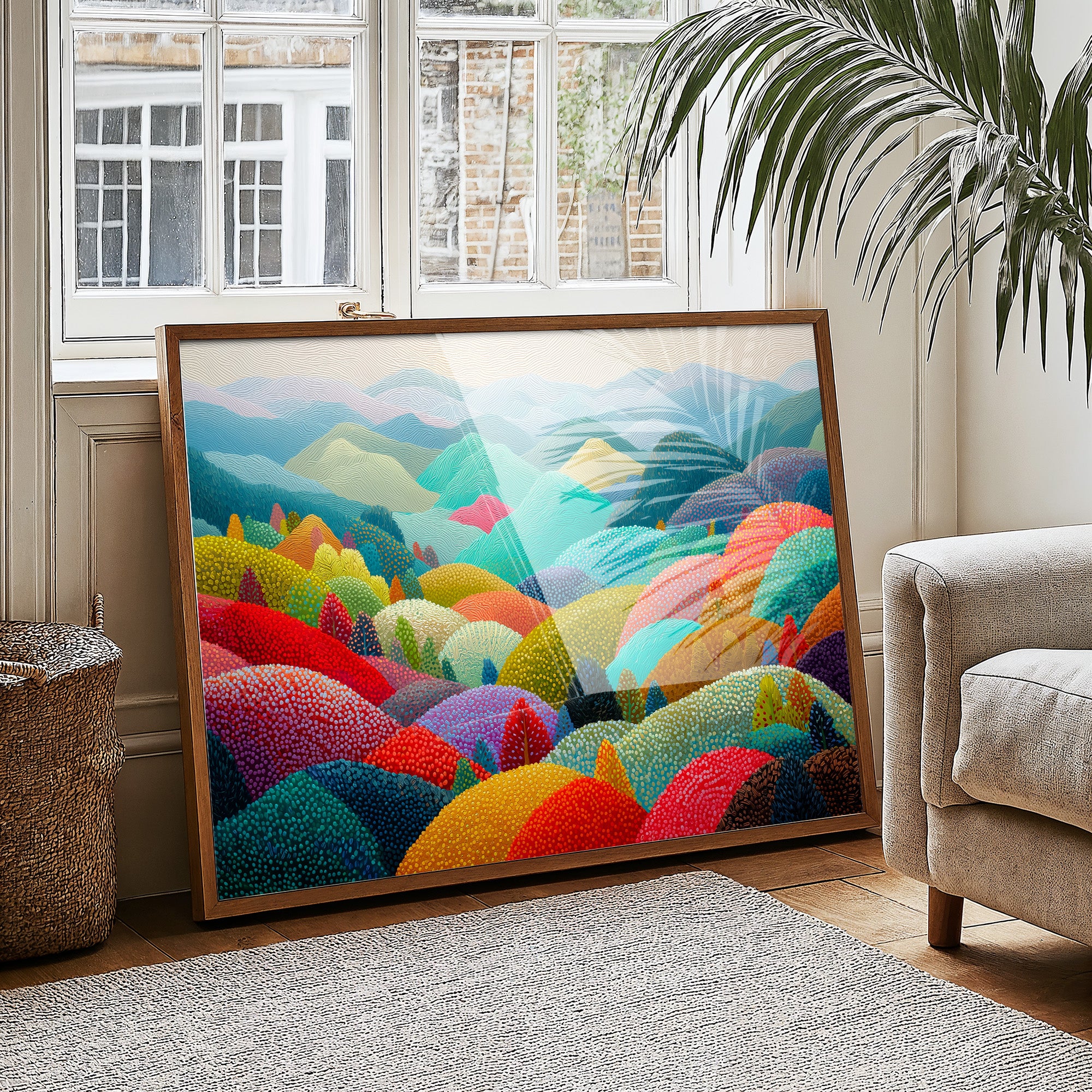 Golden afternoon light spills across a corduroy couch, casting delicate plant shadows that dance upon cream walls. Within a simple wooden frame, a vibrant landscape unfolds in pointillist detail - hills roll like colorful waves, each crowned with textured dots in jewel tones of turquoise, coral, and marigold. The scene captures an imaginative countryside where reality meets fantasy, rendered in a contemporary folk art style that brings warmth and whimsy to any space. This piece would transform a reading nook or living room into a contemplative sanctuary, inviting viewers to lose themselves in its dreamy terrain.