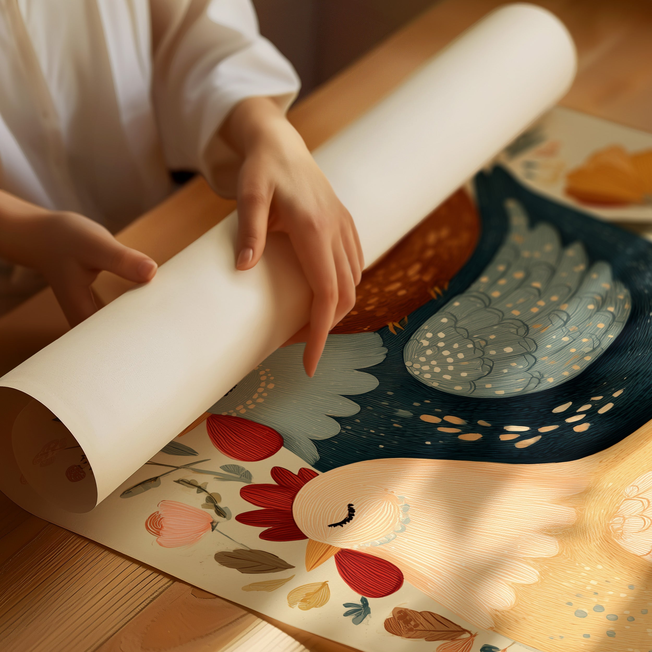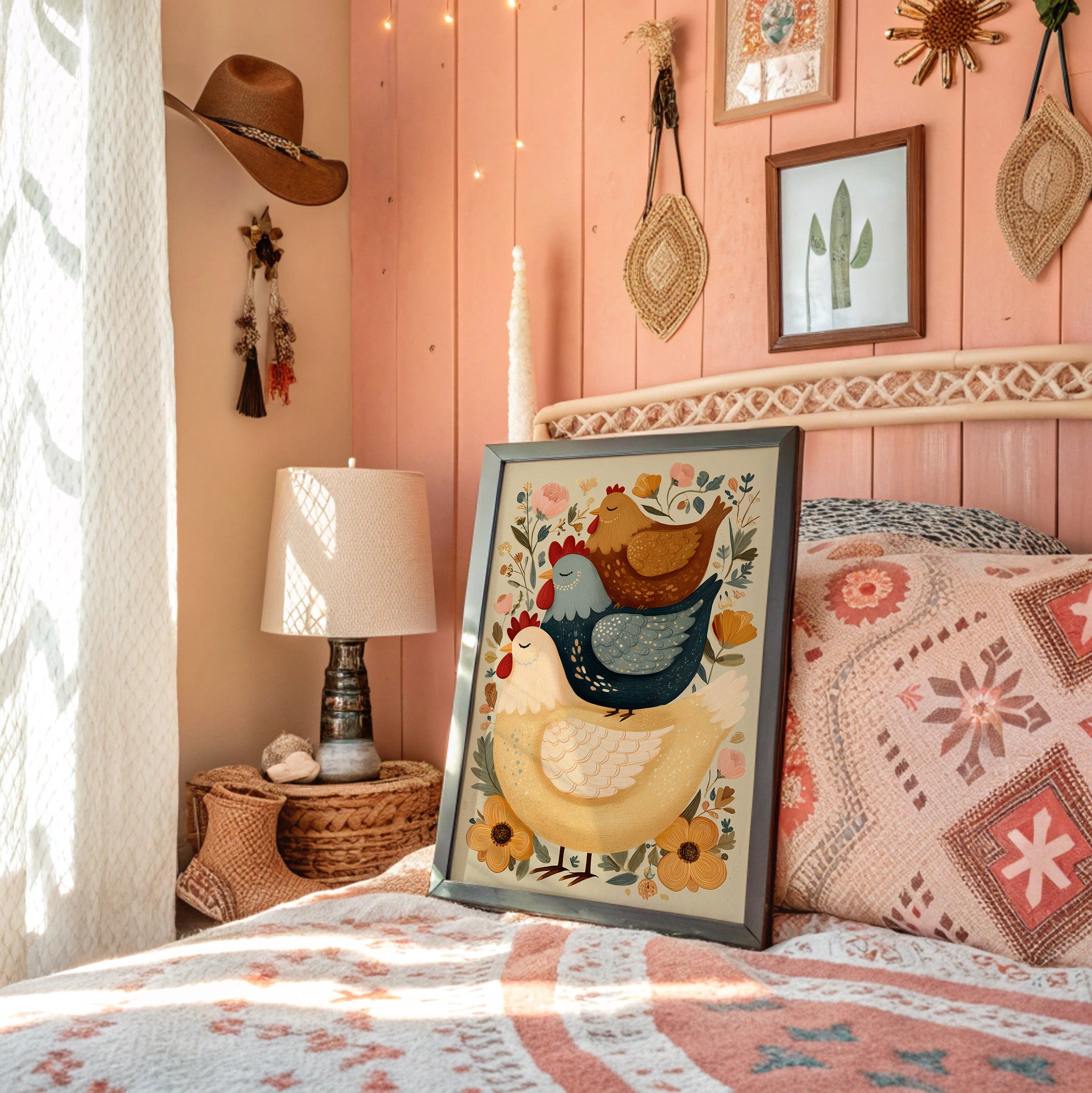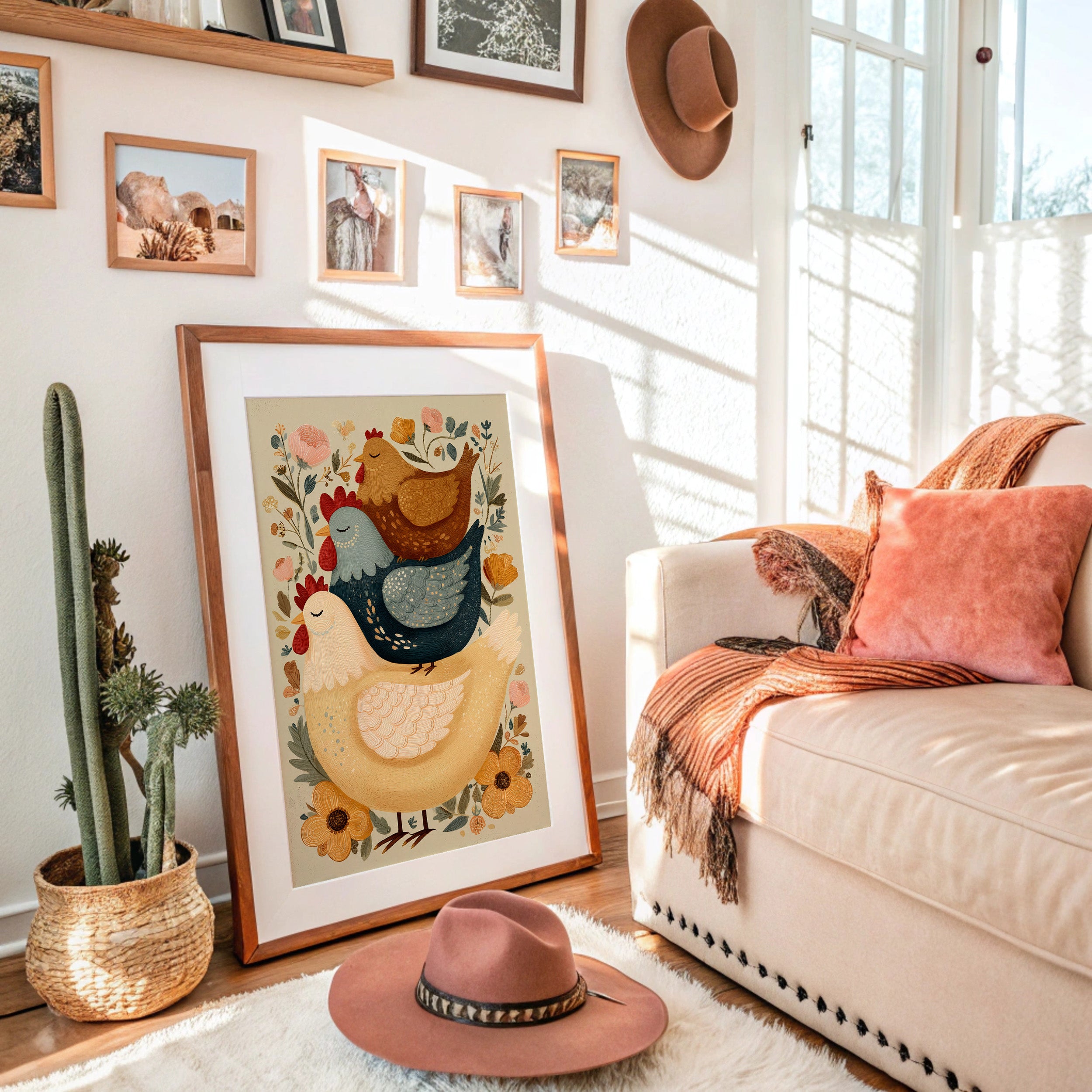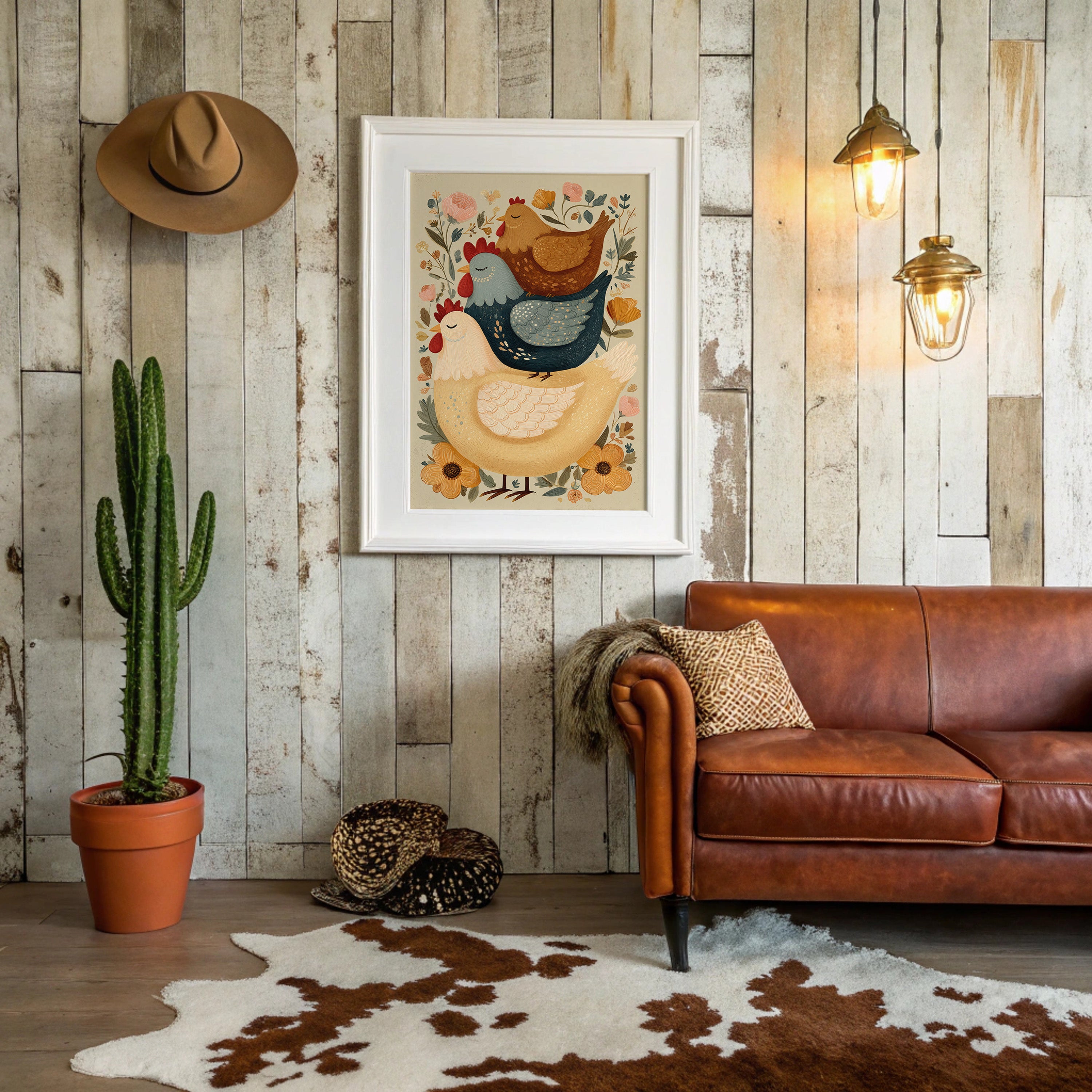 A charming folk art illustration brings farmyard whimsy to life through stacked roosters and hens adorned with delicate floral patterns. The artwork's warm earth tones and playful folk art style create a perfect harmony of rustic charm and modern design sensibility. Surrounded by blooming wildflowers and detailed with intricate patterns, these cheerful birds radiate countryside comfort. This piece adds character to modern farmhouse, rustic contemporary, or eclectic country interiors. Perfect for bringing warmth to a breakfast nook, kitchen, or any space needing a touch of pastoral charm.