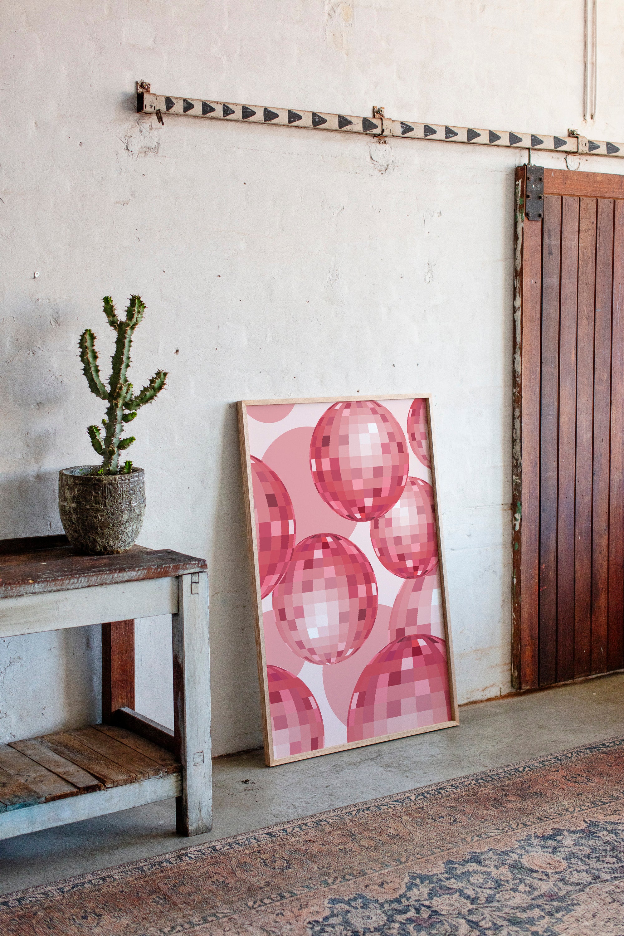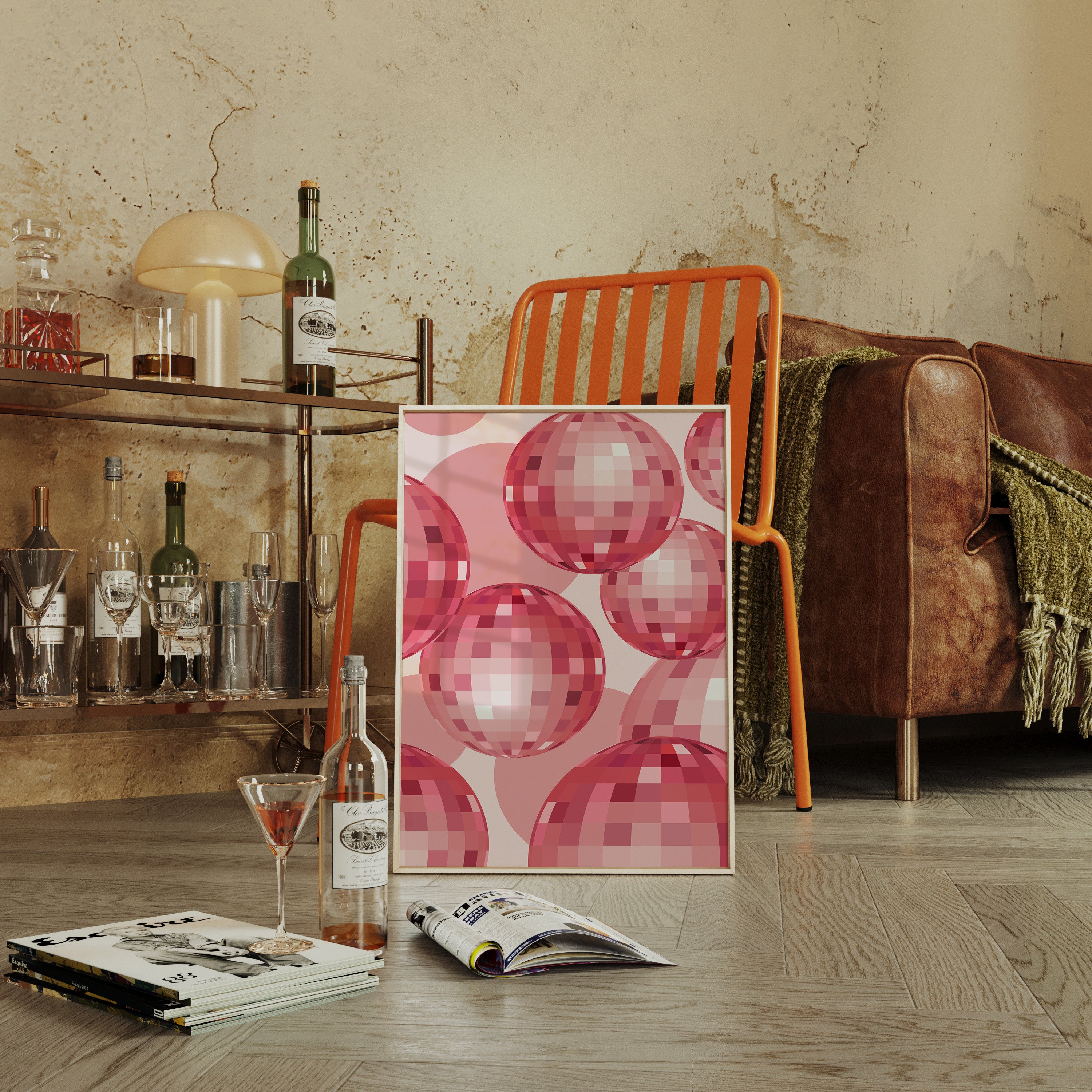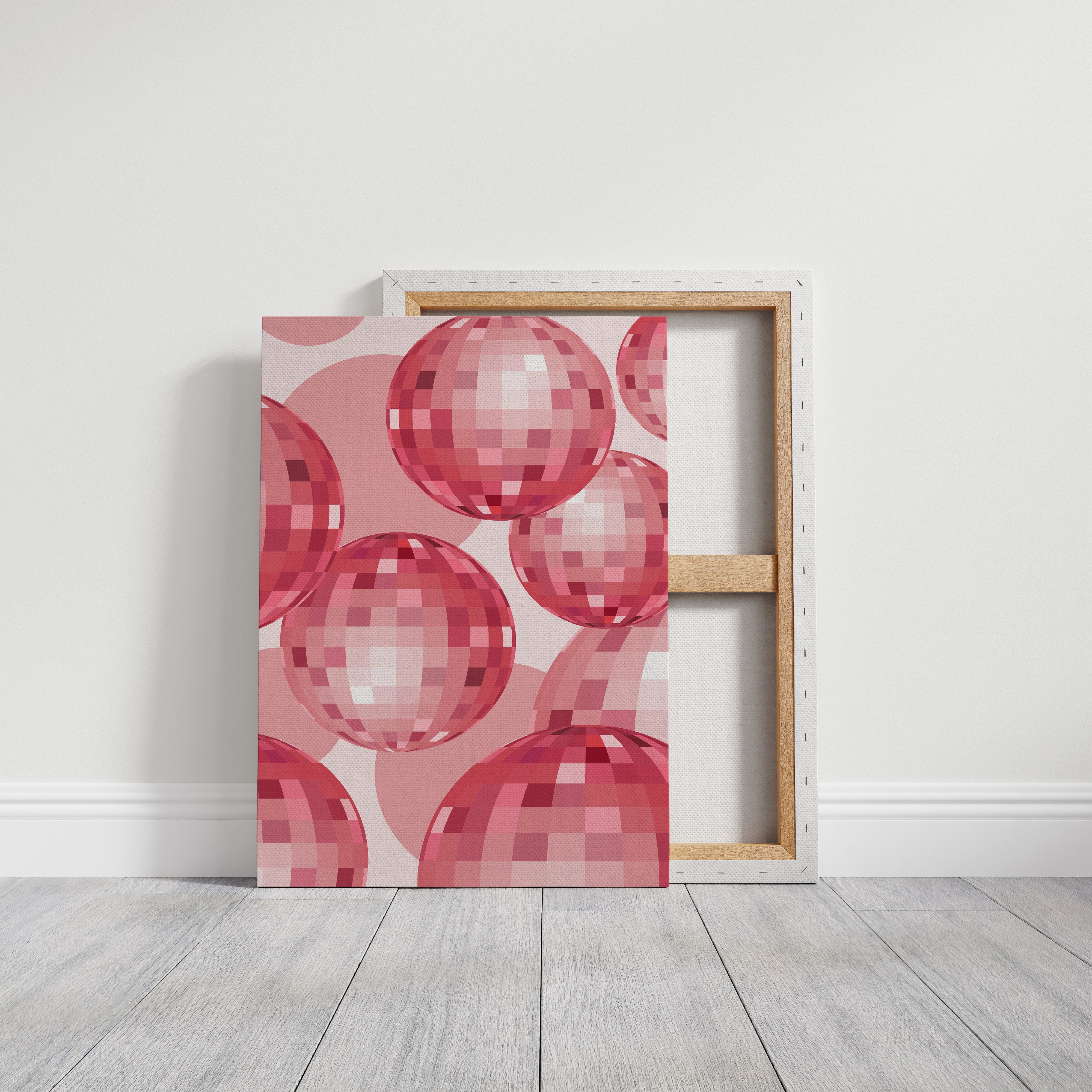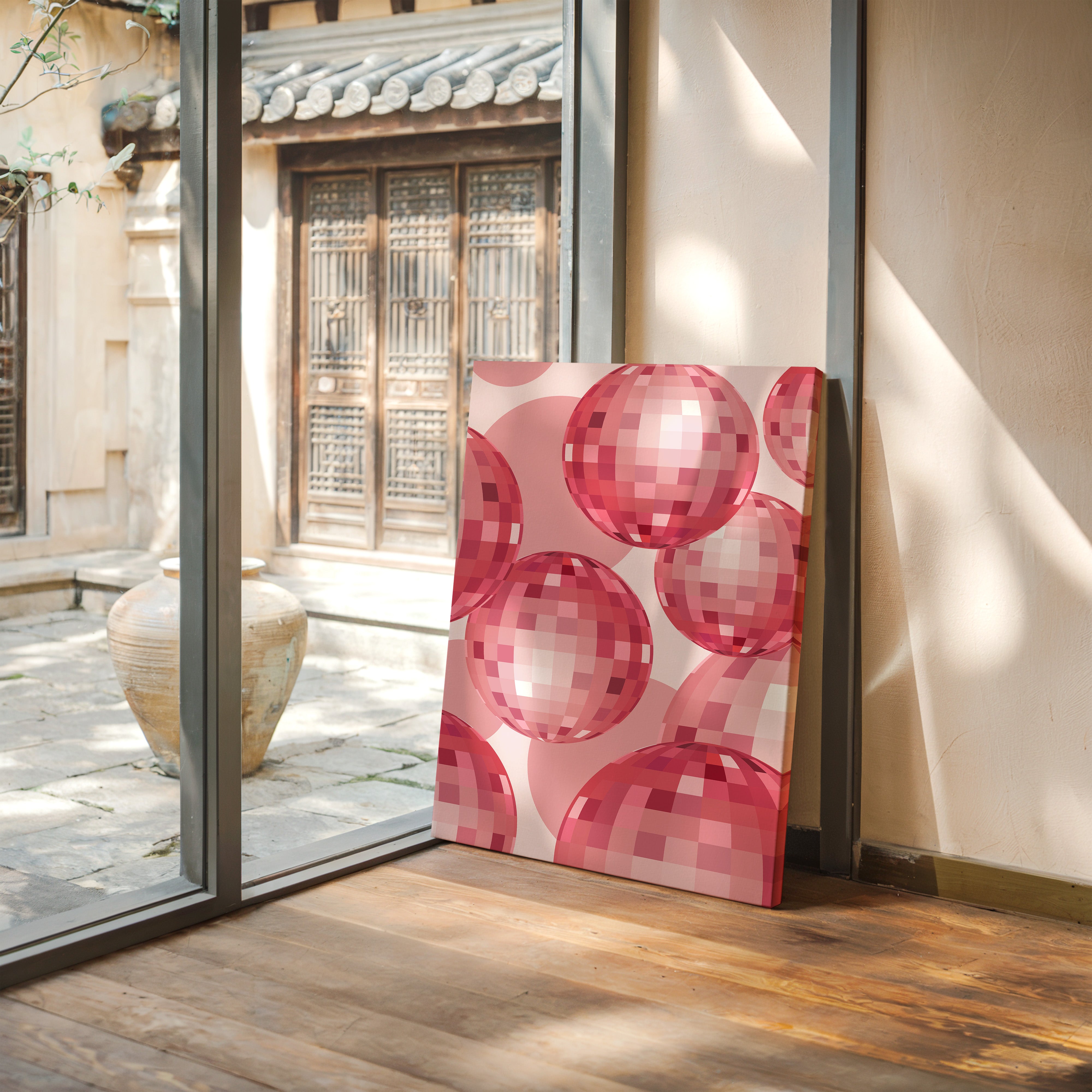 Glittering spheres of pink catch and scatter light like crystallized moments of joy. This piece from our Contemporary collection captures the playful nostalgia of disco's golden age through a modern lens. Faceted mirror balls drift weightlessly against a soft rose backdrop, their geometric patterns creating a mesmerizing dance of light and shadow. The monochromatic pink palette ranges from deep rose to barely-there blush, lending both warmth and sophistication. Perfect for adding a touch of glamour to a modern living room or bringing retro-chic energy to a fashion-forward bedroom. Each viewing reveals new patterns in the crystalline surfaces, like memories catching light in unexpected ways.